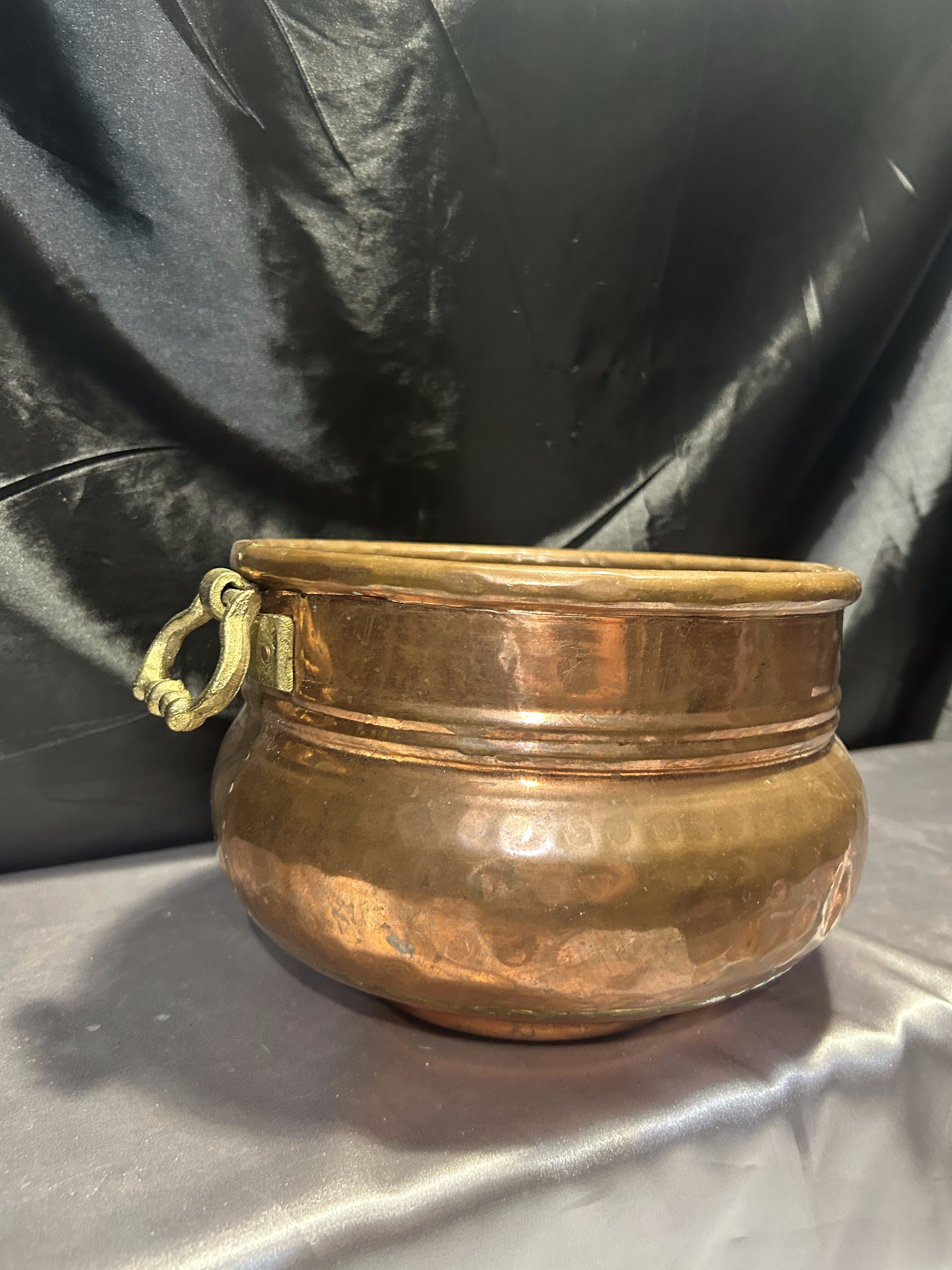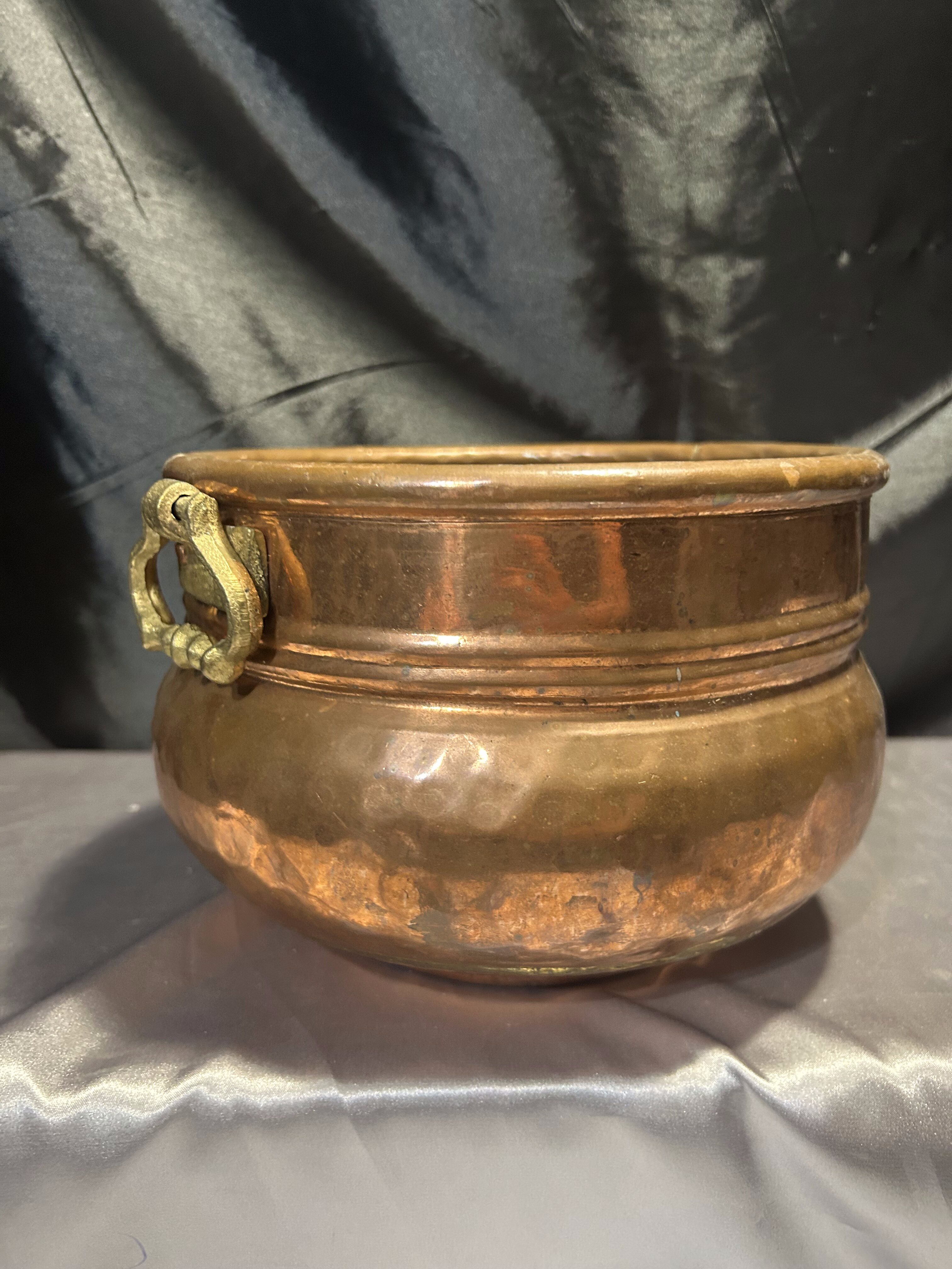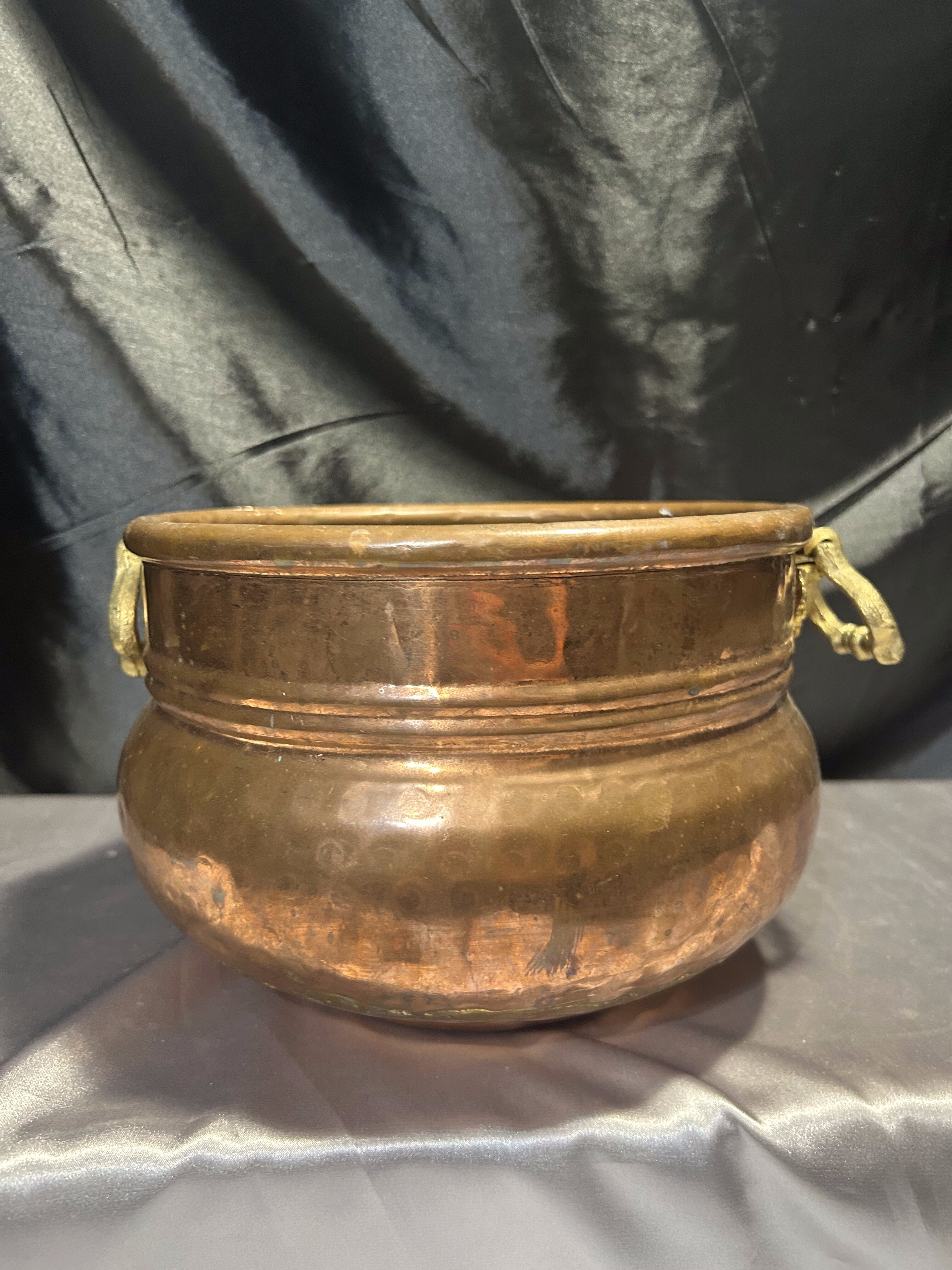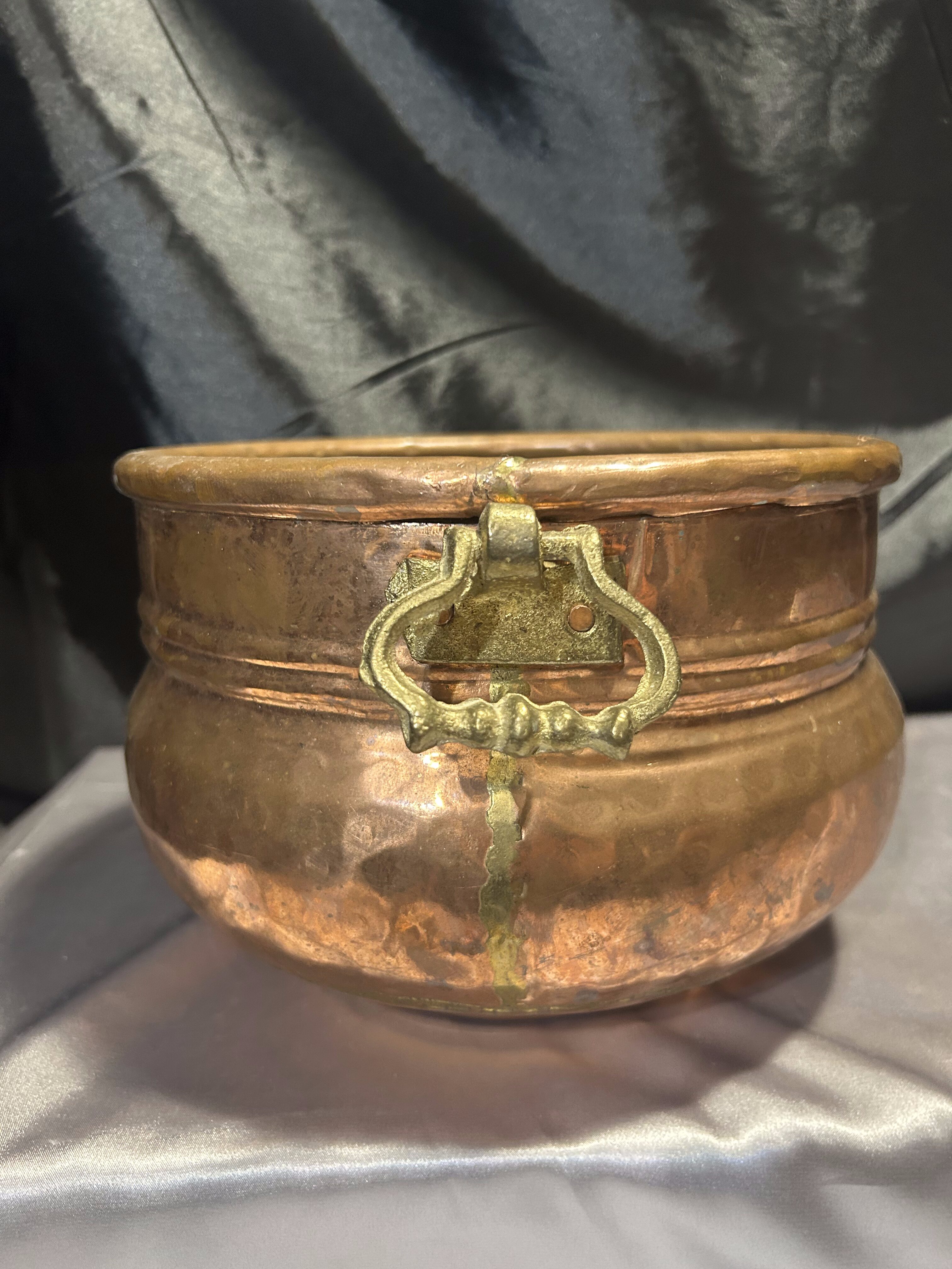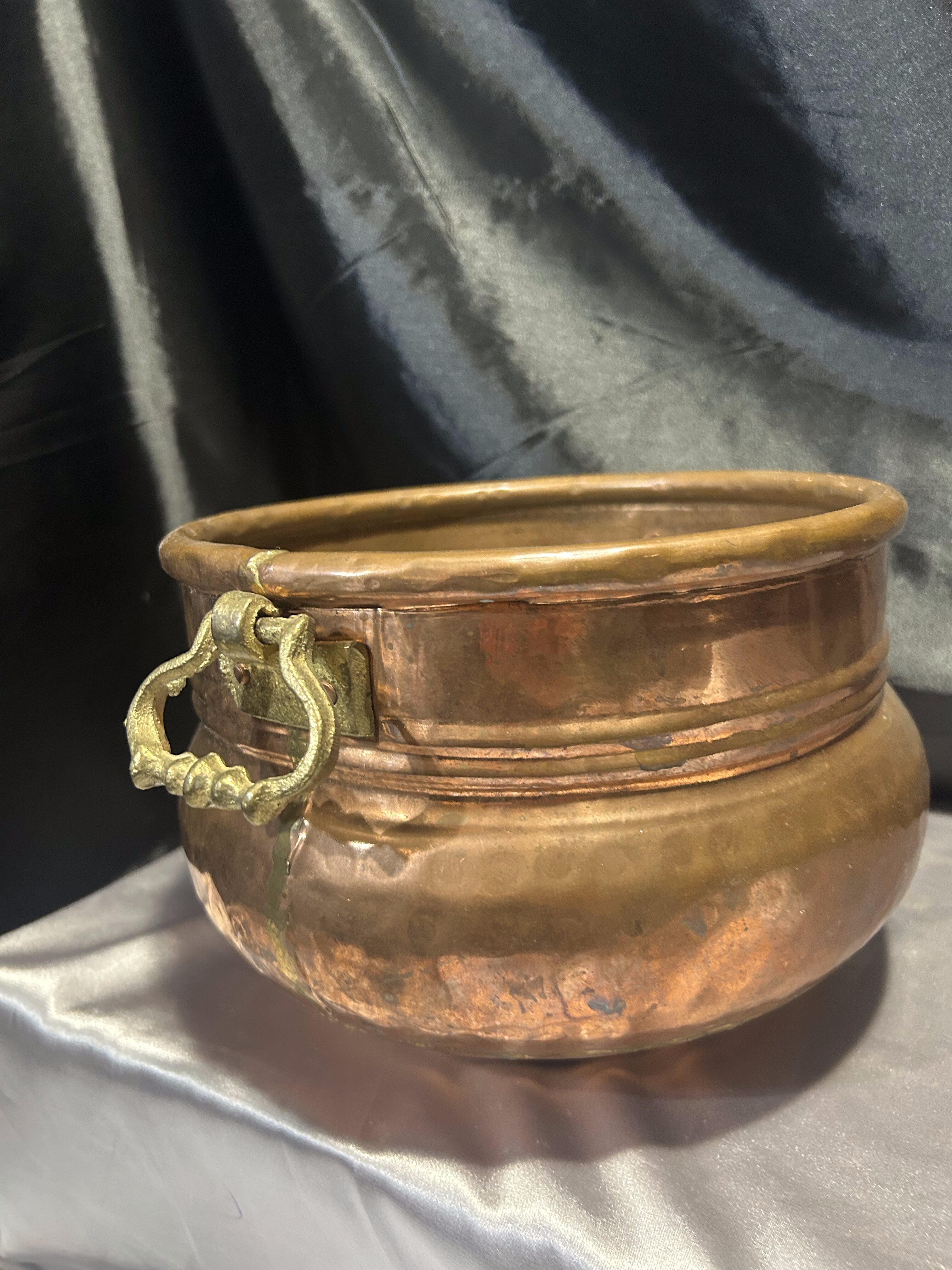 Na sprzedaż elegancka miedziana donica w formie dekoracyjnej misy, ozdobiona solidnymi mosiężnymi uchwytami. Stylowy design oraz klasyczne połączenie miedzi i mosiądzu nadają jej unikatowego charakteru. Doskonale sprawdzi się jako osłonka na rośliny, dekoracyjna misa lub pojemnik na drobiazgi.