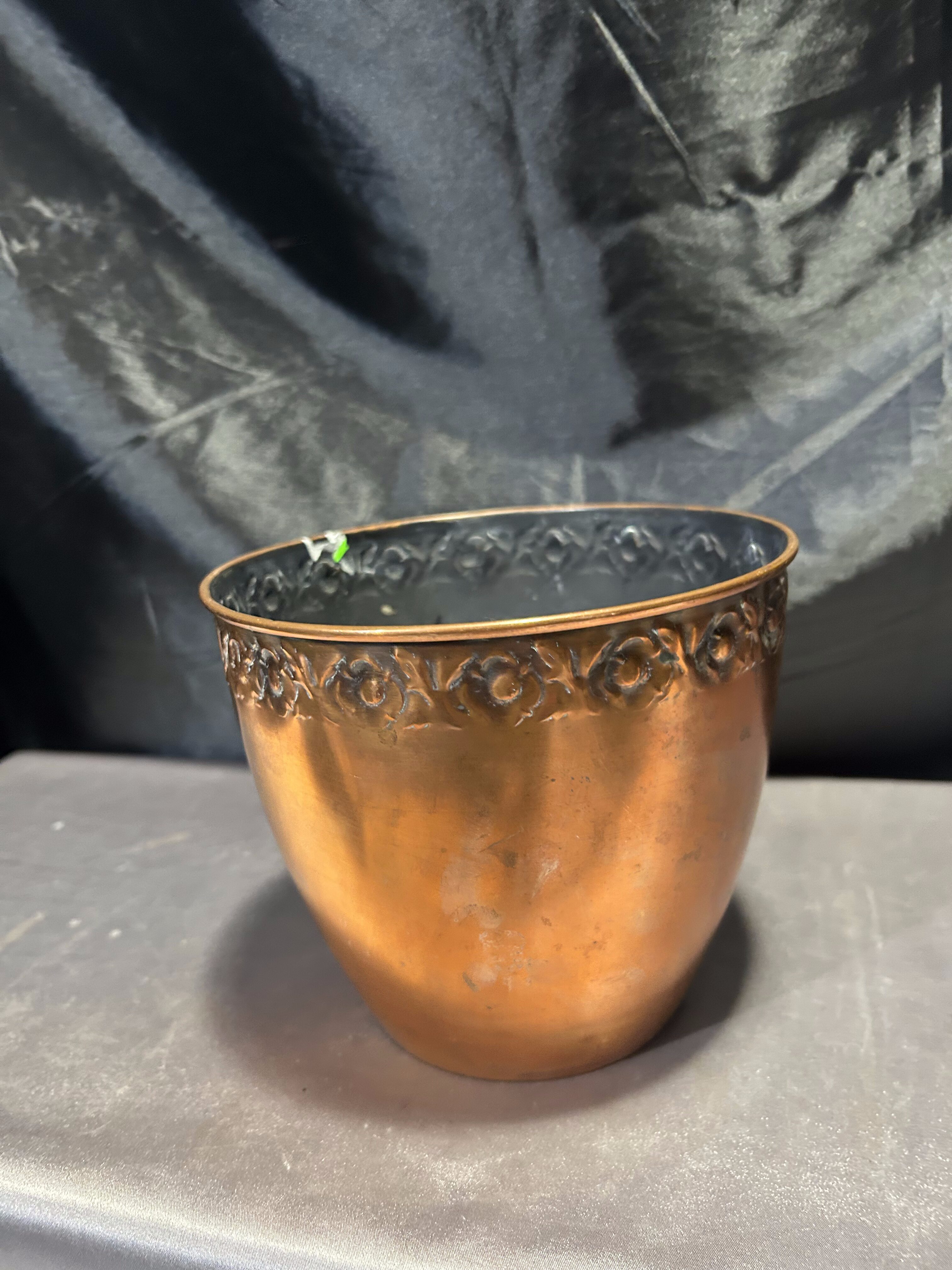 Na sprzedaż oryginalna, miedziana doniczka sygnowana Made in England. Wykonana z wysokiej jakości miedzi, zachwyca klasycznym kształtem i subtelnym połyskiem. Może pełnić funkcję osłonki na rośliny lub dekoracyjnego kwietnika.