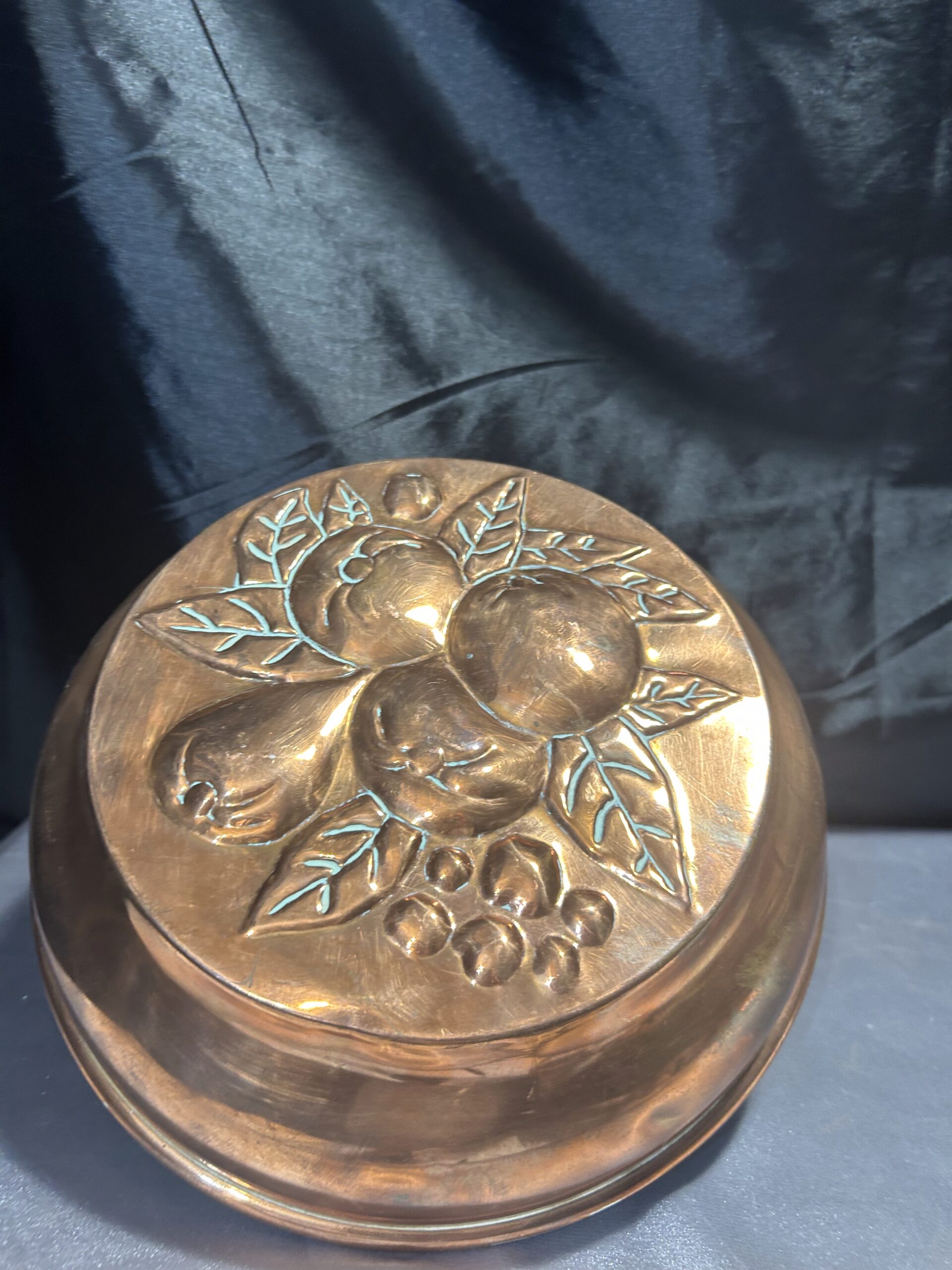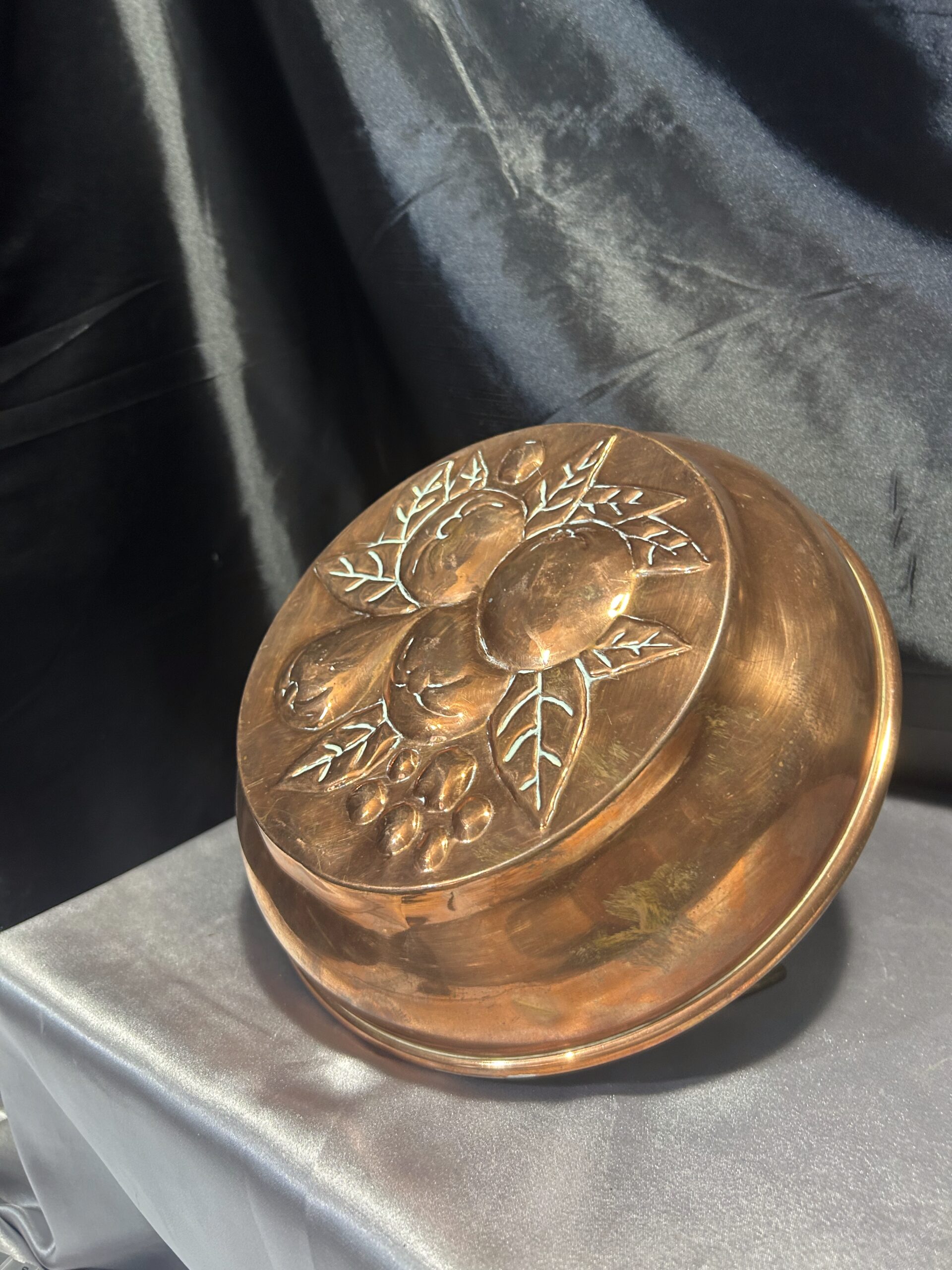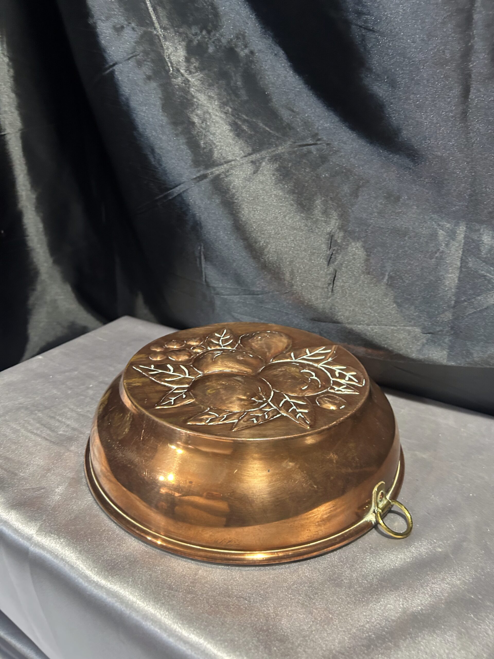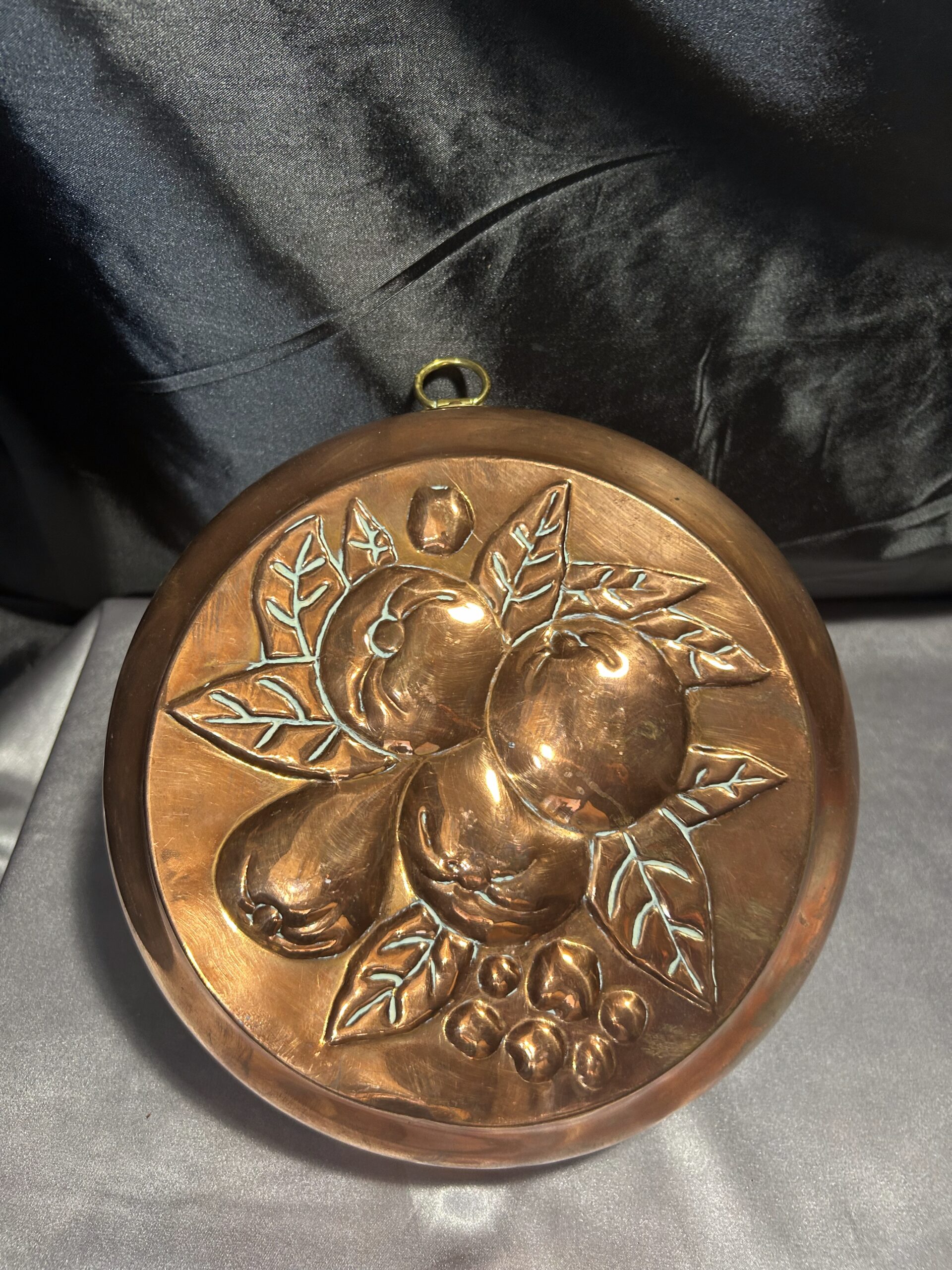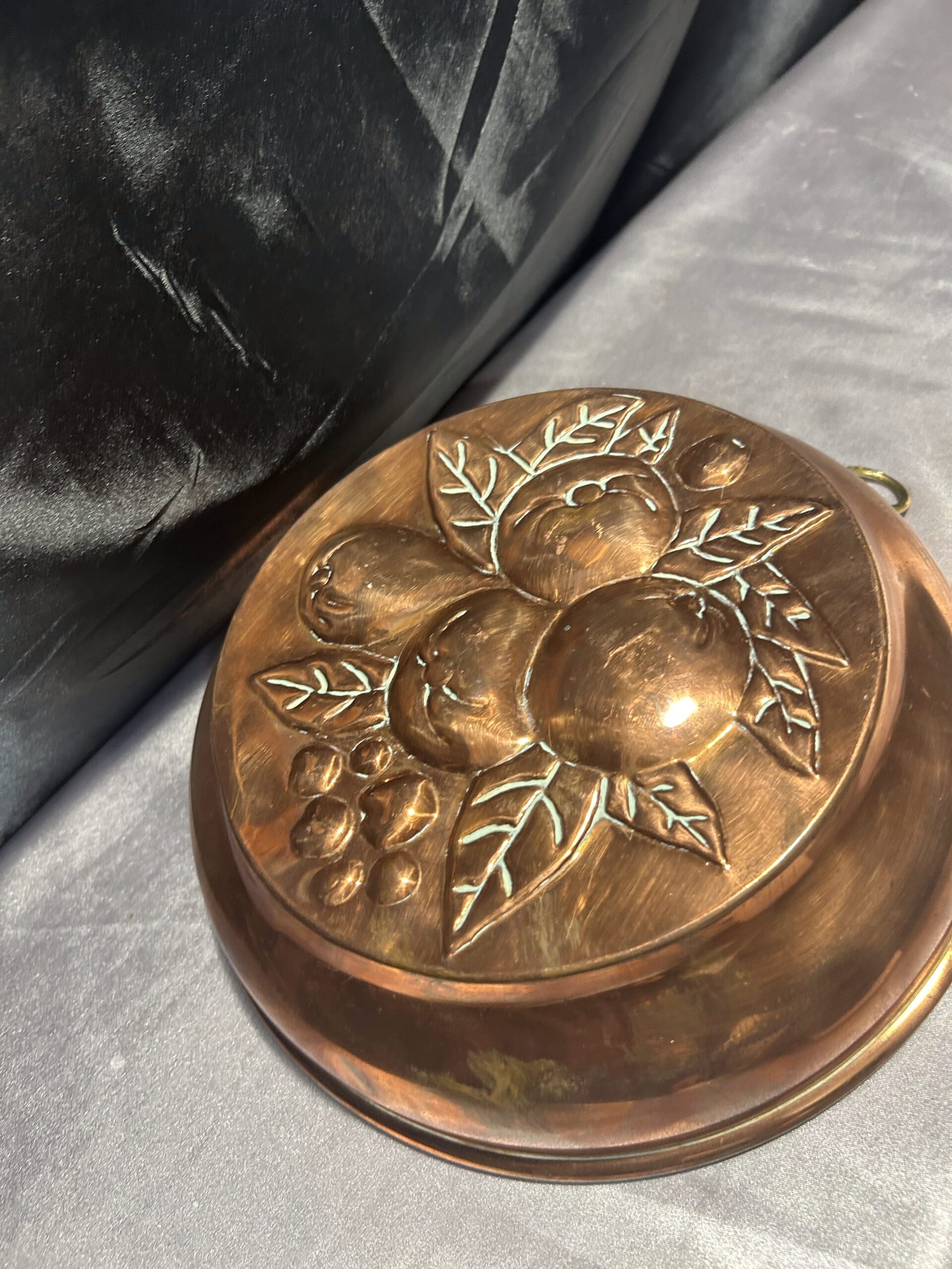 Piękna foremka na ciasto wykonana z miedzi, ozdobiona misternym tłoczeniem przedstawiającym jabłka i gruszki. Klasyczny design sprawia, że foremka może pełnić zarówno funkcję użytkową, jak i dekoracyjną. Dzięki praktycznemu kółeczku można ją zawiesić na ścianie, wprowadzając do wnętrza rustykalny, vintage klimat.