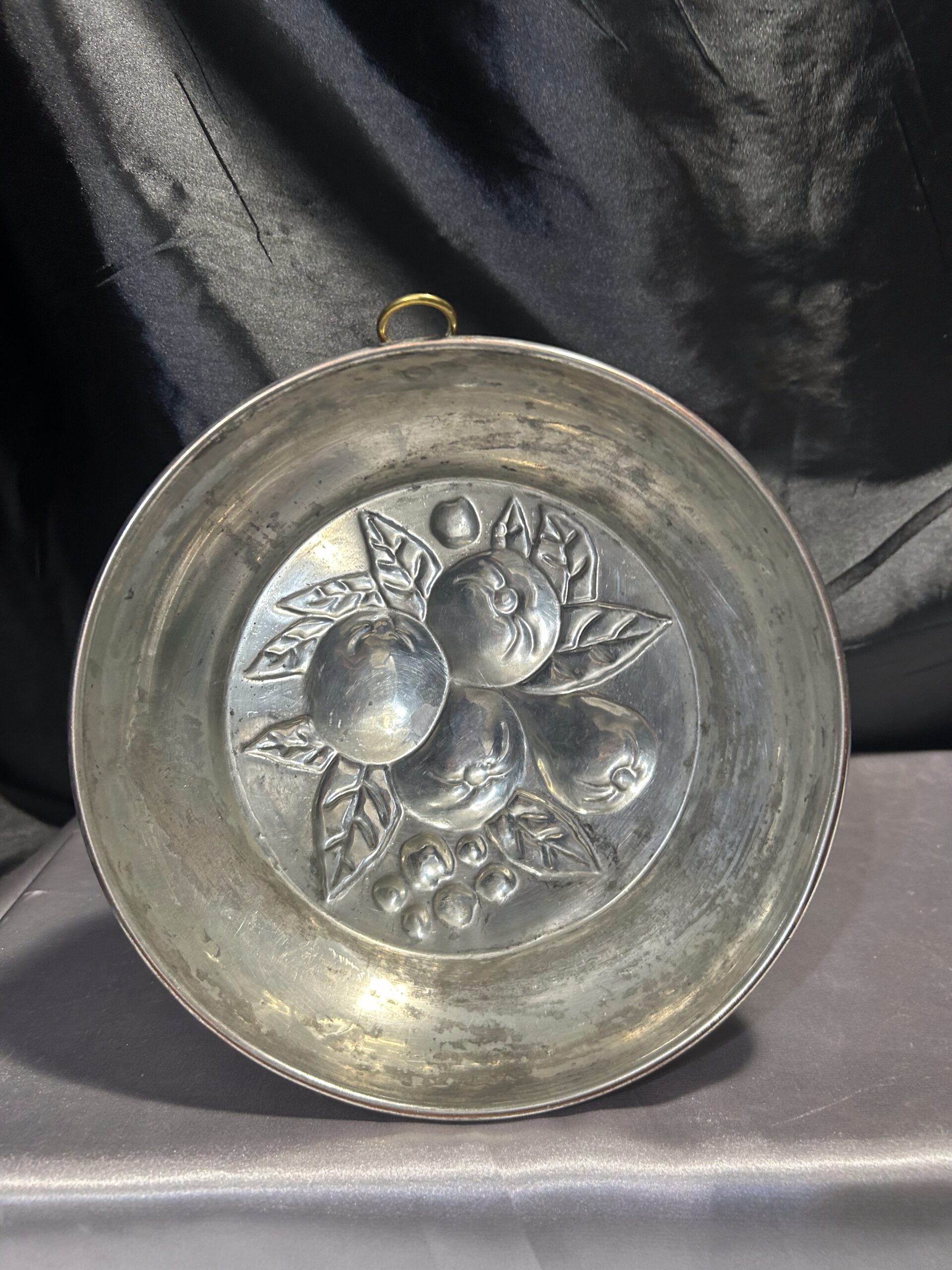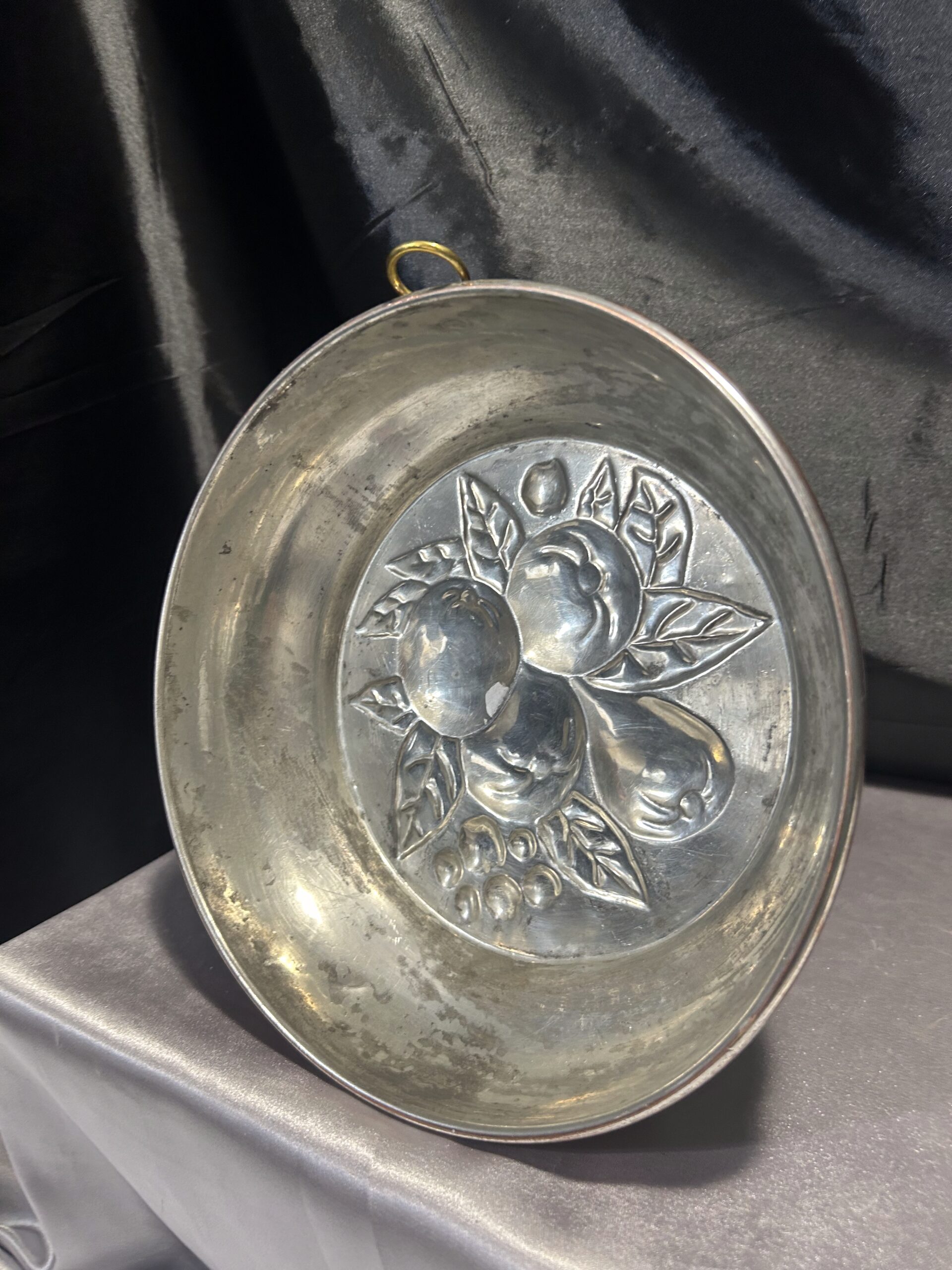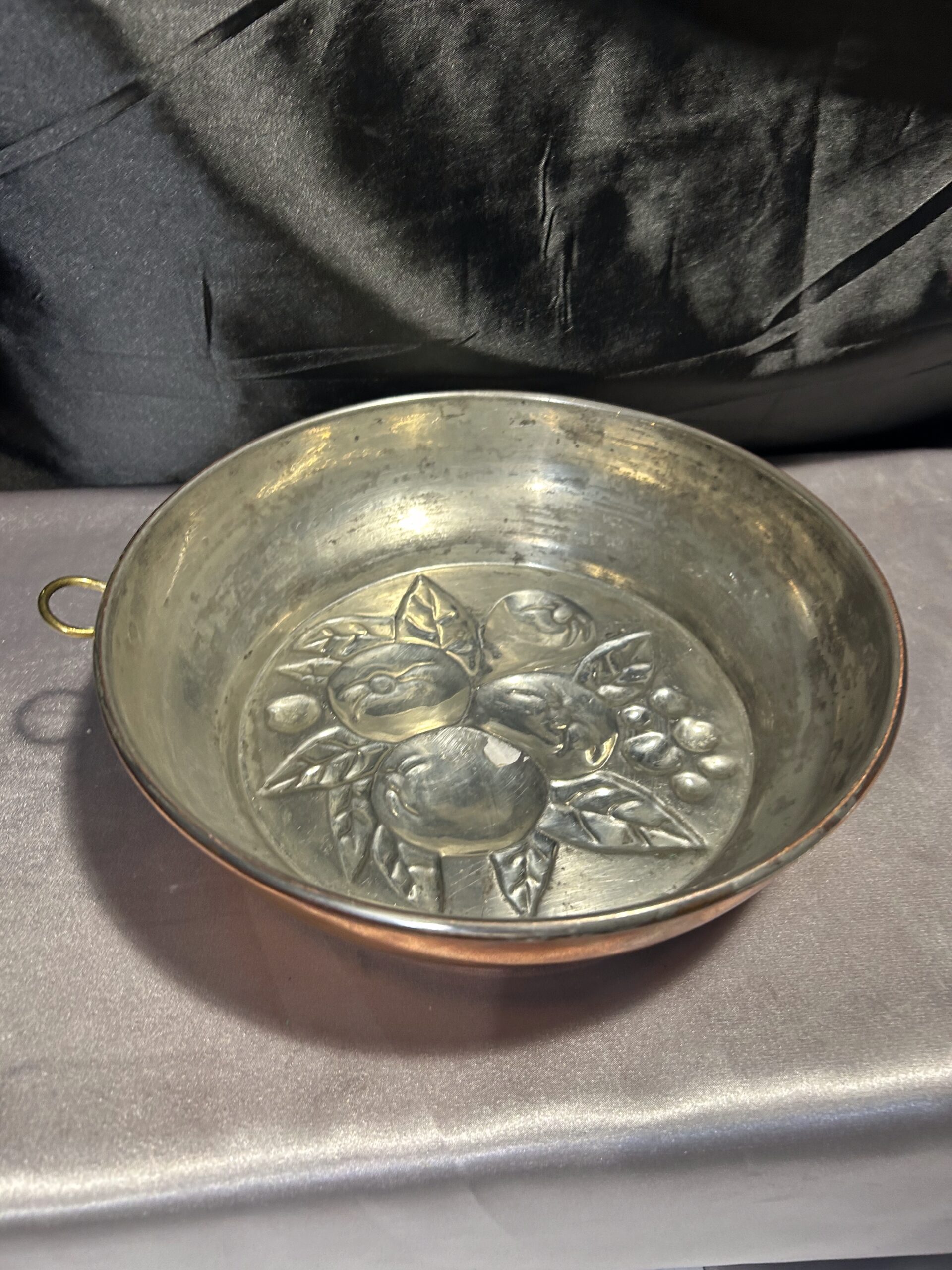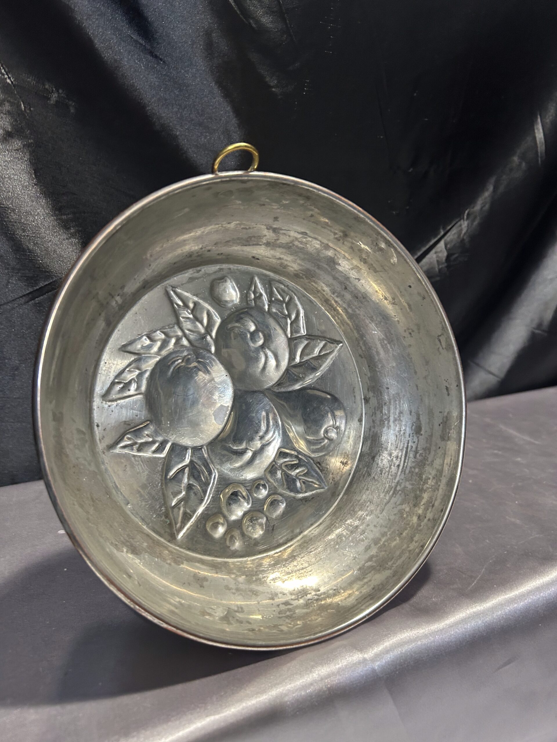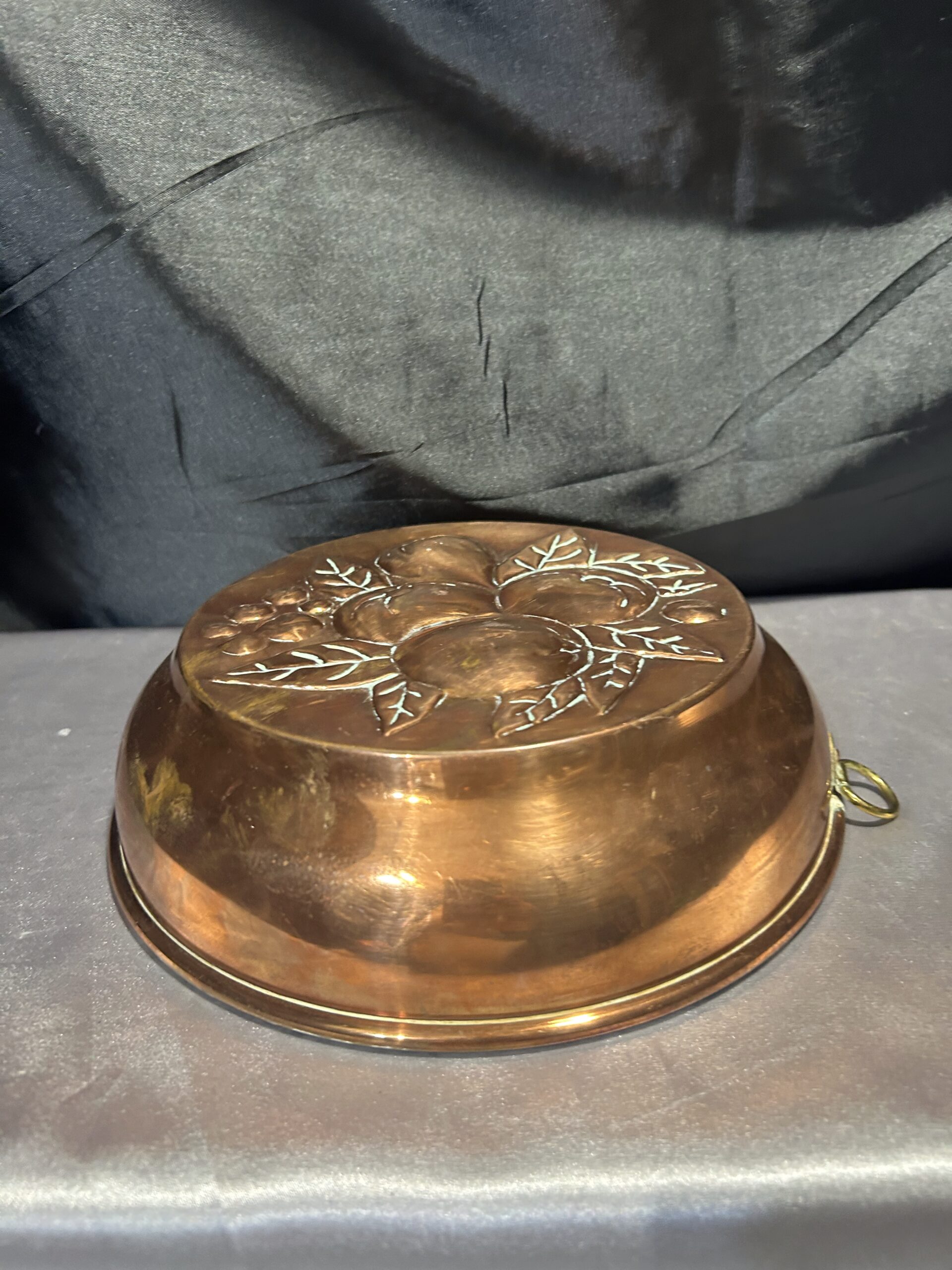 Piękna foremka na ciasto wykonana z miedzi, ozdobiona misternym tłoczeniem przedstawiającym jabłka i gruszki. Klasyczny design sprawia, że foremka może pełnić zarówno funkcję użytkową, jak i dekoracyjną. Dzięki praktycznemu kółeczku można ją zawiesić na ścianie, wprowadzając do wnętrza rustykalny, vintage klimat.