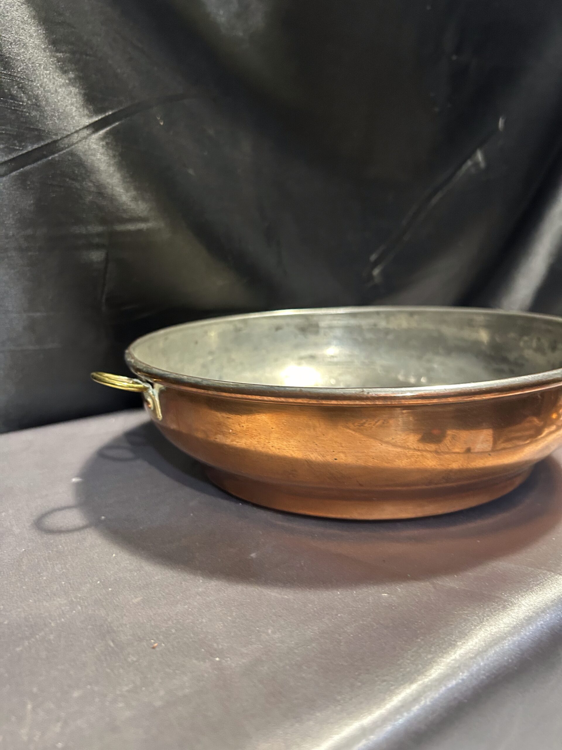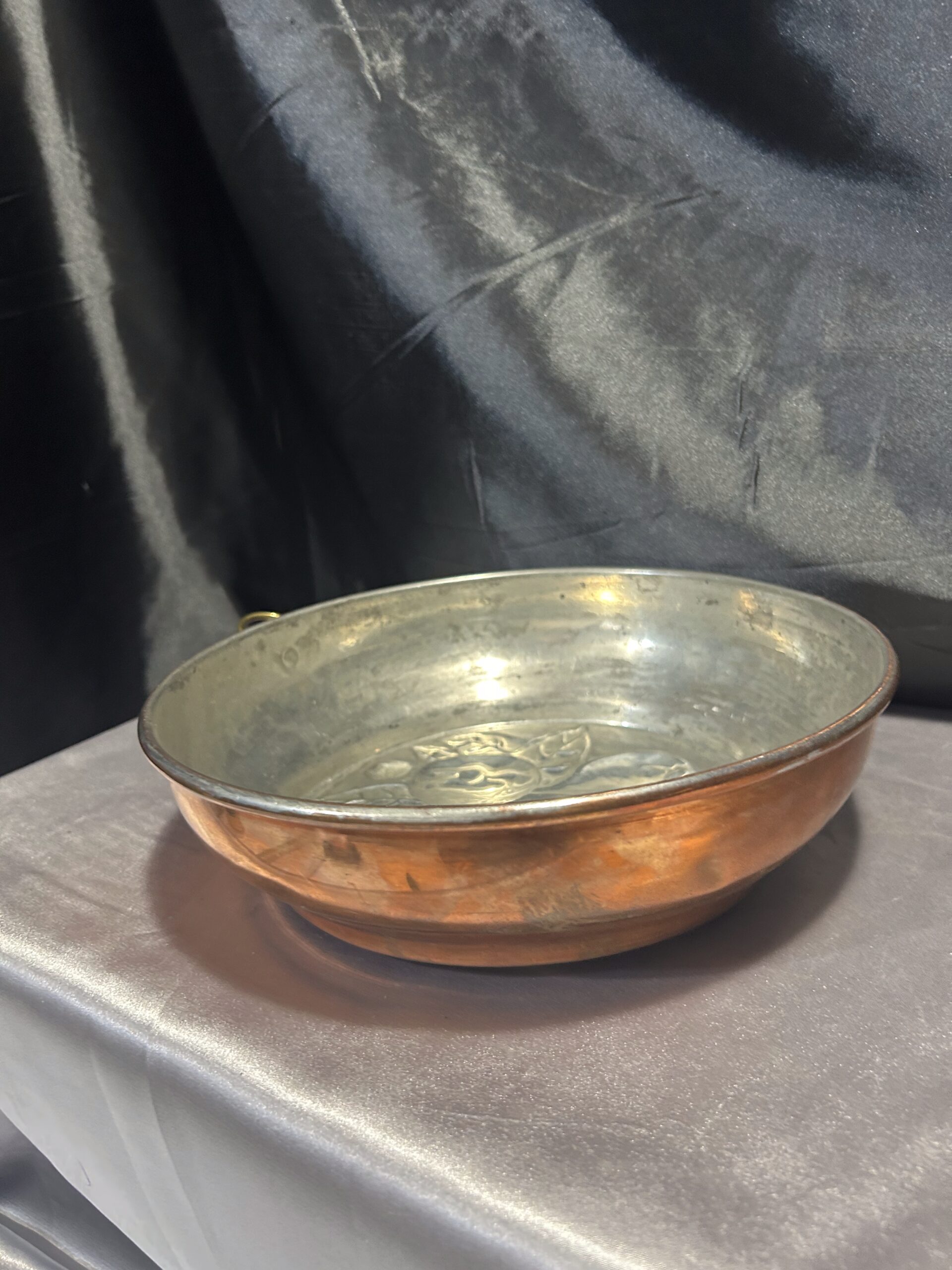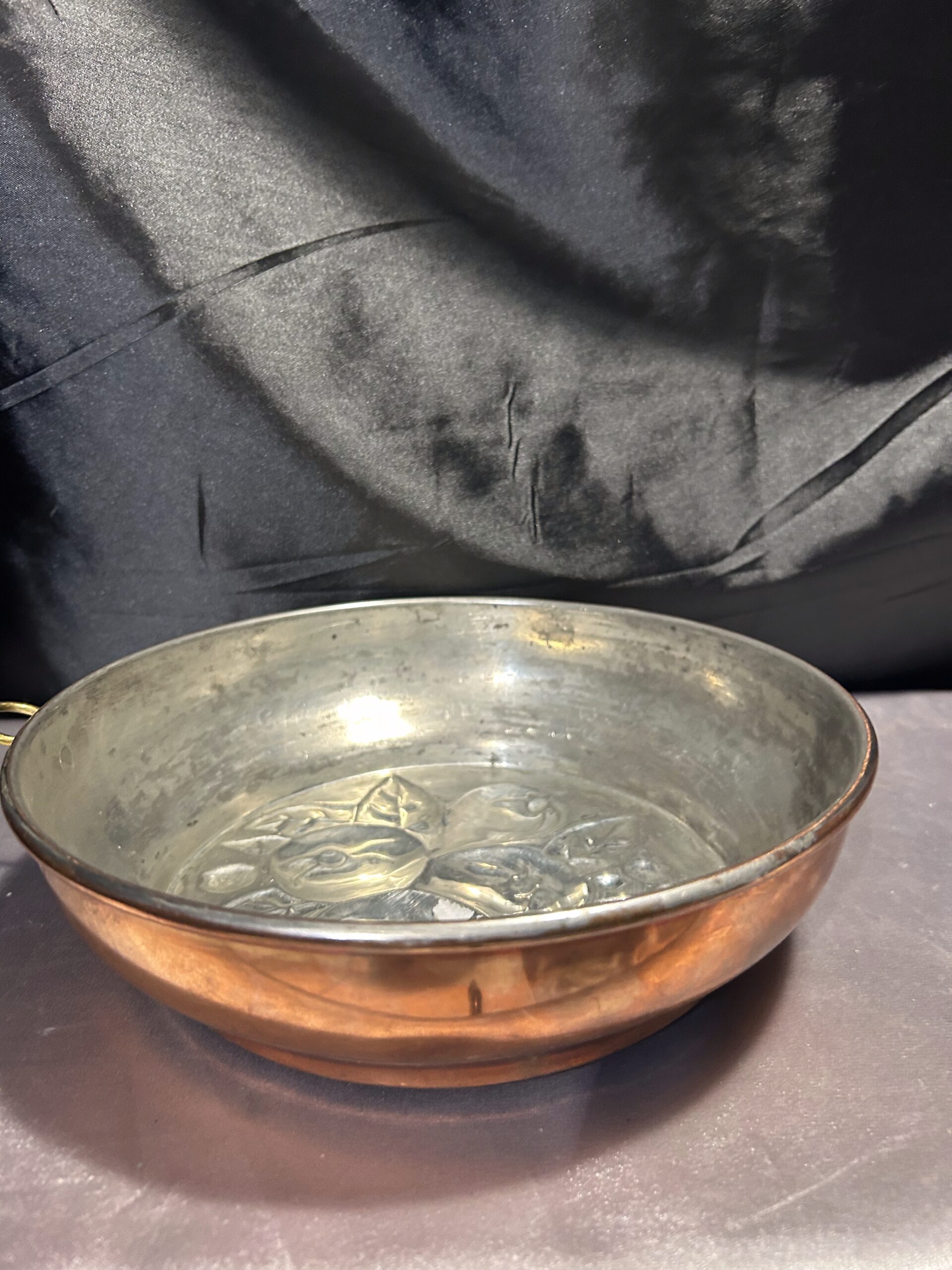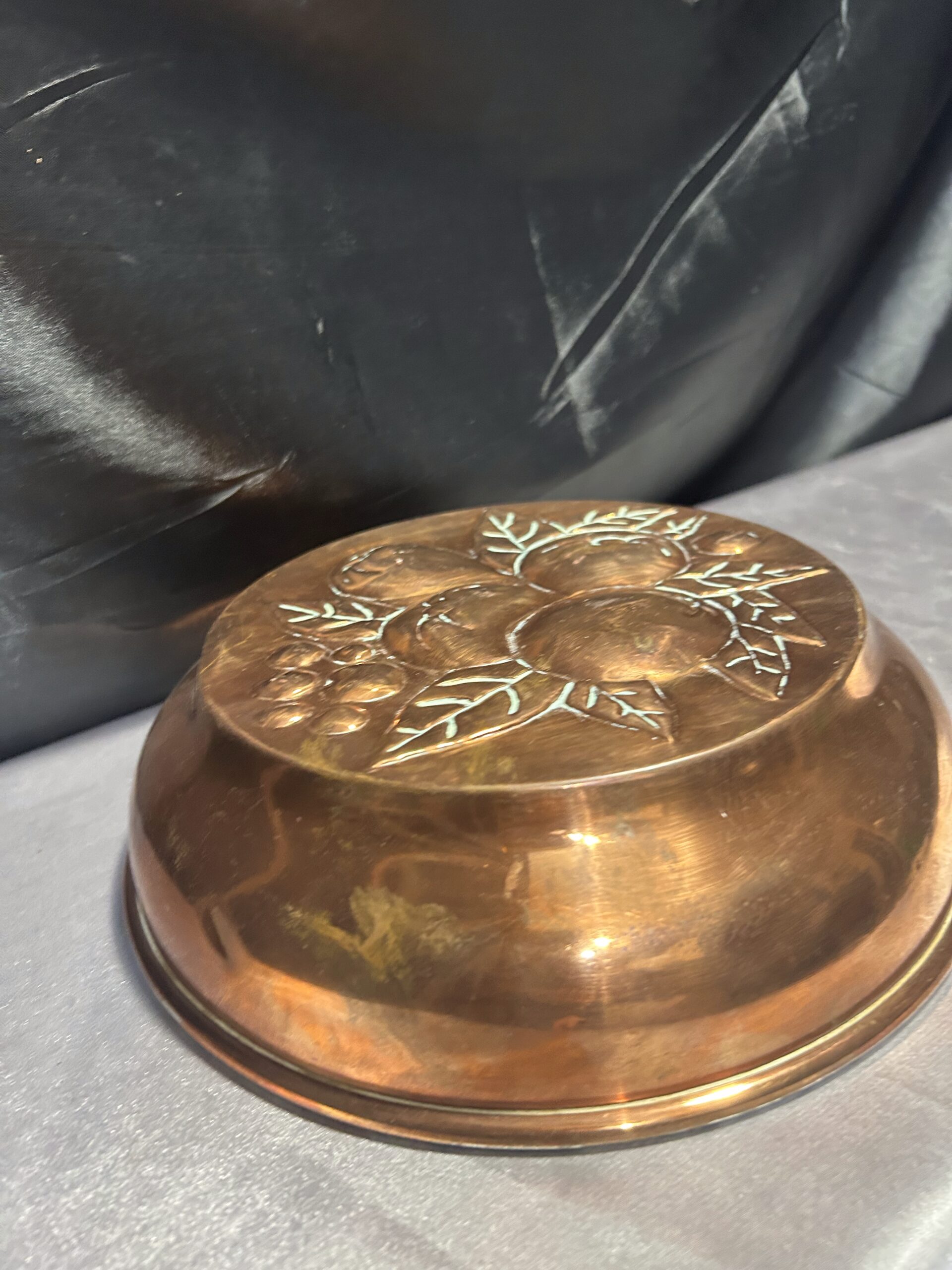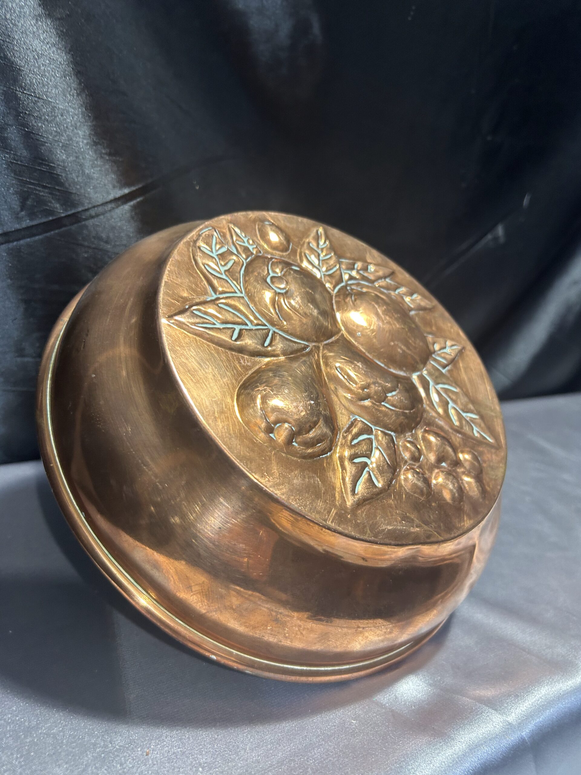 Piękna foremka na ciasto wykonana z miedzi, ozdobiona misternym tłoczeniem przedstawiającym jabłka i gruszki. Klasyczny design sprawia, że foremka może pełnić zarówno funkcję użytkową, jak i dekoracyjną. Dzięki praktycznemu kółeczku można ją zawiesić na ścianie, wprowadzając do wnętrza rustykalny, vintage klimat.