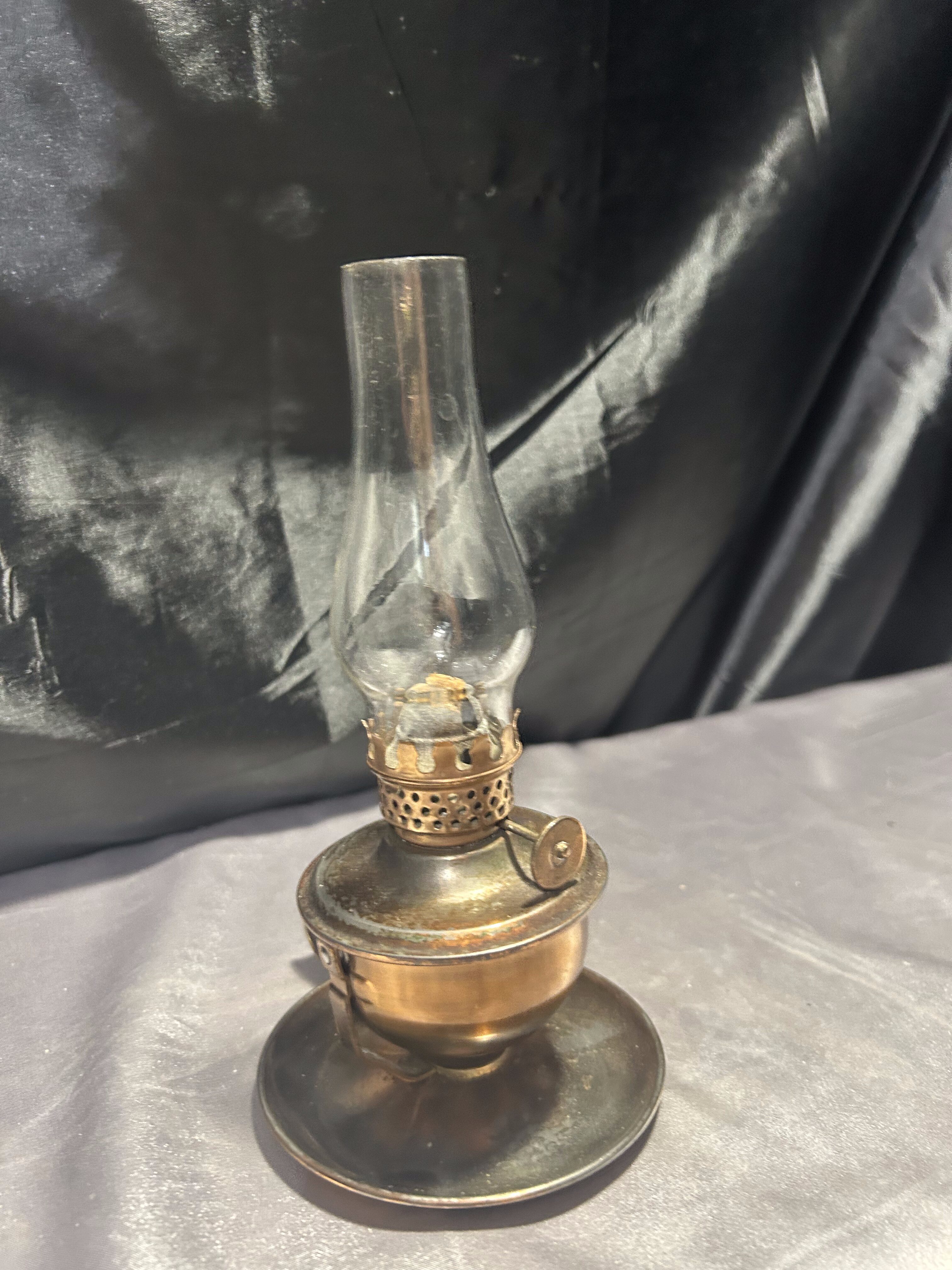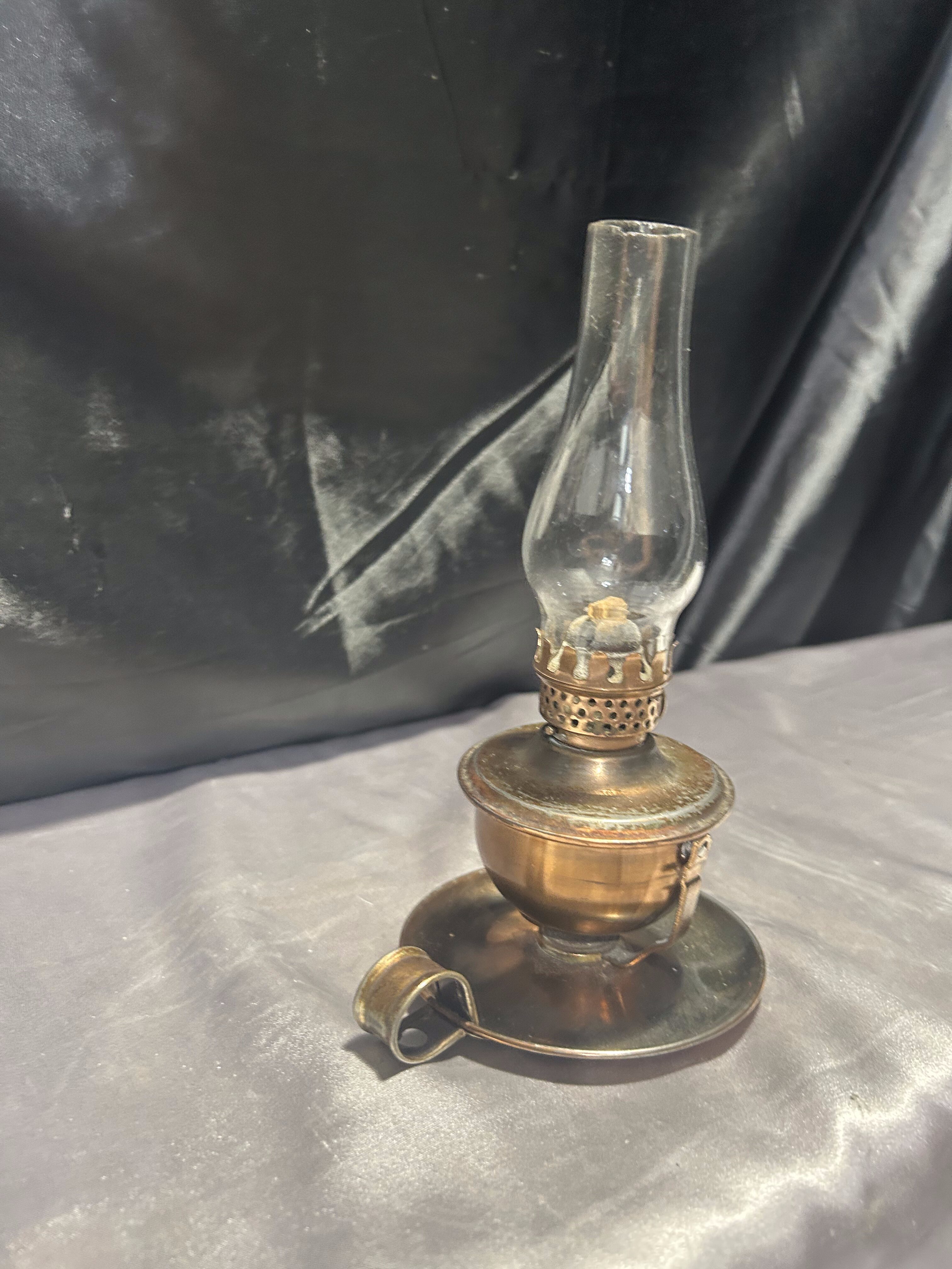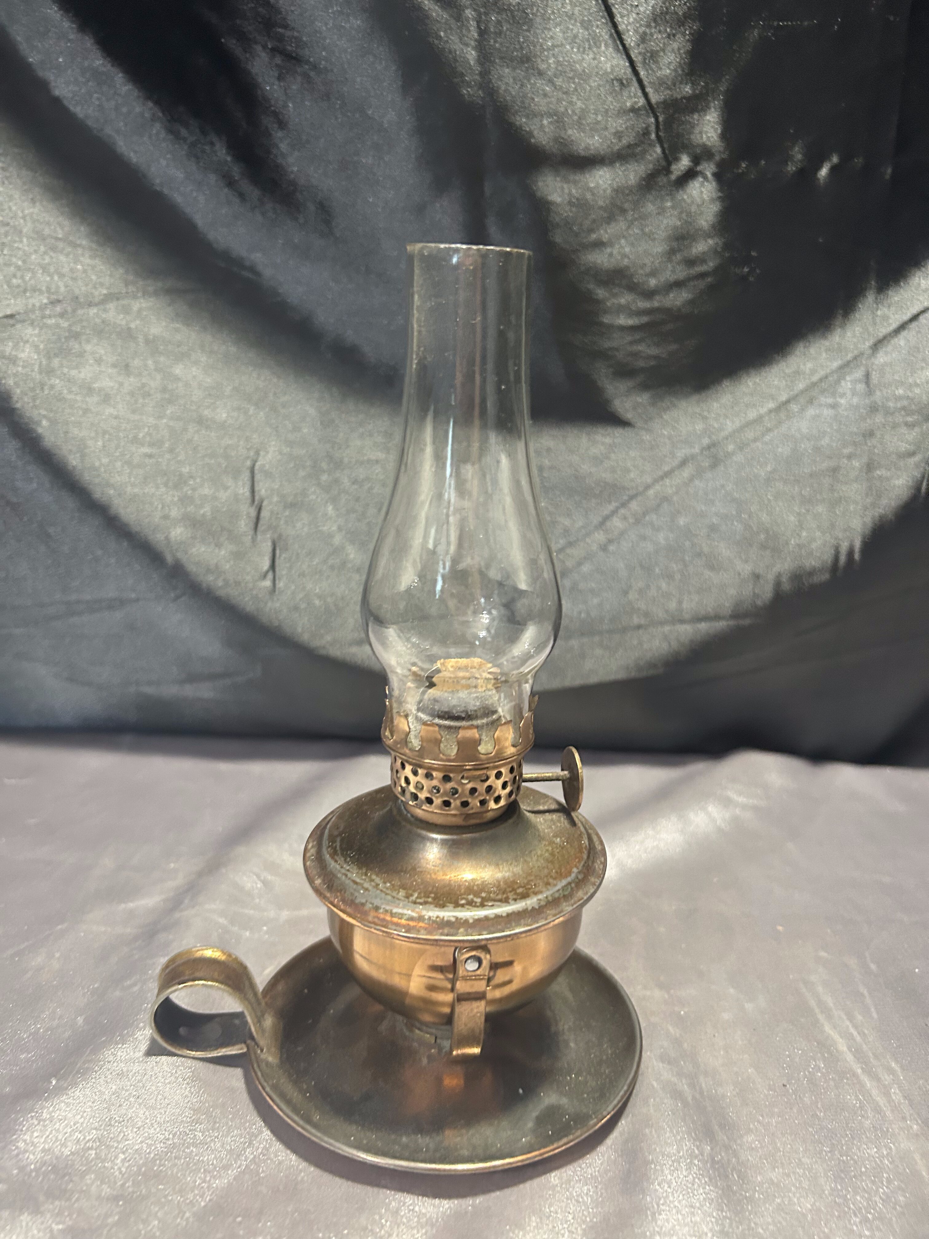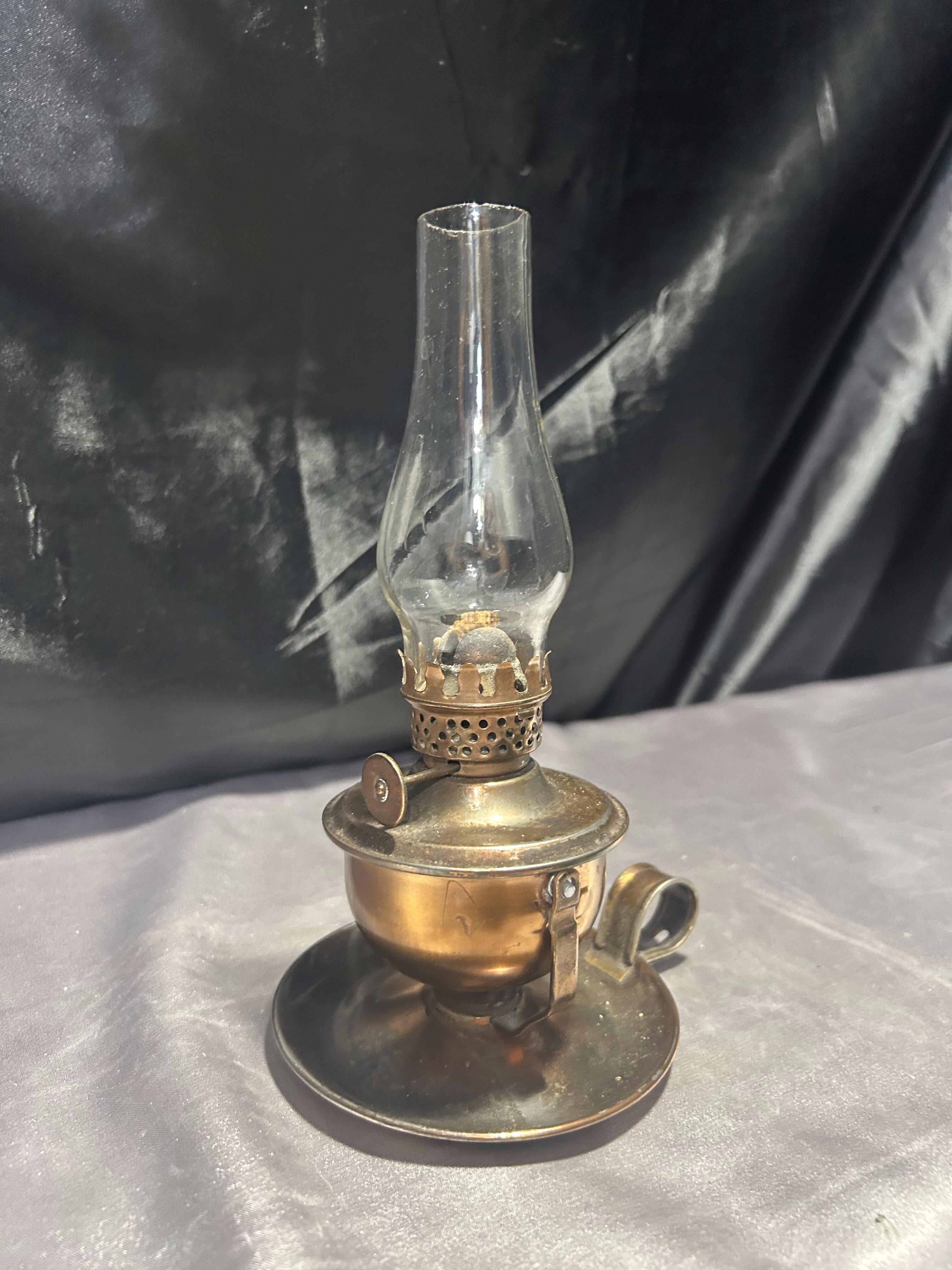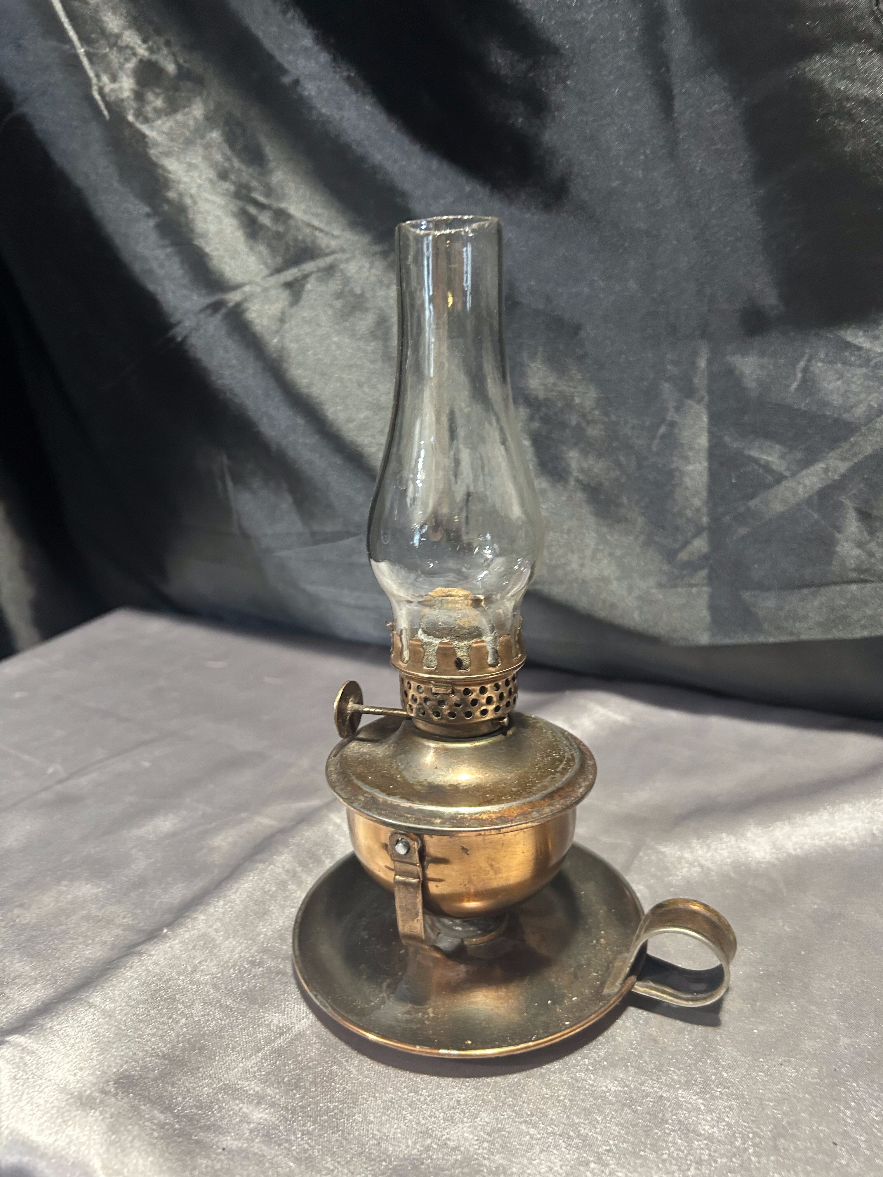 Urokliwa lampa naftowa wykonana z miedzi, zachowana w klasycznej formie przypominającej kaganek. Wyposażona w uchwyt umożliwiający zarówno ustawienie na płaskiej powierzchni, jak i zawieszenie na ścianie lub w odpowiednim uchwycie.