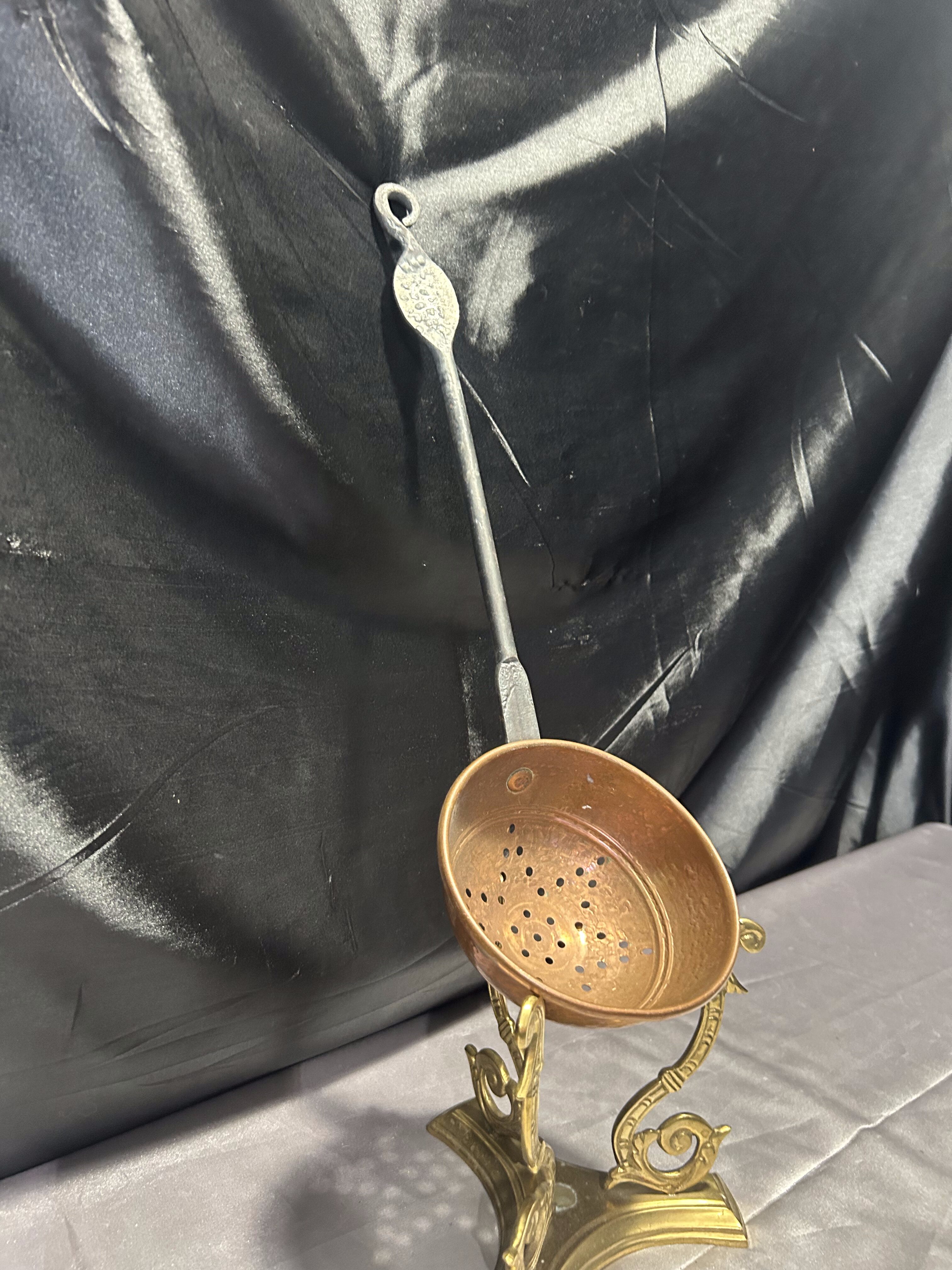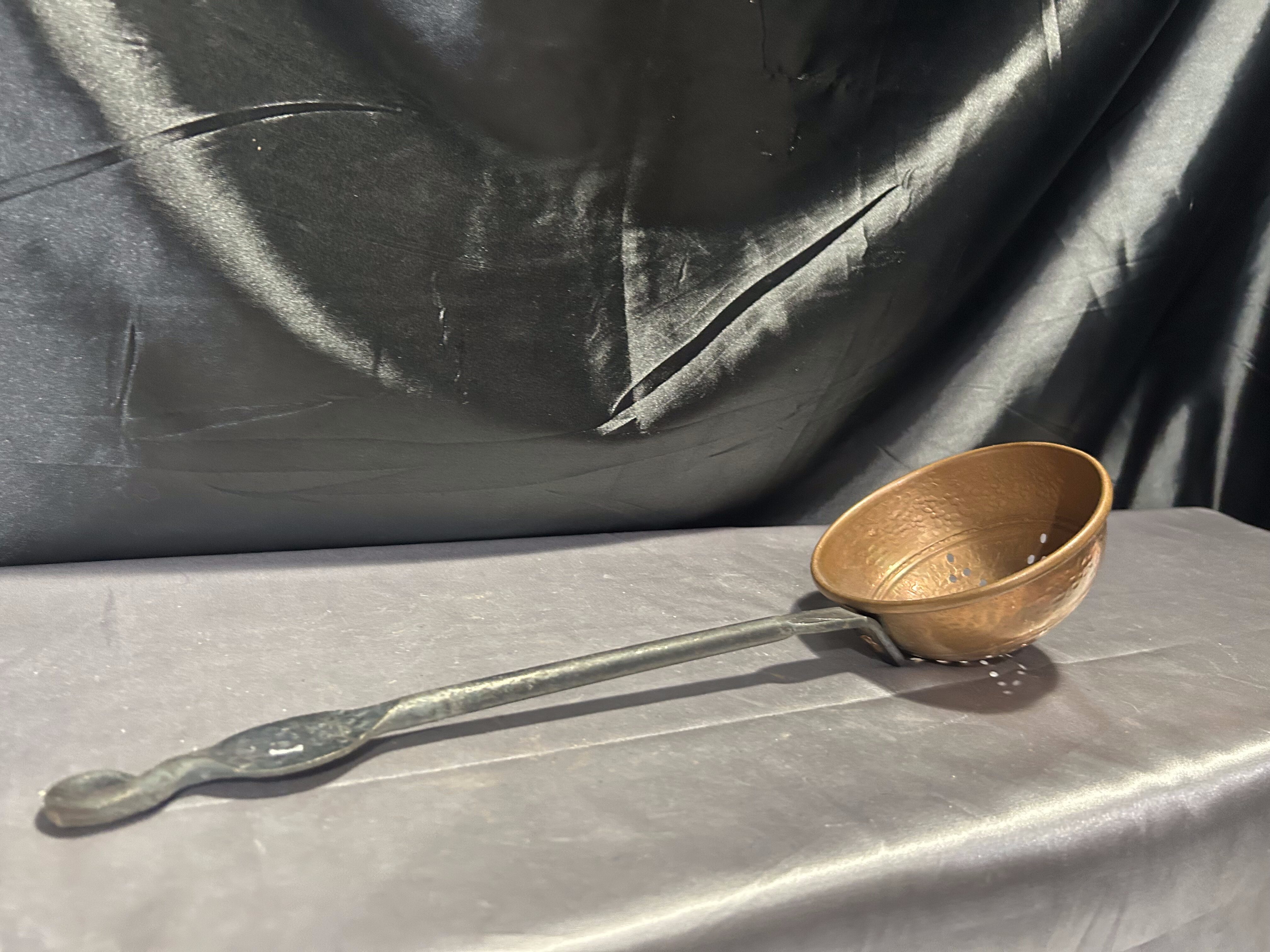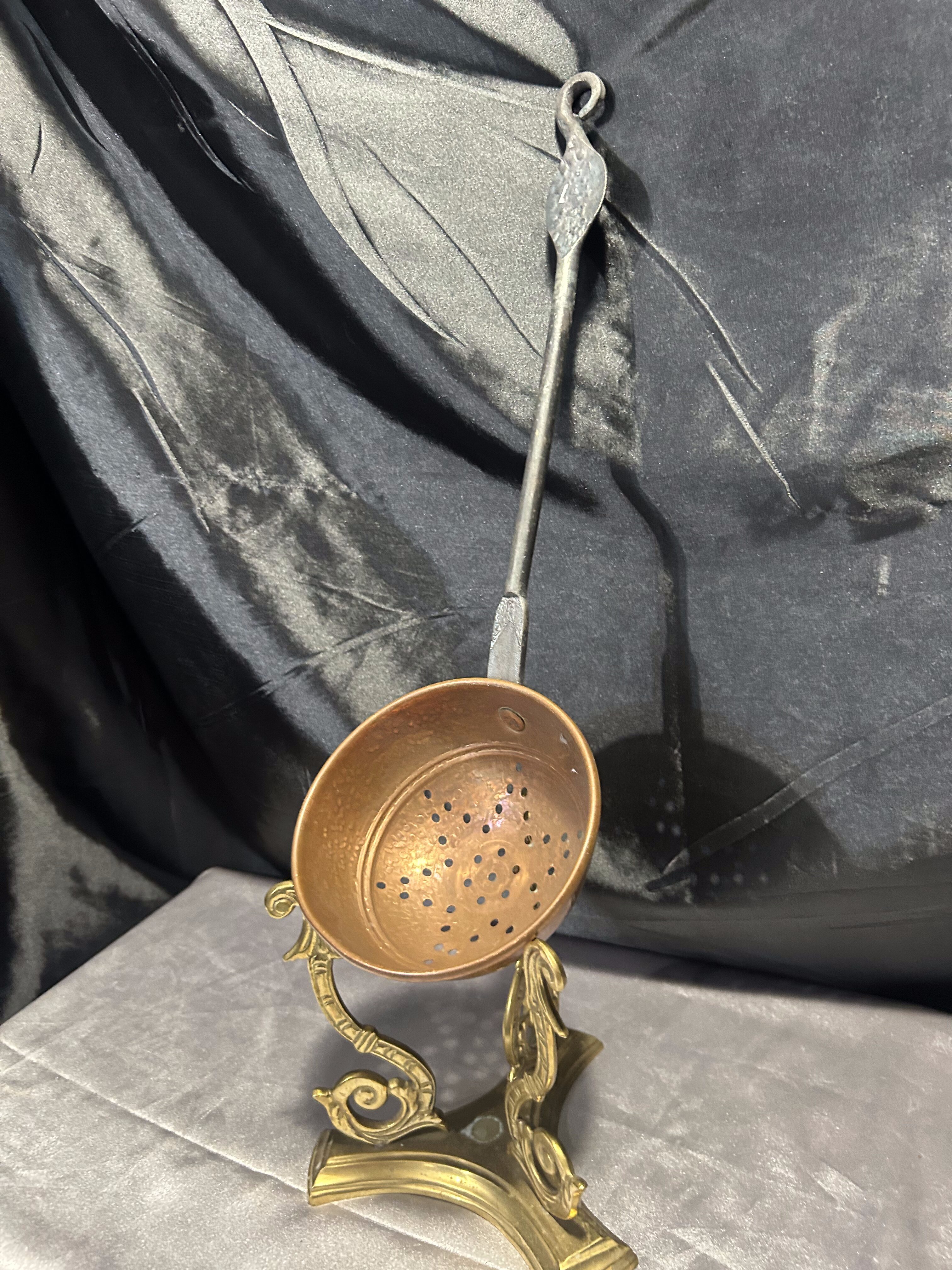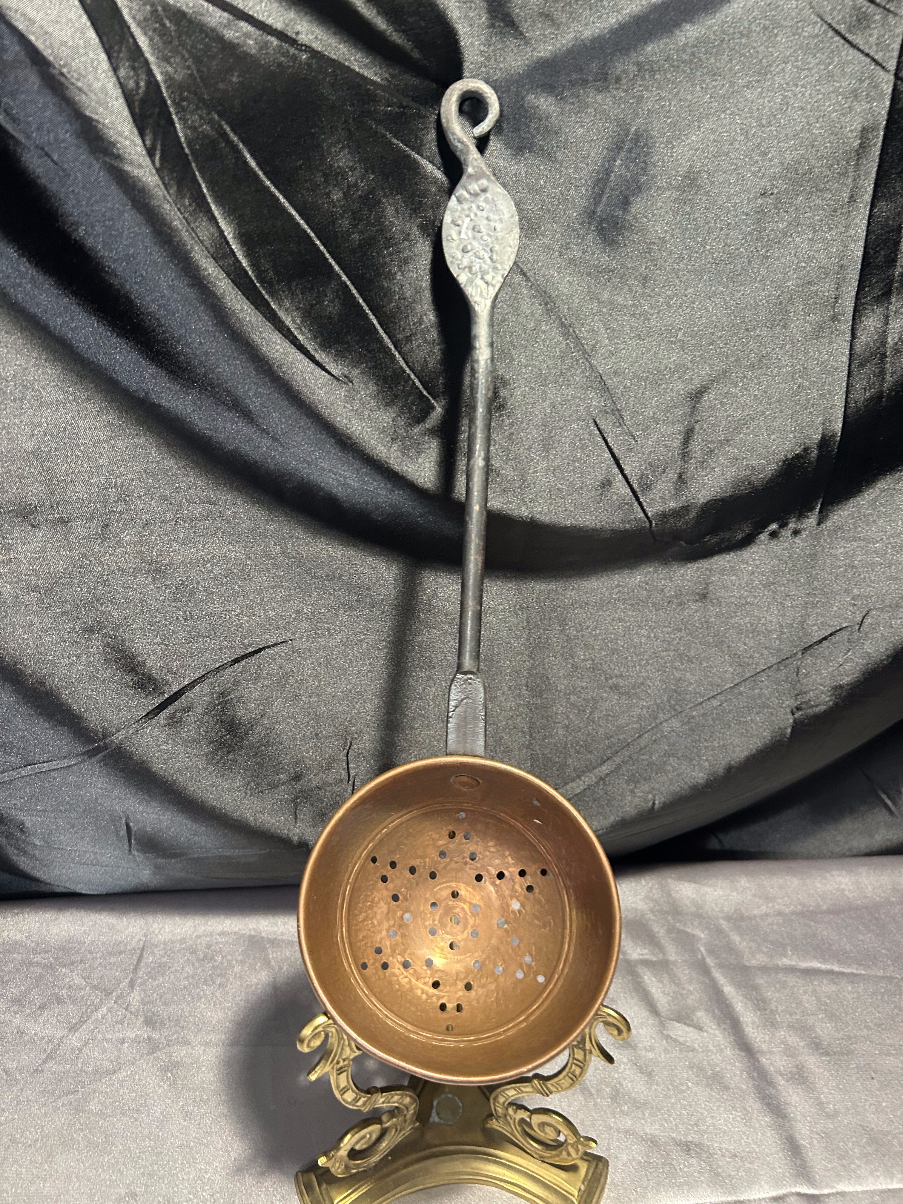 Solidna łyżka cedzakowa wykonana z miedzi, z kutą rączką zakończoną praktycznym haczykiem do zawieszenia. Imponująca długość i misternie wykończony detal czynią z niej nie tylko funkcjonalne narzędzie kuchenne, ale i wyjątkowy element dekoracyjny w stylu rustykalnym lub vintage.