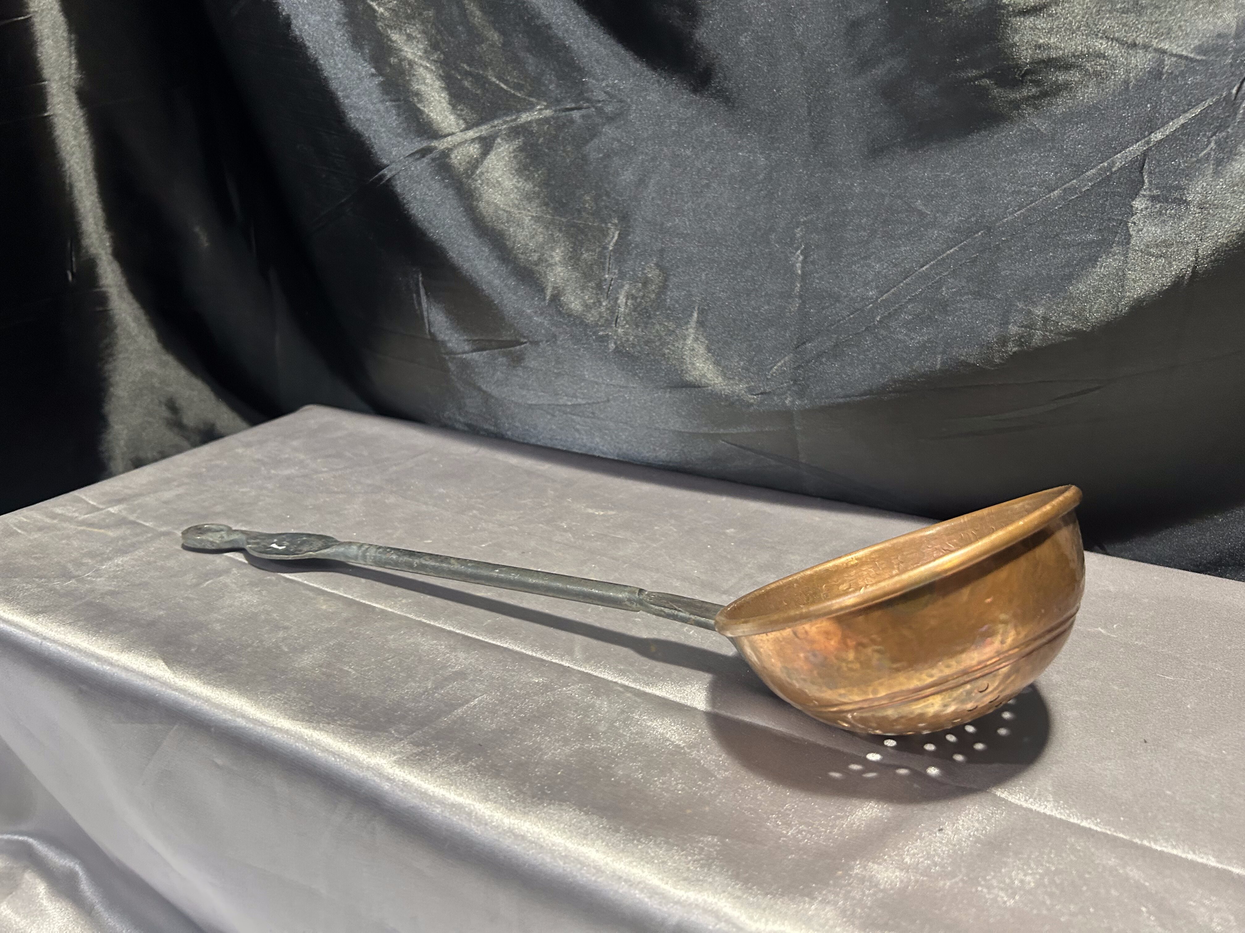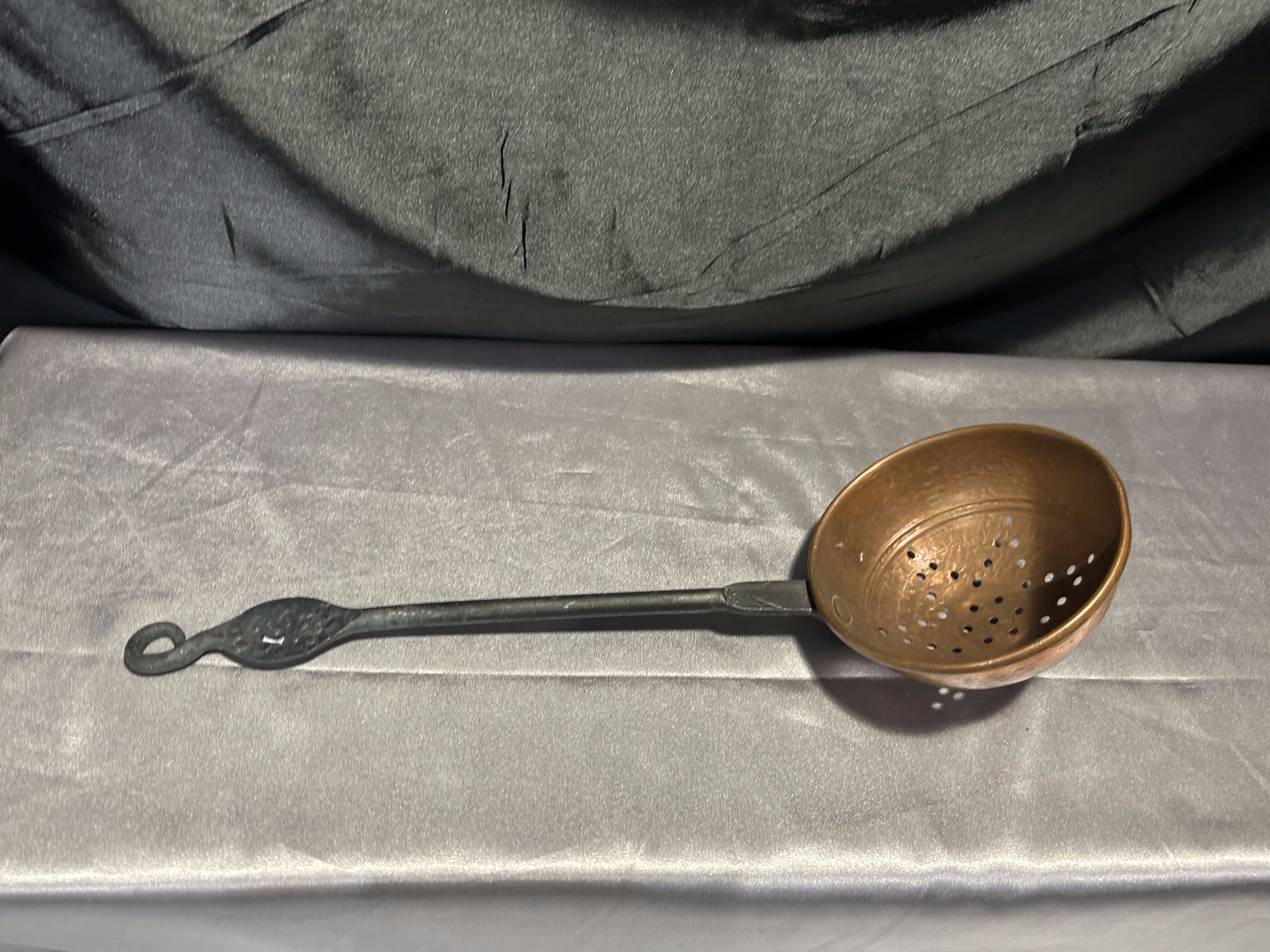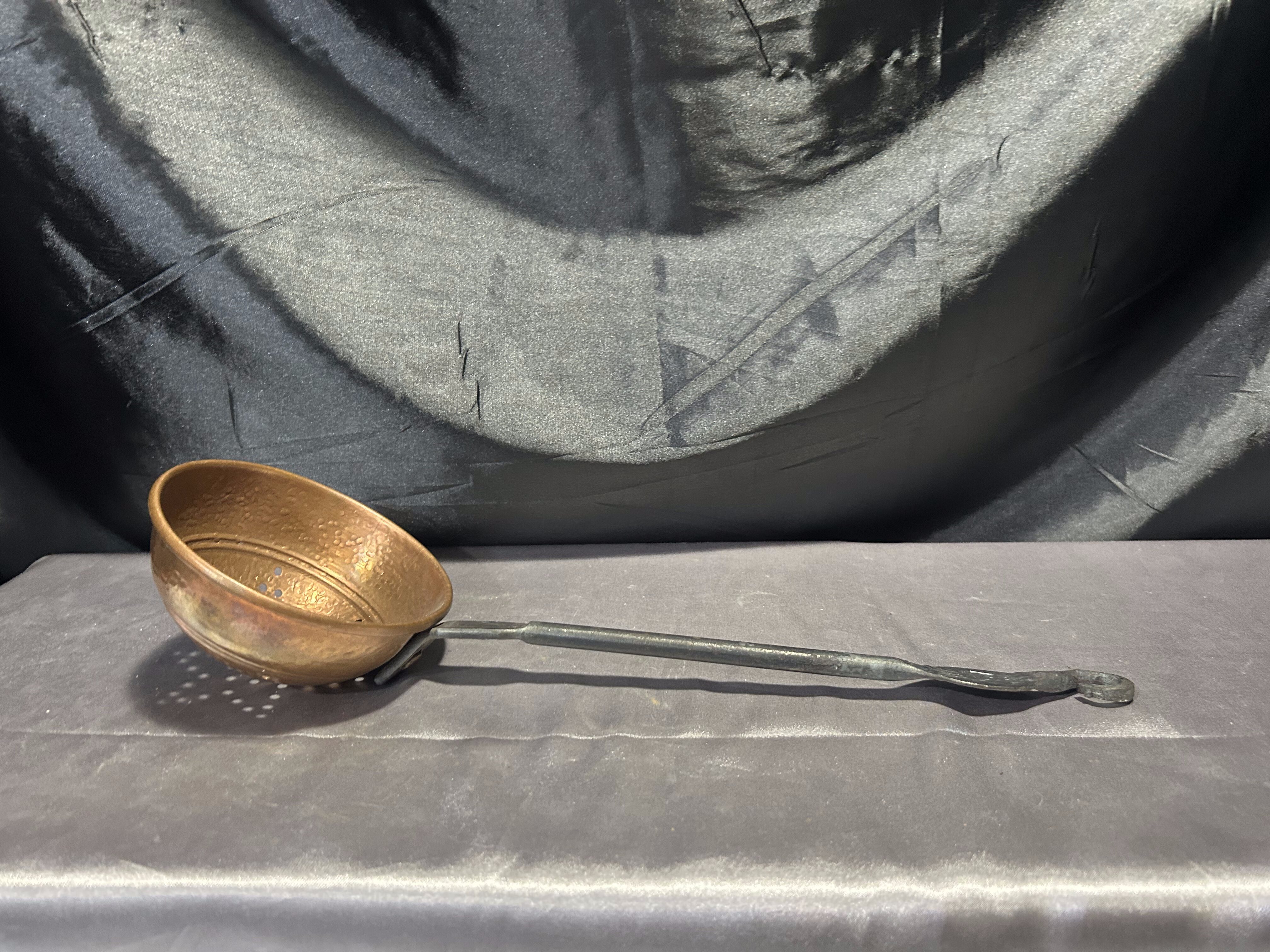 Miedziana łyżka cedzakowa – Kuta rączka z haczykiem – Styl rustykalny