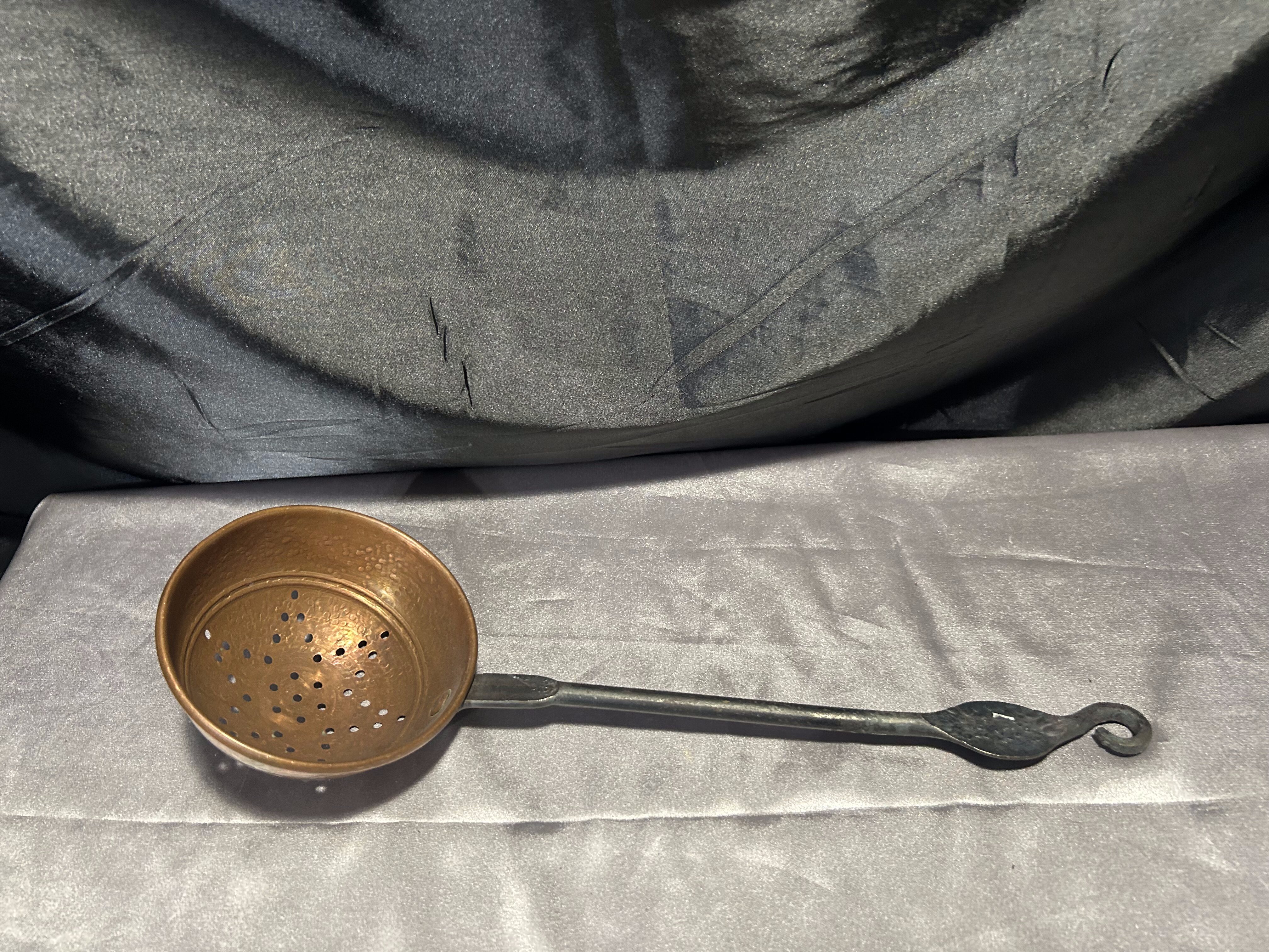 - Miedziana łyżka cedzakowa – Kuta rączka z haczykiem – Styl rustykalny