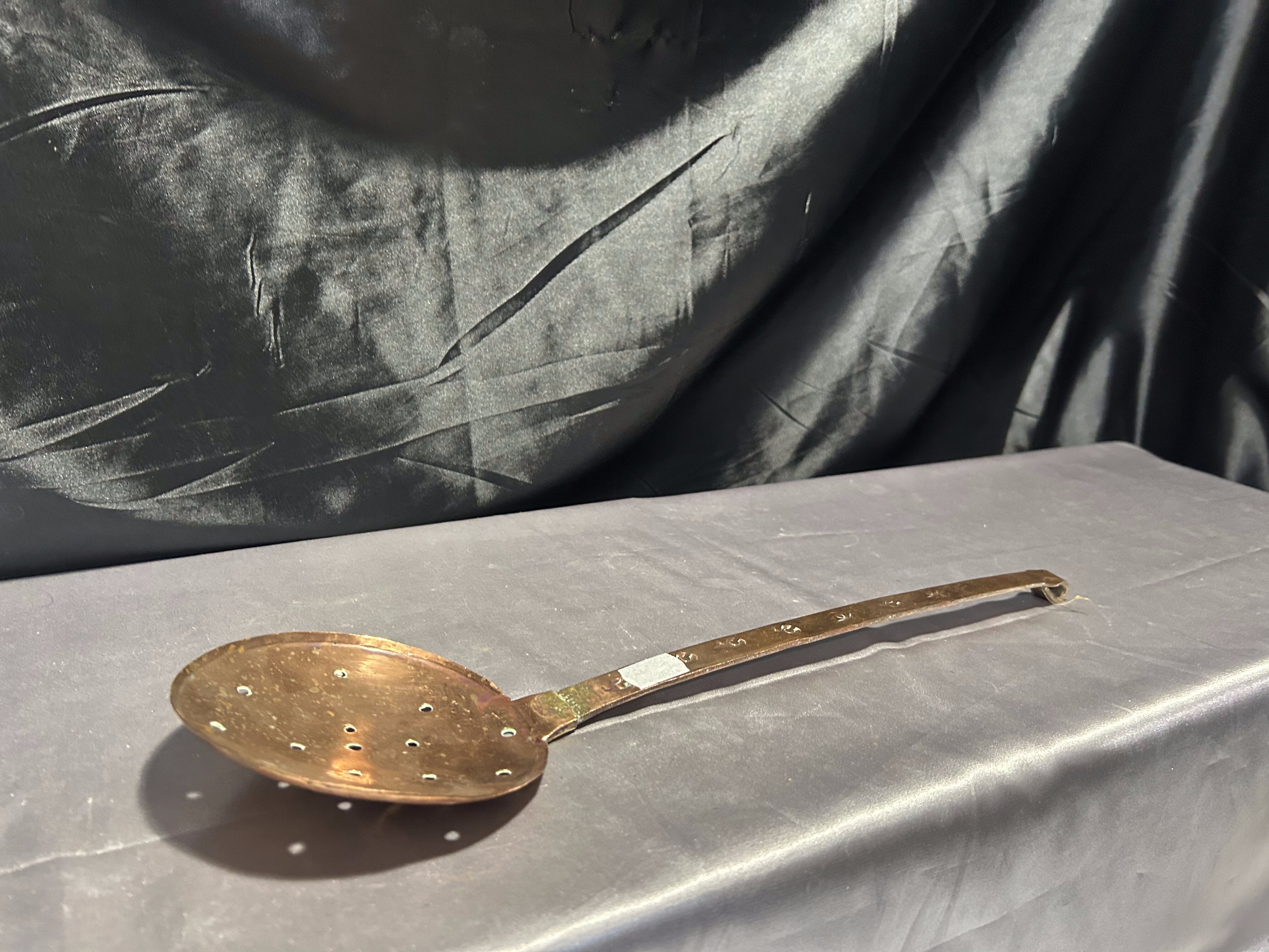 Miedziana łyżka cedzakowa – Kuta rączka – Styl rustykalny