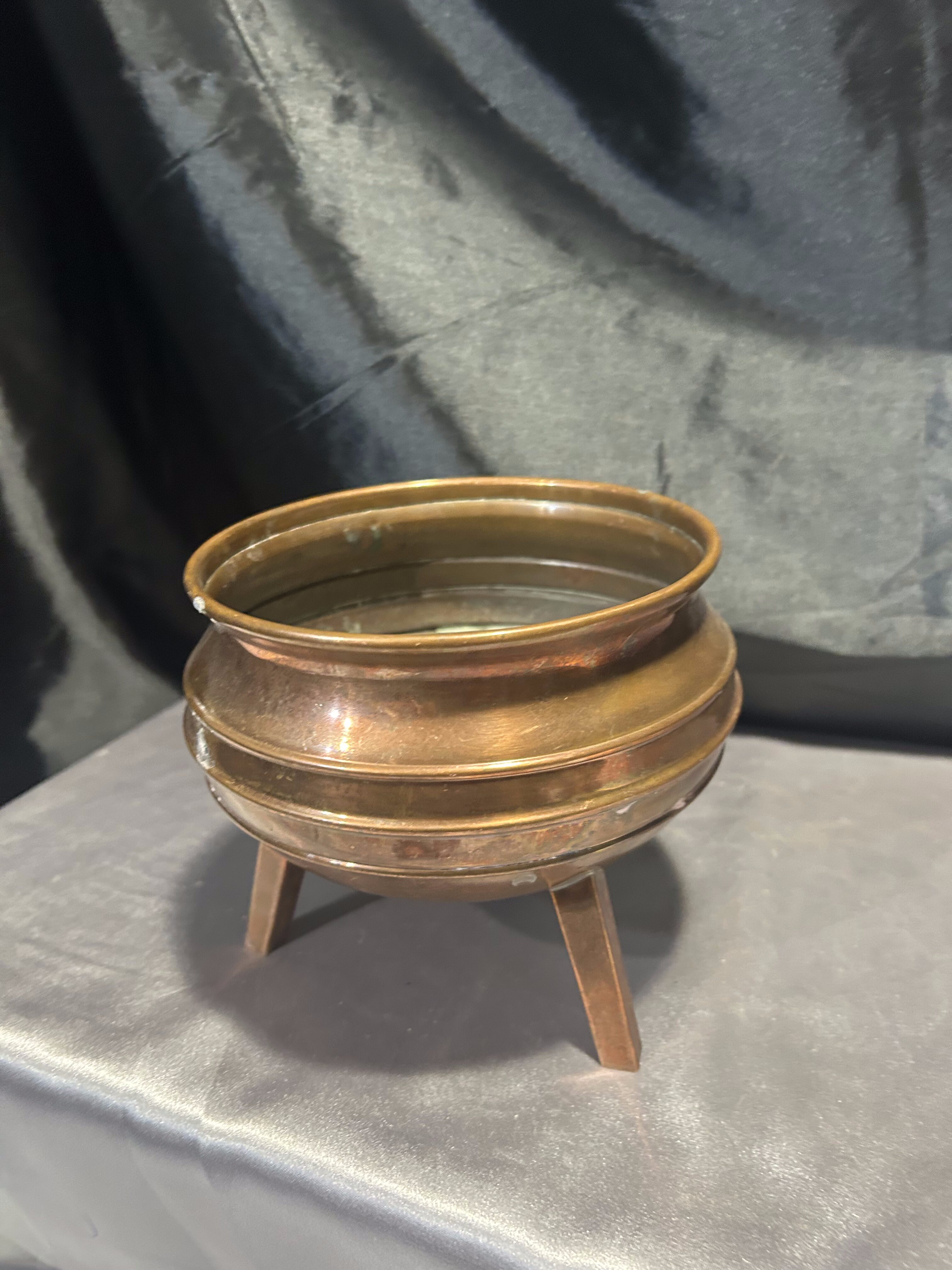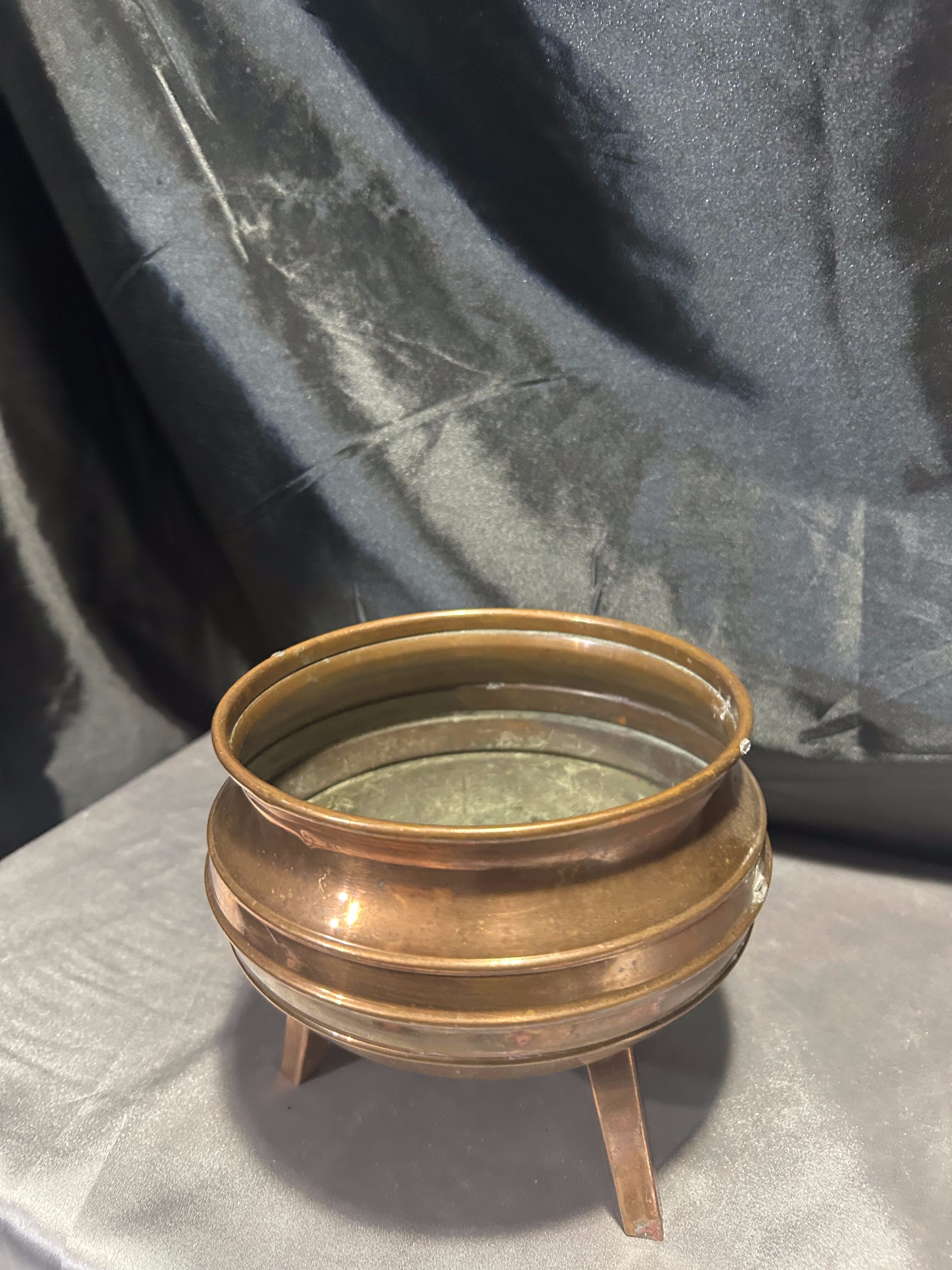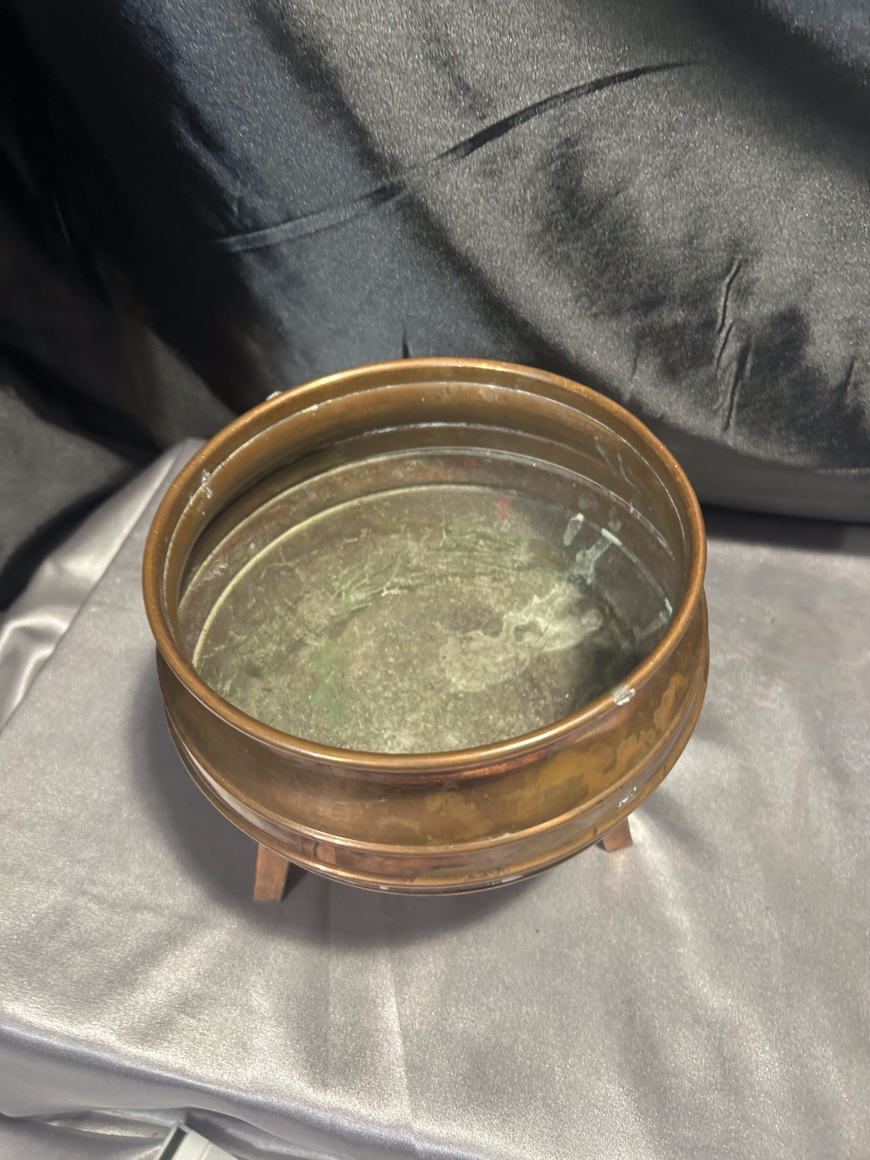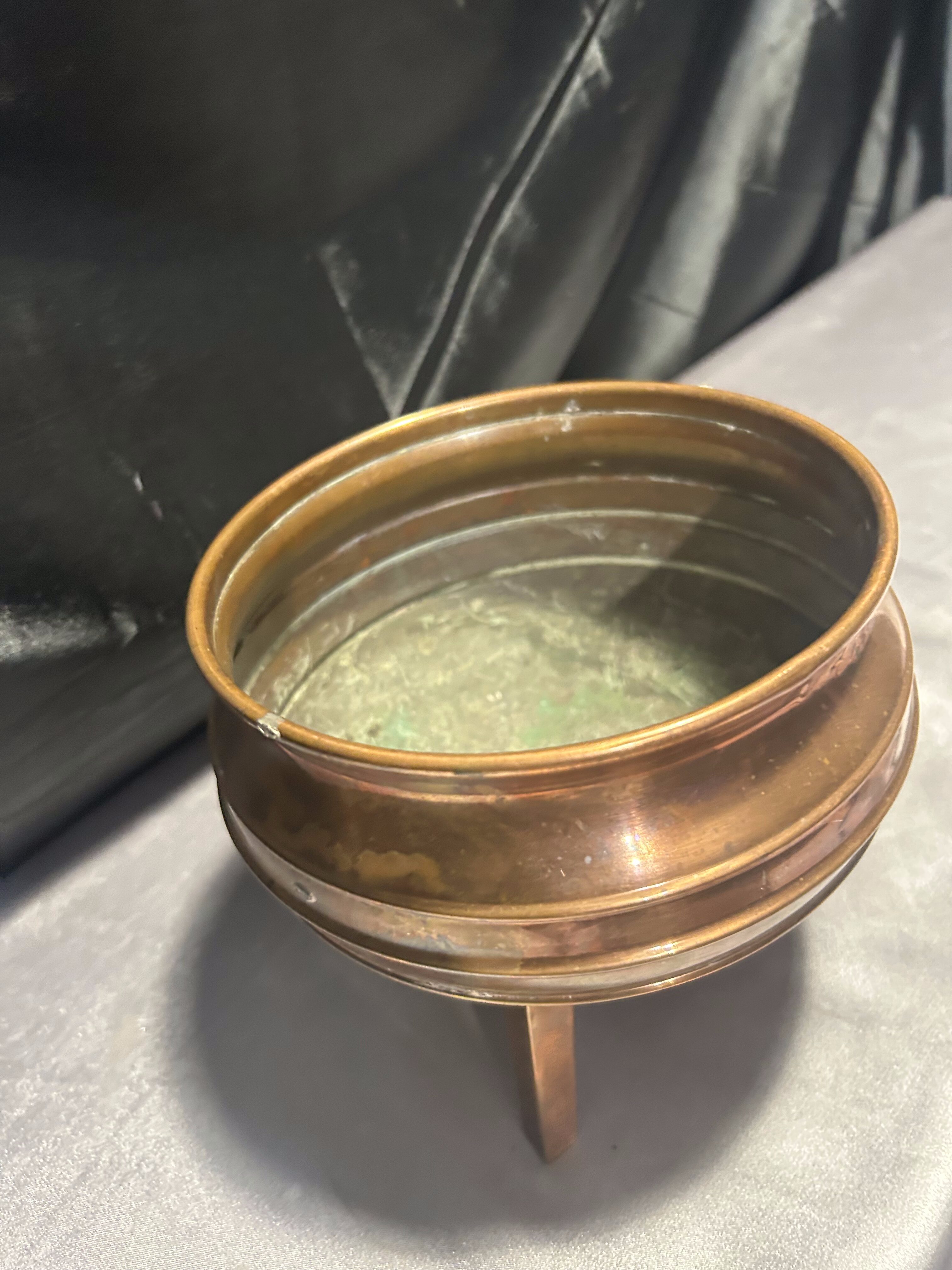 Na sprzedaż miedziana misa, która może pełnić funkcję pater lub kwietnika. Osadzona na trzech stabilnych nogach, wyróżnia się klasycznym designem oraz subtelną patyną, podkreślającą jej elegancki charakter.