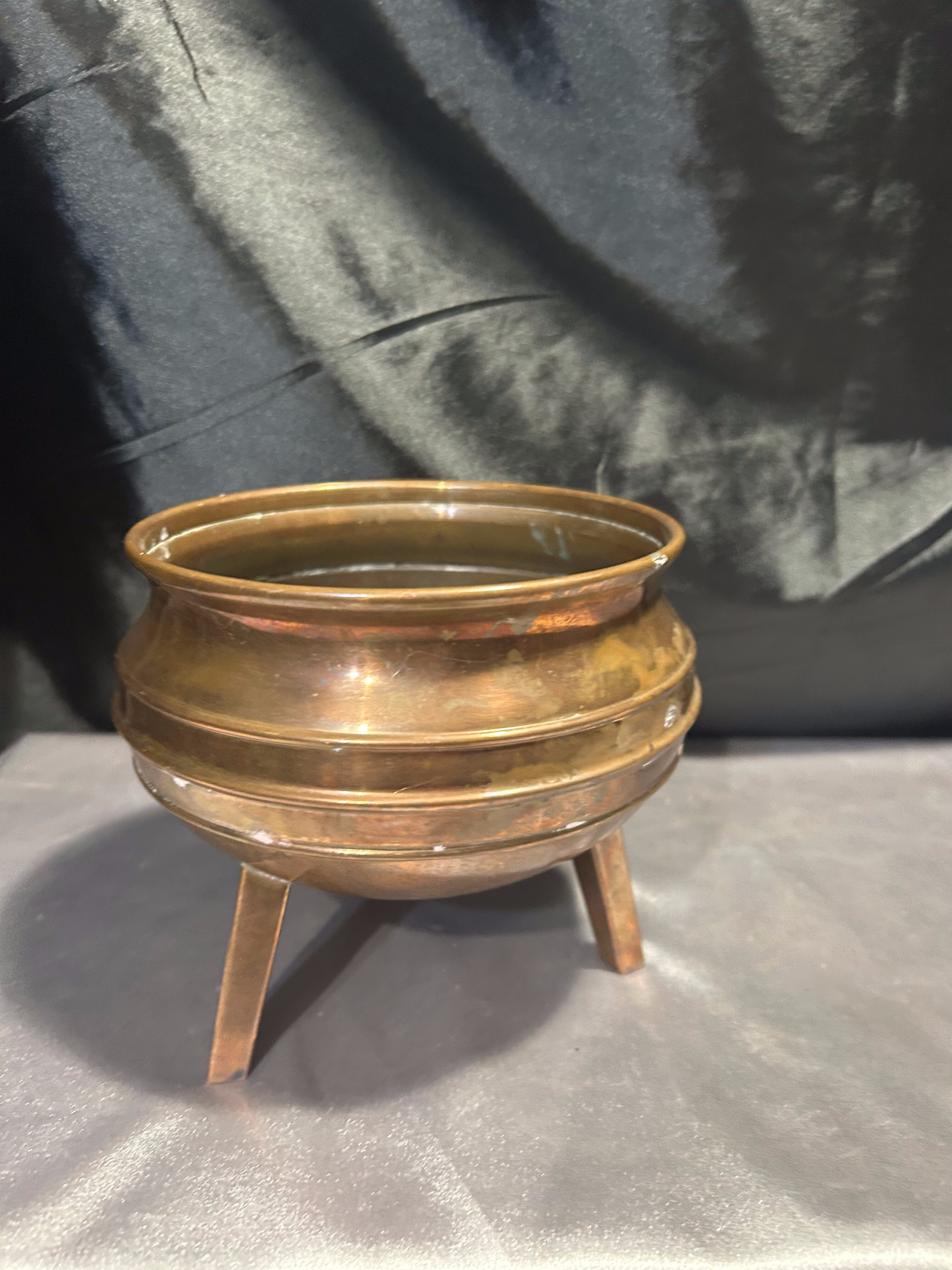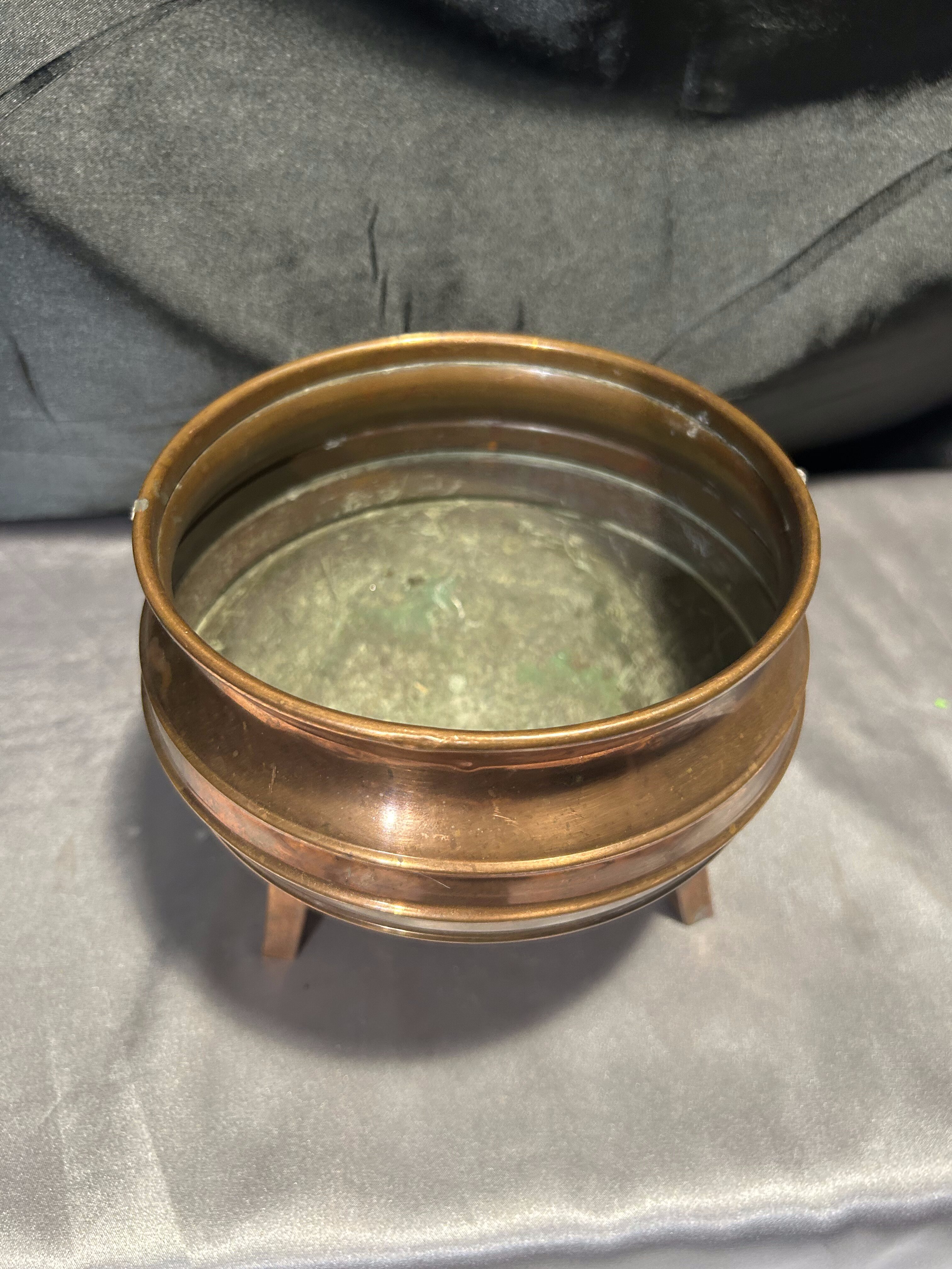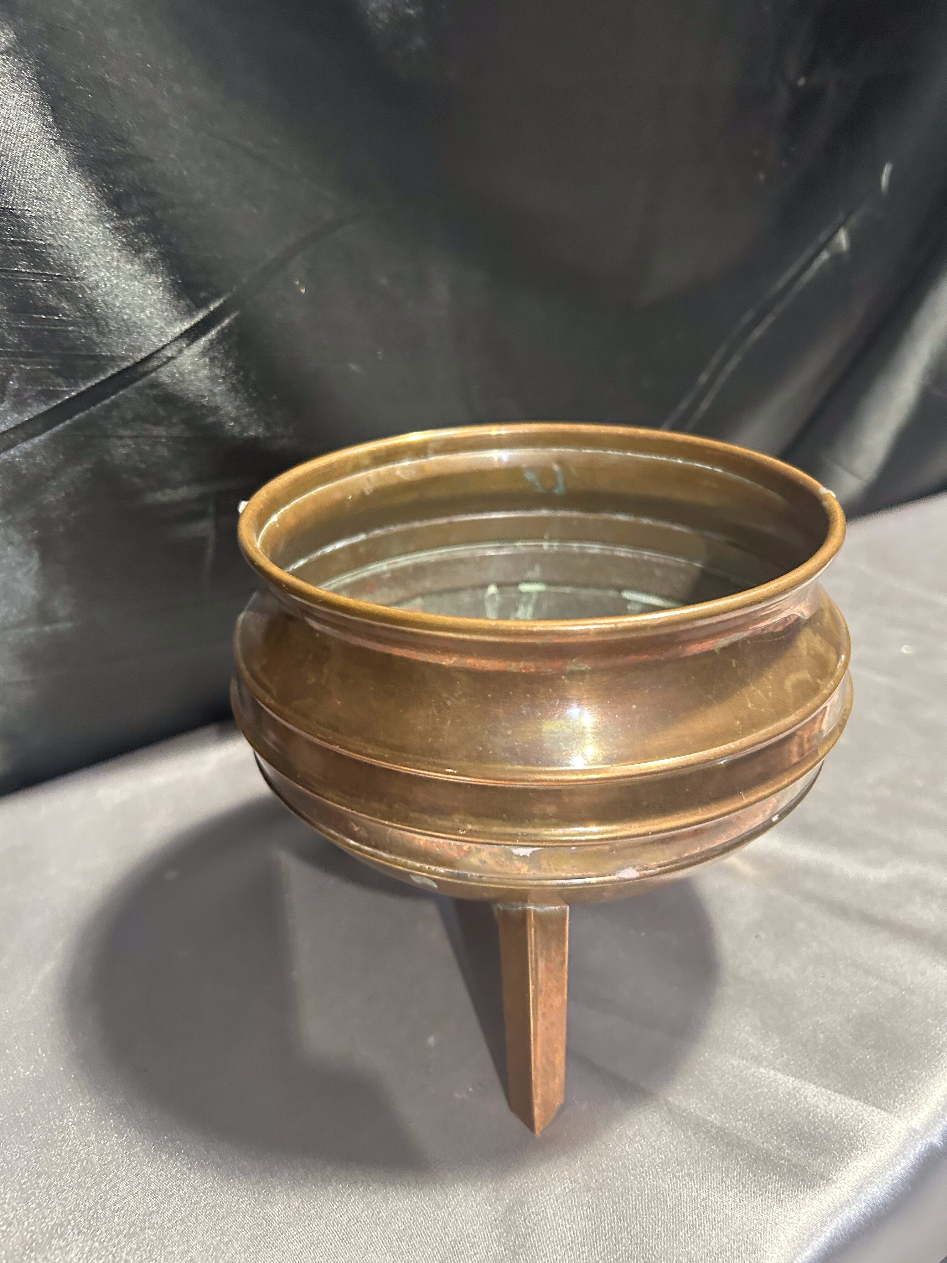 Na sprzedaż miedziana misa, która może pełnić funkcję pater lub kwietnika. Osadzona na trzech stabilnych nogach, wyróżnia się klasycznym designem oraz subtelną patyną, podkreślającą jej elegancki charakter.