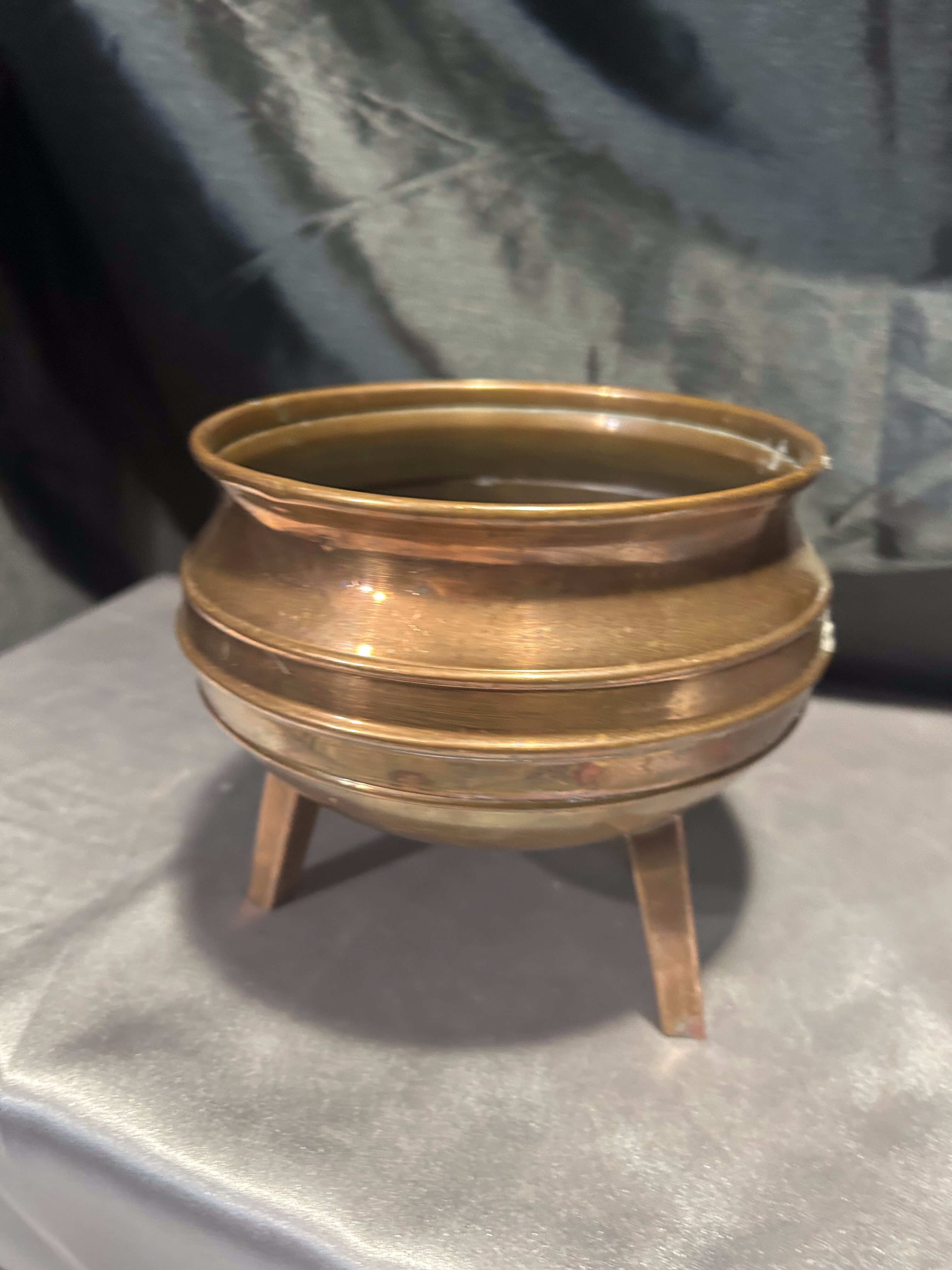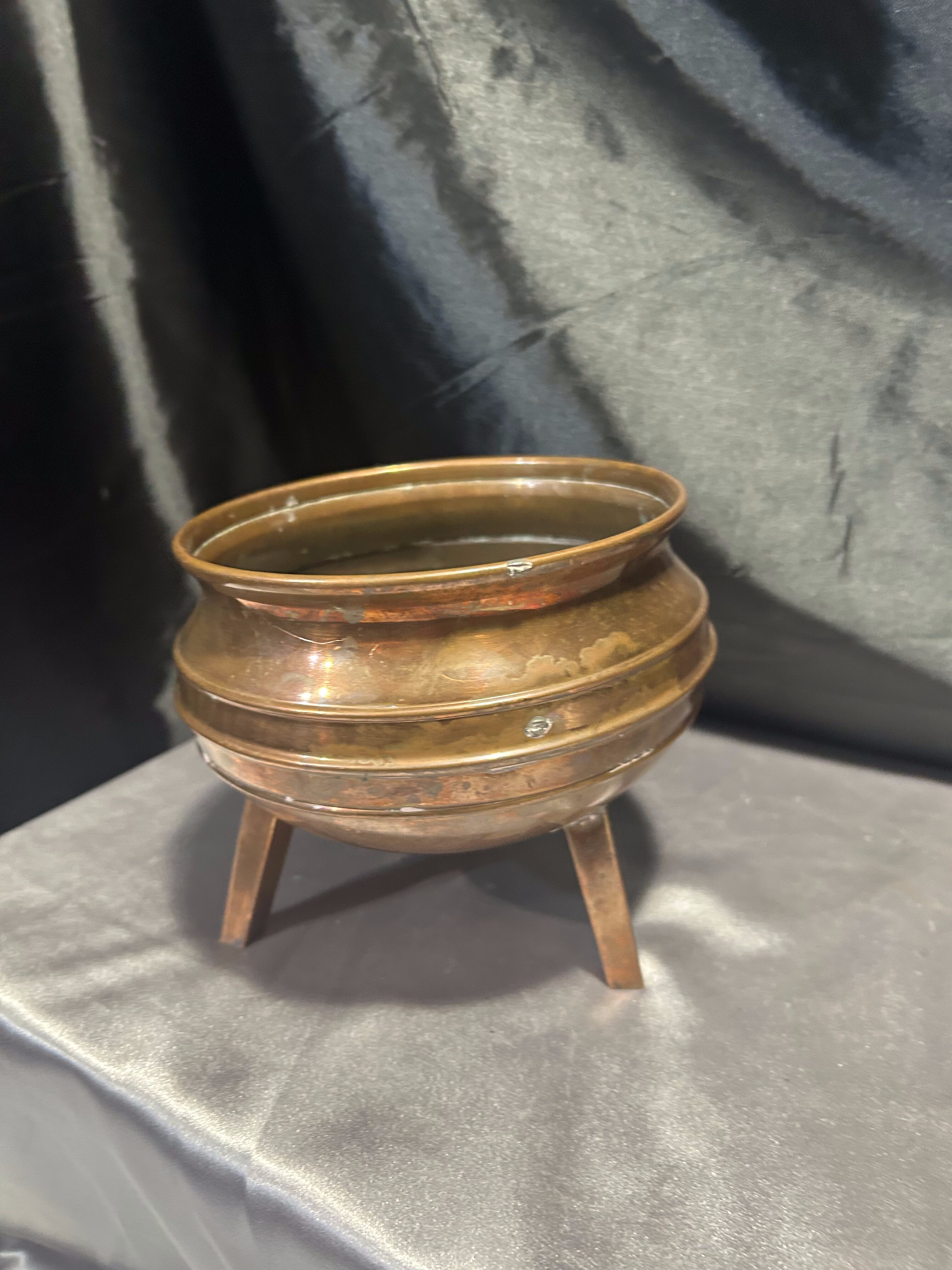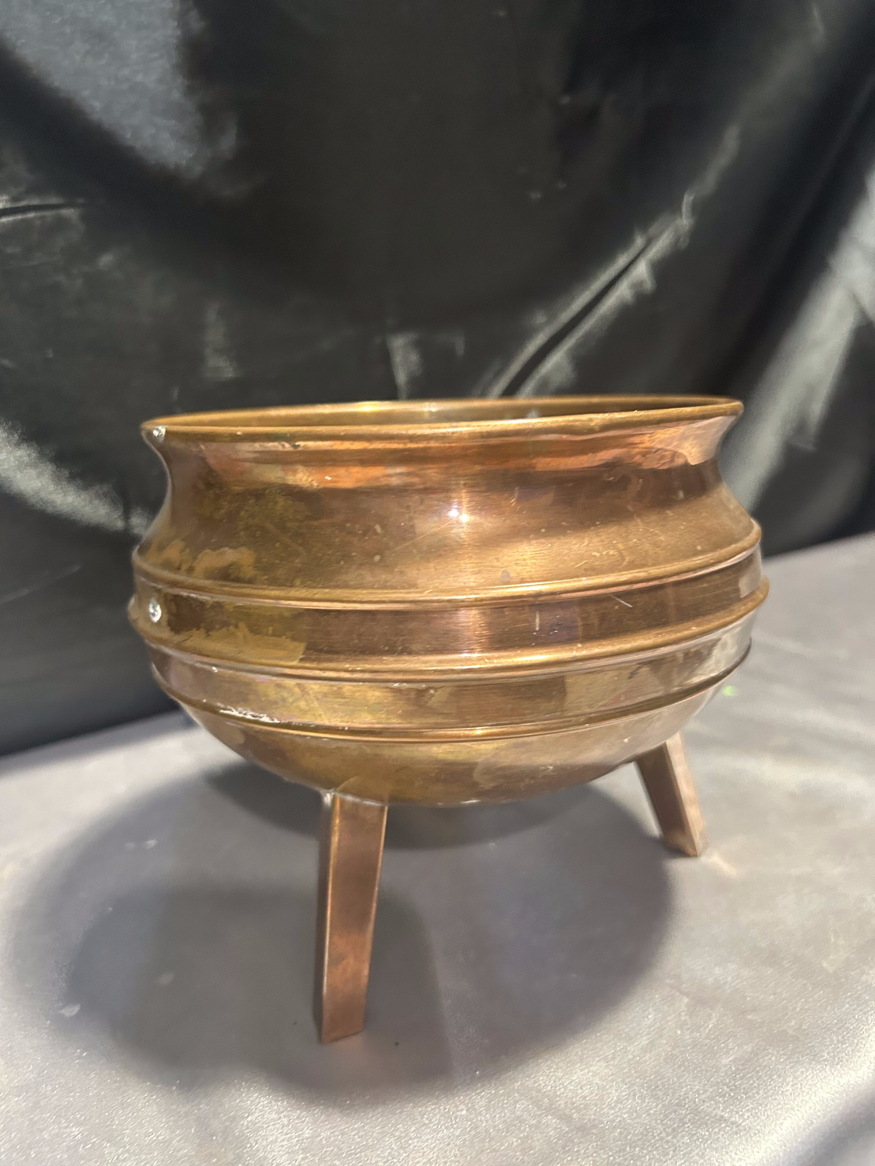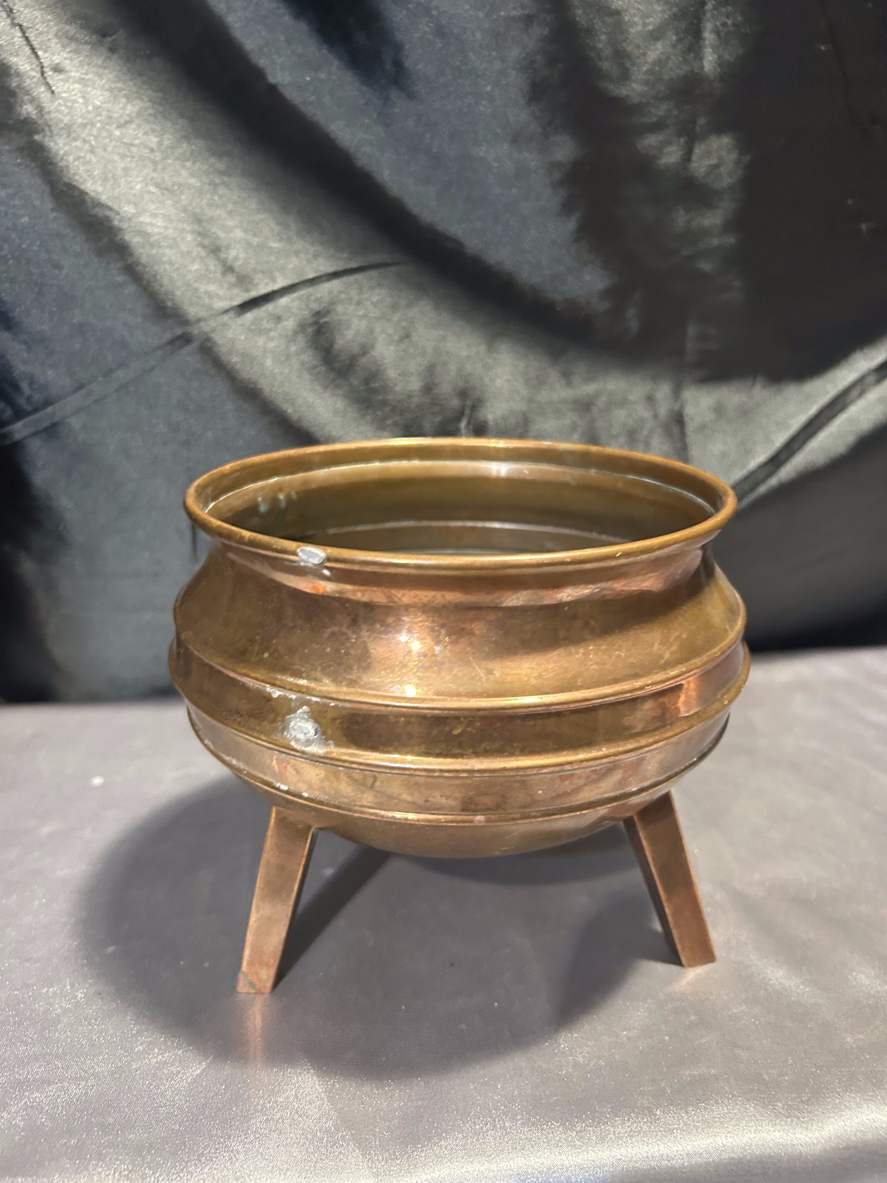 Na sprzedaż miedziana misa, która może pełnić funkcję pater lub kwietnika. Osadzona na trzech stabilnych nogach, wyróżnia się klasycznym designem oraz subtelną patyną, podkreślającą jej elegancki charakter.