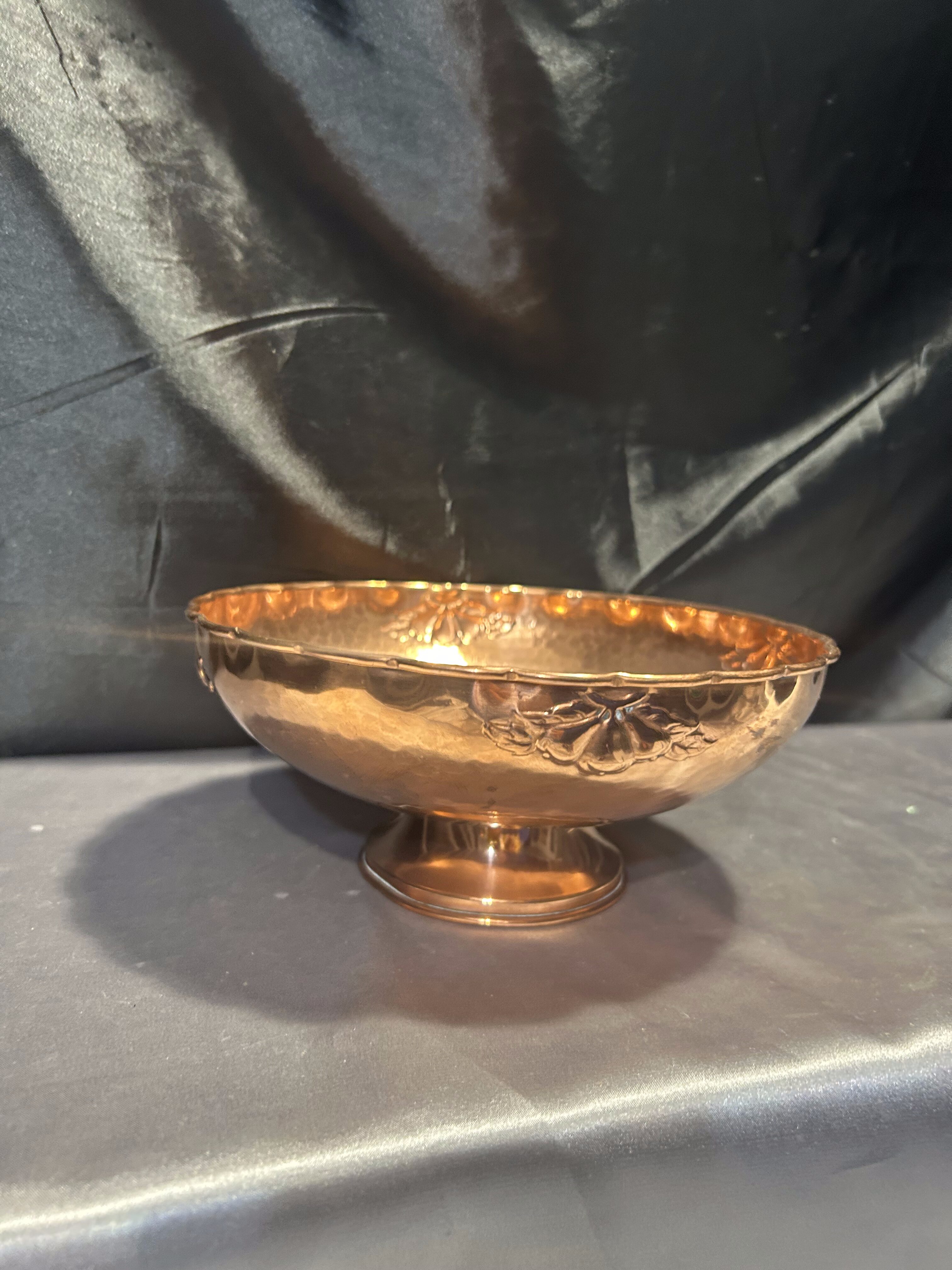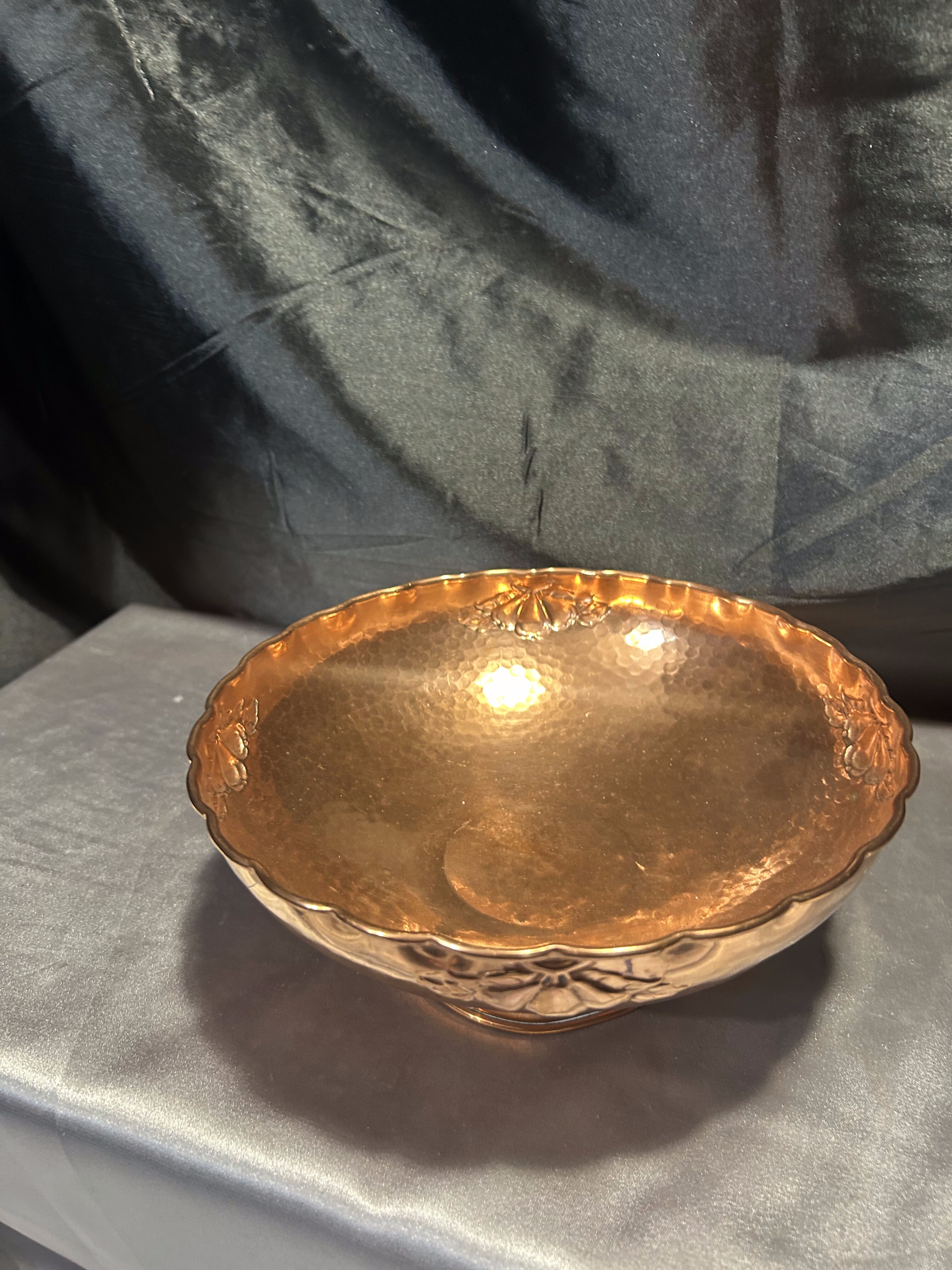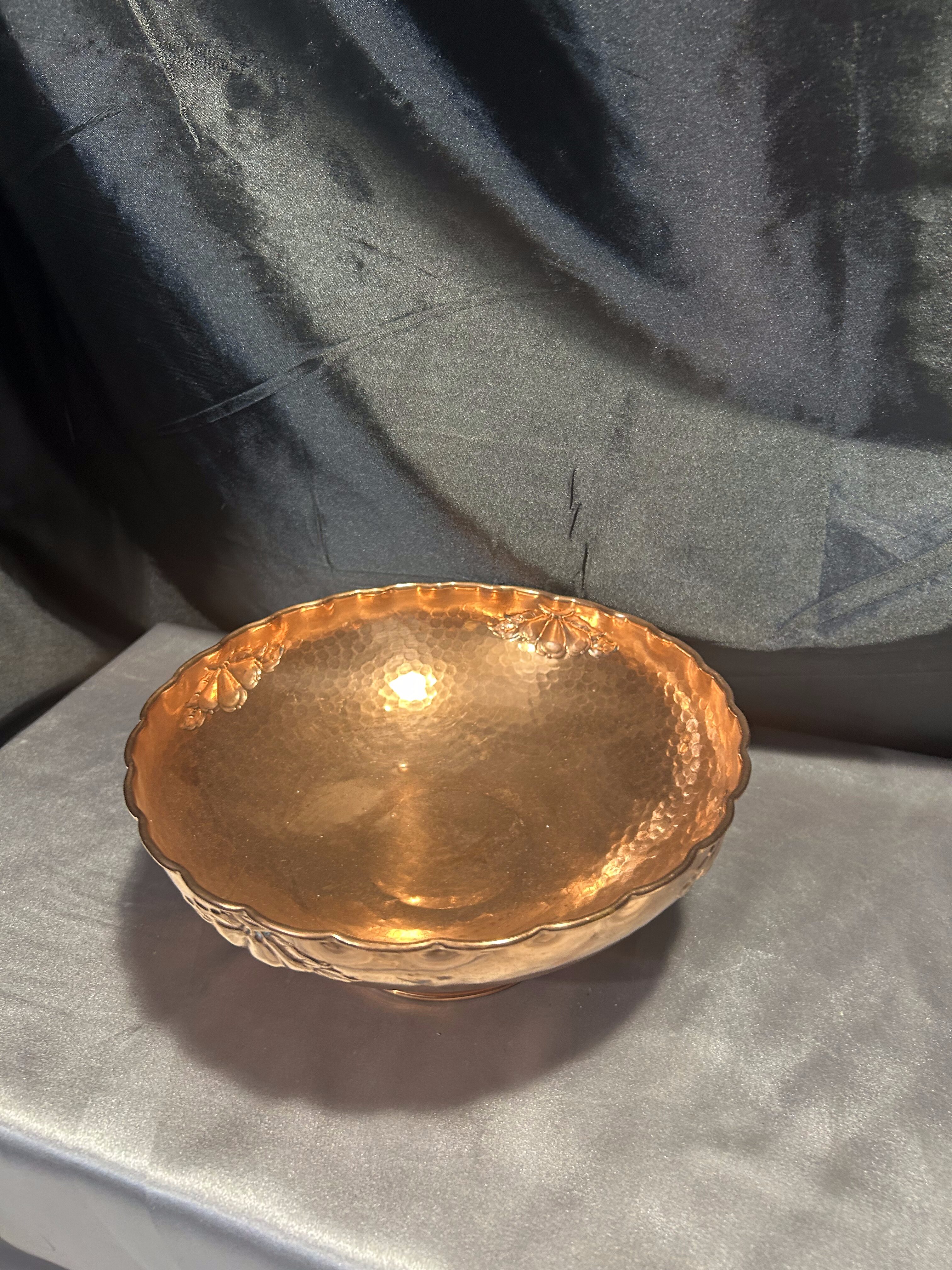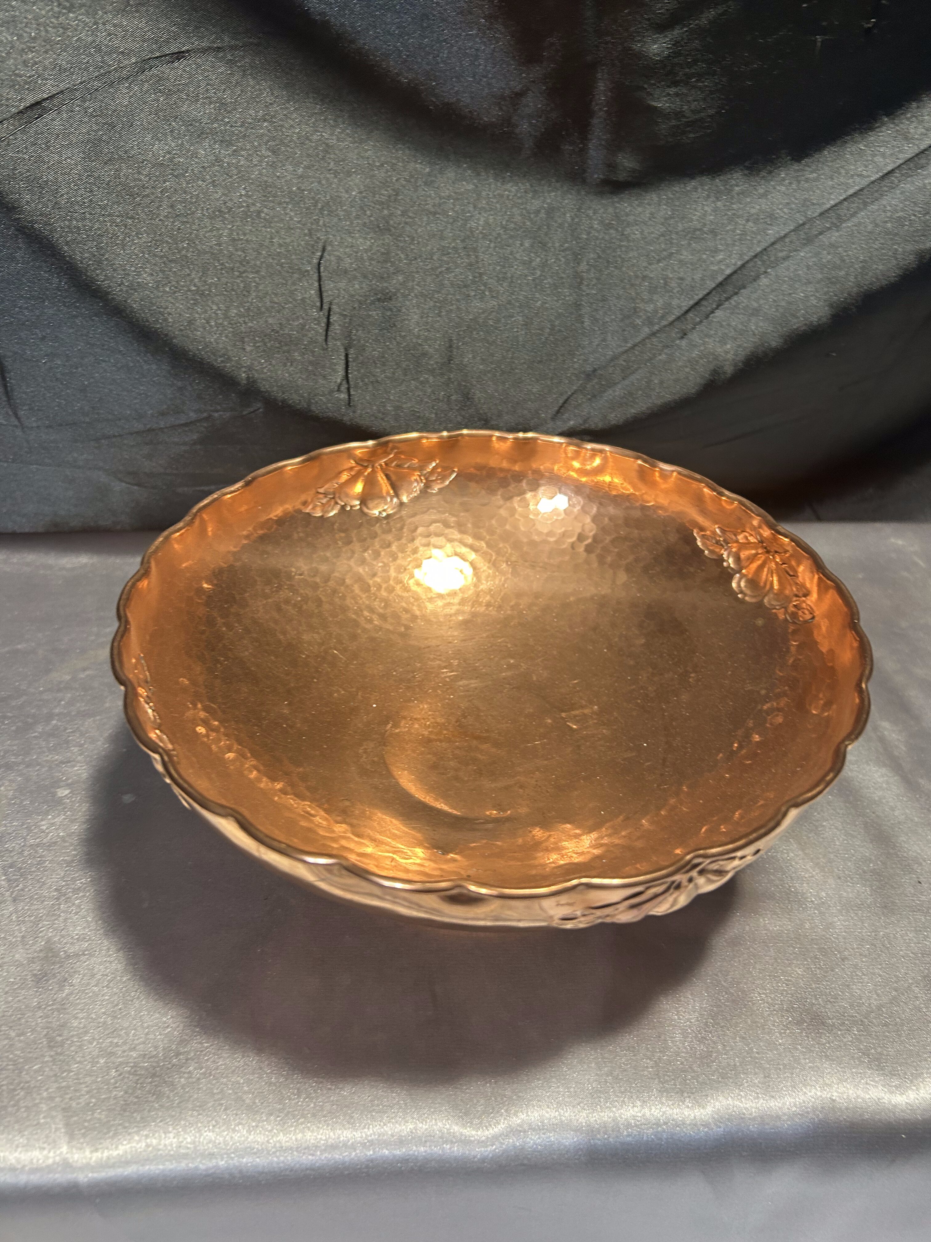 Na sprzedaż elegancka miedziana misa patera, osadzona na nodze i ozdobiona subtelnymi zdobieniami. Jej klasyczna forma i dekoracyjny charakter sprawiają, że doskonale nadaje się jako patera na owoce, dekoracyjna misa lub element wystroju wnętrza.