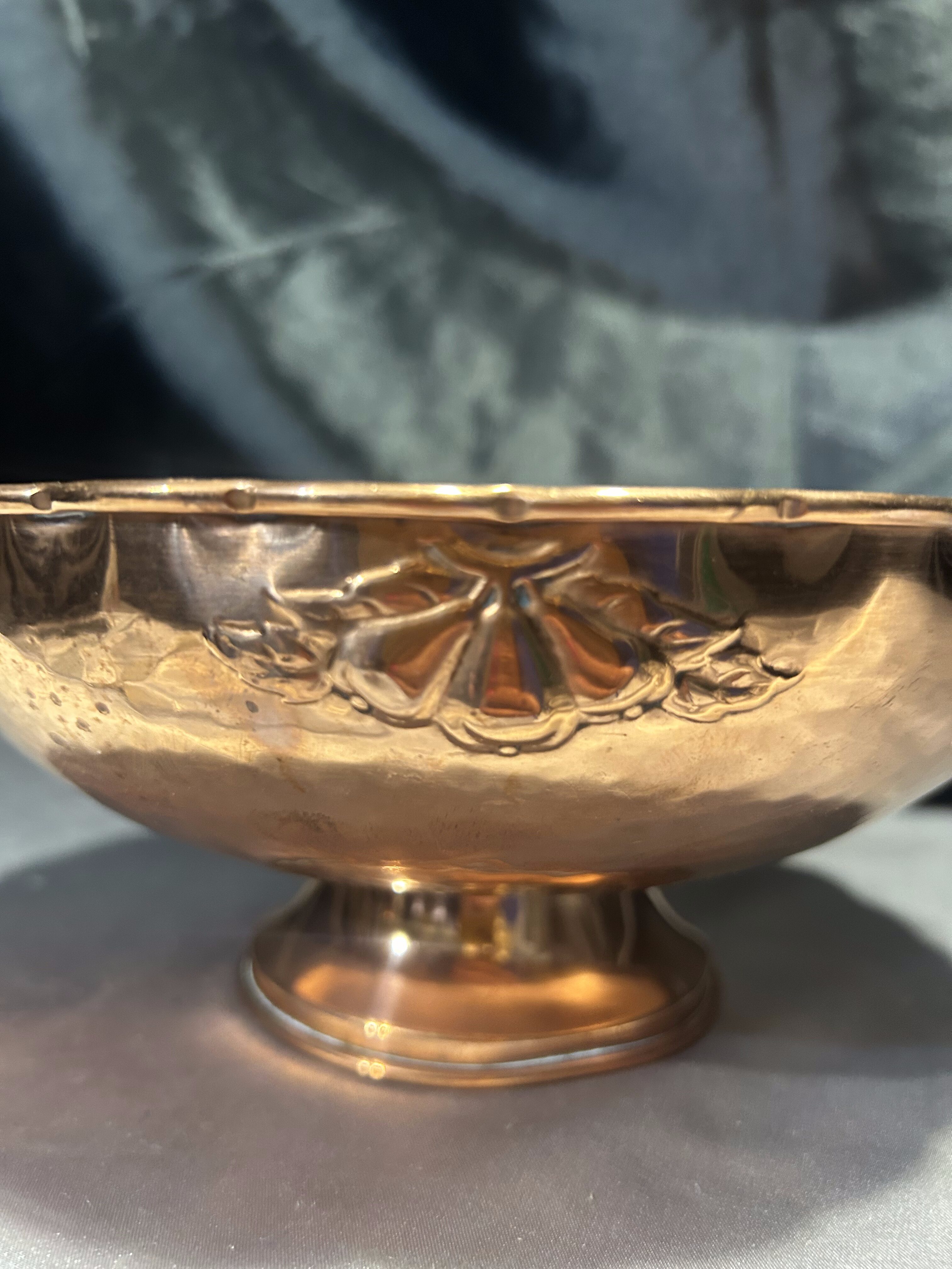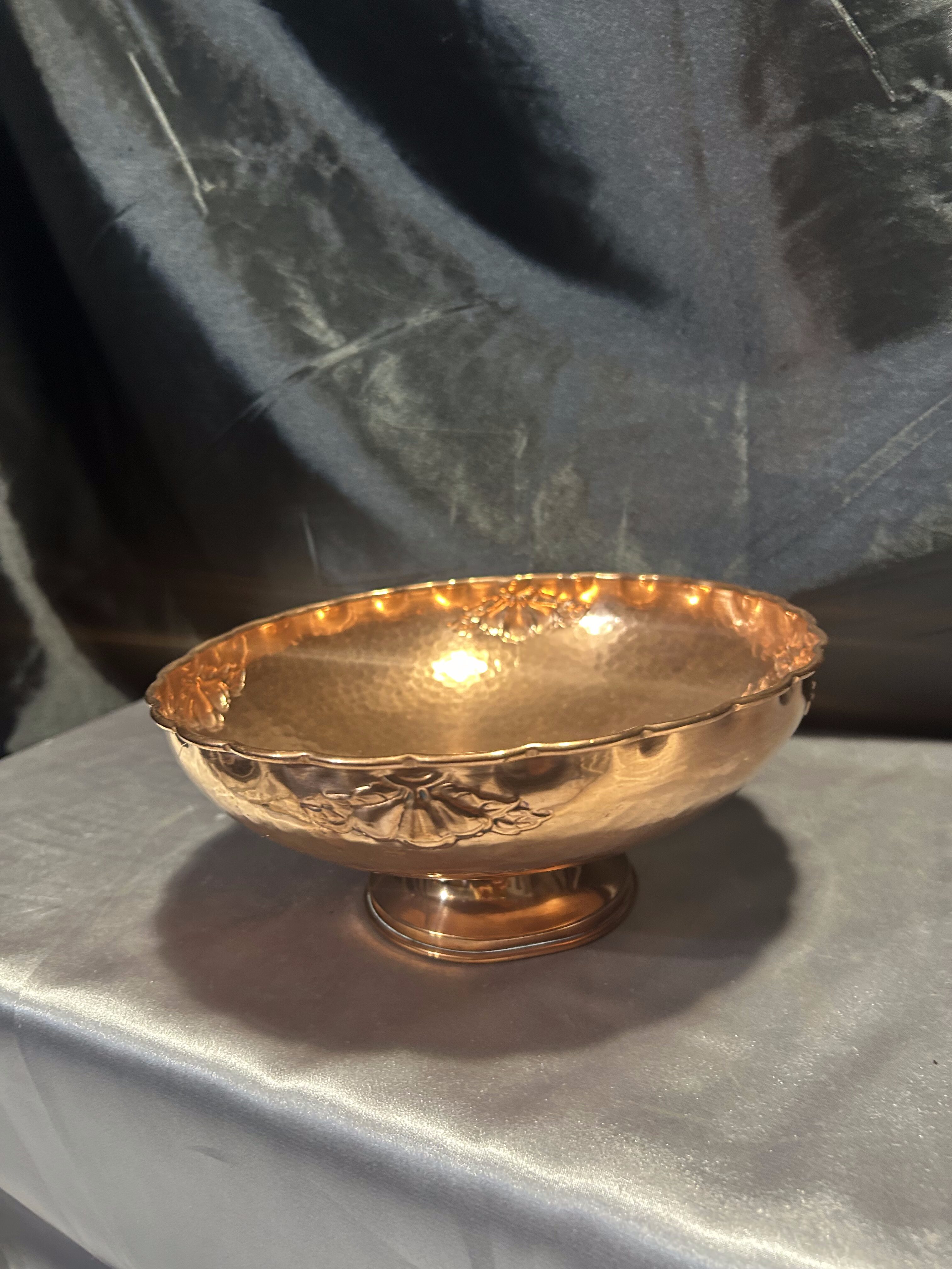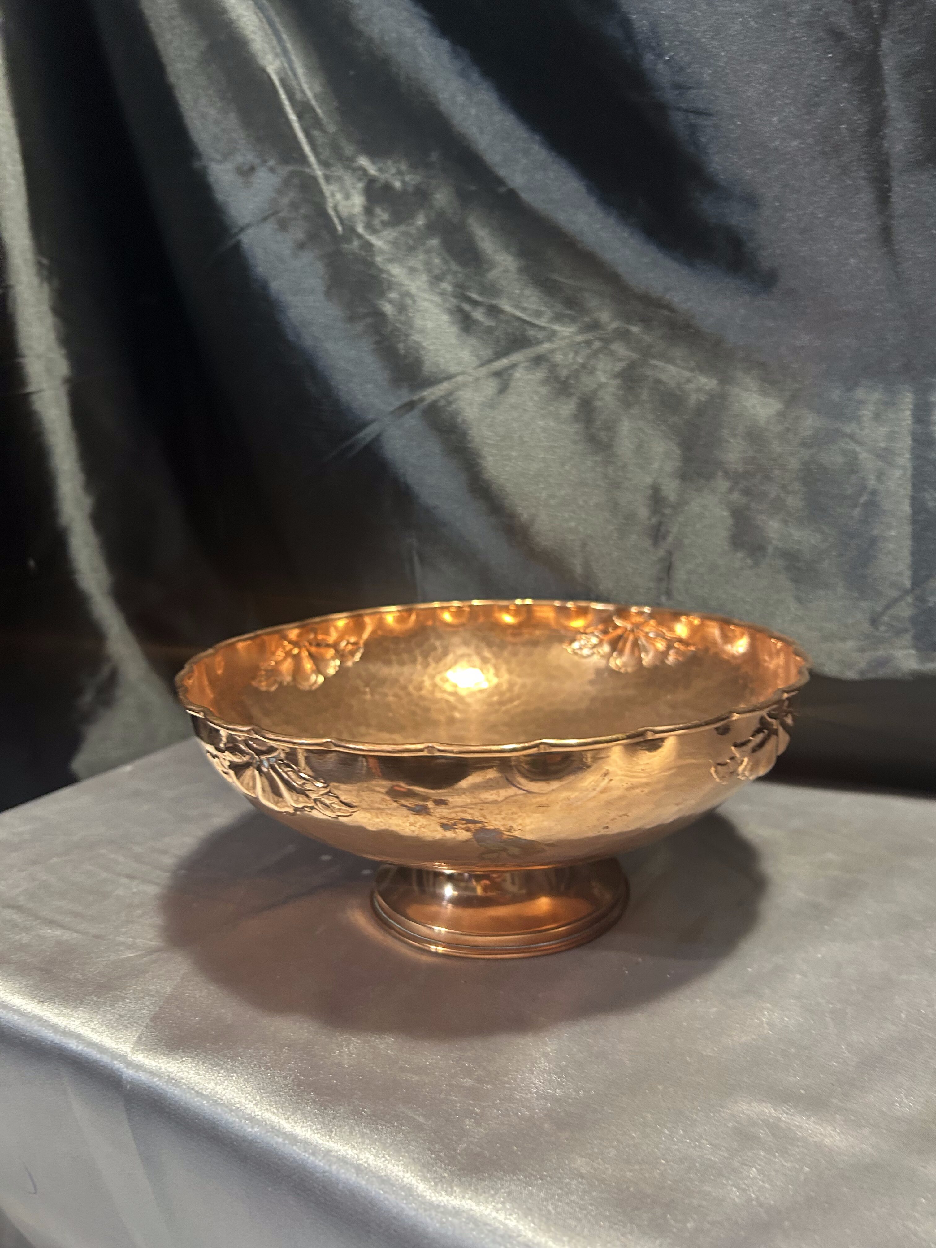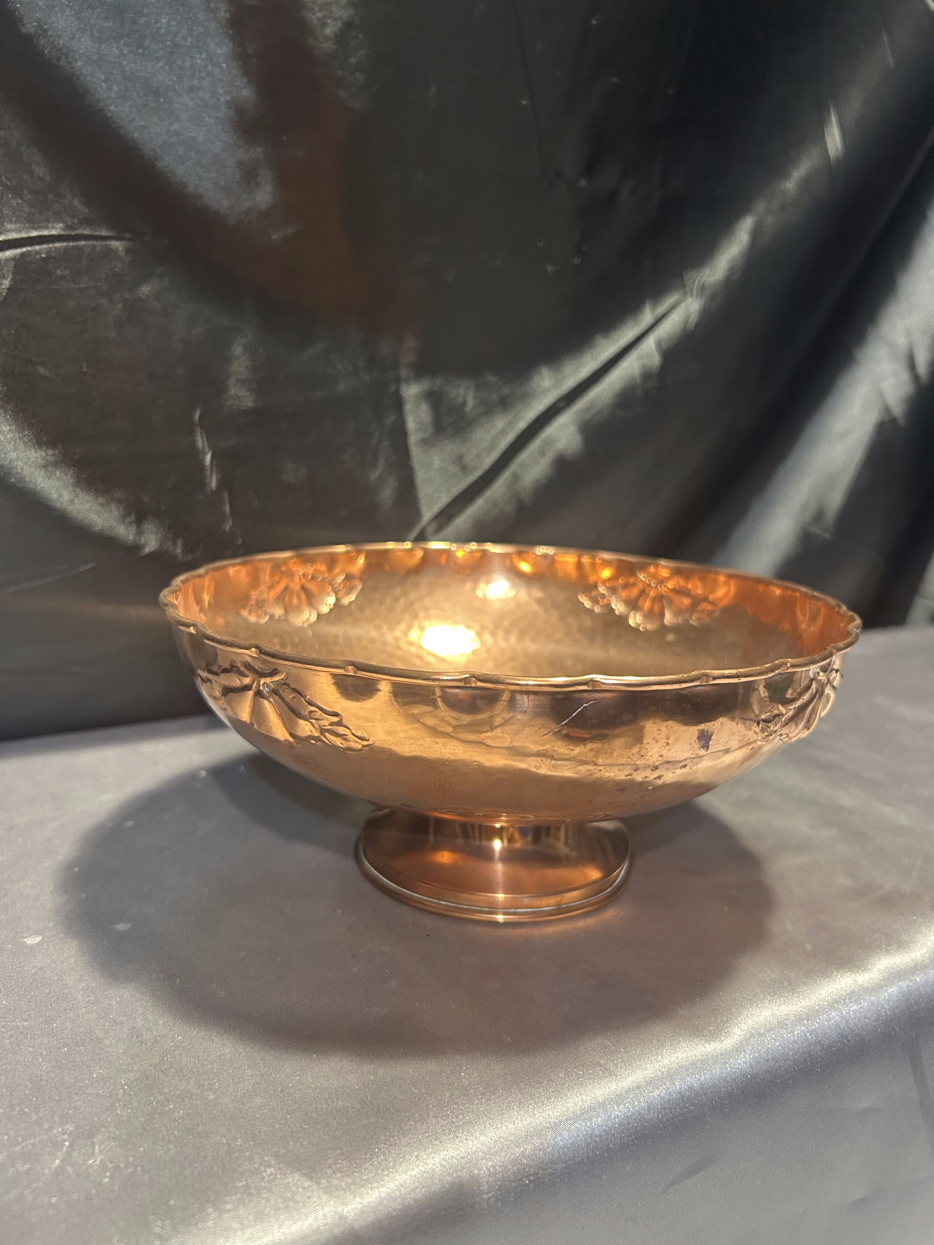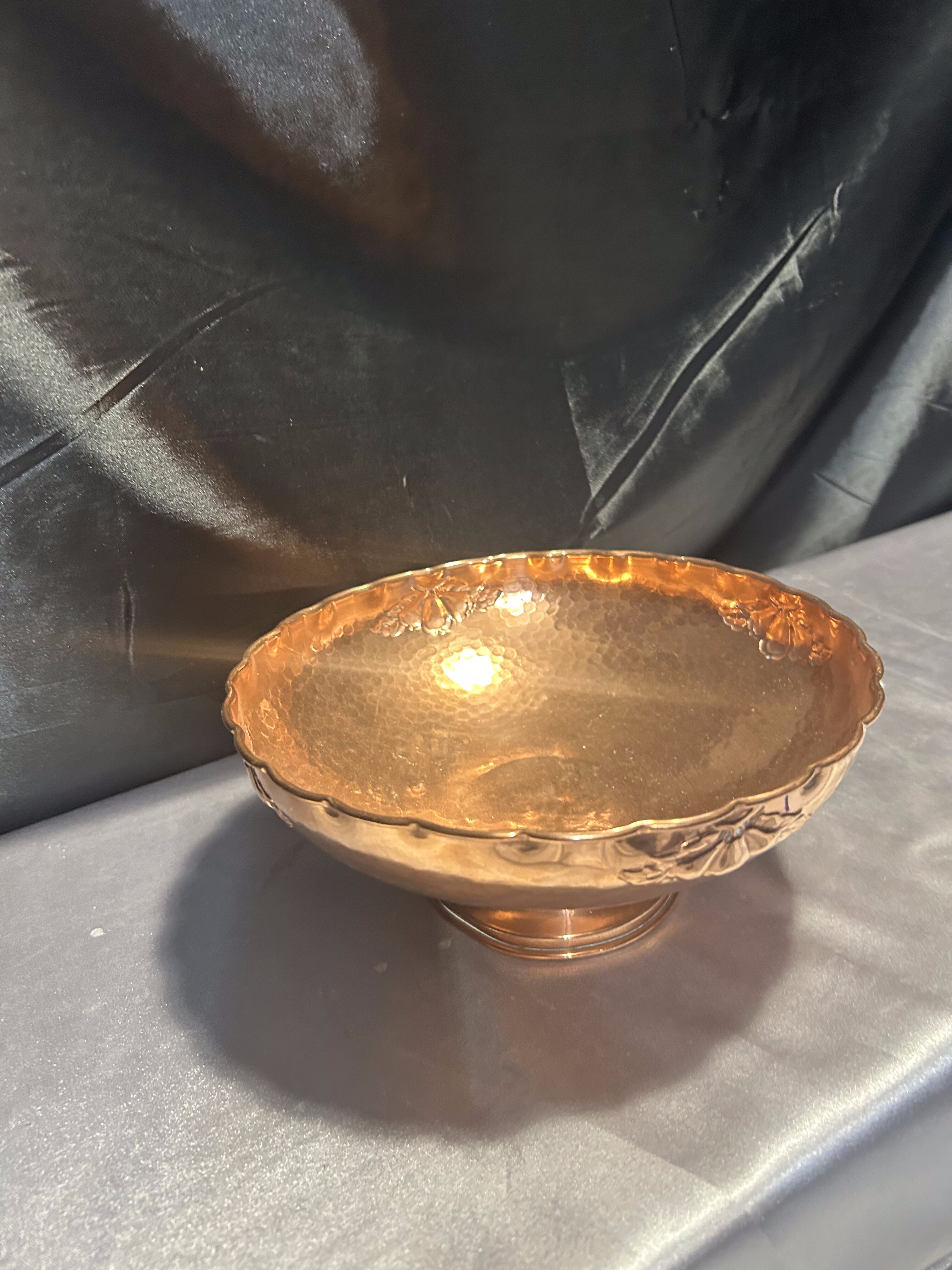 Na sprzedaż elegancka miedziana misa patera, osadzona na nodze i ozdobiona subtelnymi zdobieniami. Jej klasyczna forma i dekoracyjny charakter sprawiają, że doskonale nadaje się jako patera na owoce, dekoracyjna misa lub element wystroju wnętrza.