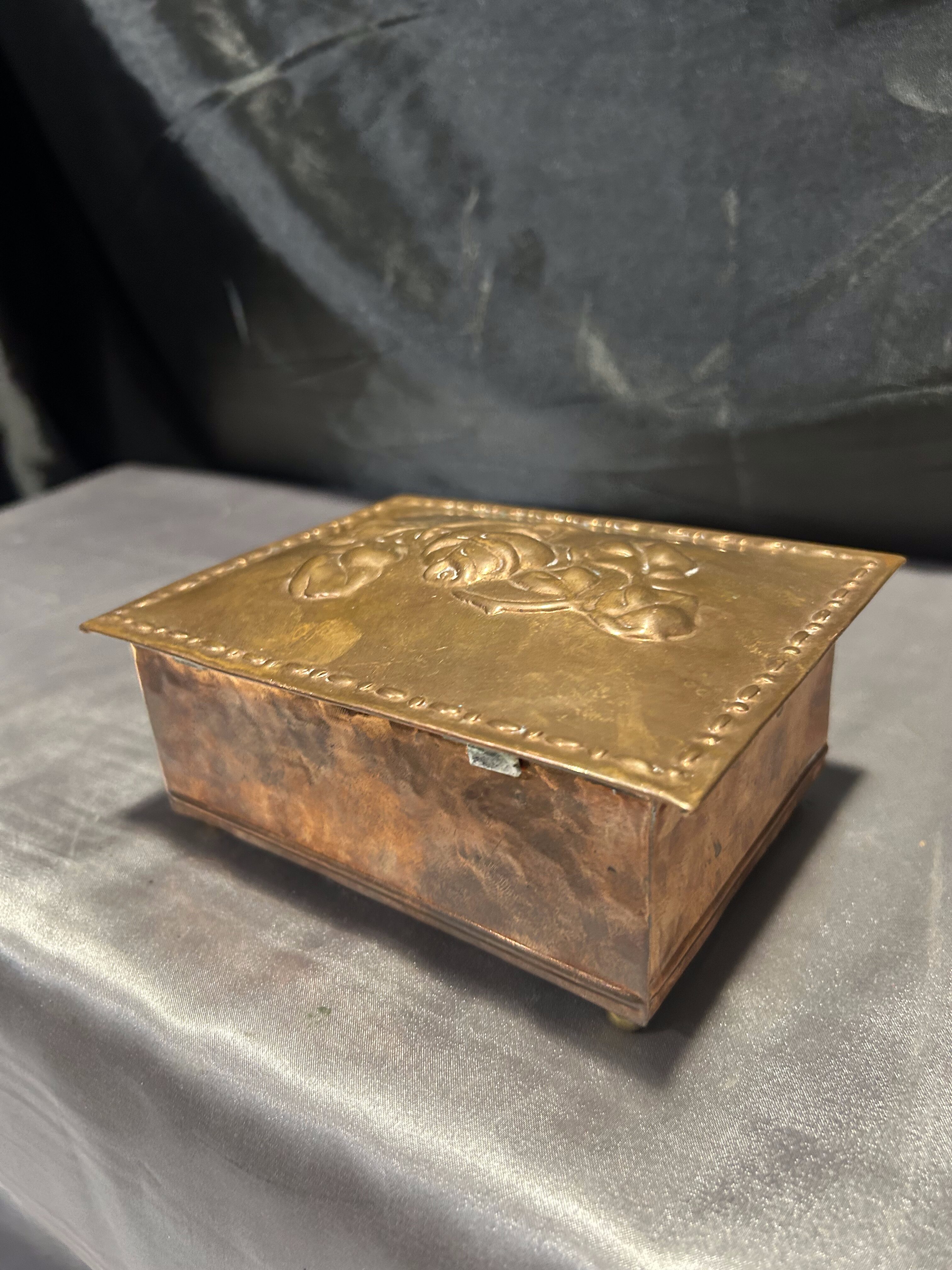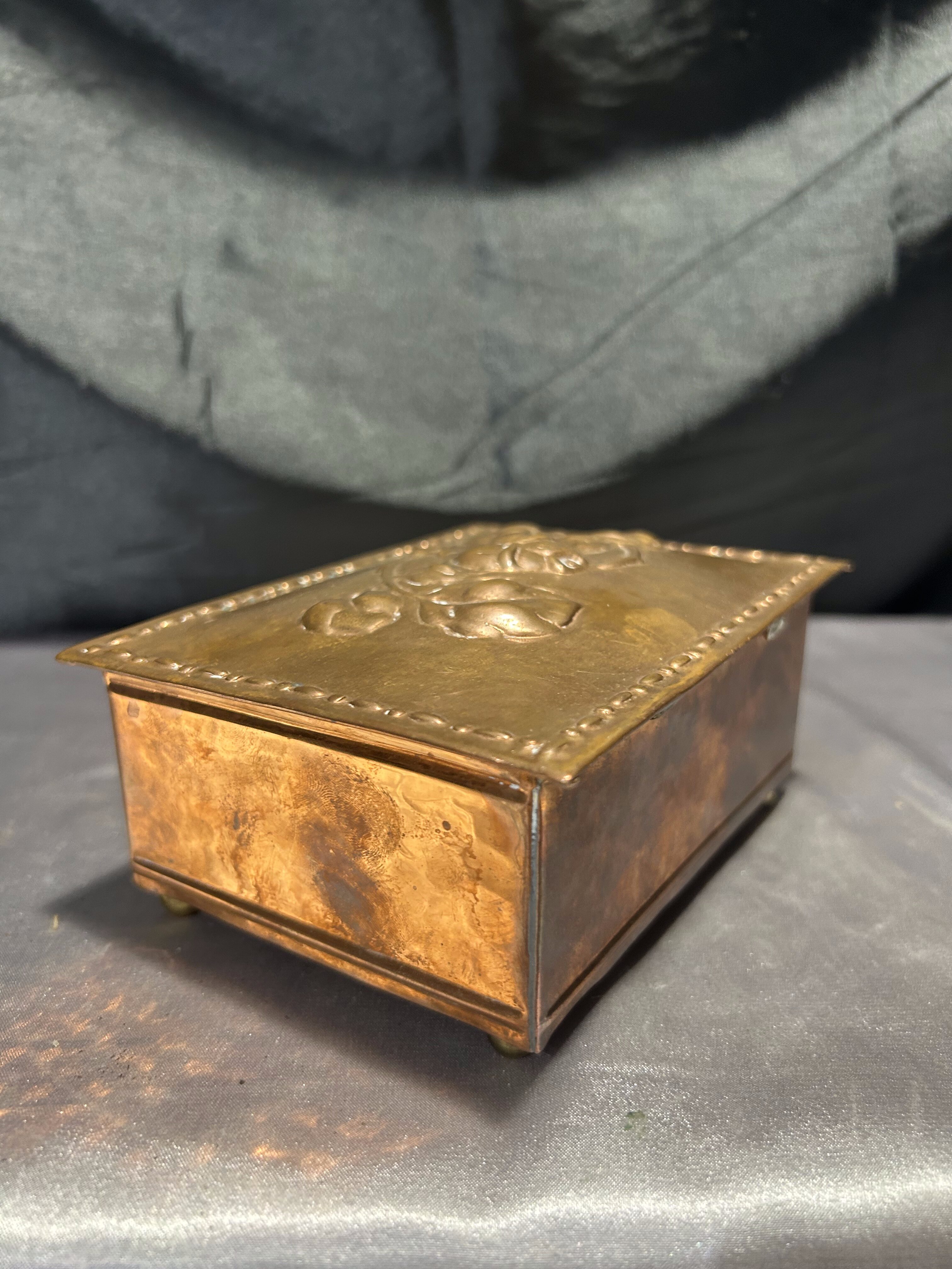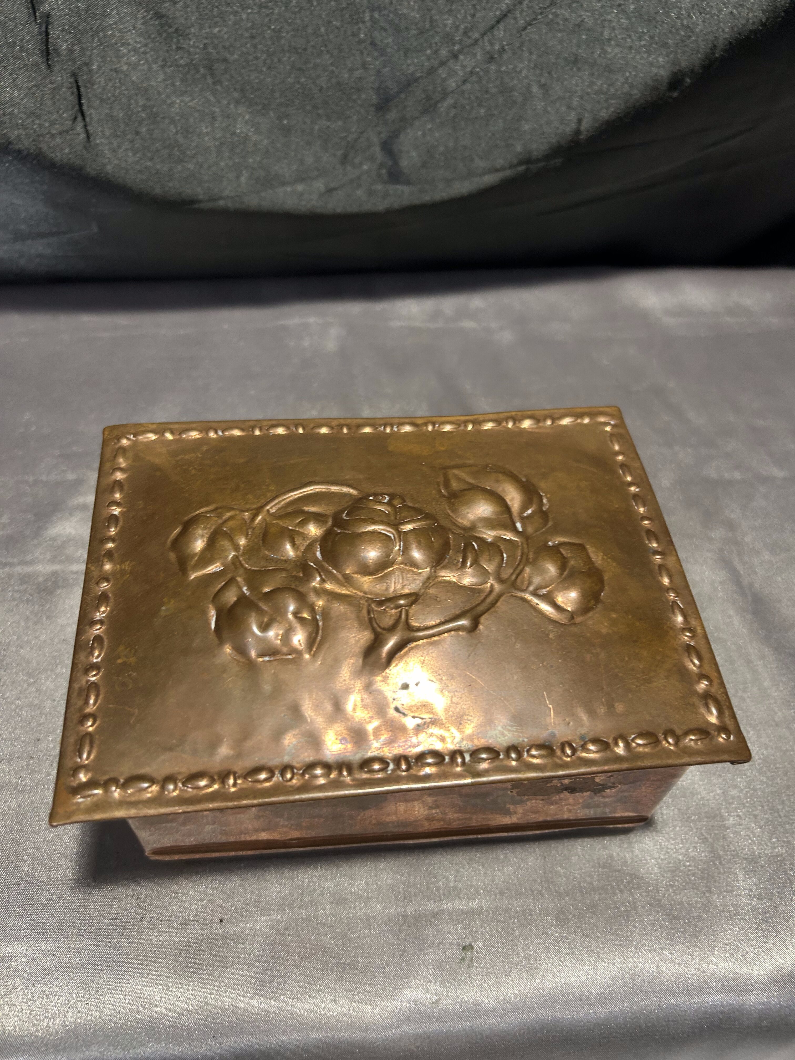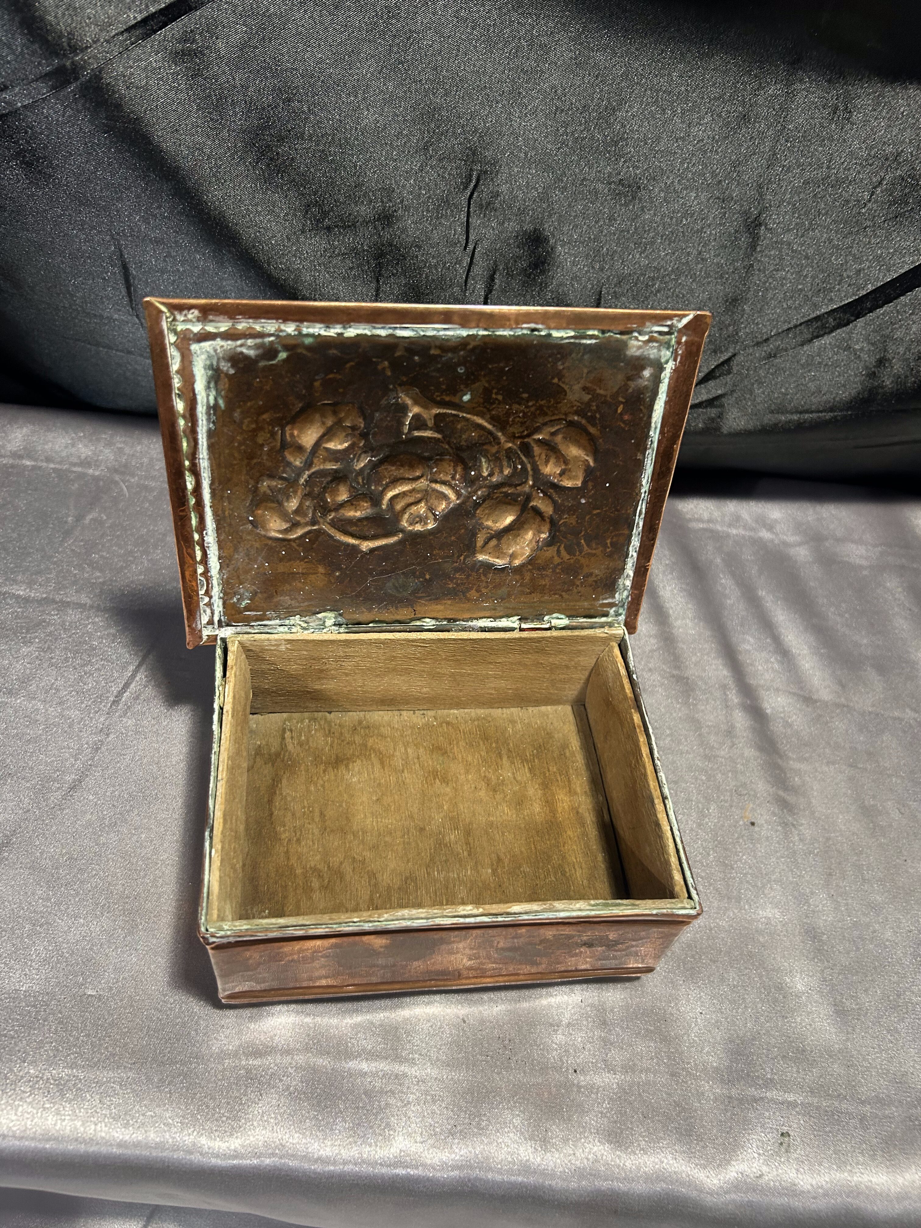 Miedziana szkatułka z różami – z drewnianym wnętrzem – vintage