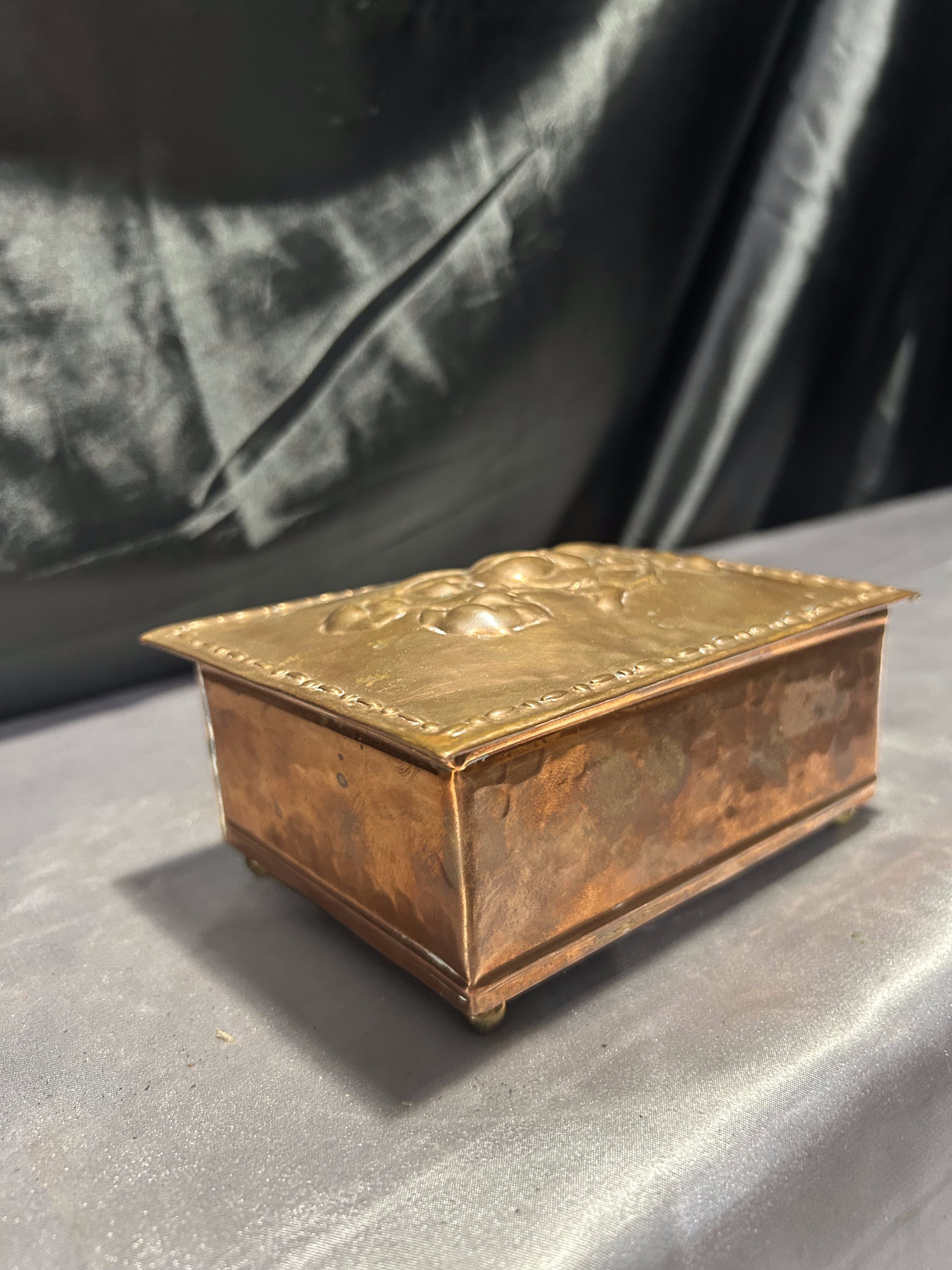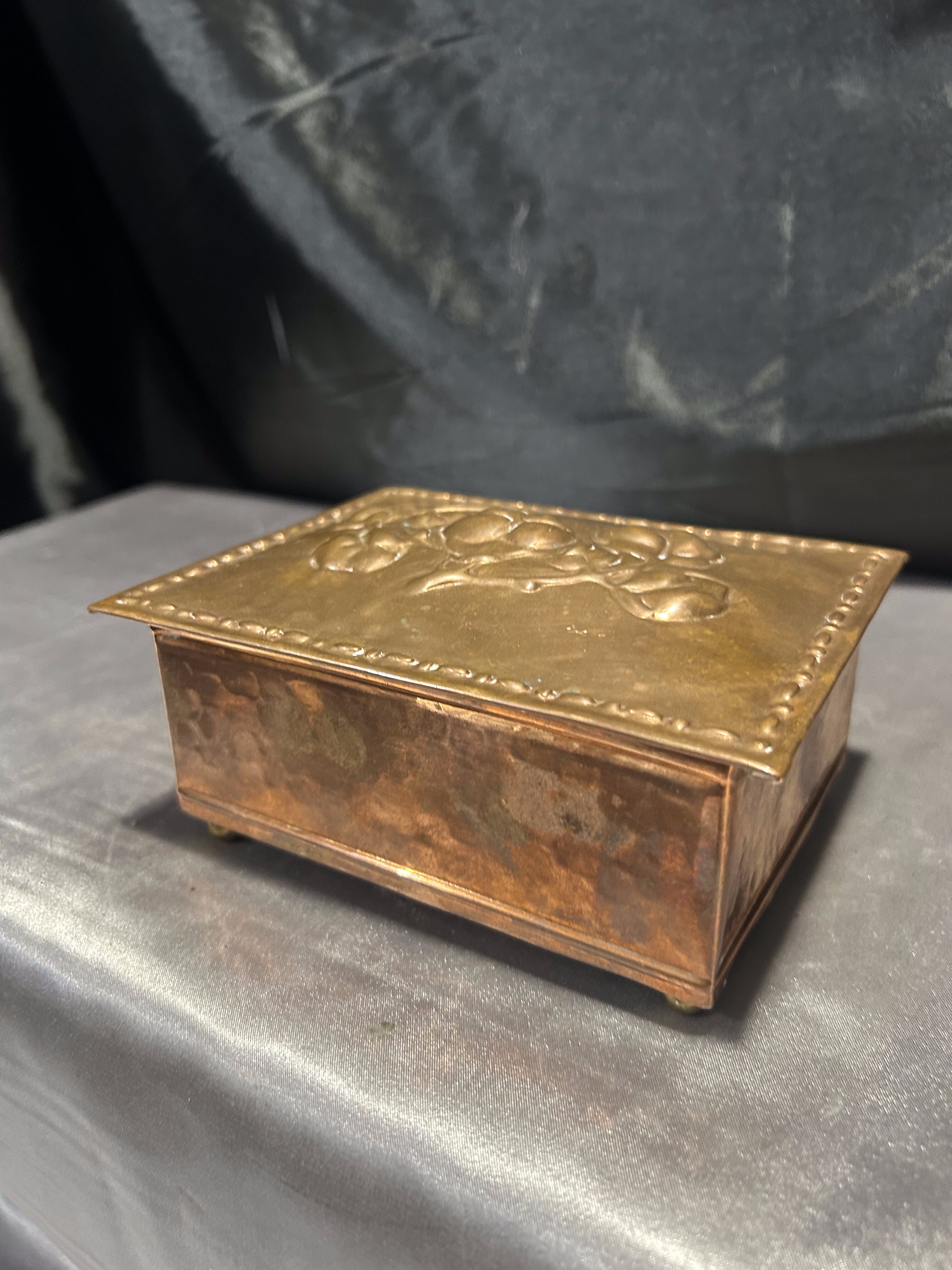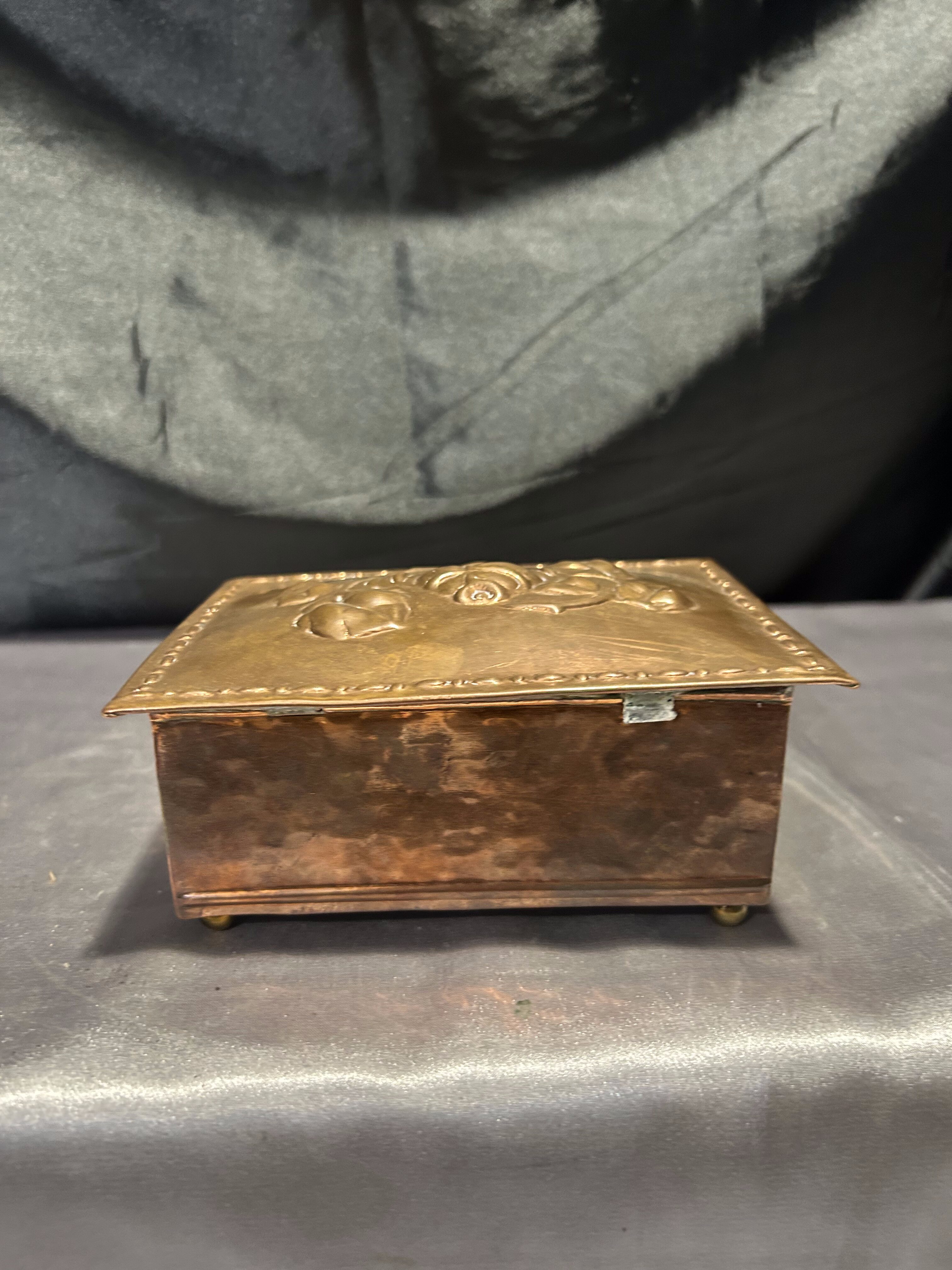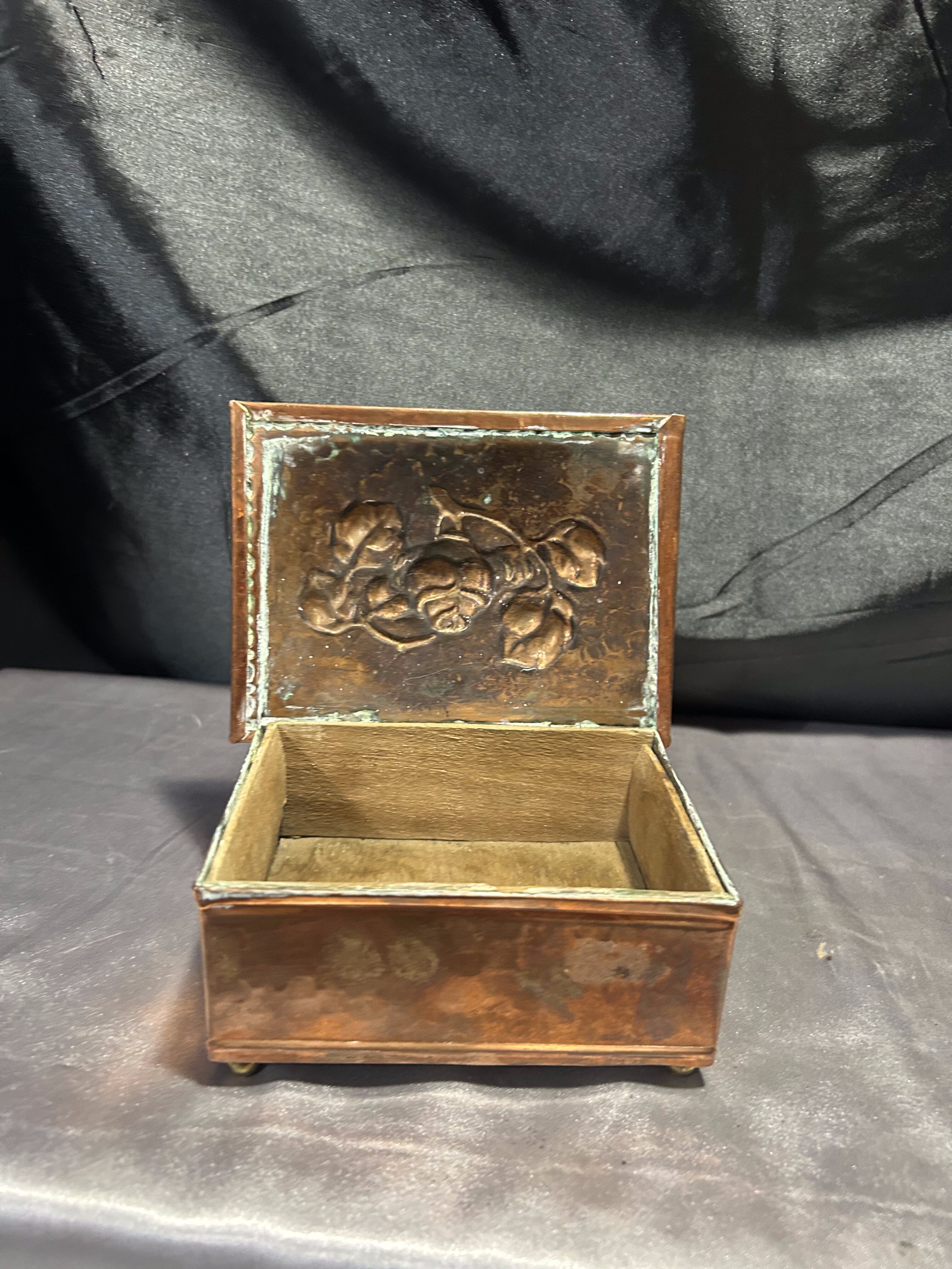 Miedziana szkatułka z różami – z drewnianym wnętrzem – vintage