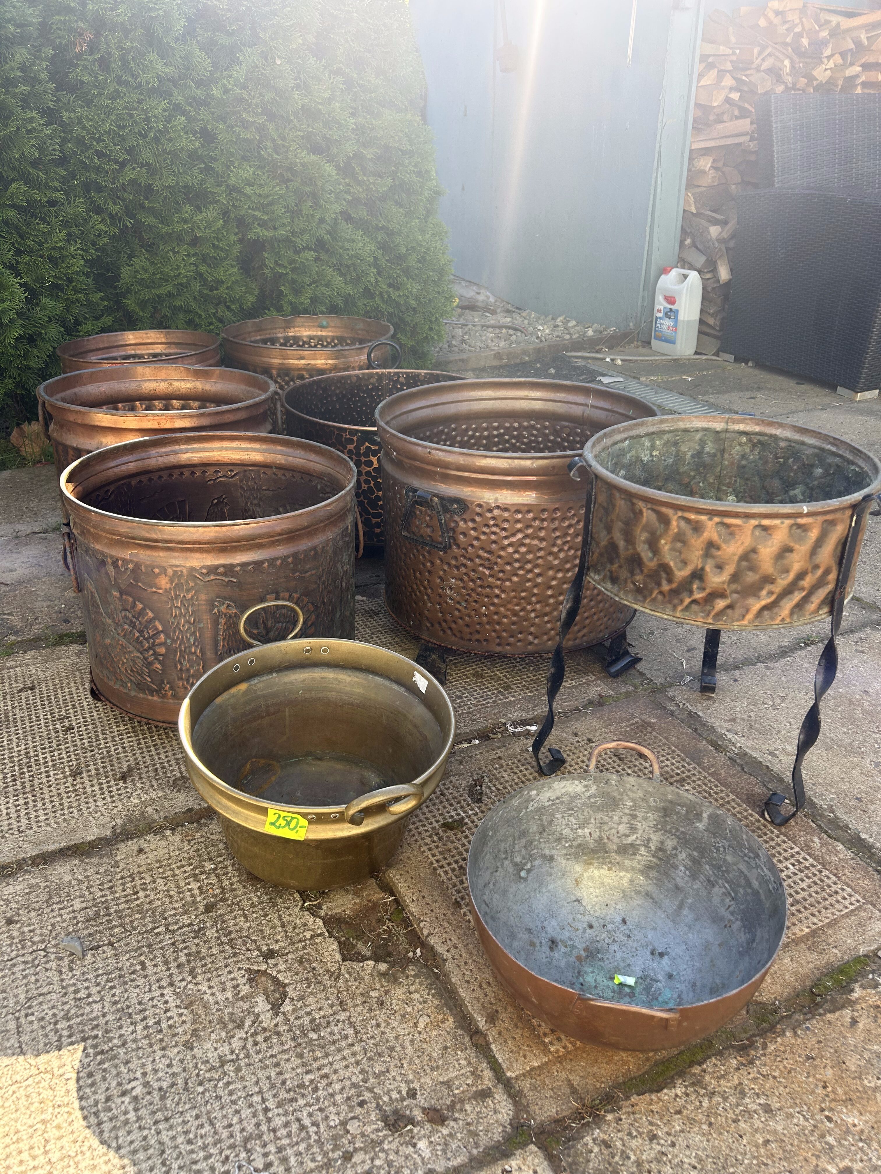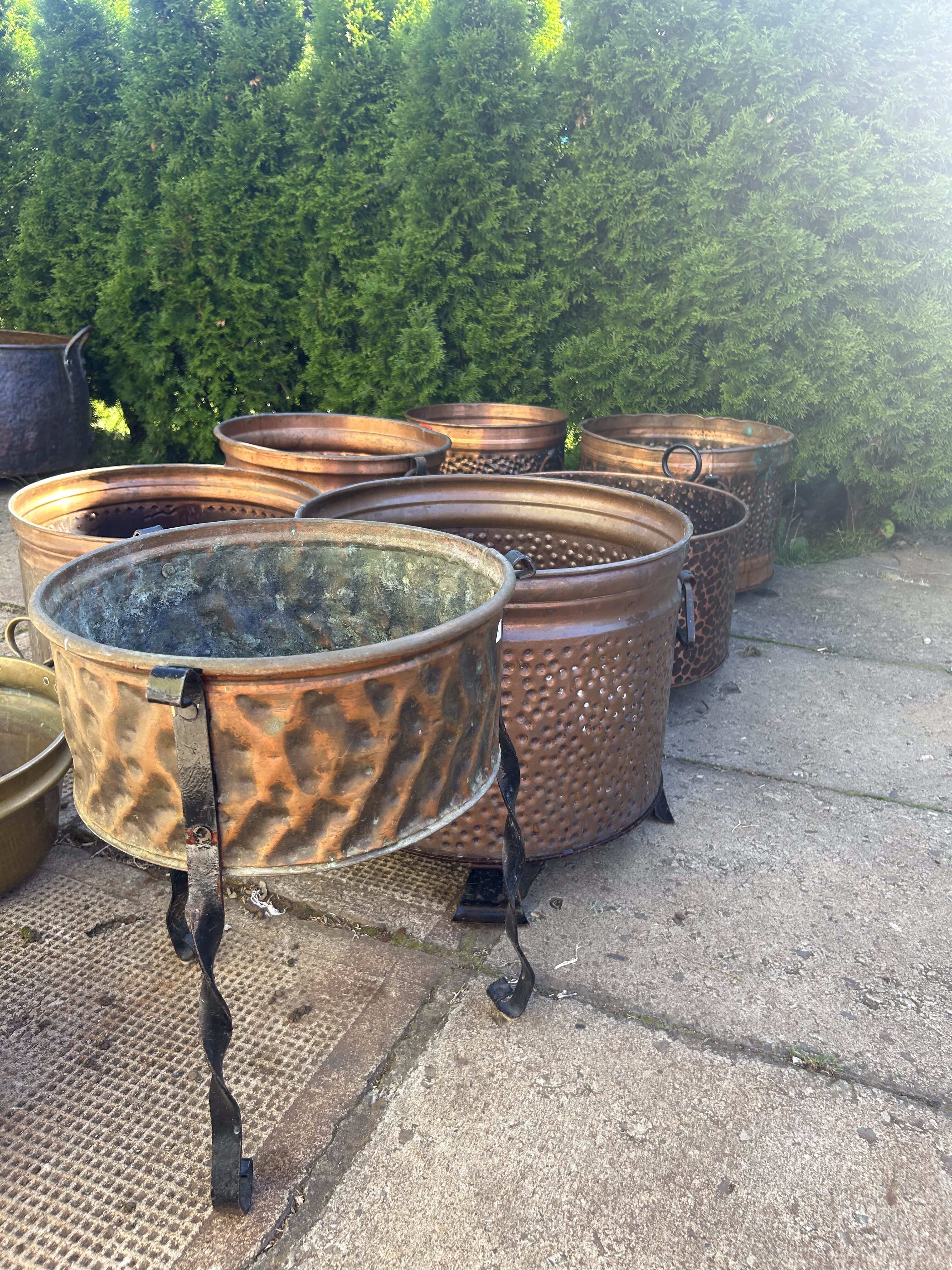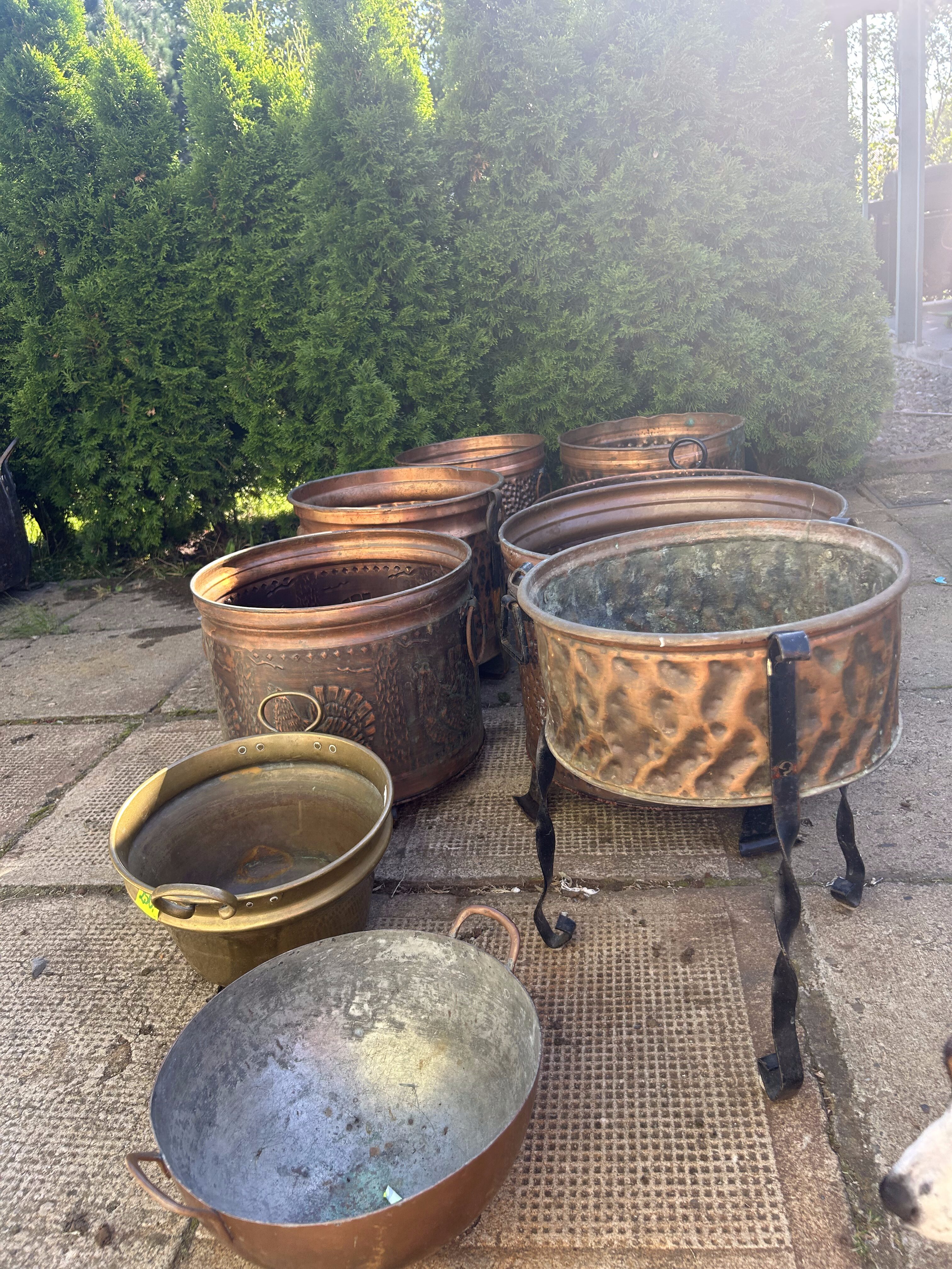 Kolekcja dziewięciu wyjątkowych pojemników, wykonanych z miedzi, z elementami żeliwnymi i metalowymi. Każdy egzemplarz ma swój unikalny charakter – od misternie zdobionych wzorów po eleganckie wykończenie młotkowane. Mogą służyć jako praktyczne pojemniki na drewno przy kominku lub pełnić funkcję efektownych, dużych kwietników w domu czy ogrodzie. Solidna konstrukcja zapewnia trwałość, a dekoracyjne detale nadają im niepowtarzalnego uroku.