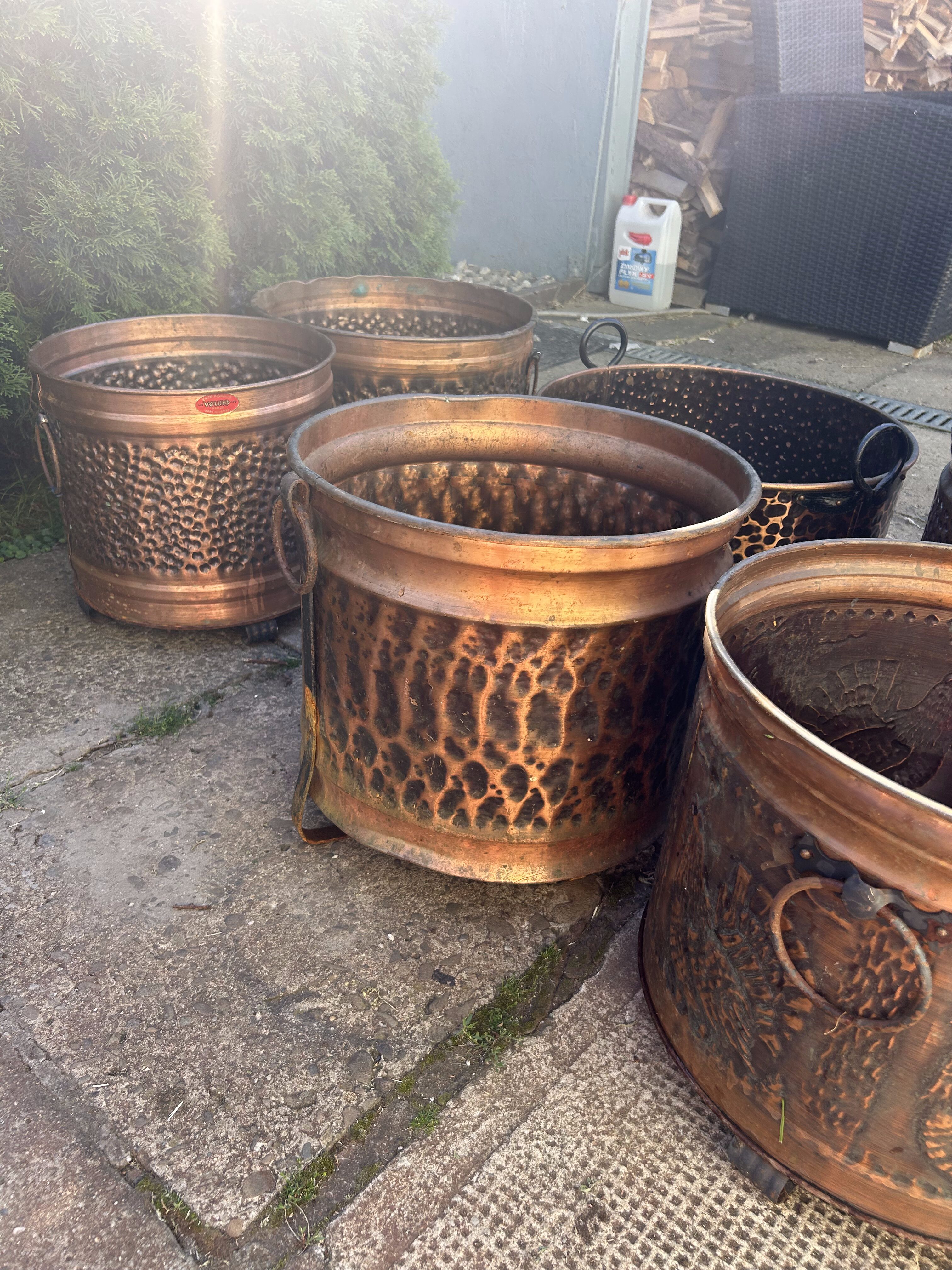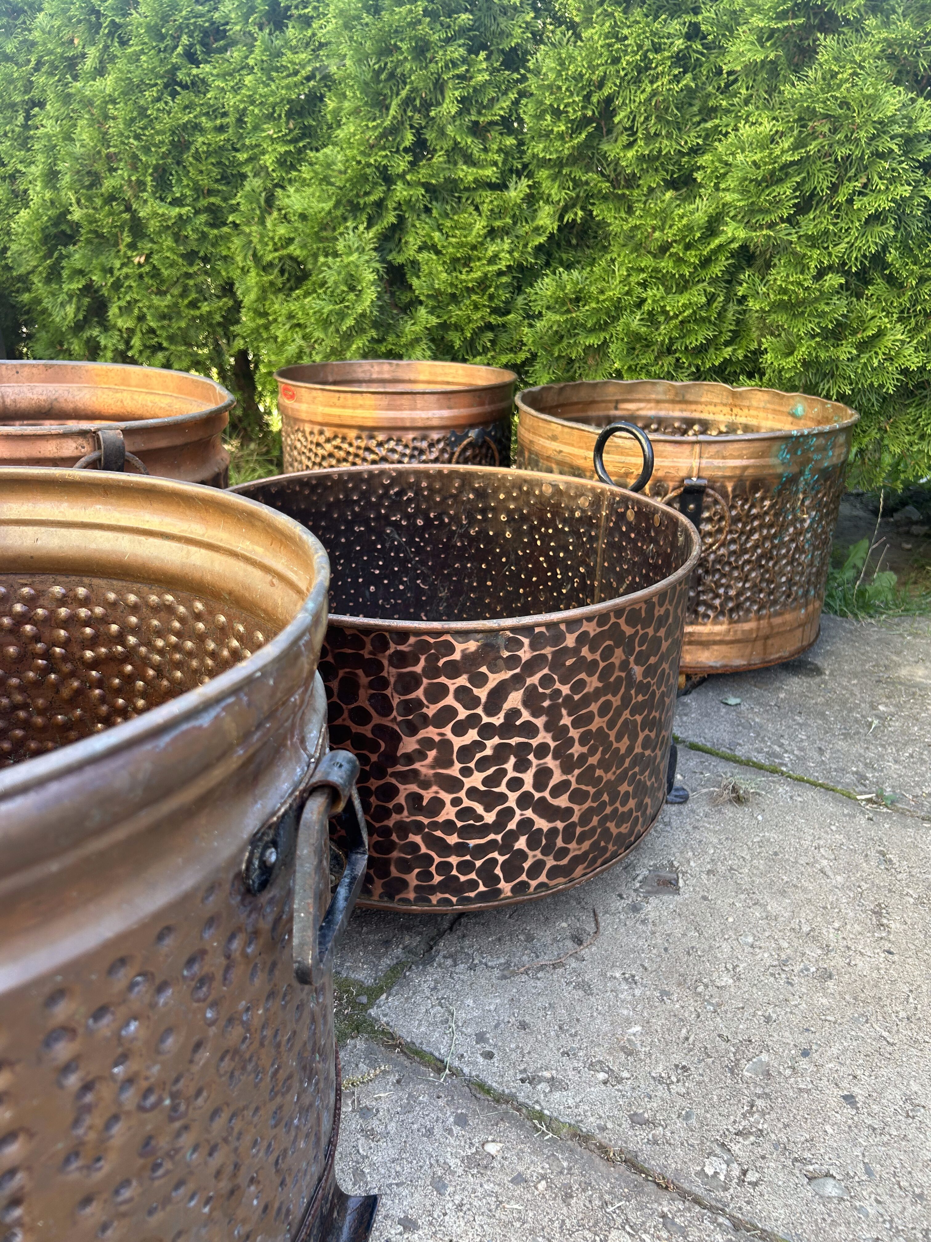 Miedziane pojemniki na drewno lub duże kwietniki – zdobione lub młotkowane – różne wzory