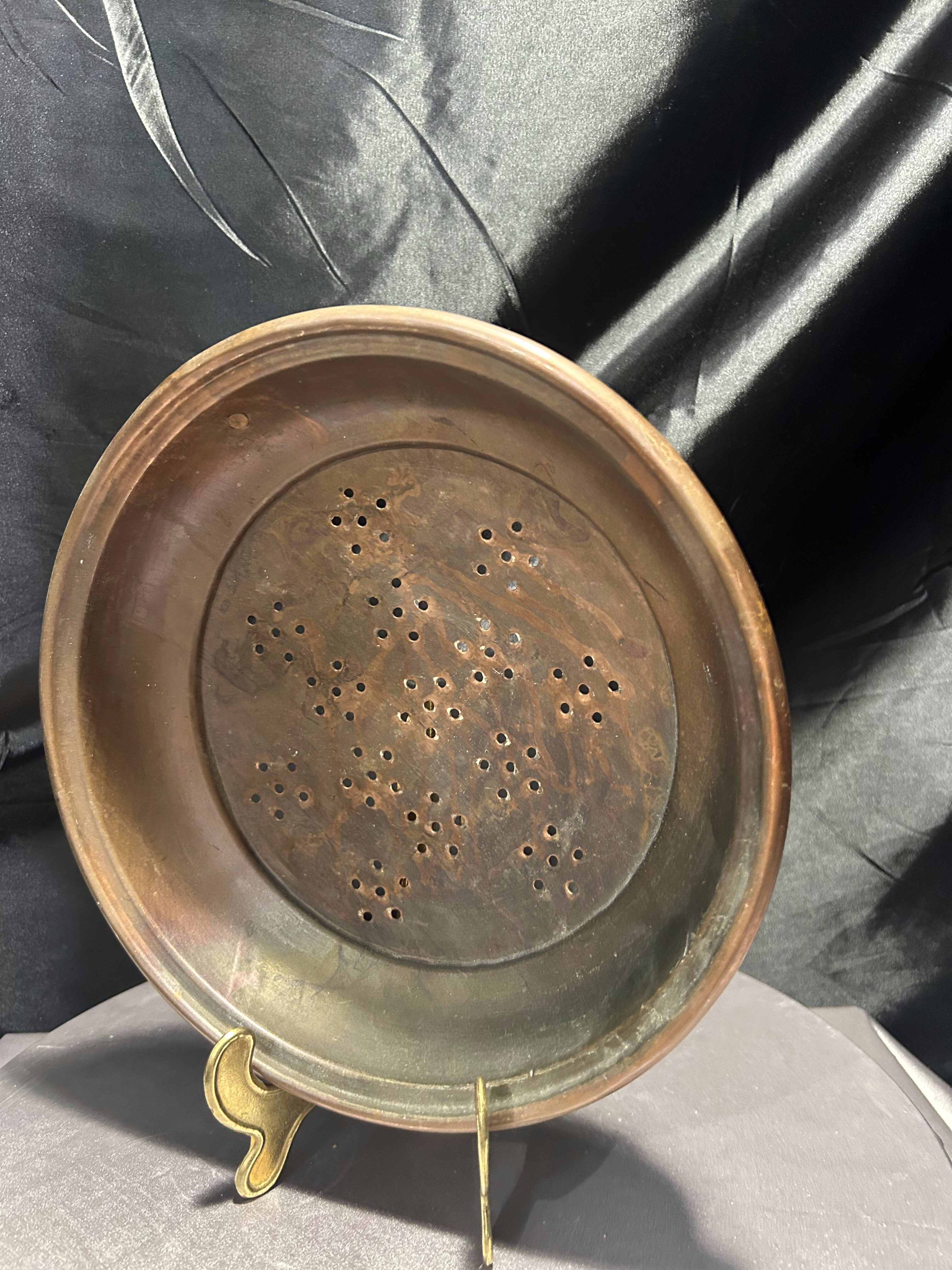 Ten miedziany durszlak to przedmiot, który łączy praktyczność z klimatem dawnych lat. Może zdobić kuchenną ścianę lub służyć jako stylowy dodatek do serwowania owoców, warzyw lub suszonych ziół.