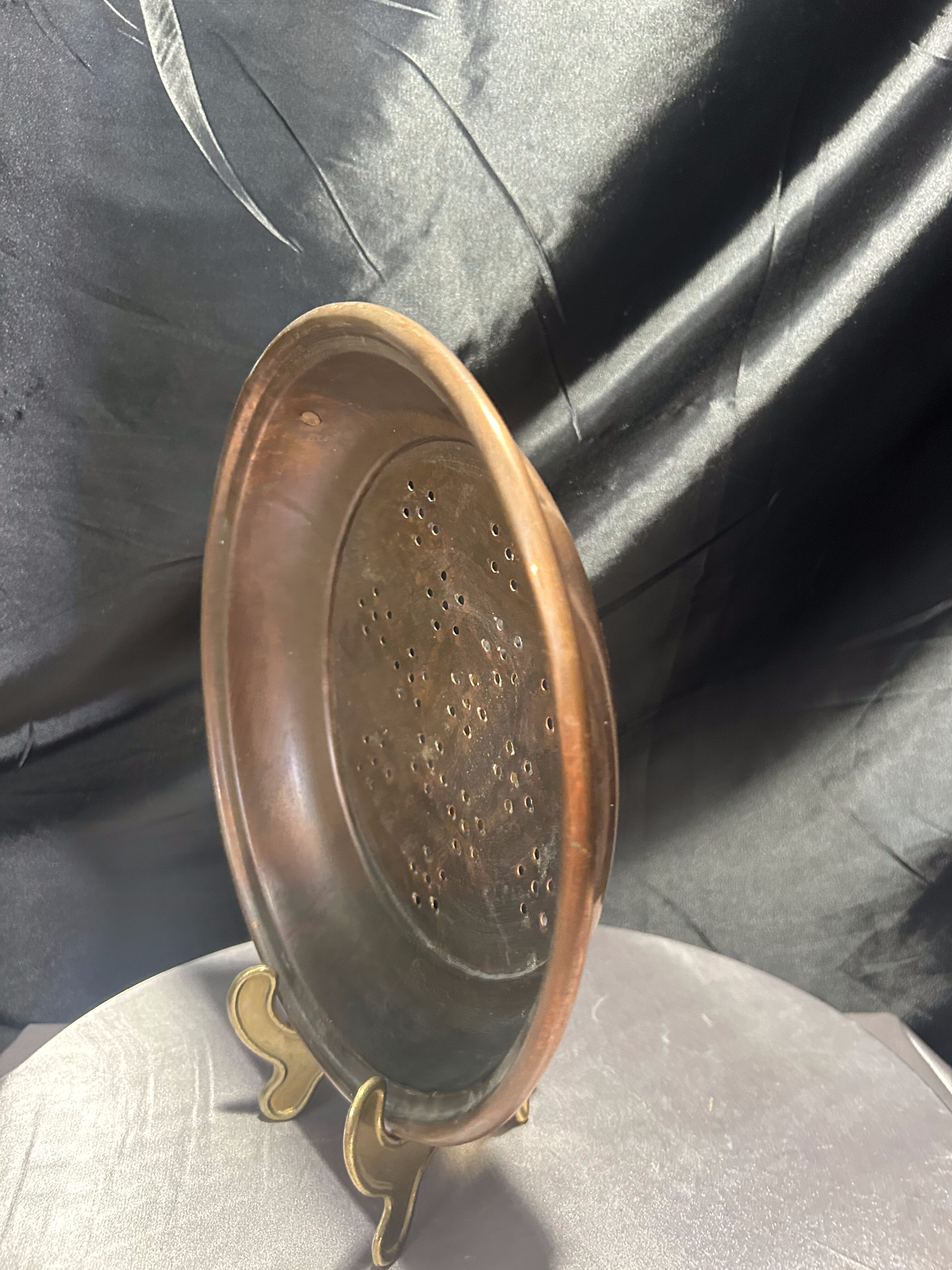 Solidny, ciężki durszlak wykonany z naturalnej miedzi, z charakterystyczną patyną i wyraźnymi śladami użytkowania, które dodają mu uroku i autentyczności. Wyposażony w oczko do zawieszenia – idealny do ekspozycji na ścianie kuchennej jako dekoracyjny akcent. Drobne otwory rozmieszczone centralnie nadają mu funkcjonalność, dzięki czemu może służyć nie tylko jako ozdoba, ale także jako tradycyjne naczynie kuchenne. Świetny wybór do wnętrz w stylu rustykalnym, prowansalskim lub retro.