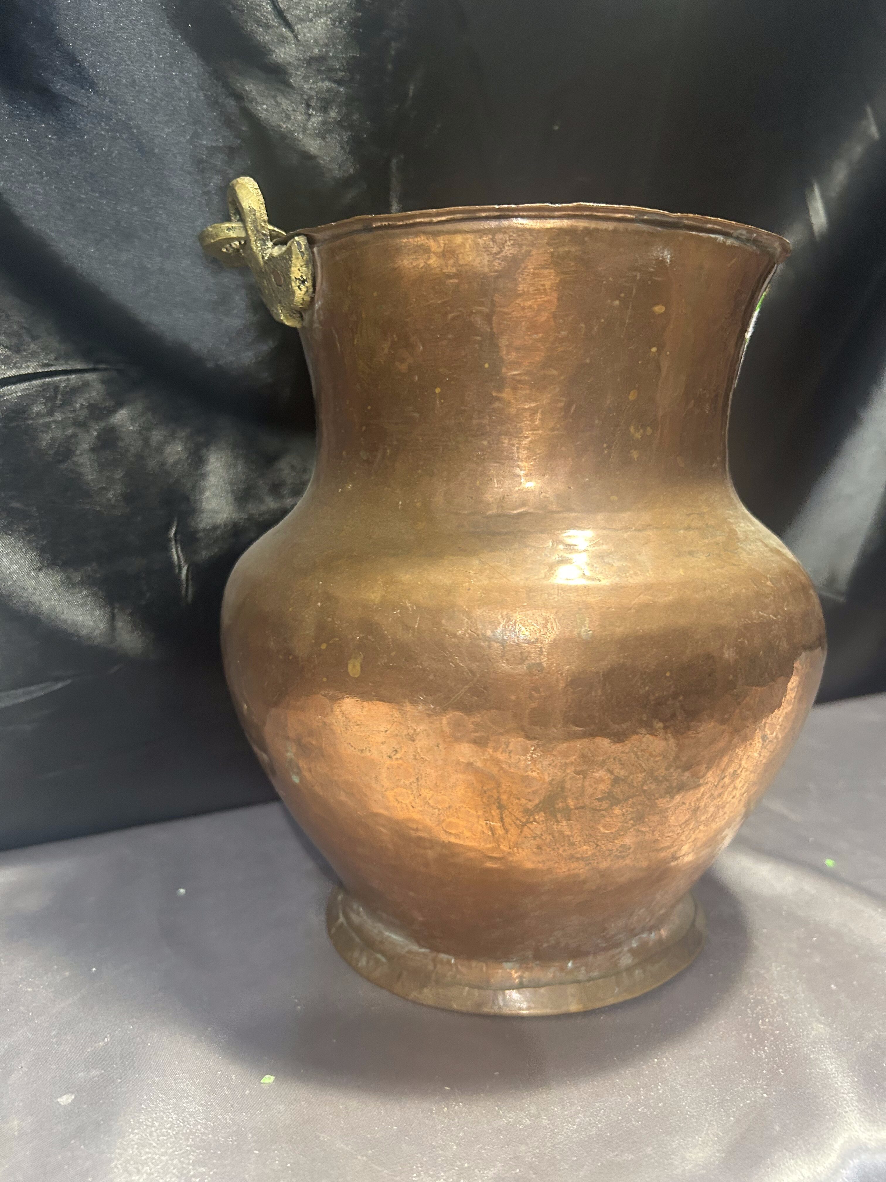Na sprzedaż miedziany dzban z piękną, kutą rączką wykonaną z mosiądzu. Solidny, ciężki i efektowny, o klasycznym kształcie, który doskonale podkreśli charakter wnętrza w stylu rustykalnym, retro czy prowansalskim. Dzban może pełnić zarówno funkcję dekoracyjną, jak i użytkową – idealny do ekspozycji kwiatów, gałęzi lub jako samodzielna ozdoba stołu, komody czy tarasu.