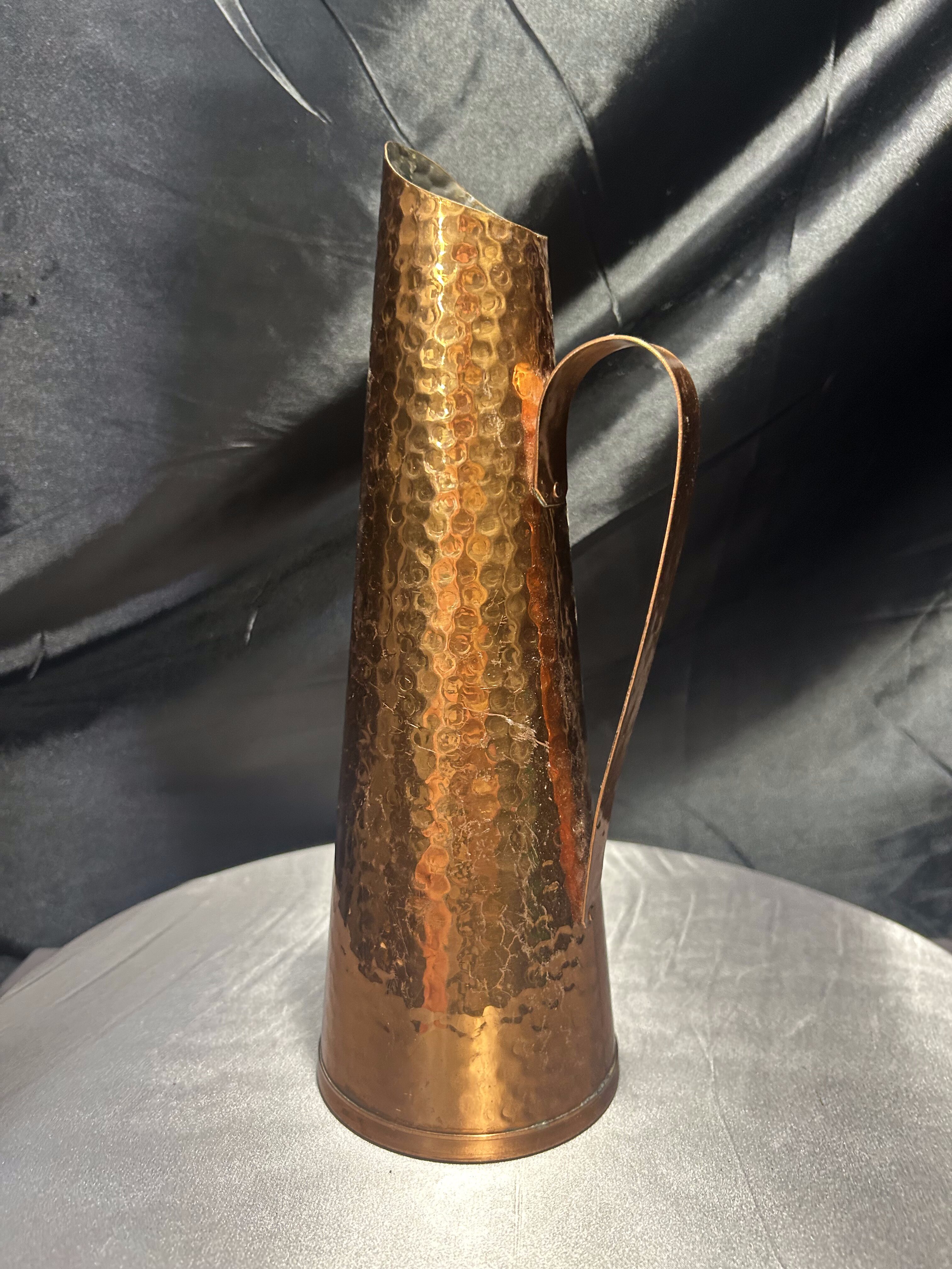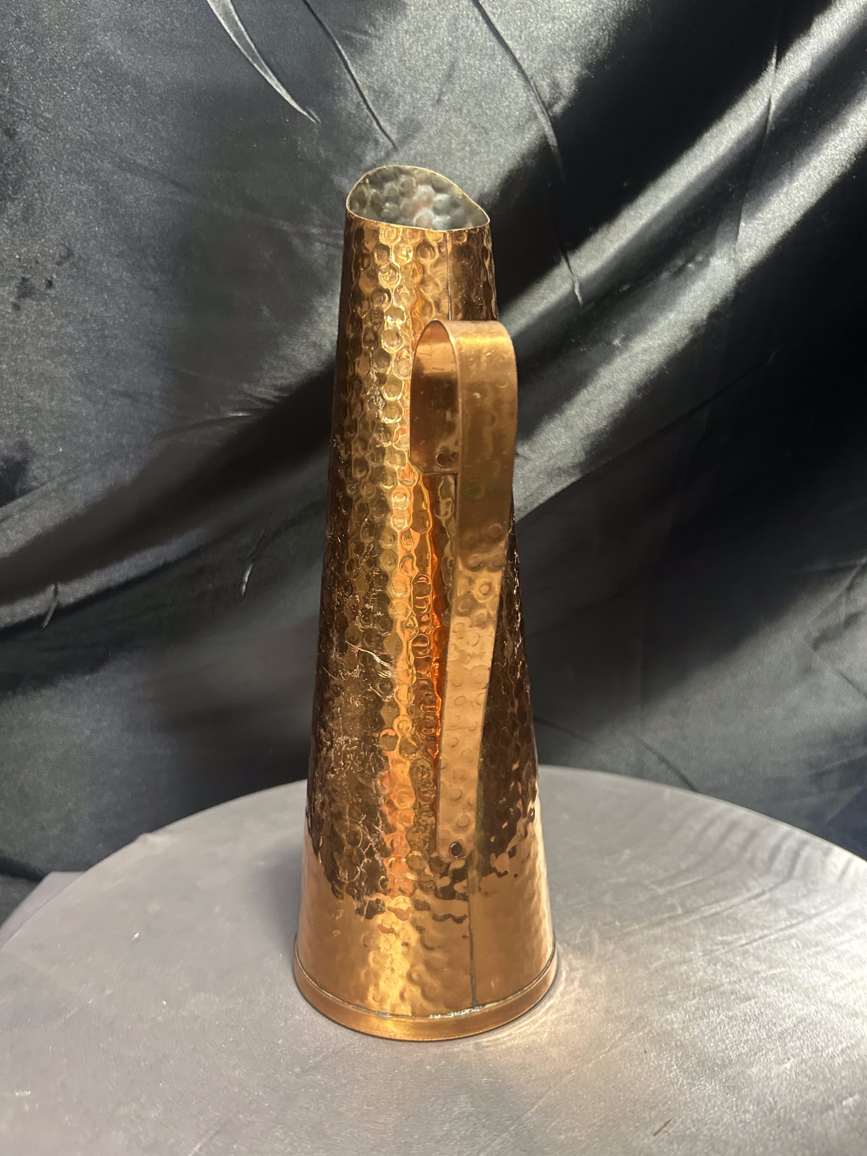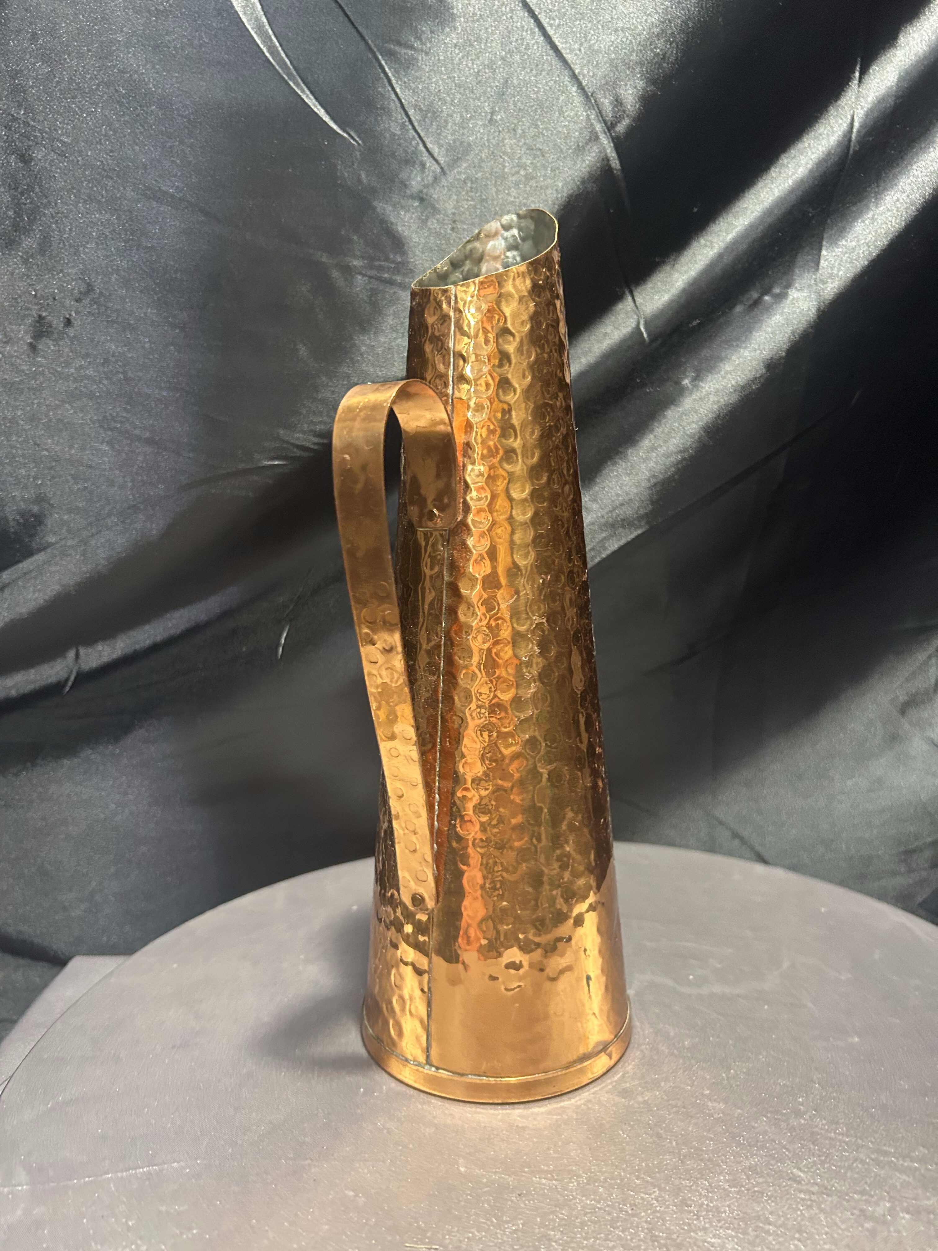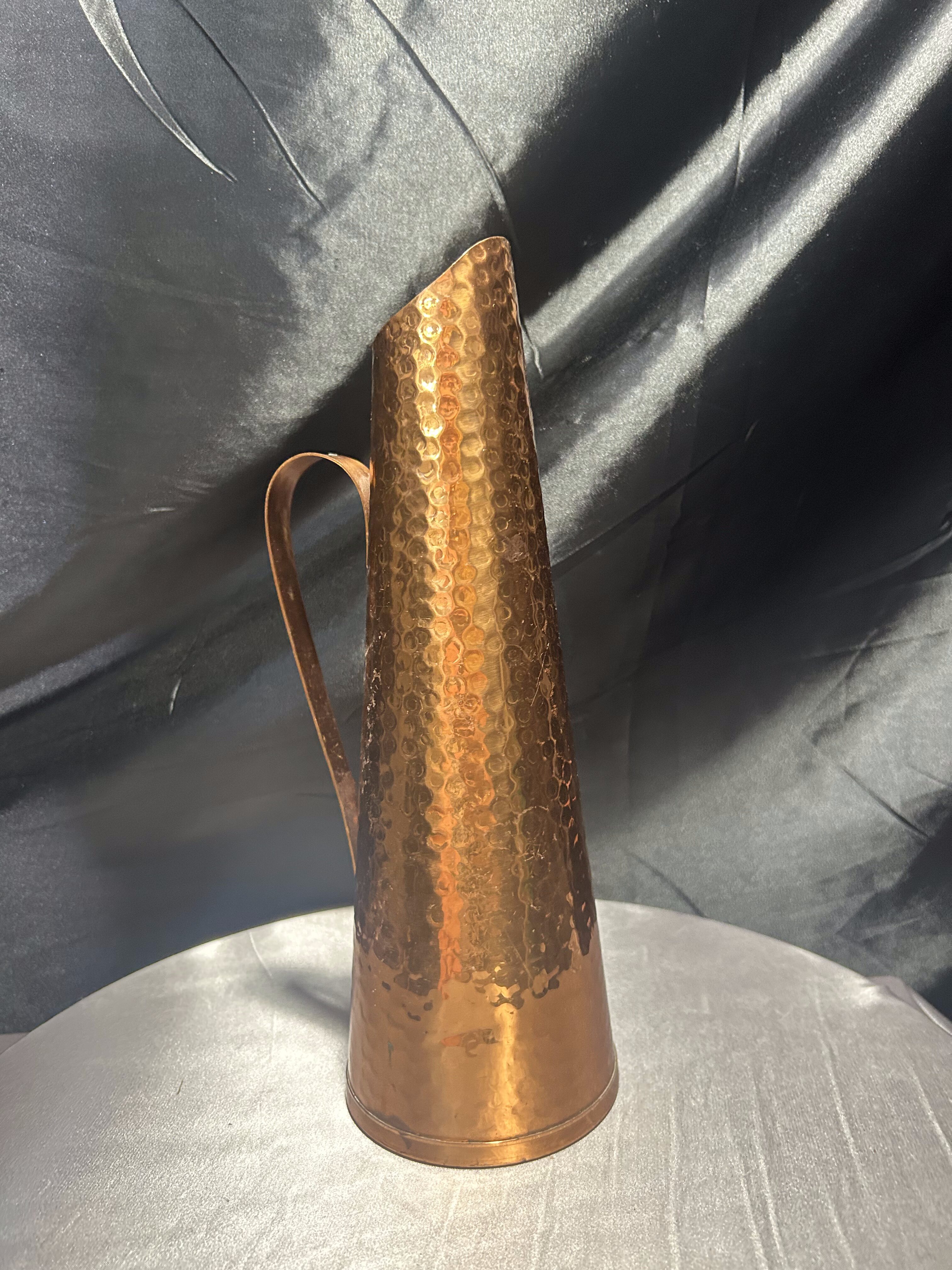 Smukły dzban o formie flaconu, wykonany z miedzi i wykończony techniką młotkowania, która nadaje mu niepowtarzalną fakturę i subtelny połysk. Minimalistyczna, zwężająca się sylwetka oraz finezyjnie zakrzywiony uchwyt tworzą elegancką i surową kompozycję, która idealnie odnajdzie się w aranżacjach rustykalnych, loftowych lub eklektycznych. Może służyć jako ozdobny dzban, wazon na suche trawy lub samodzielna dekoracja z industrialnym charakterem.