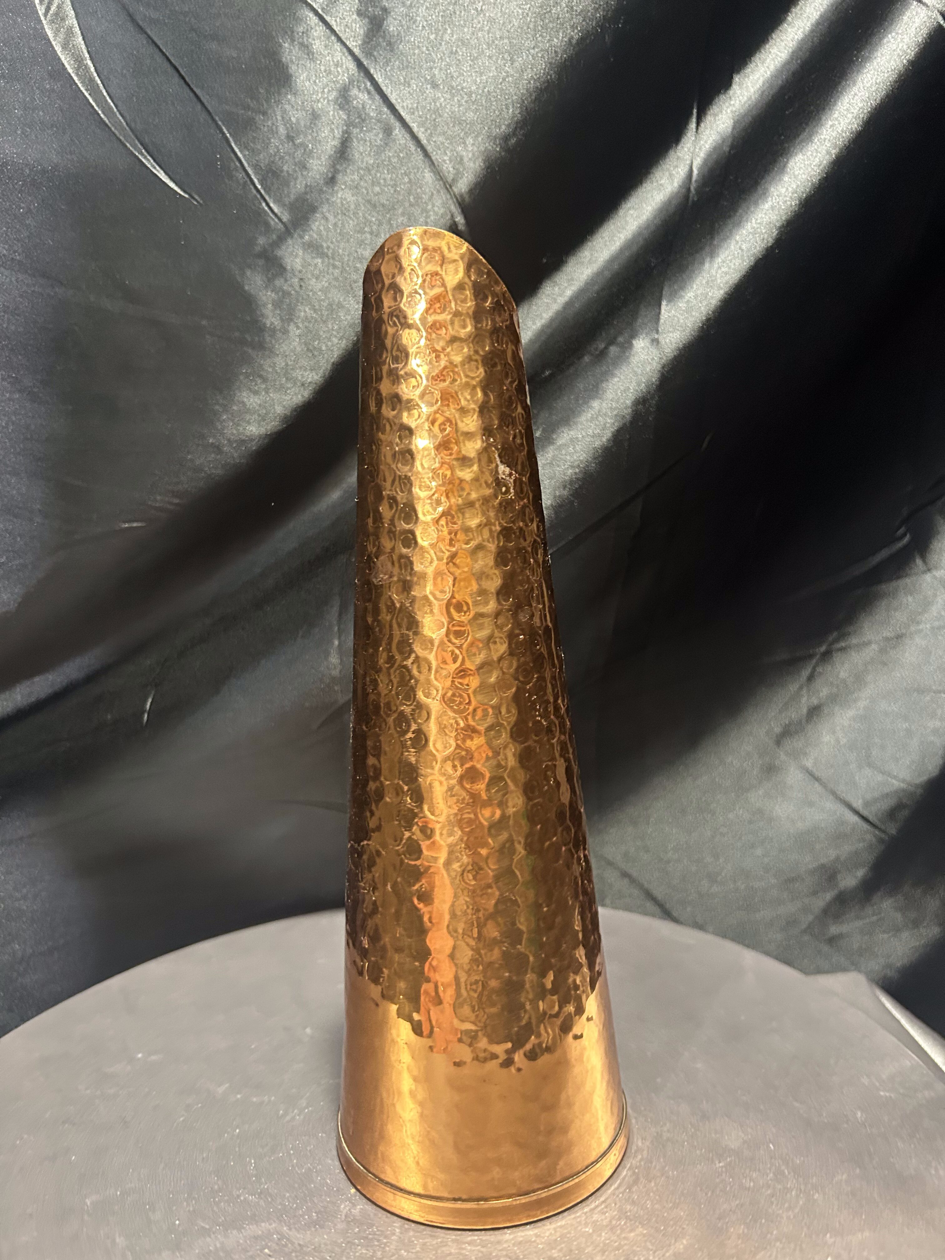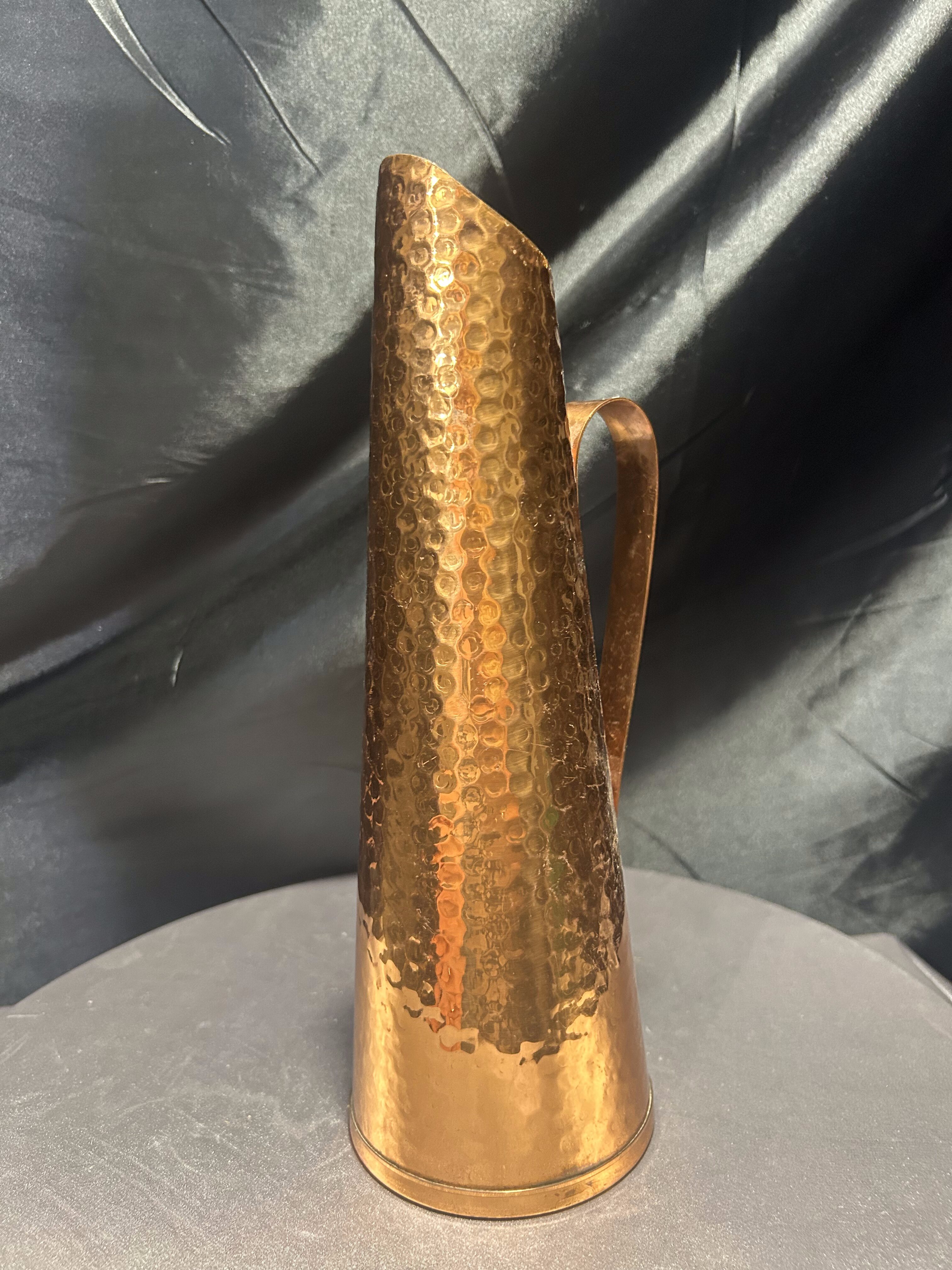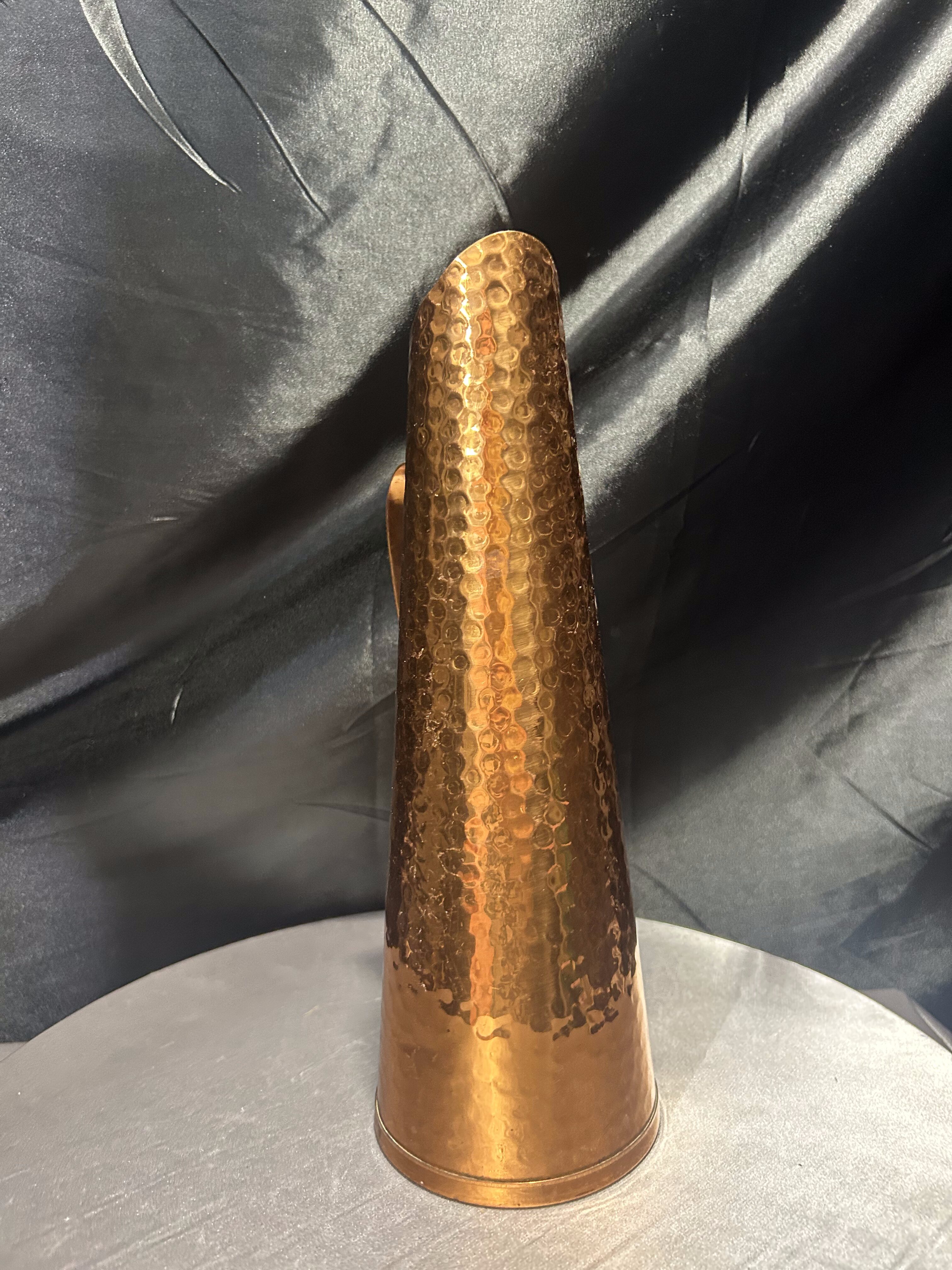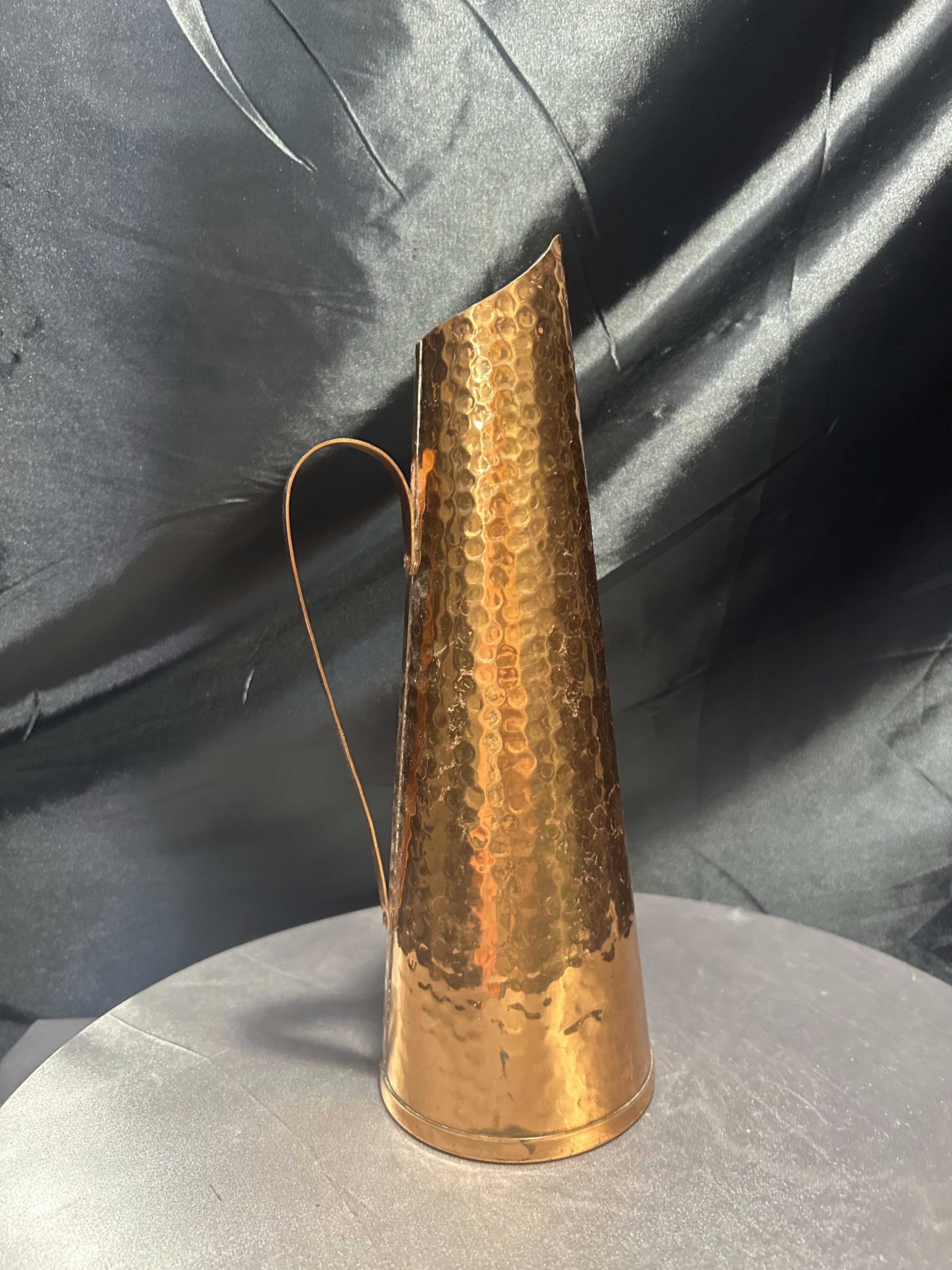 Smukły dzban o formie flaconu, wykonany z miedzi i wykończony techniką młotkowania, która nadaje mu niepowtarzalną fakturę i subtelny połysk. Minimalistyczna, zwężająca się sylwetka oraz finezyjnie zakrzywiony uchwyt tworzą elegancką i surową kompozycję, która idealnie odnajdzie się w aranżacjach rustykalnych, loftowych lub eklektycznych. Może służyć jako ozdobny dzban, wazon na suche trawy lub samodzielna dekoracja z industrialnym charakterem.