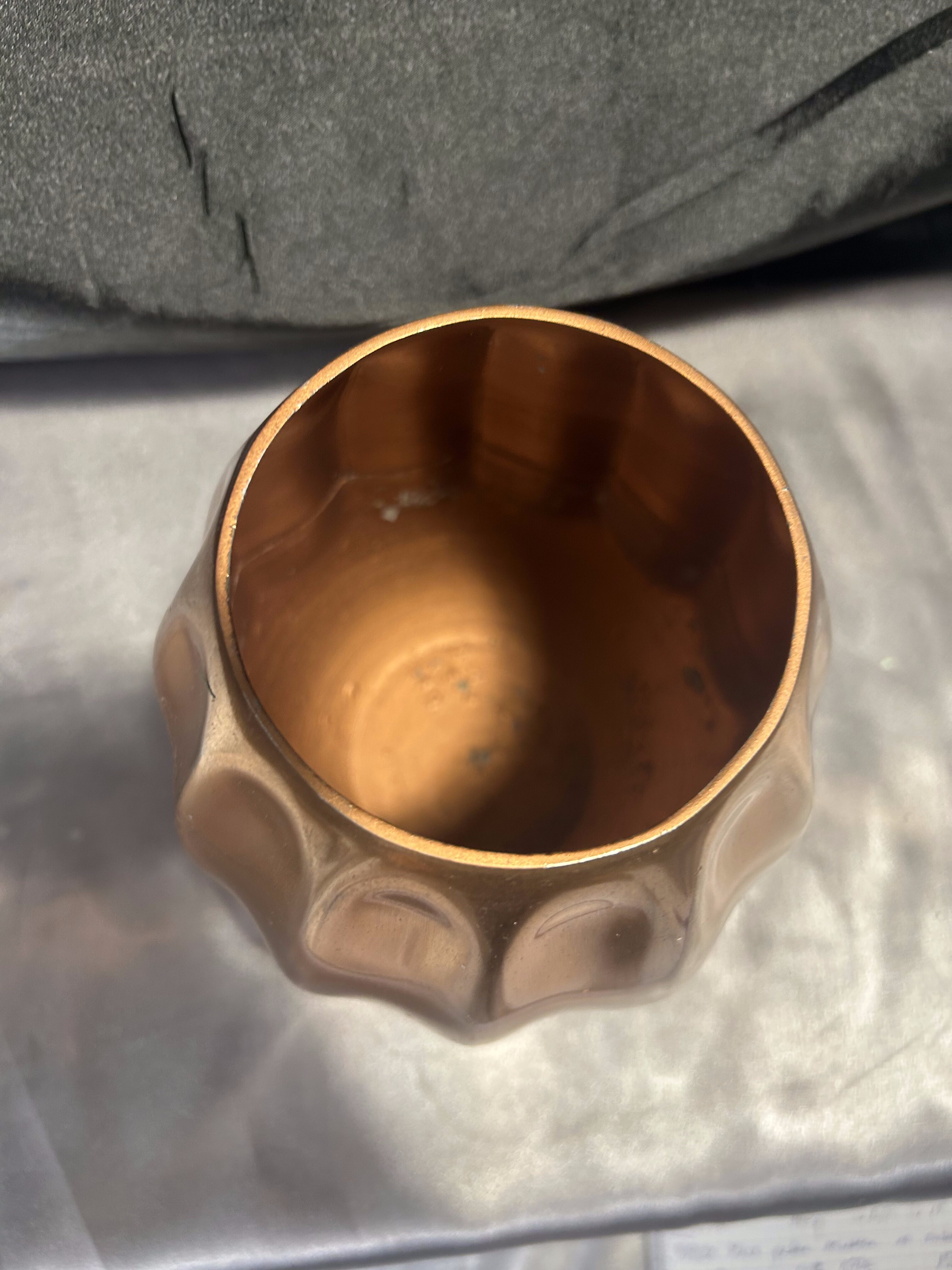 Na sprzedaż elegancki miedziany flakon, który może pełnić funkcję wazonu lub stylowego elementu dekoracyjnego. Jego ręcznie zdobiona powierzchnia nadaje mu wyjątkowego uroku, a klasyczna forma doskonale komponuje się z różnymi aranżacjami wnętrz.