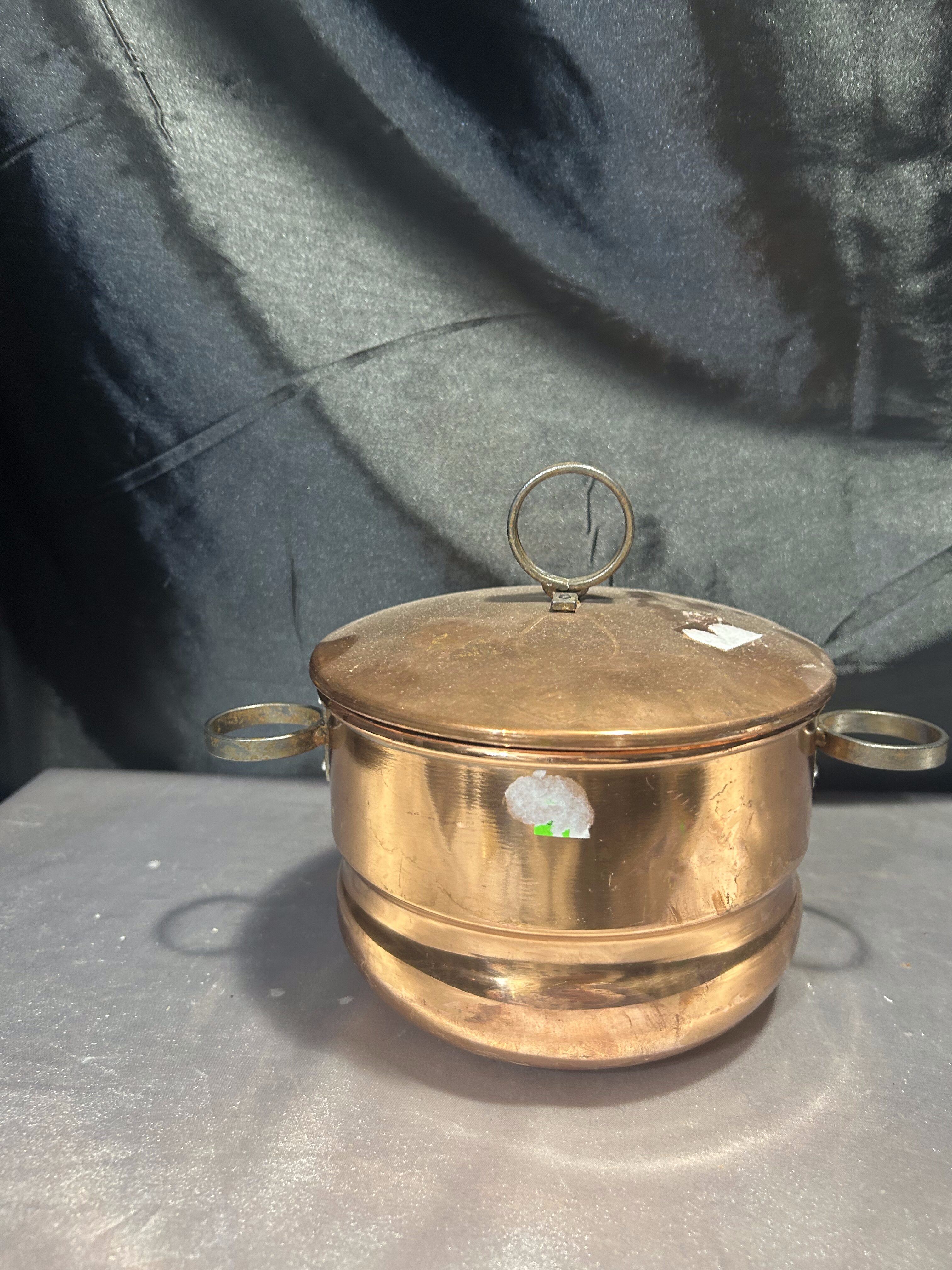 Elegancki miedziany garnek z pokrywką, wyposażony w dwa solidne, kute uszy oraz kute kółko jako uchwyt pokrywki. Klasyczny i dekoracyjny, doskonały zarówno do użytku, jak i jako wyjątkowa ozdoba kuchni w stylu rustykalnym, retro czy prowansalskim.