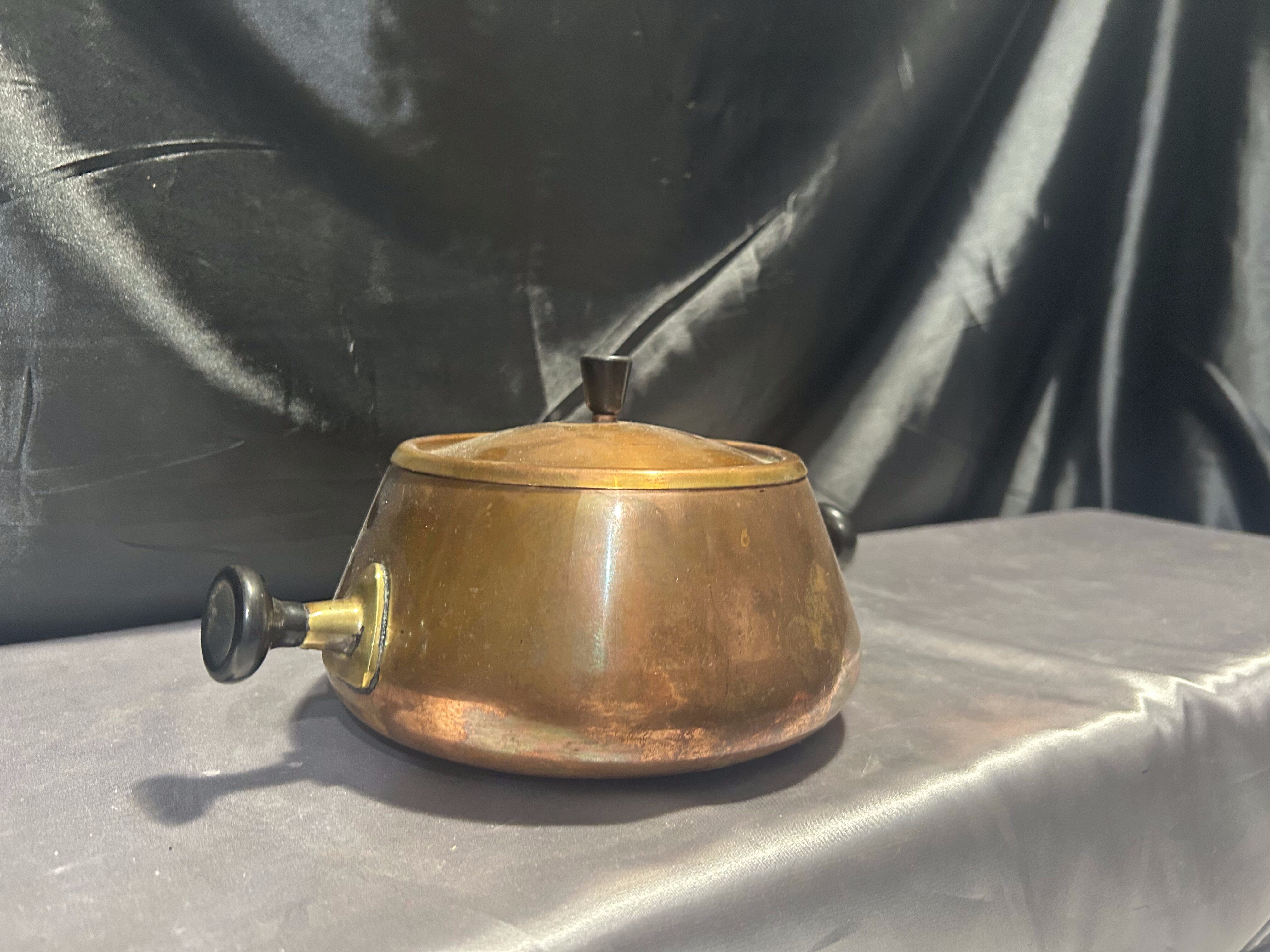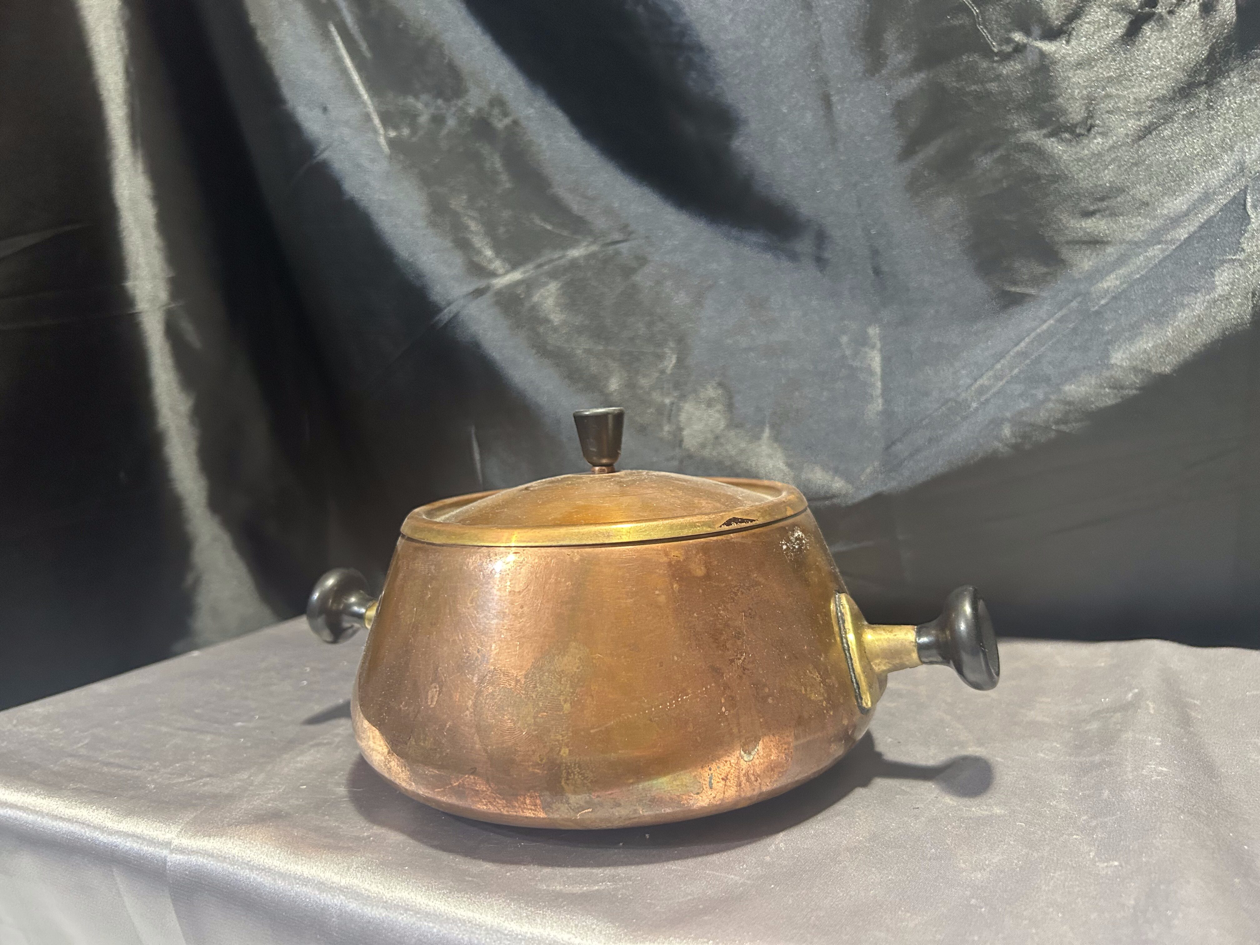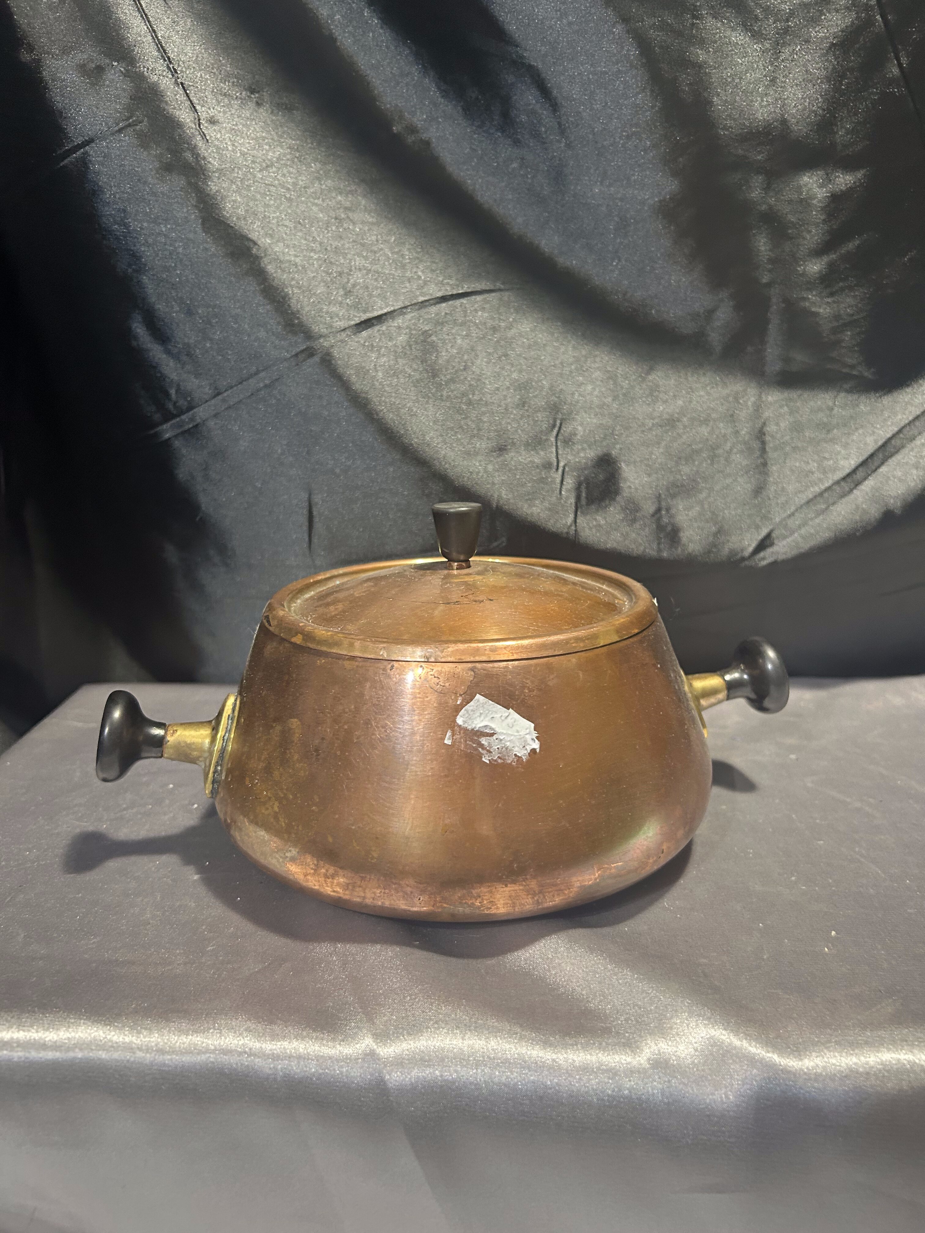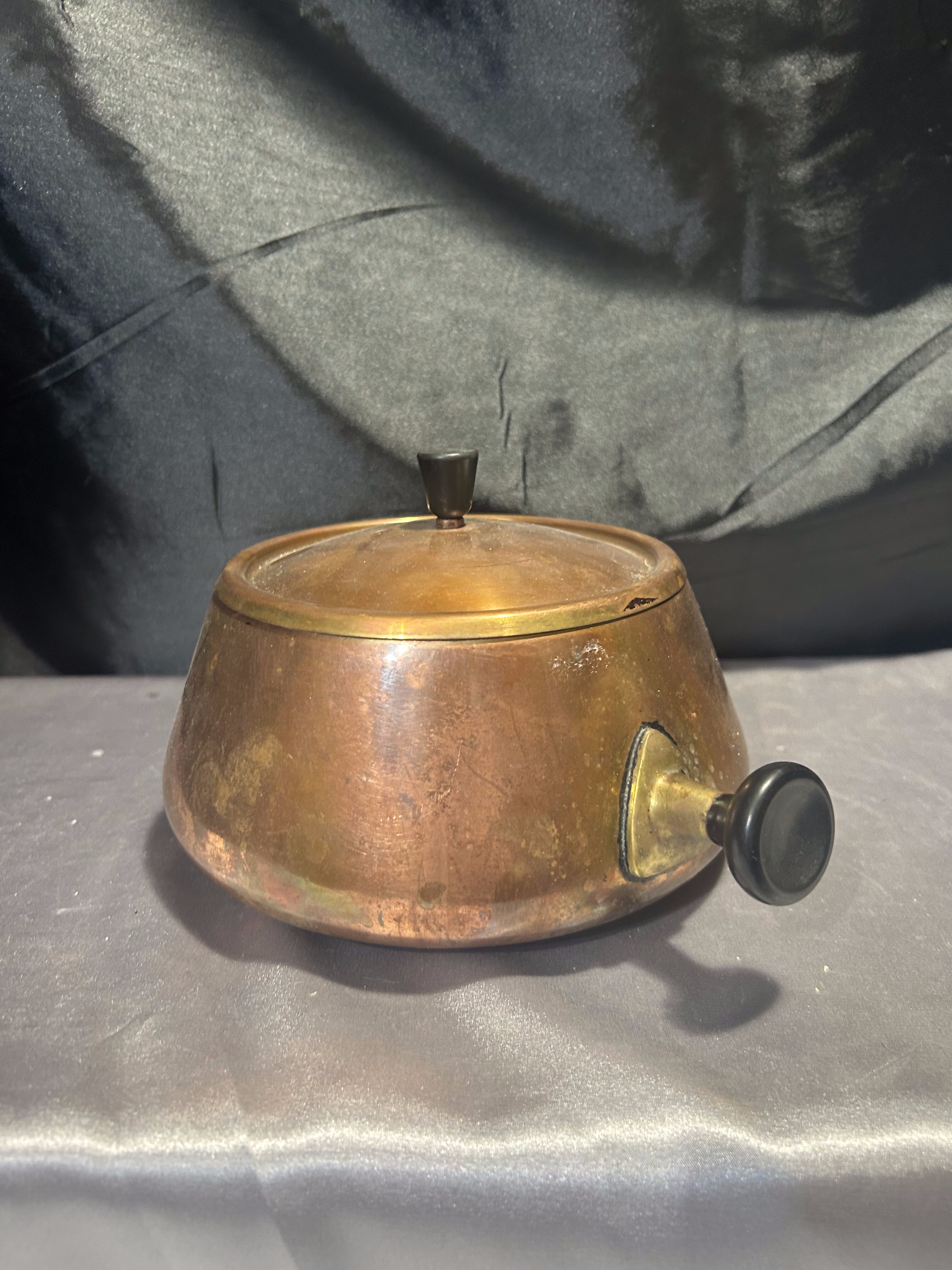 Wyjątkowy miedziany garnek z pokrywką, humorystycznie nazywany „Shrek”, dzięki charakterystycznym czarnym uszom i uchwytowi na pokrywce. Sygnowany, co potwierdza jego oryginalność i wartość kolekcjonerską. Solidnie wykonany, z pięknym połyskiem miedzi, łączy funkcjonalność z niebanalnym wyglądem, idealny zarówno do użytku, jak i jako ozdoba kuchni.
