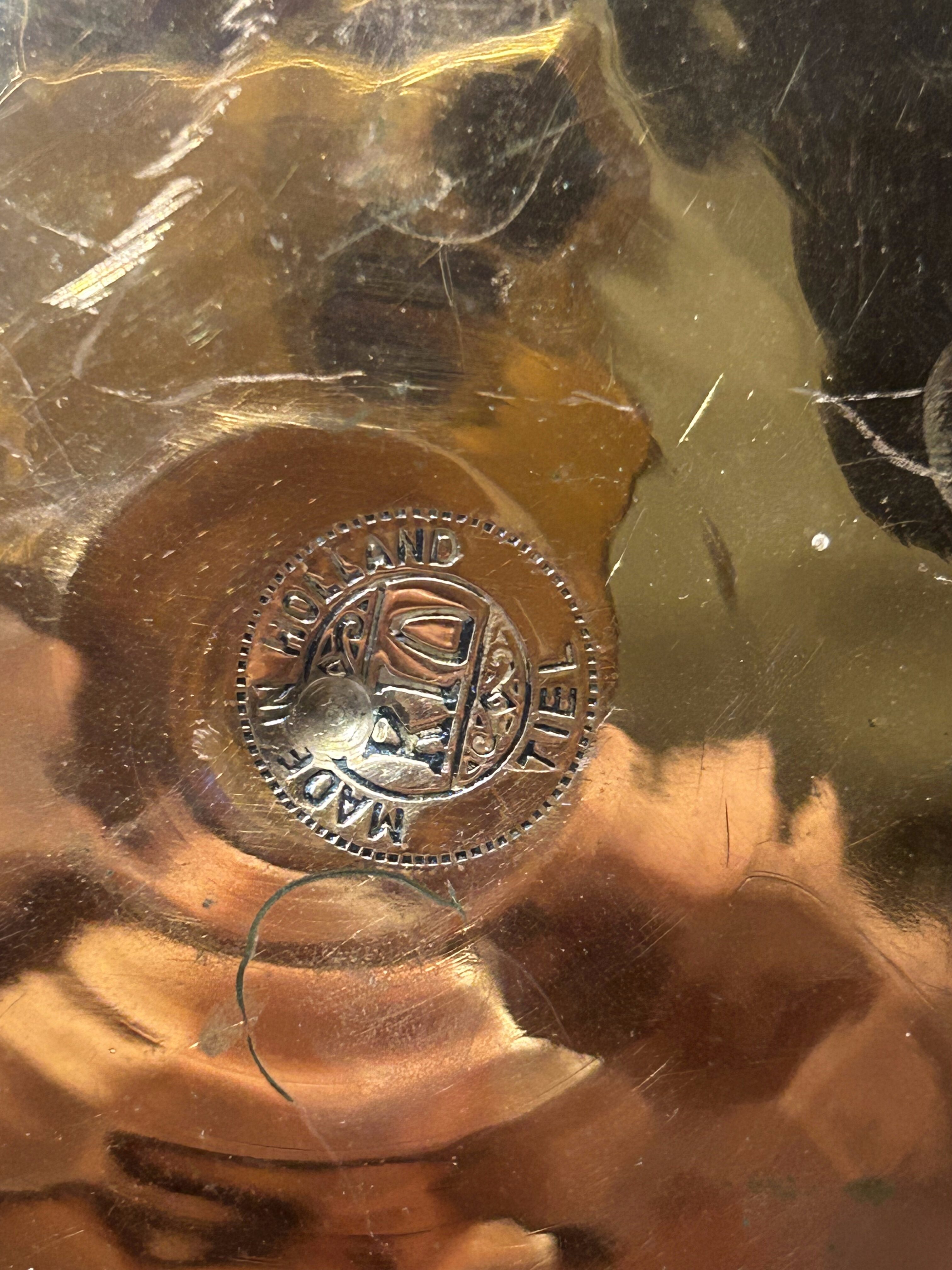 Wyjątkowy, sygnowany kociołek miedziany, osadzony na trzech ozdobnych mosiężnych nóżkach, z solidną kutą rączką do powieszenia. Piękny przykład dawnego rzemiosła, który łączy w sobie funkcjonalność, trwałość i niepowtarzalny styl.