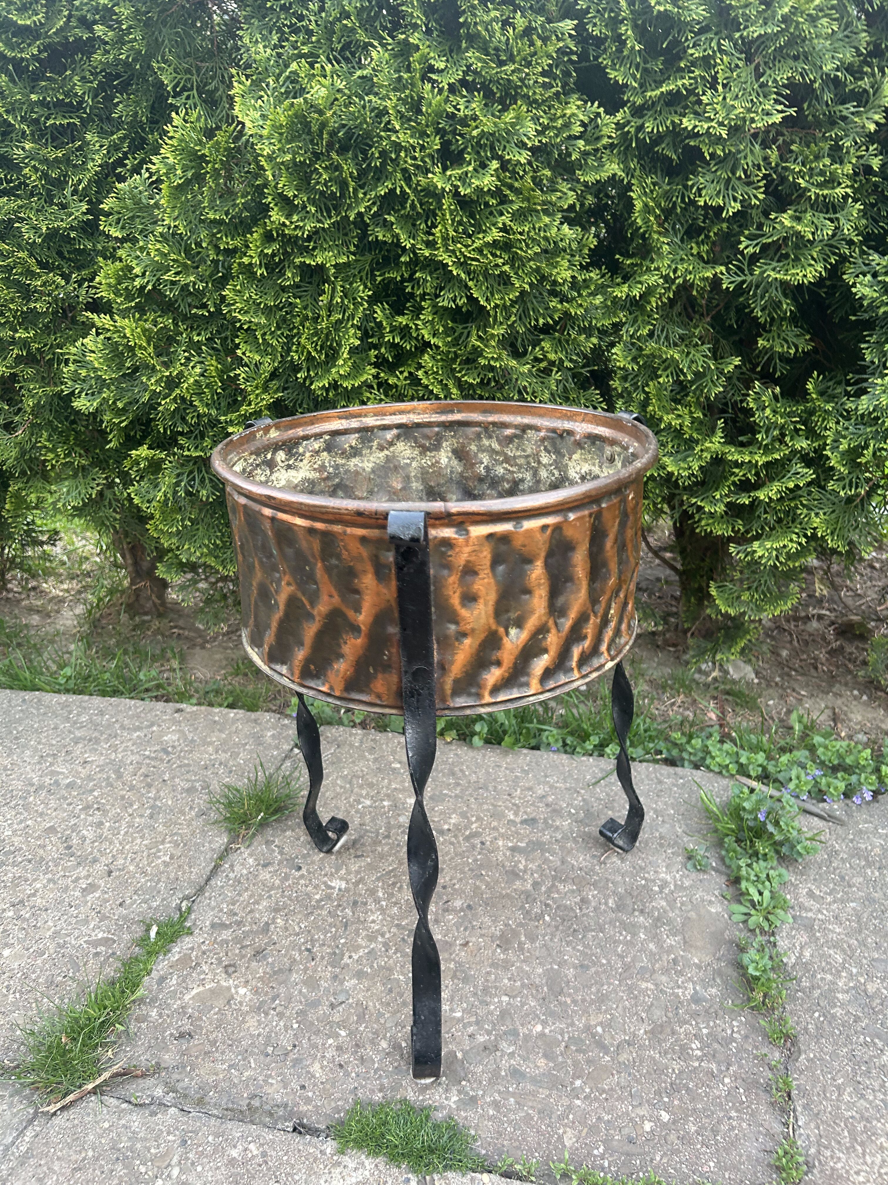 Elegancki, wysoki kwietnik wykonany z miedzi, osadzony na solidnych, ręcznie kutych nogach. Misa może być nieszczelna, dlatego najlepiej sprawdzi się jako osłonka na doniczkę z podstawką. Idealny do wnętrz w stylu rustykalnym, ogrodów zimowych czy na taras. Przyciąga uwagę formą i wykonaniem – unikatowy egzemplarz z charakterem.