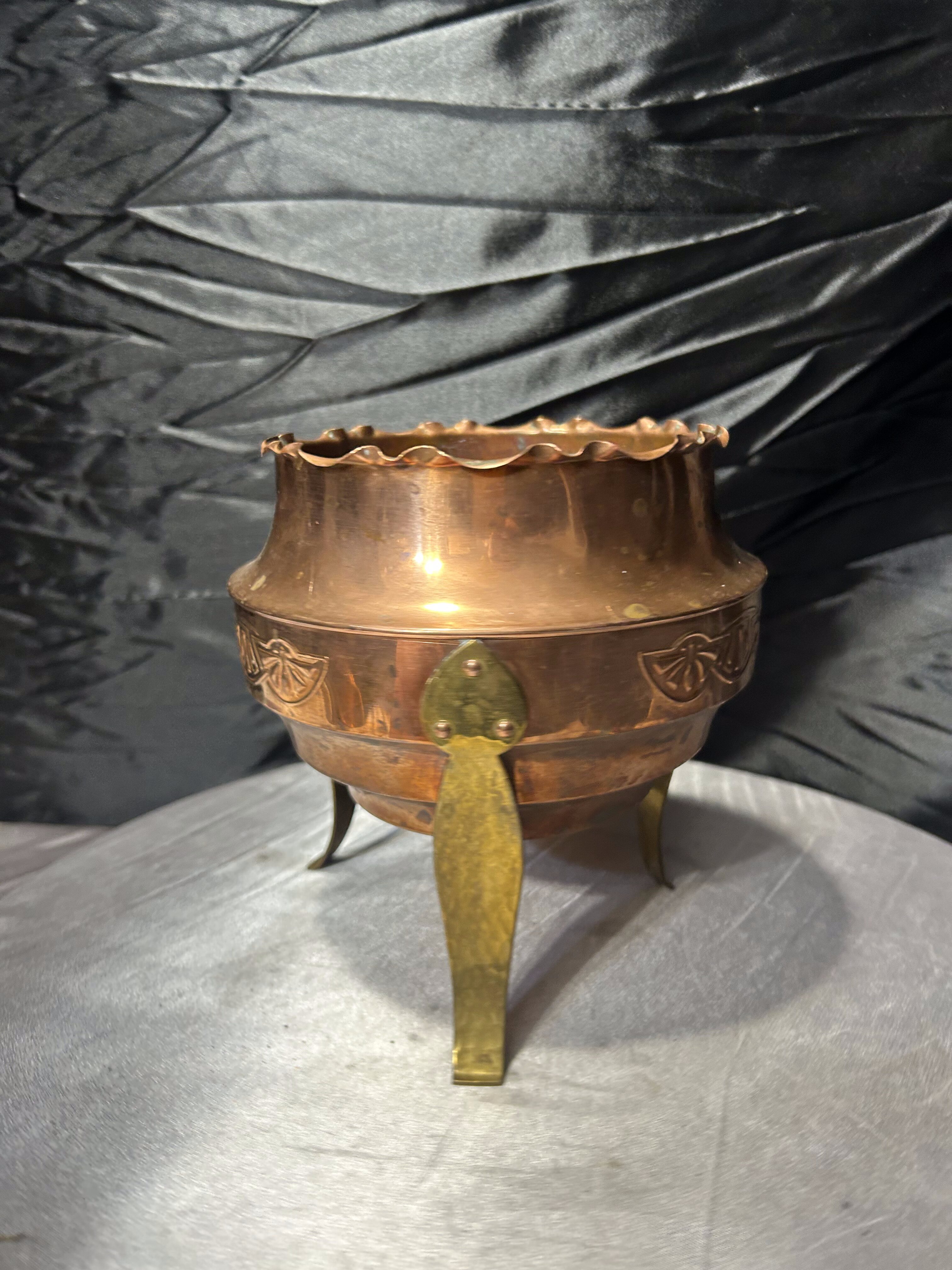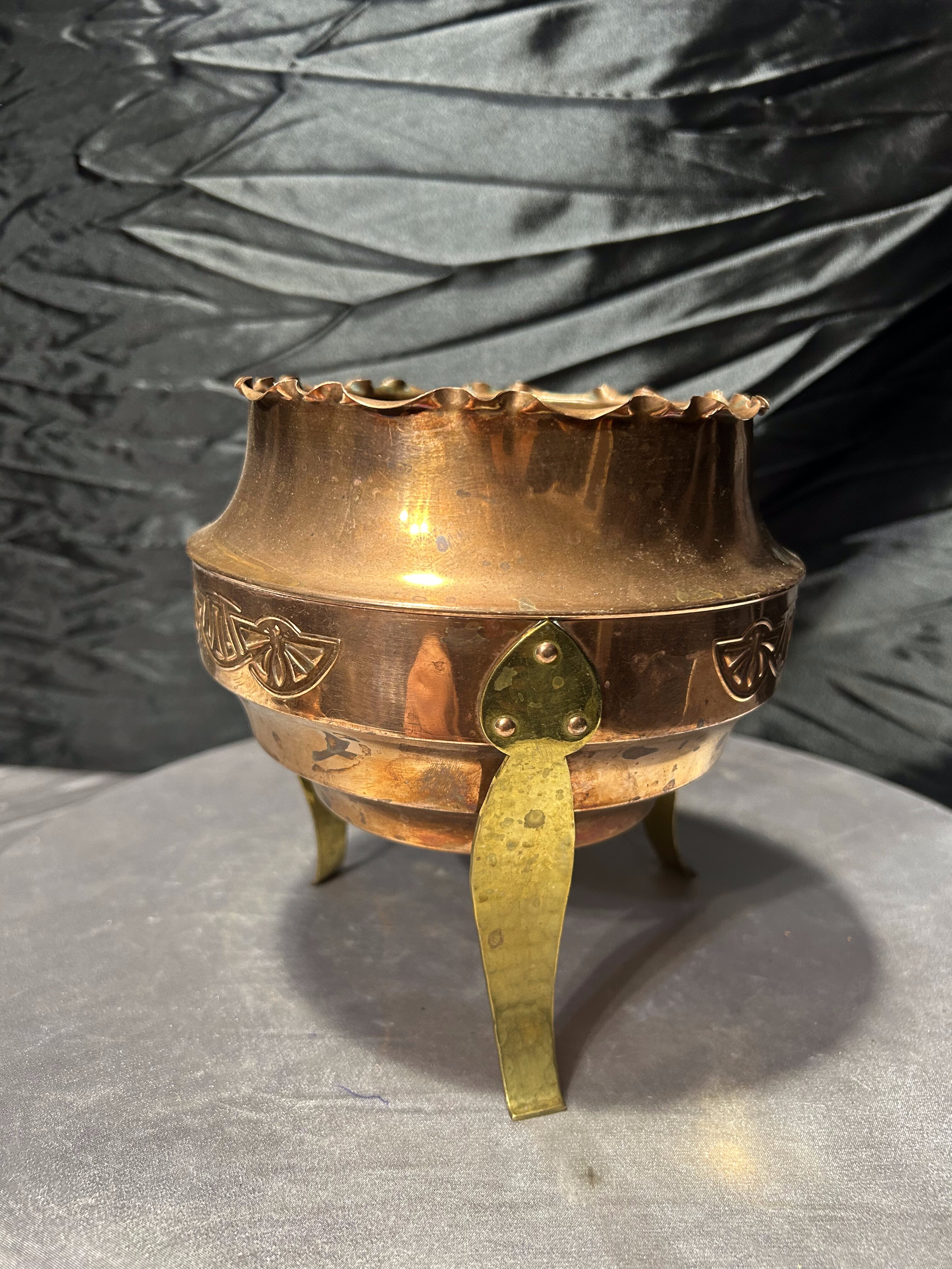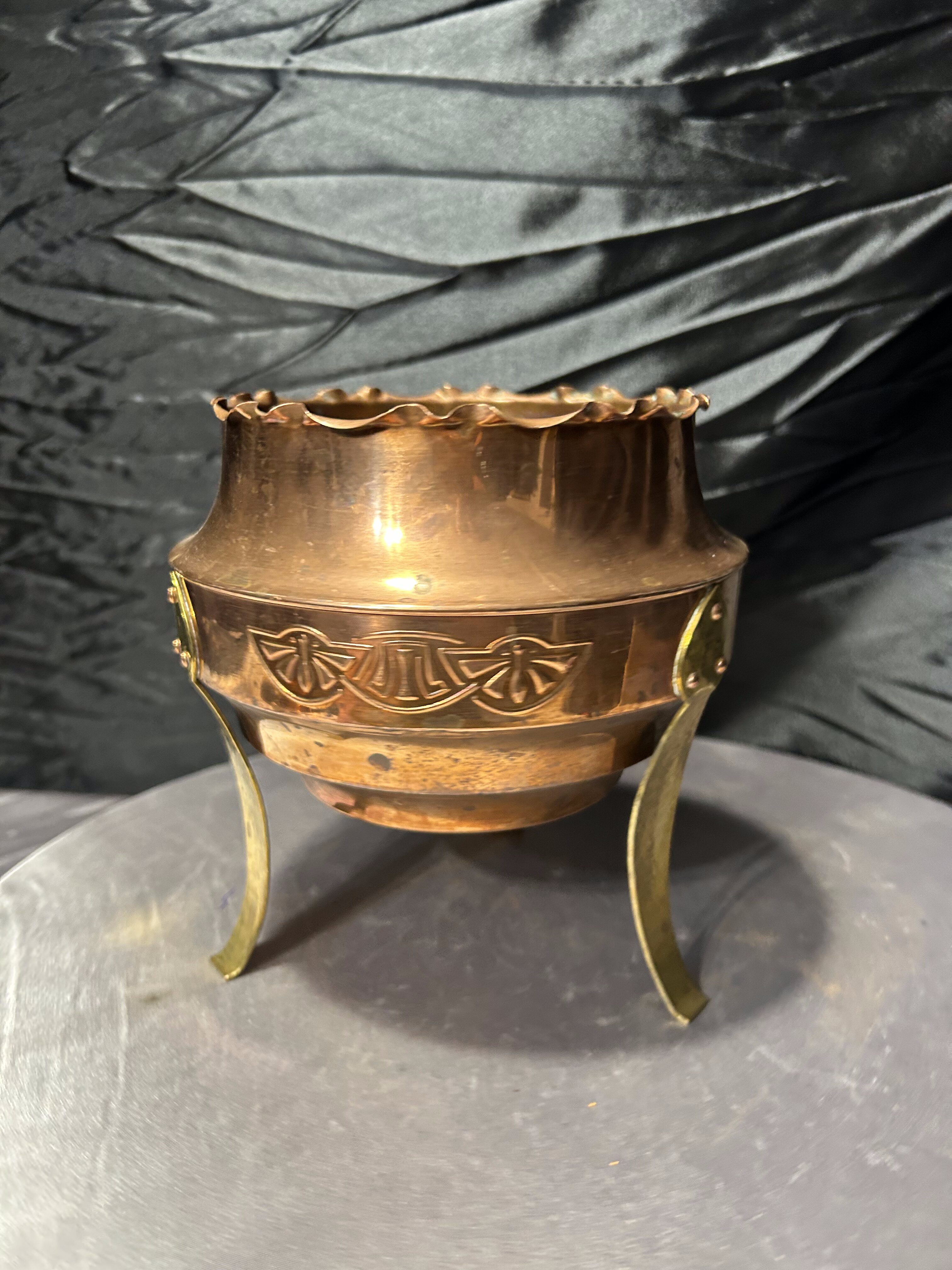 Miedziany kwietnik na trzech mosiężnych nogach – elegancja vintage