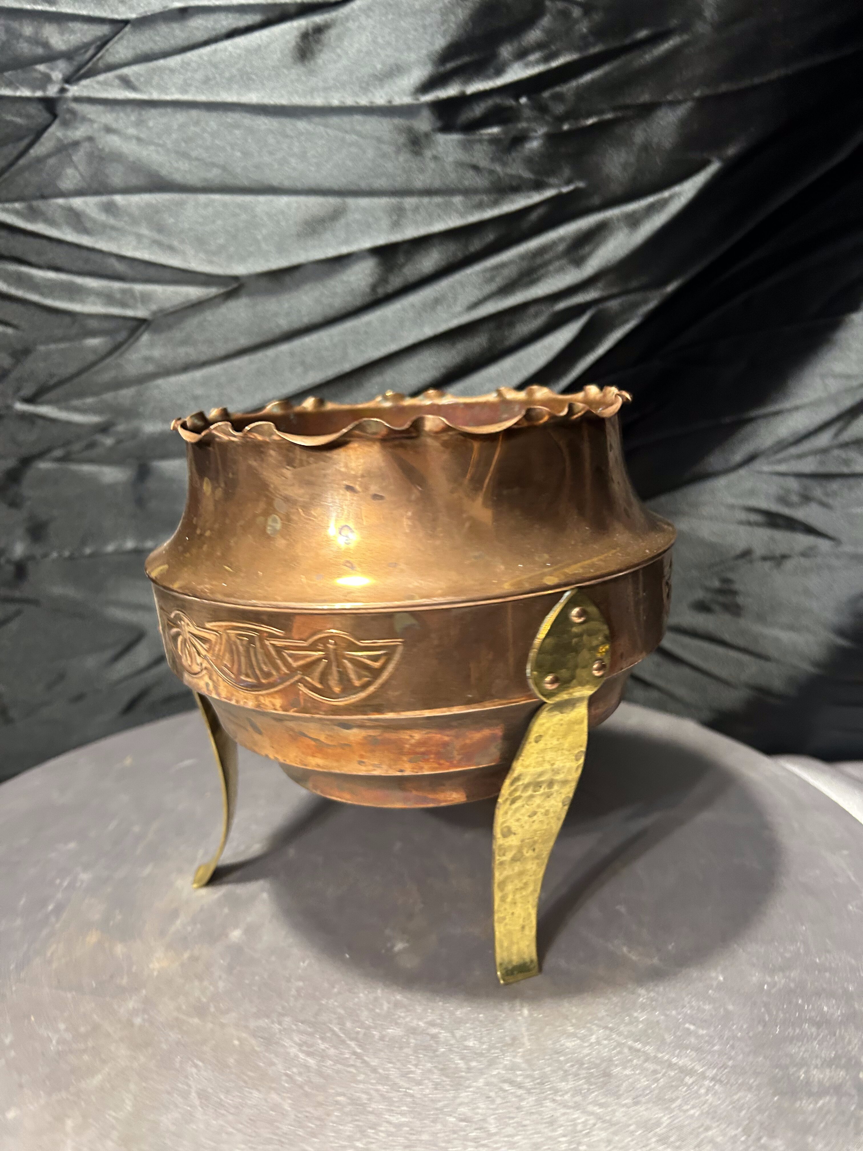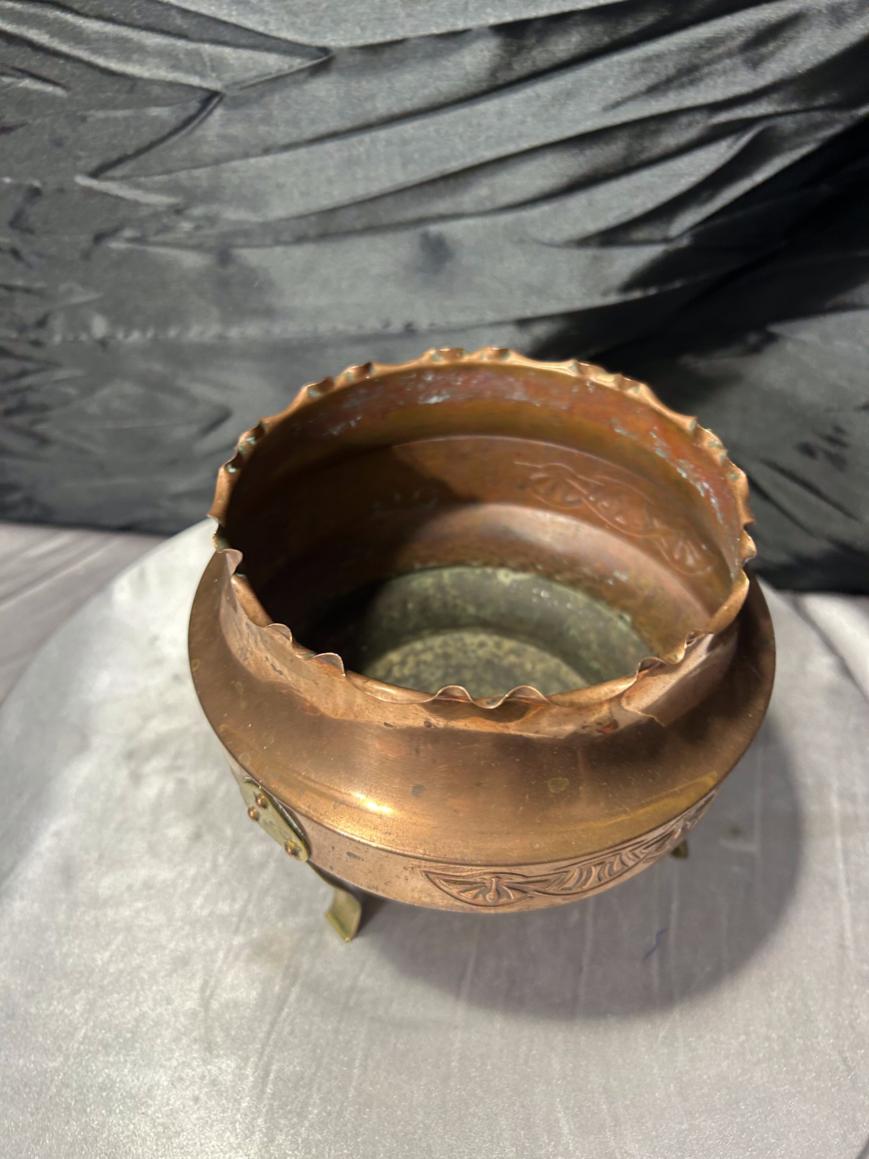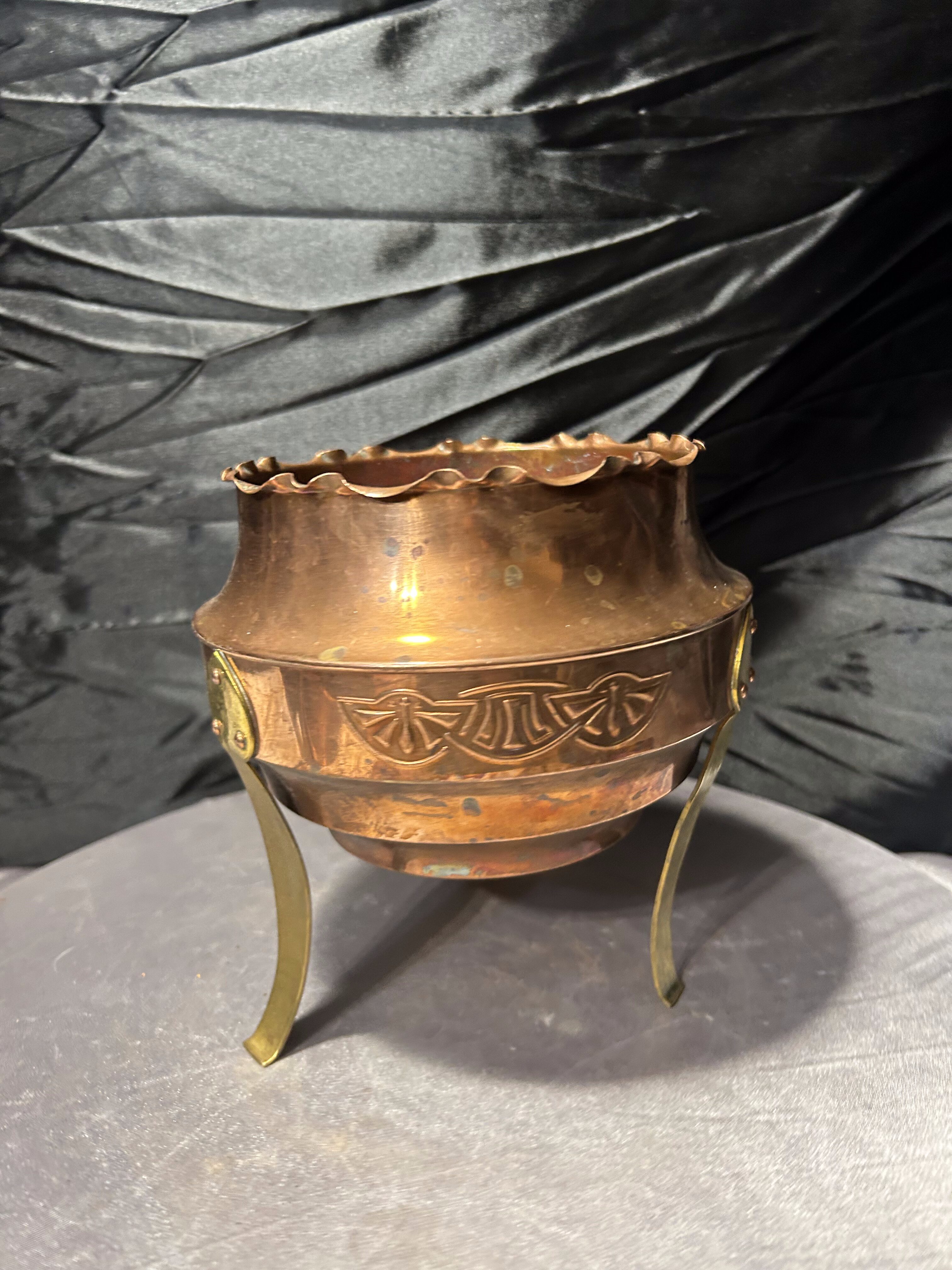 Miedziany kwietnik na trzech mosiężnych nogach – elegancja vintage