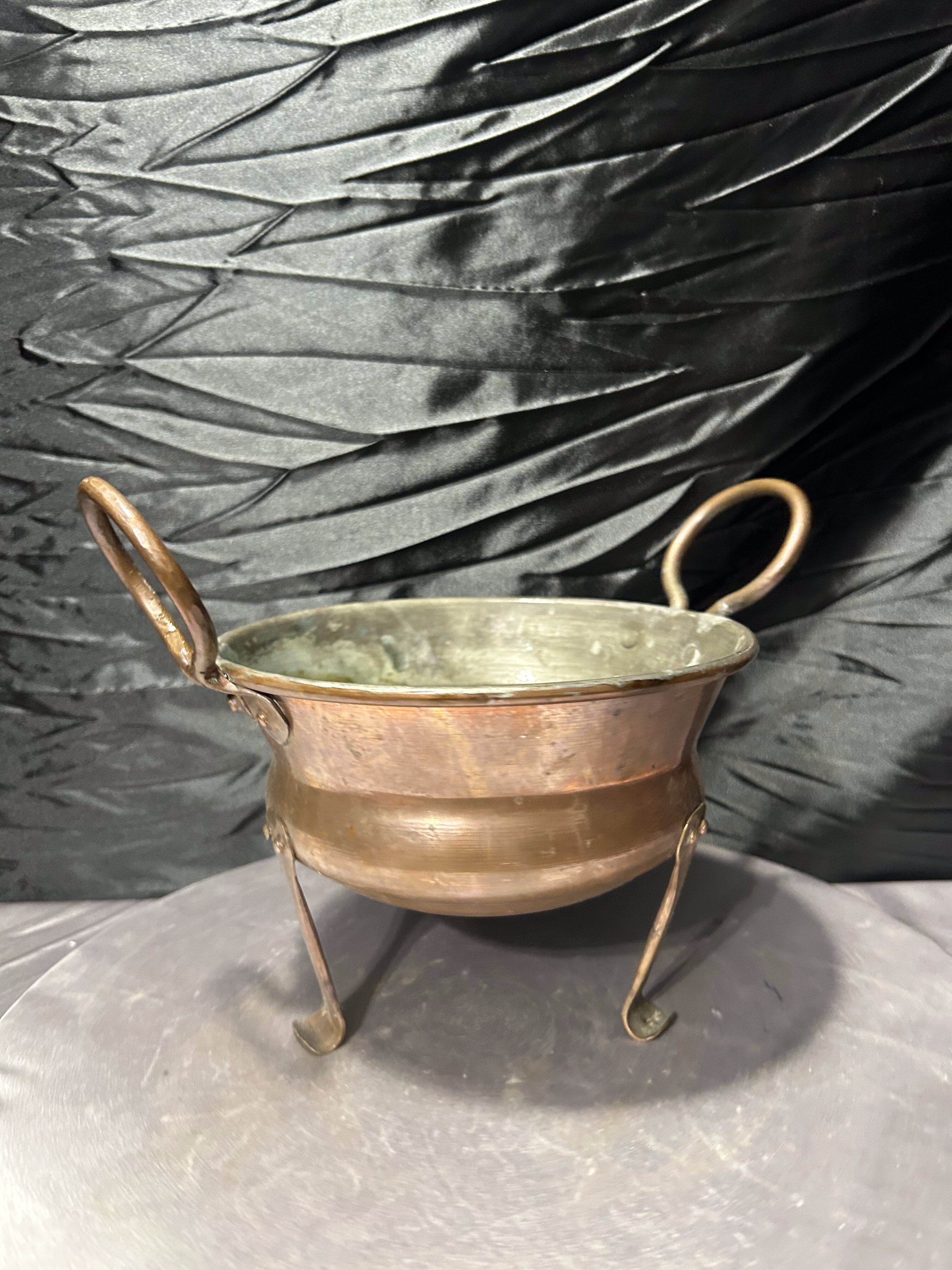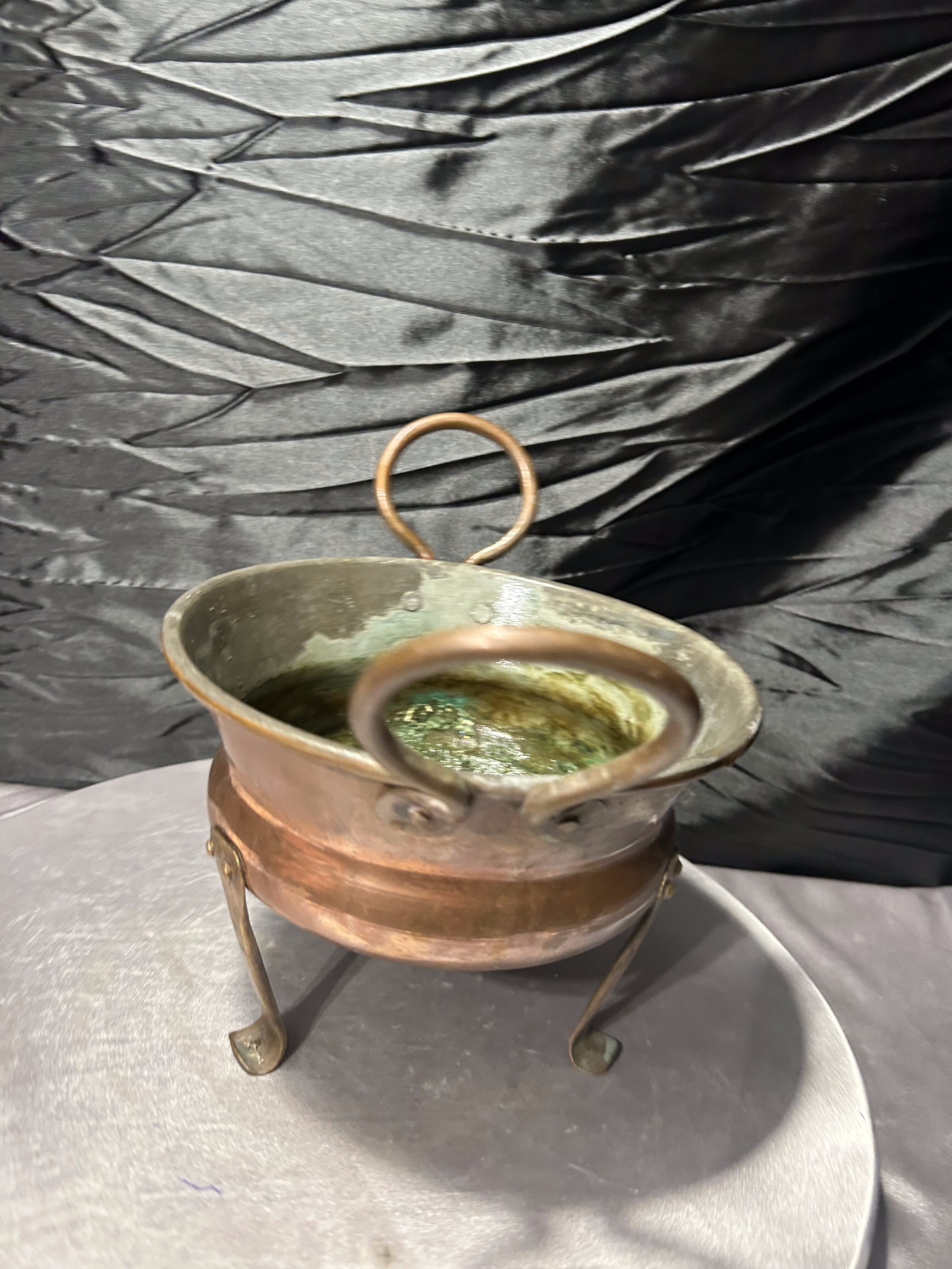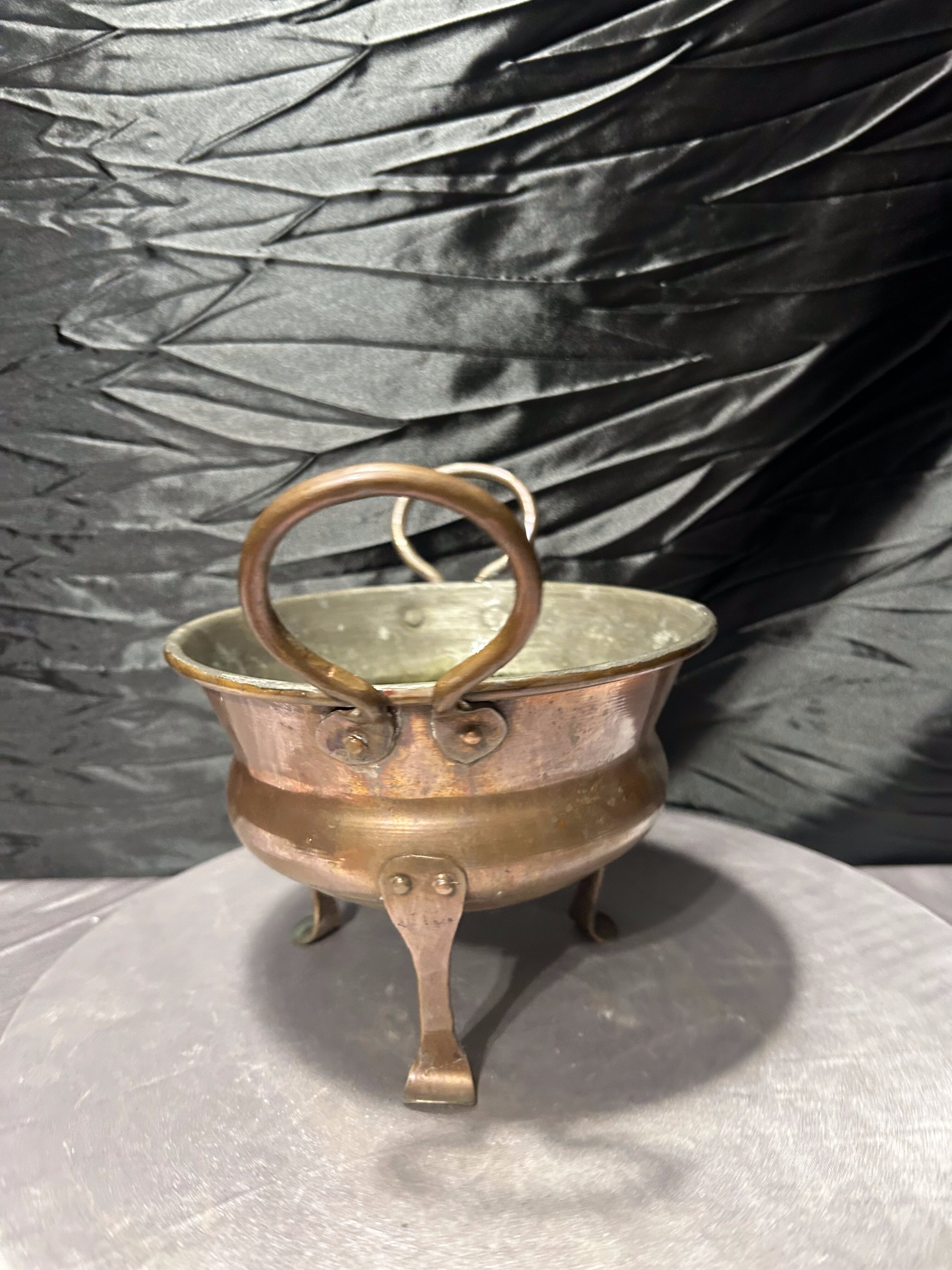 Miedziany kwietnik na trzech nogach z ozdobnymi uszami – vintage