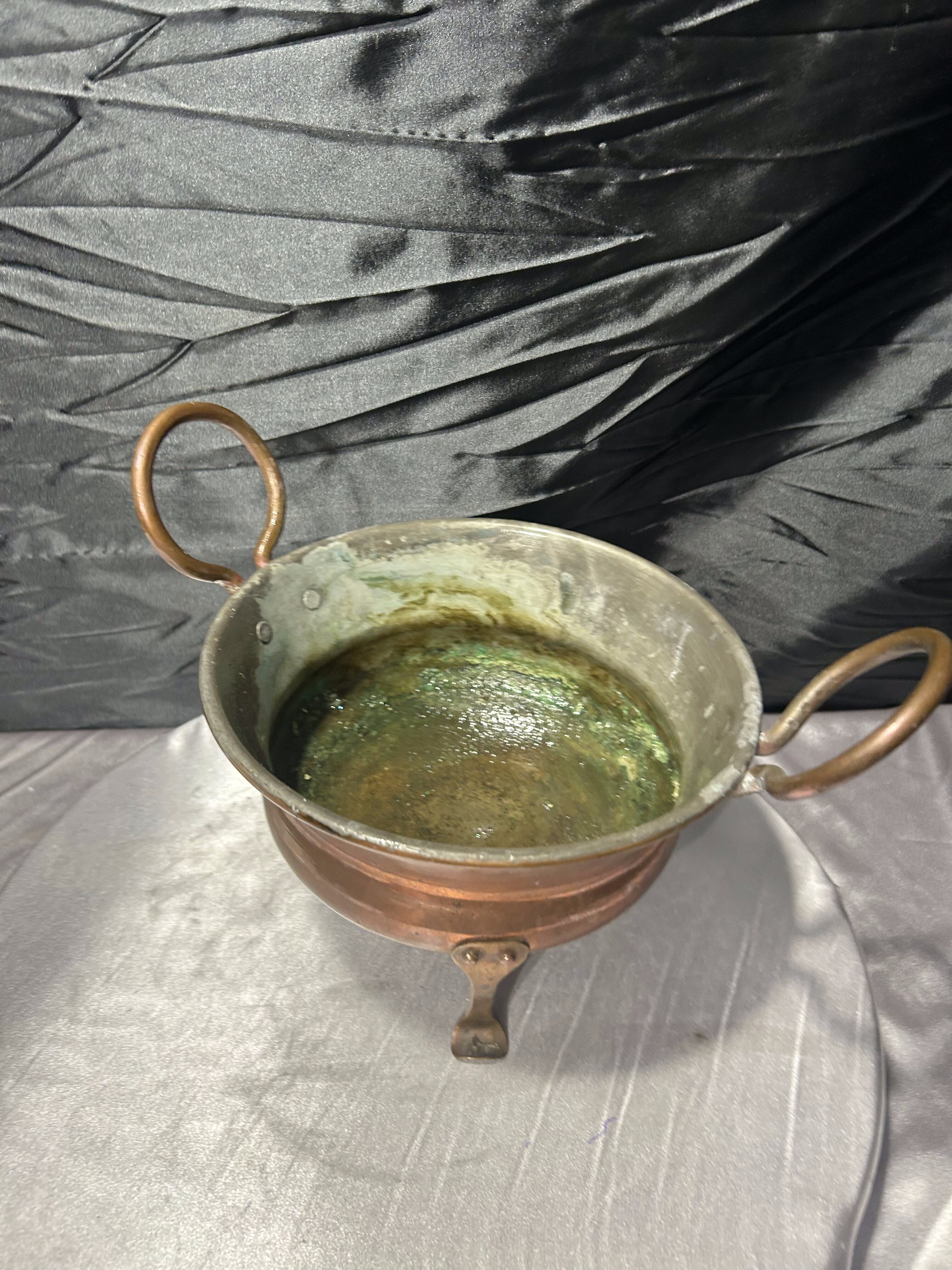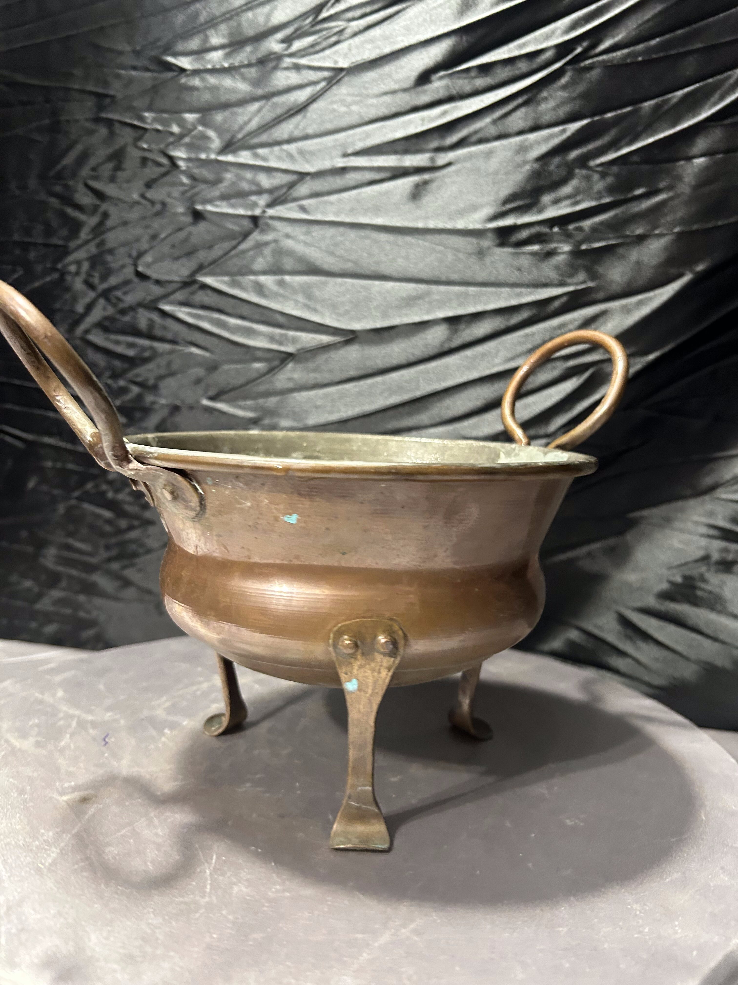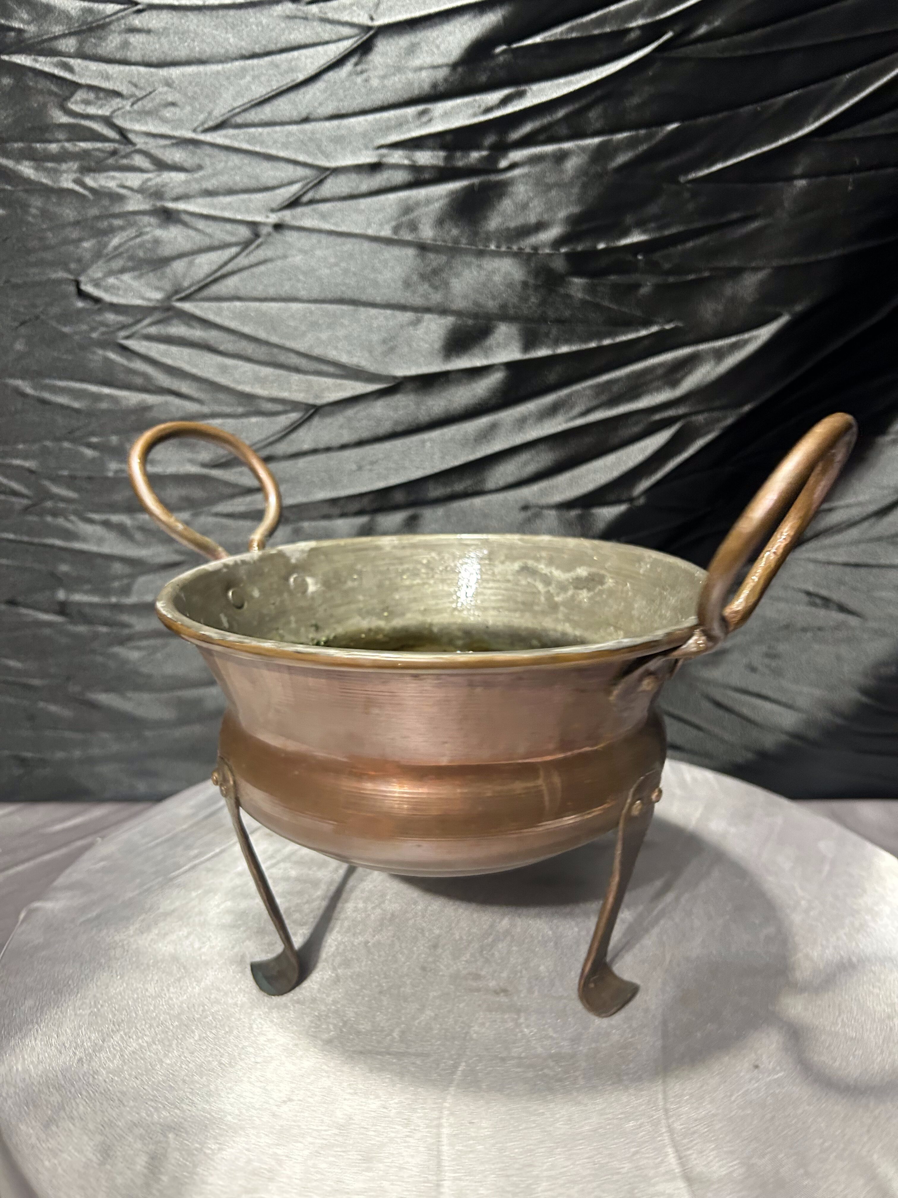 Miedziany kwietnik na trzech nogach z ozdobnymi uszami – vintage