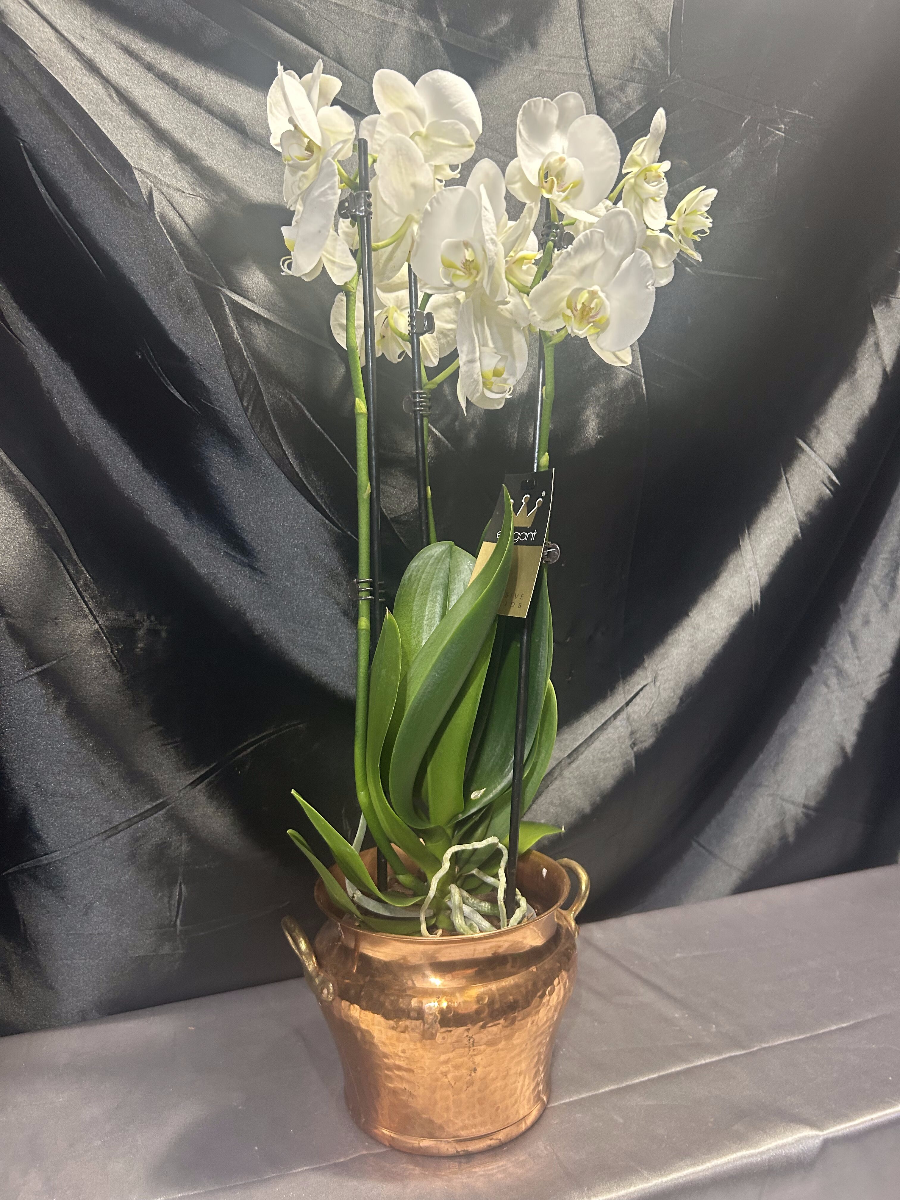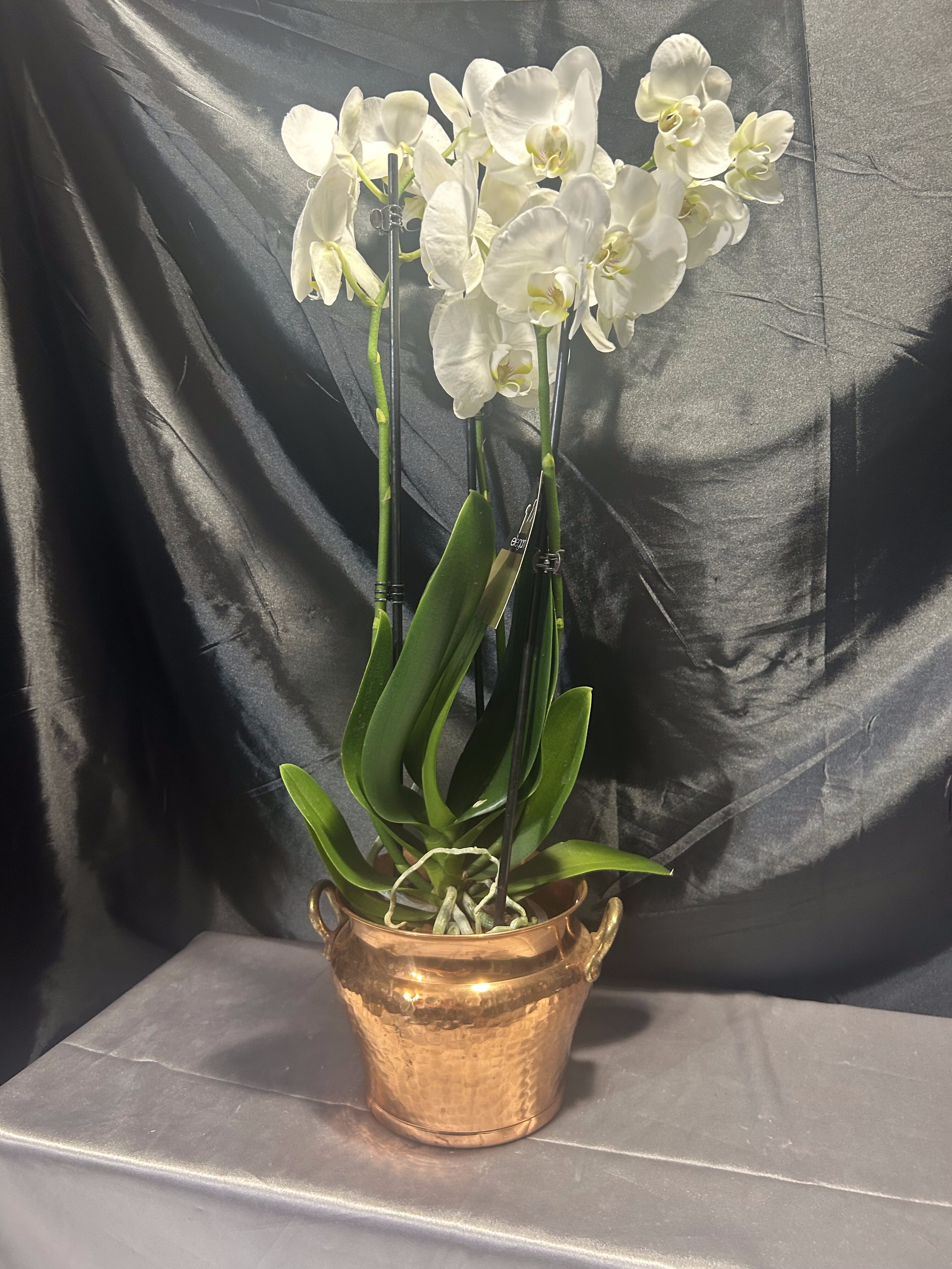 Storczyki widoczne na zdjęciu nie są częścią oferty – pełnią funkcję poglądową, ukazując, jak efektownie prezentuje się kwietnik z rośliną.