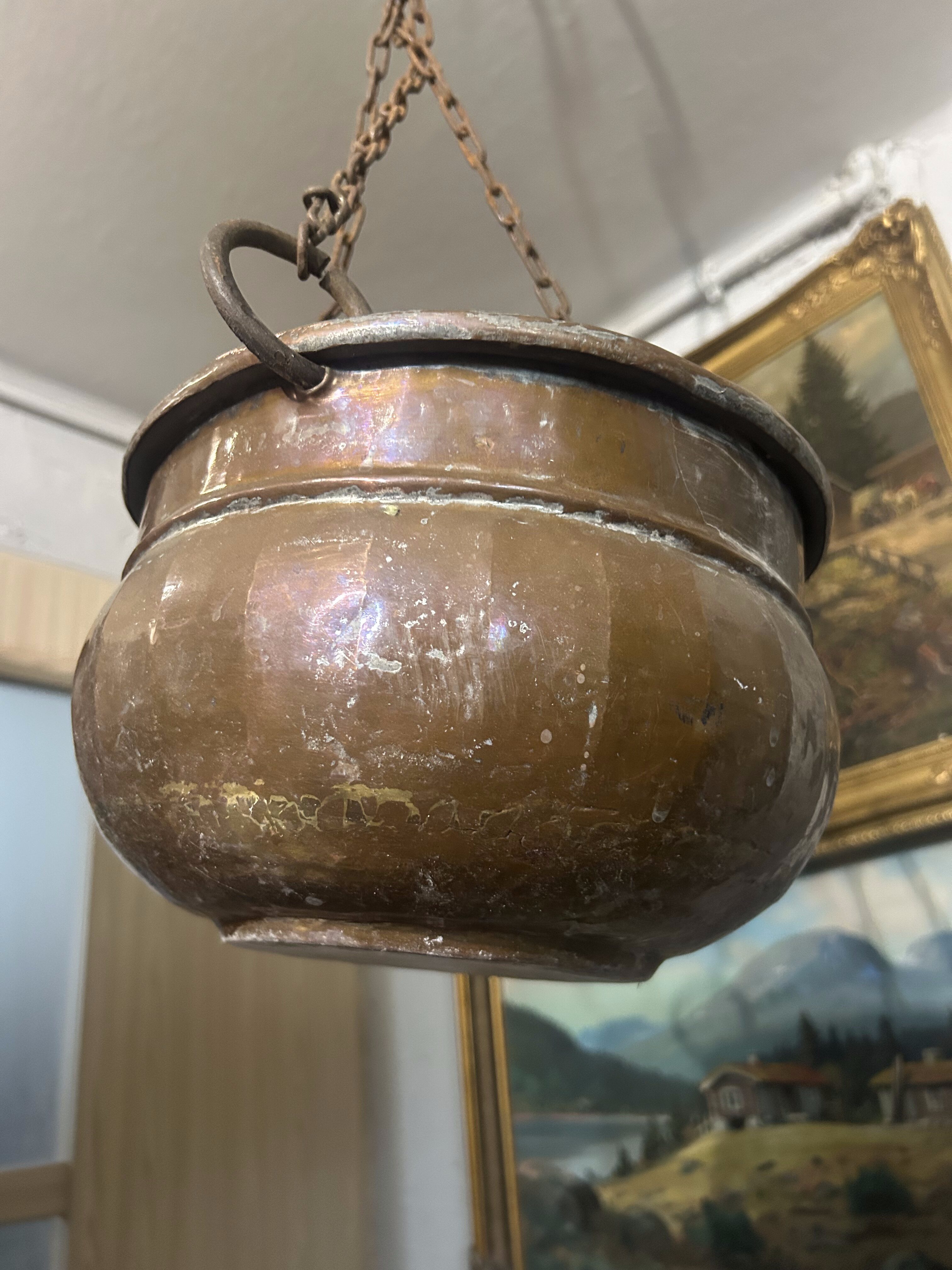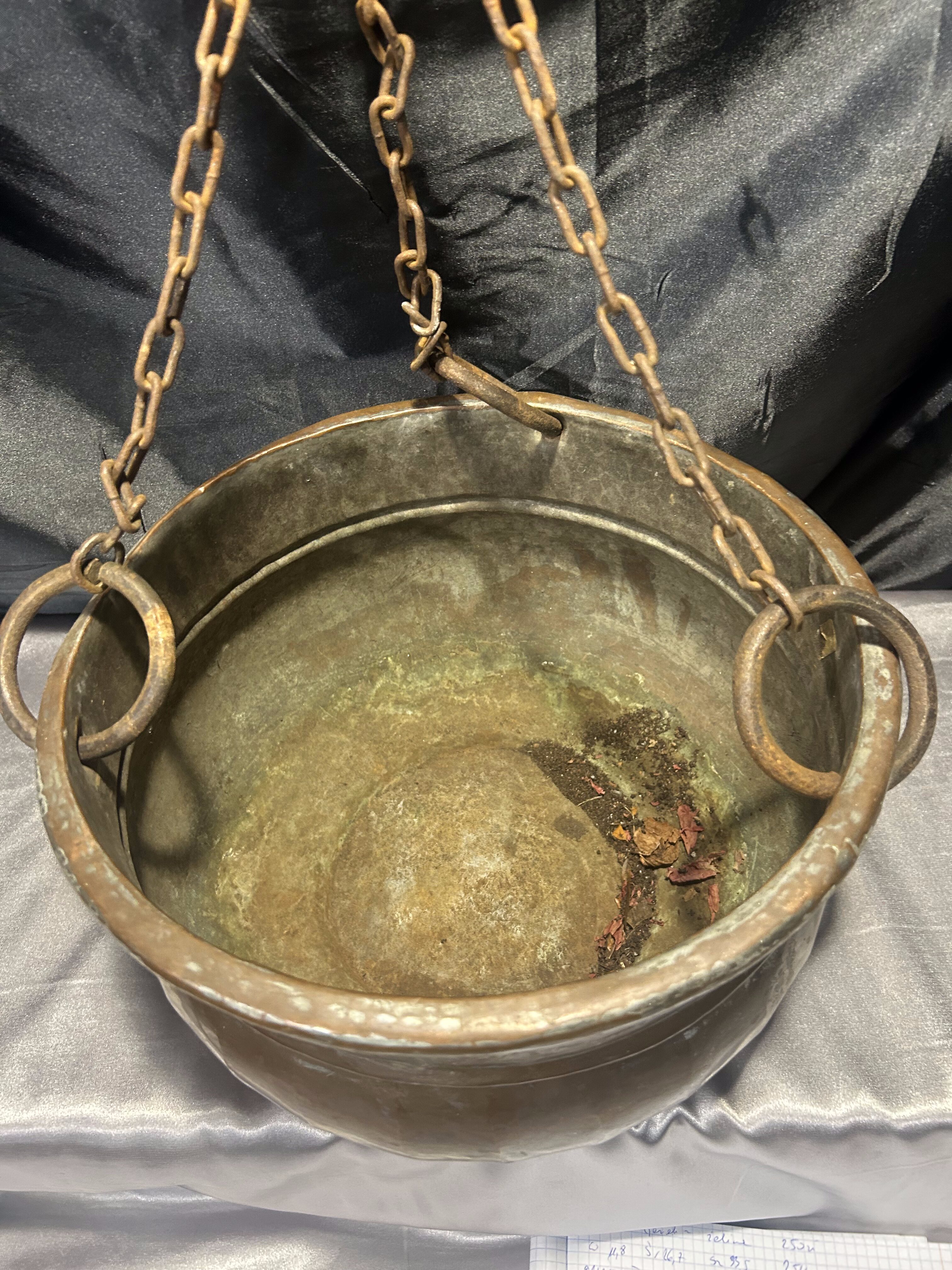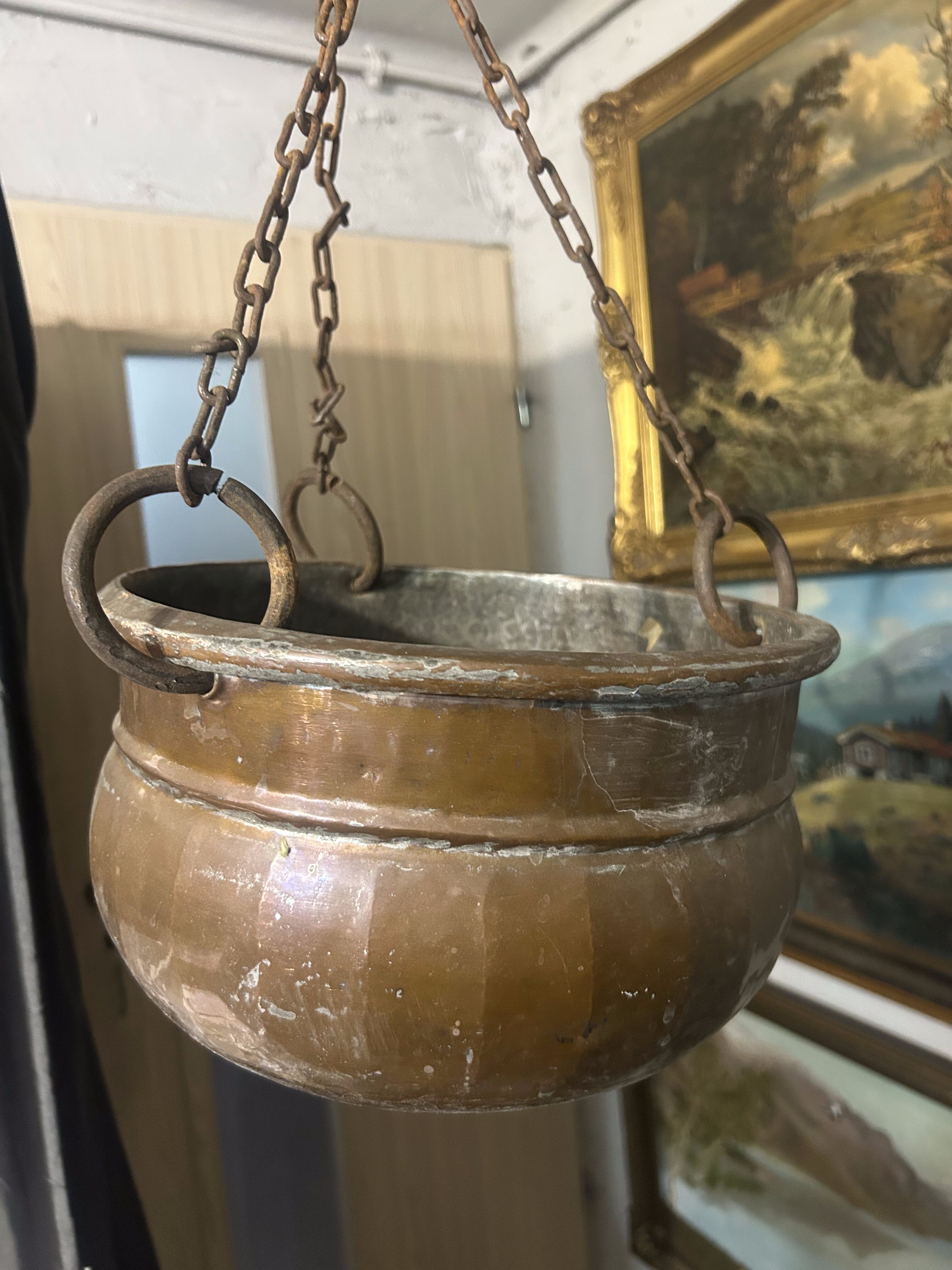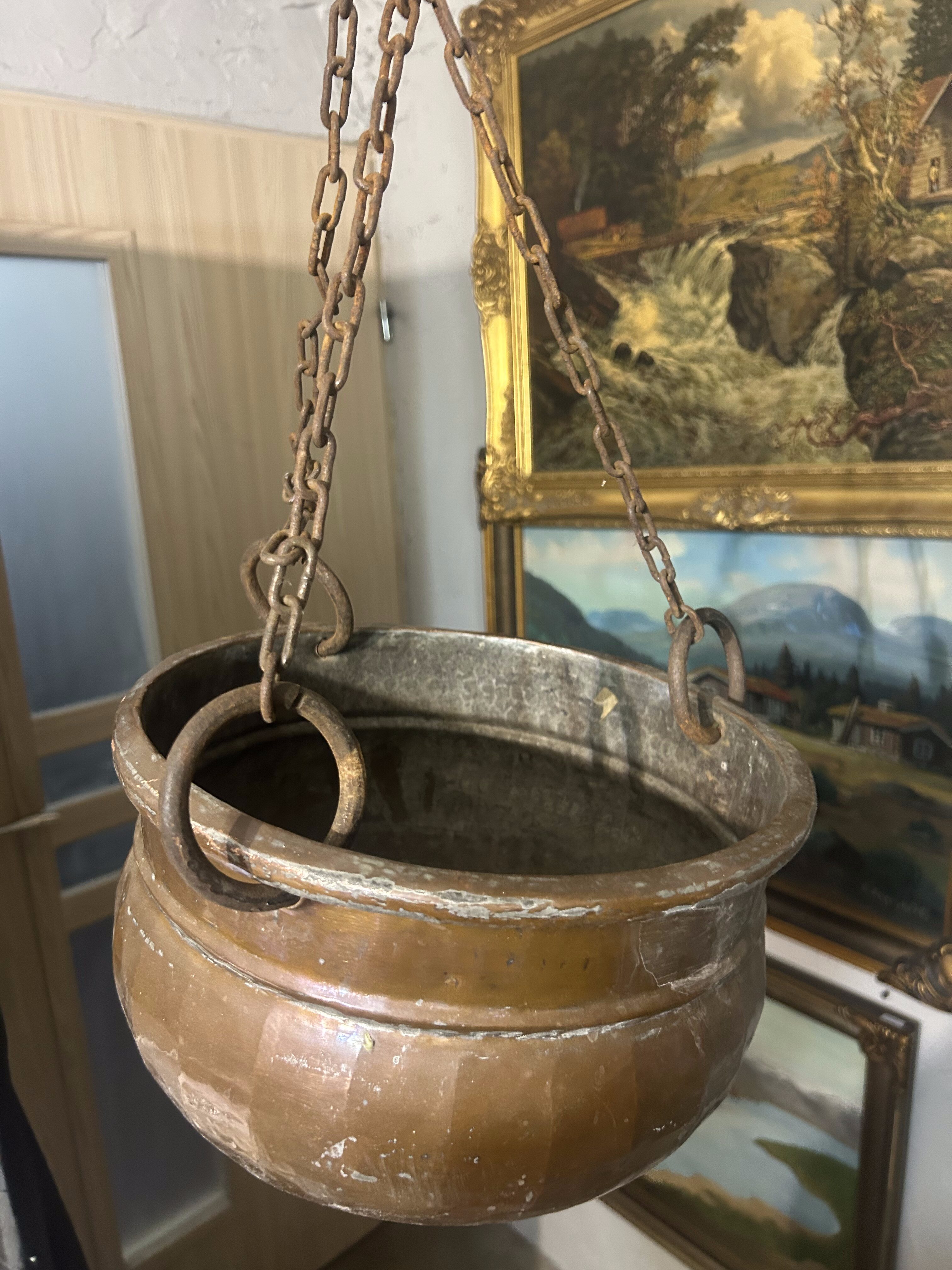 Oryginalny wiszący kwietnik miedziany o klasycznej, zaokrąglonej formie, zawieszony na kutym, solidnym łańcuchu zakończonym hakiem. Wykonany z miedzi, z widoczną naturalną patyną i śladami użytkowania, co nadaje mu autentycznego, rustykalnego charakteru.