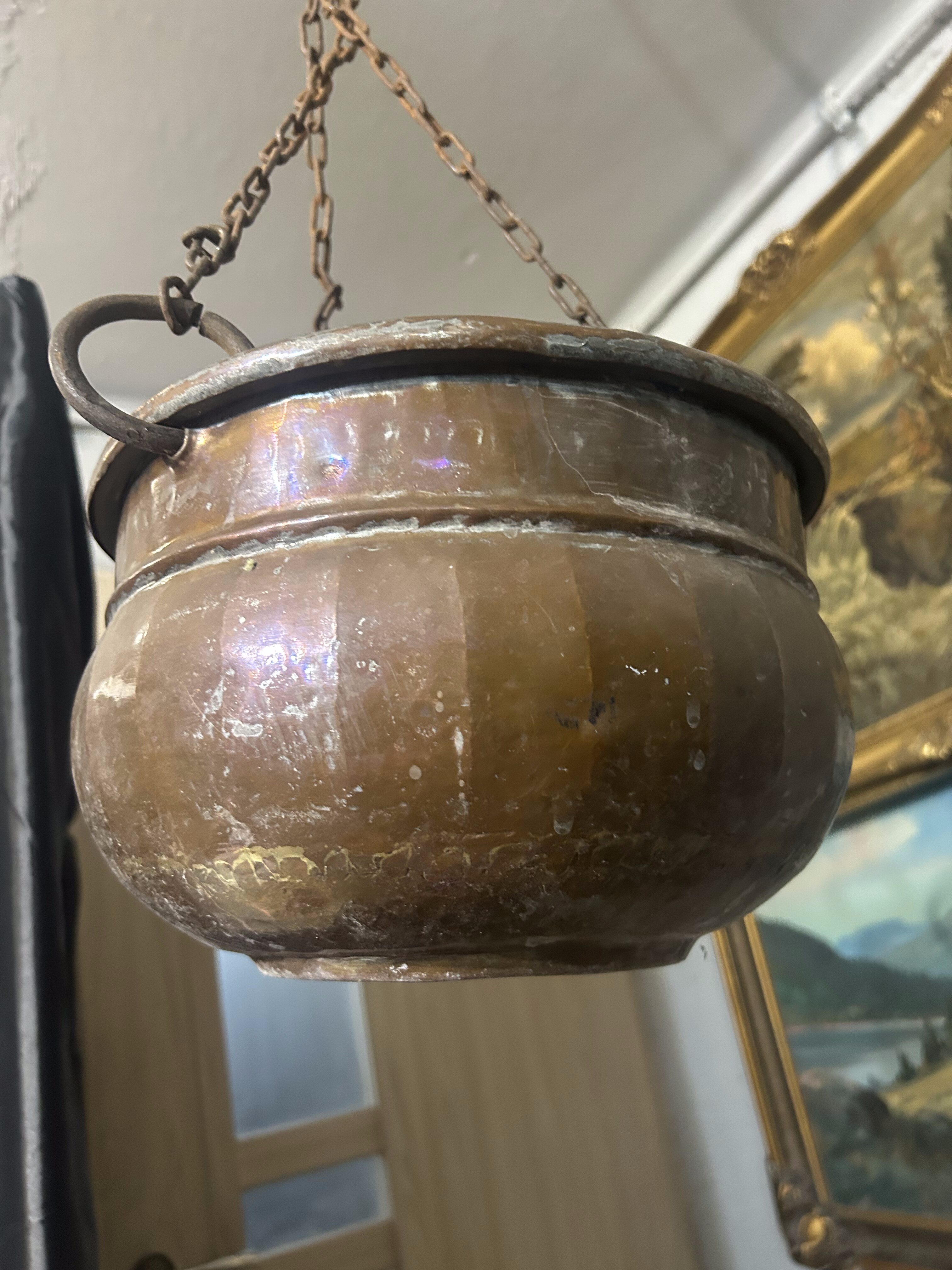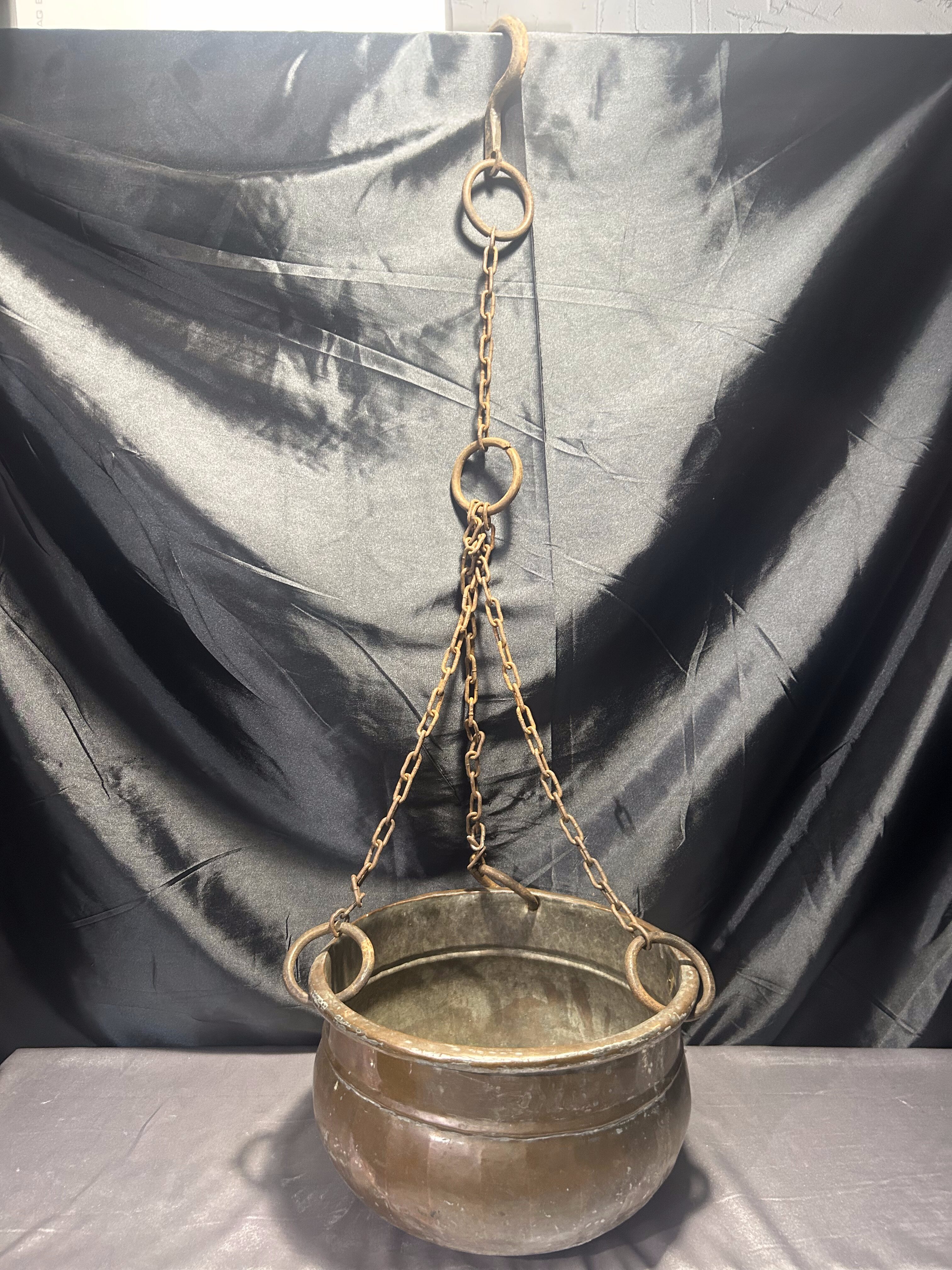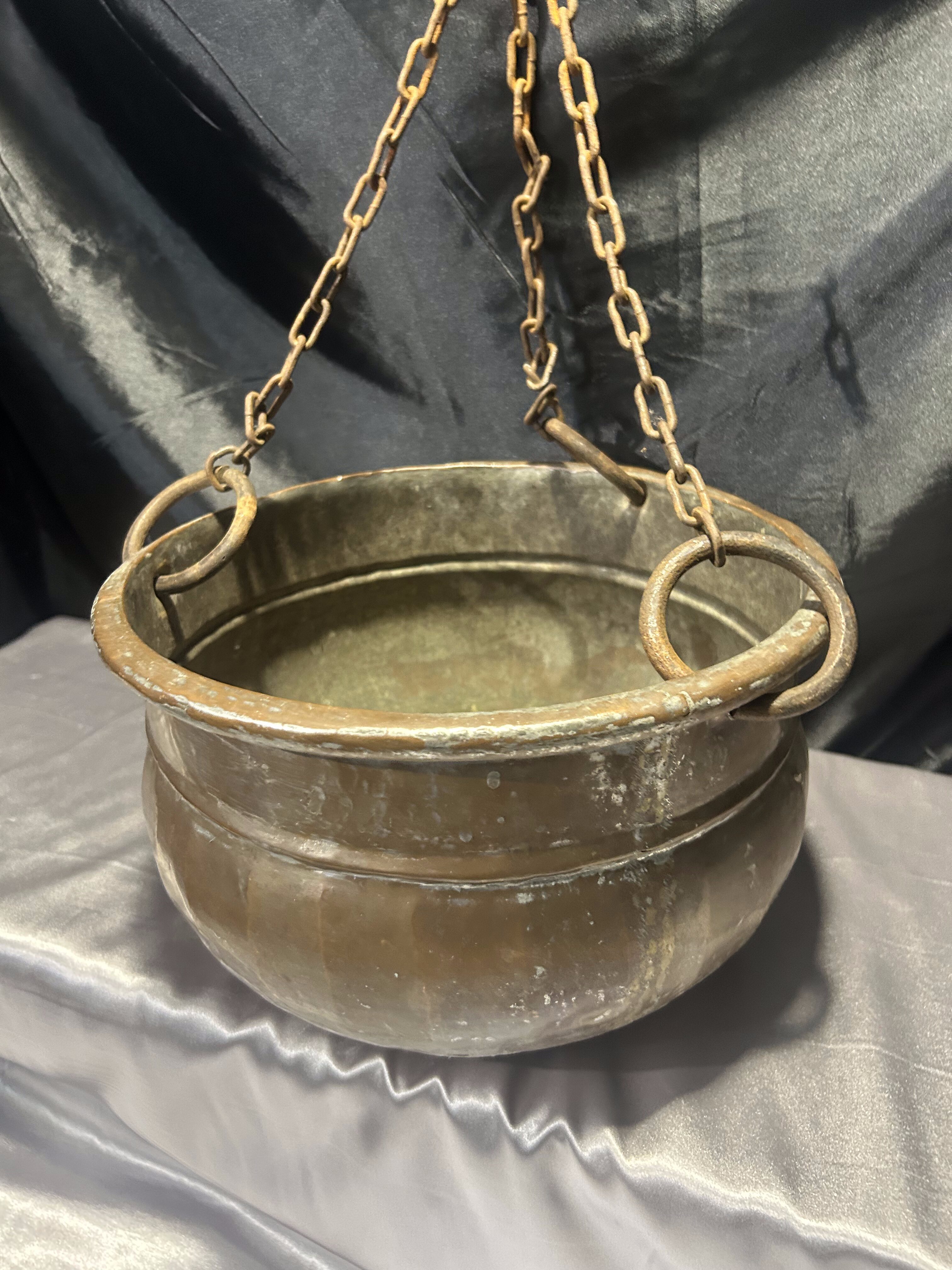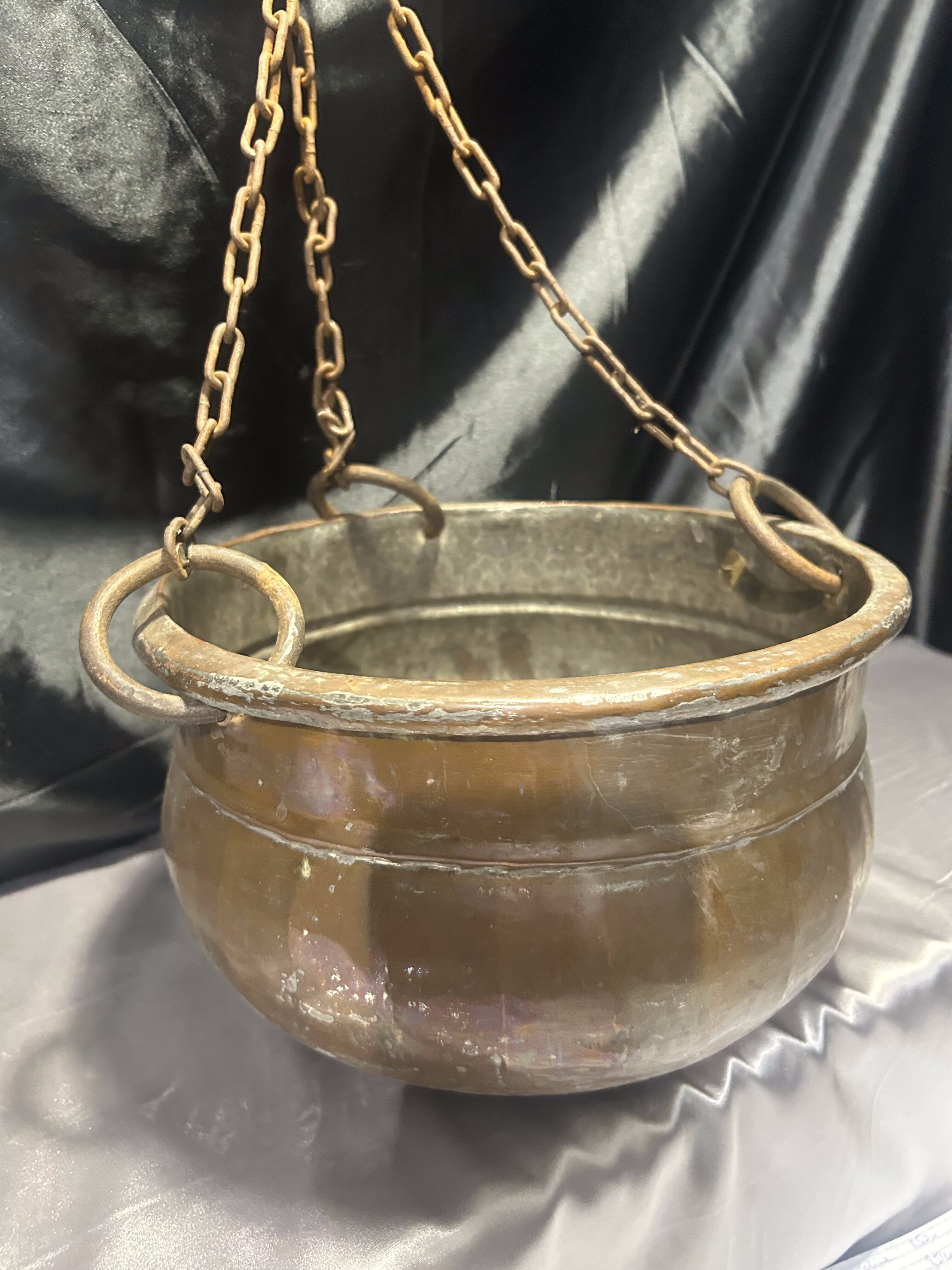 Oryginalny wiszący kwietnik miedziany o klasycznej, zaokrąglonej formie, zawieszony na kutym, solidnym łańcuchu zakończonym hakiem. Wykonany z miedzi, z widoczną naturalną patyną i śladami użytkowania, co nadaje mu autentycznego, rustykalnego charakteru.