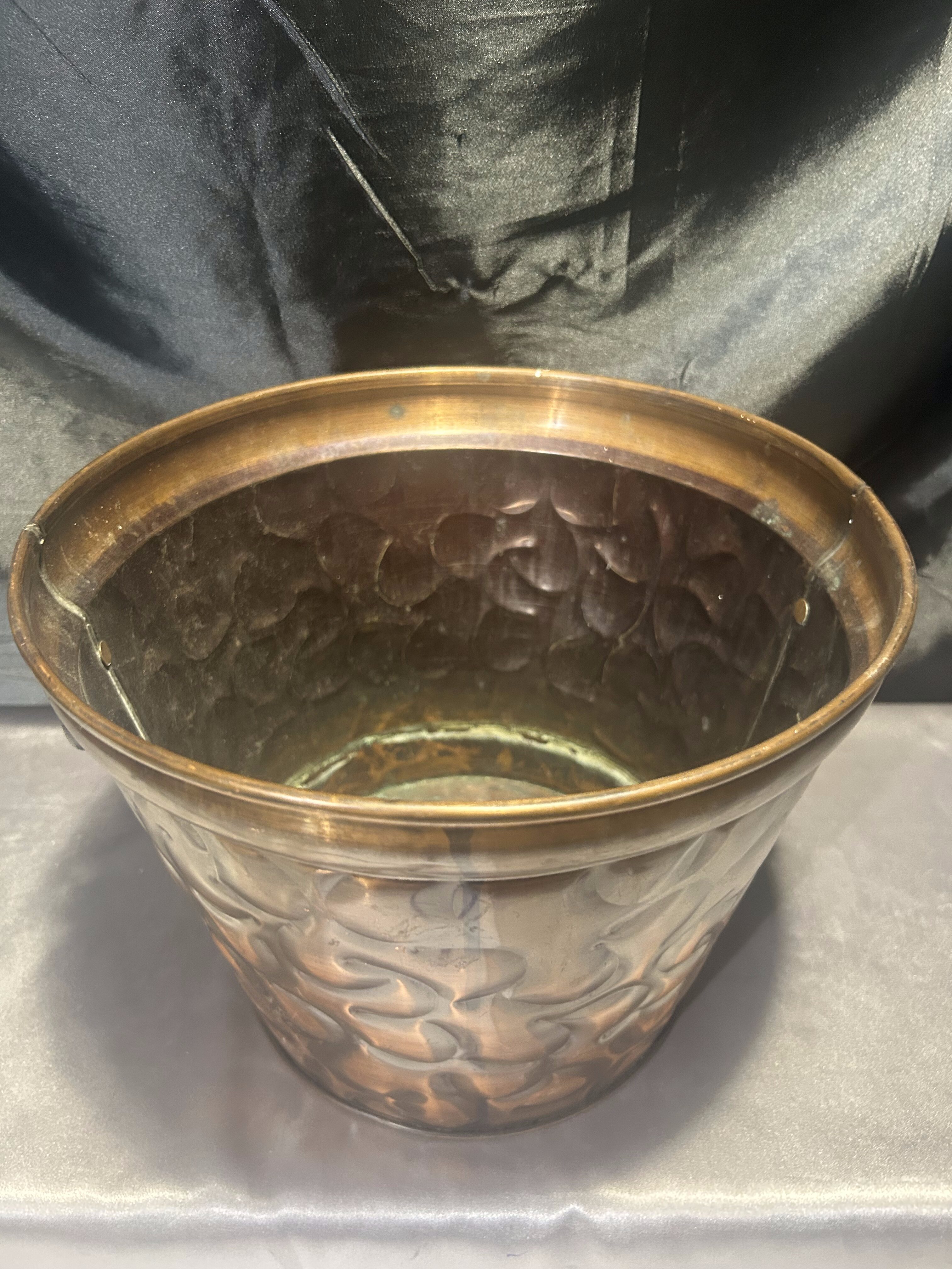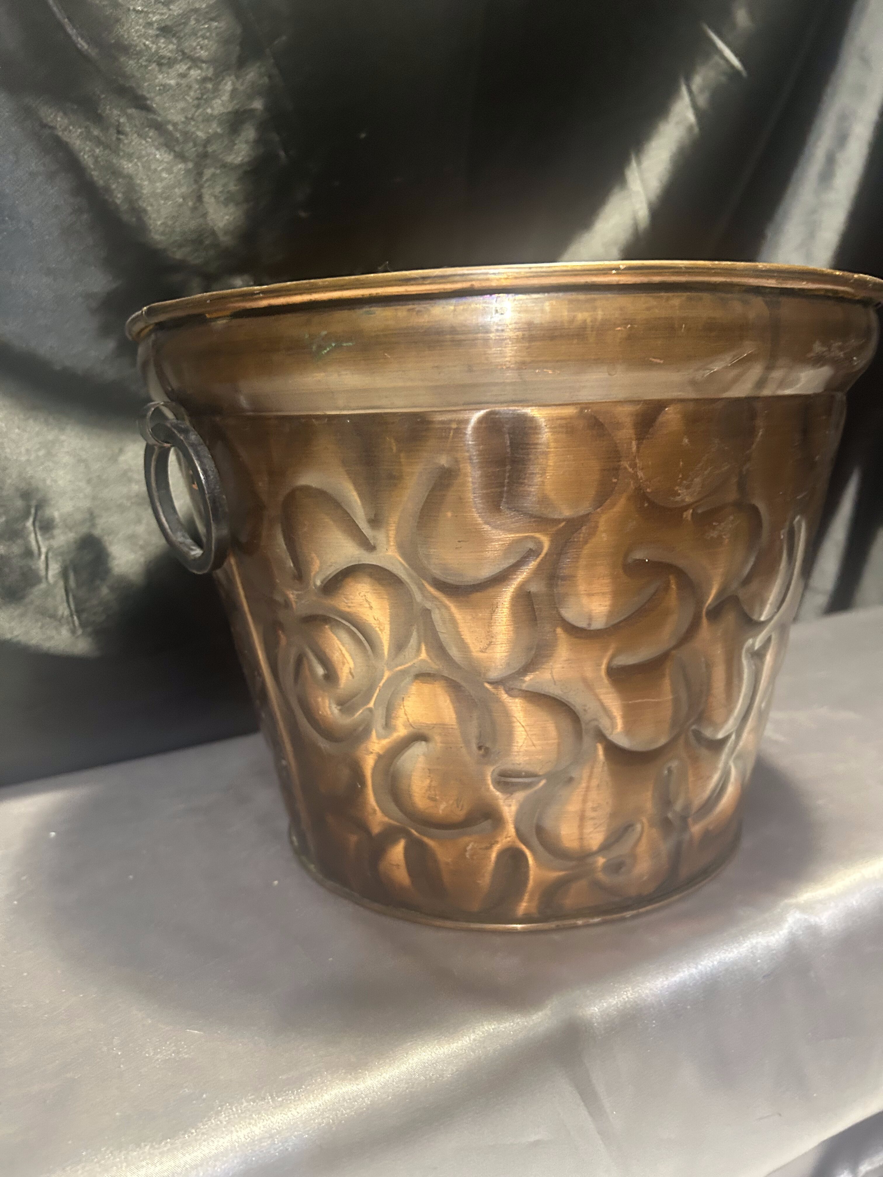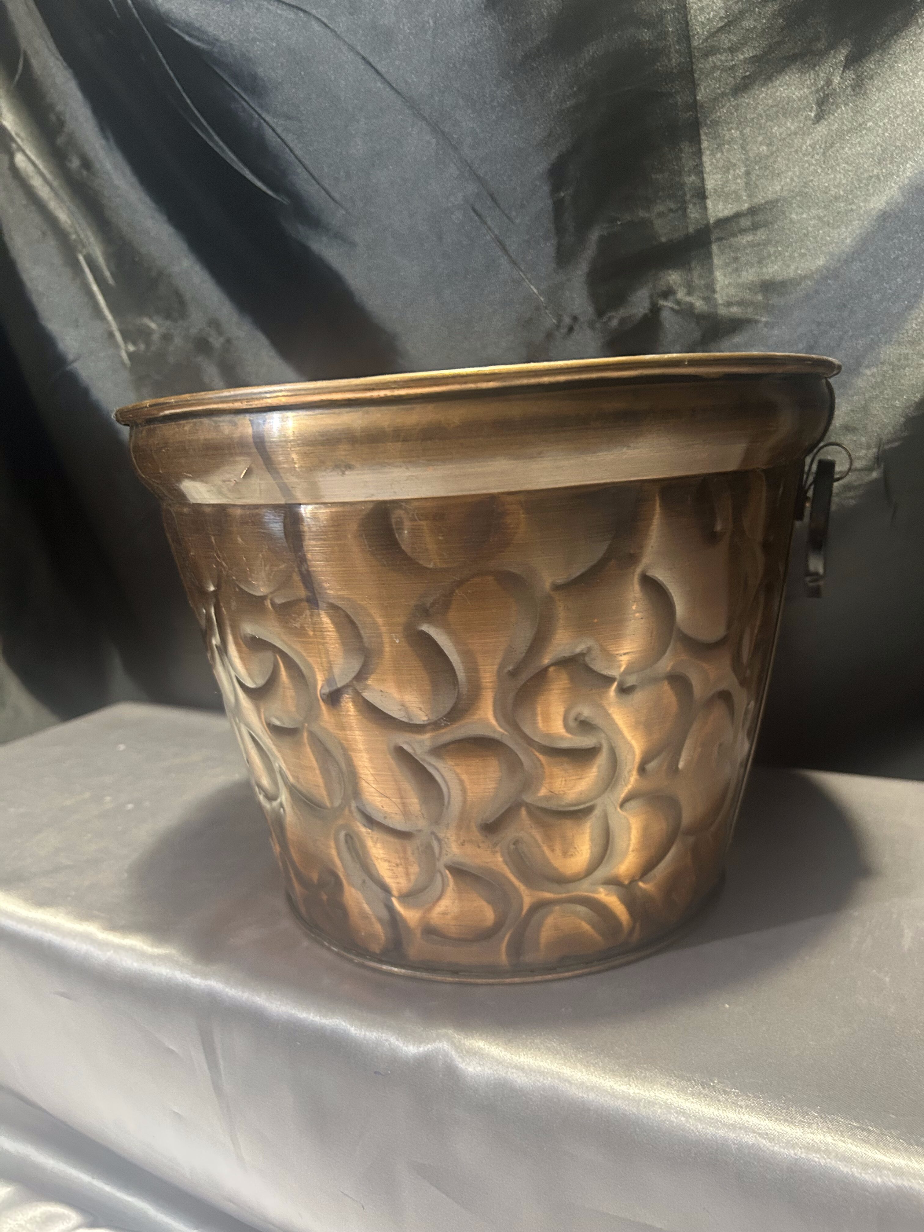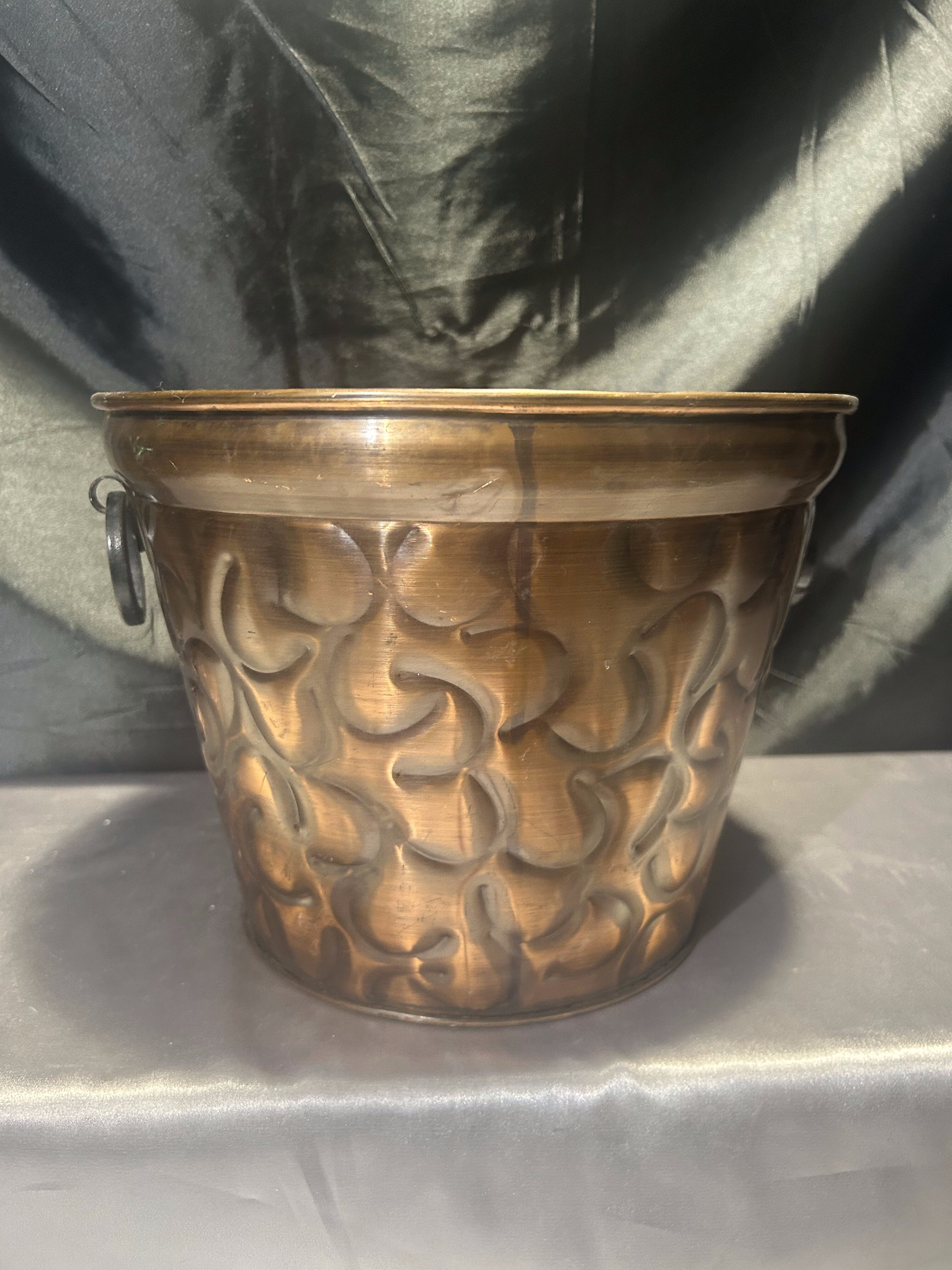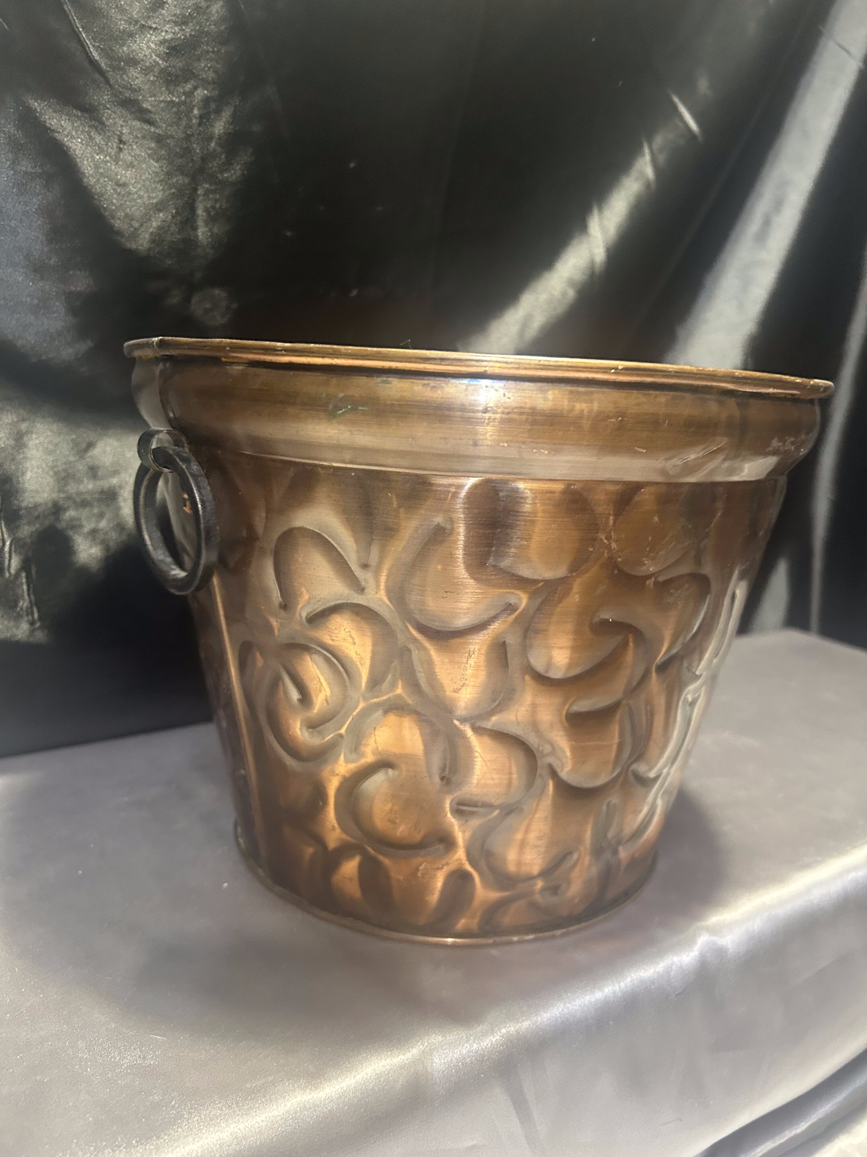 Na sprzedaż duży, elegancki miedziany kwietnik, który doskonale sprawdzi się jako osłonka na doniczkę lub dekoracyjny element wnętrza i ogrodu. Wyróżnia się pięknymi zdobieniami oraz kutymi kółeczkami po bokach, pełniącymi funkcję uchwytów. Solidne wykonanie oraz naturalna patyna miedzi nadają mu wyjątkowego uroku.