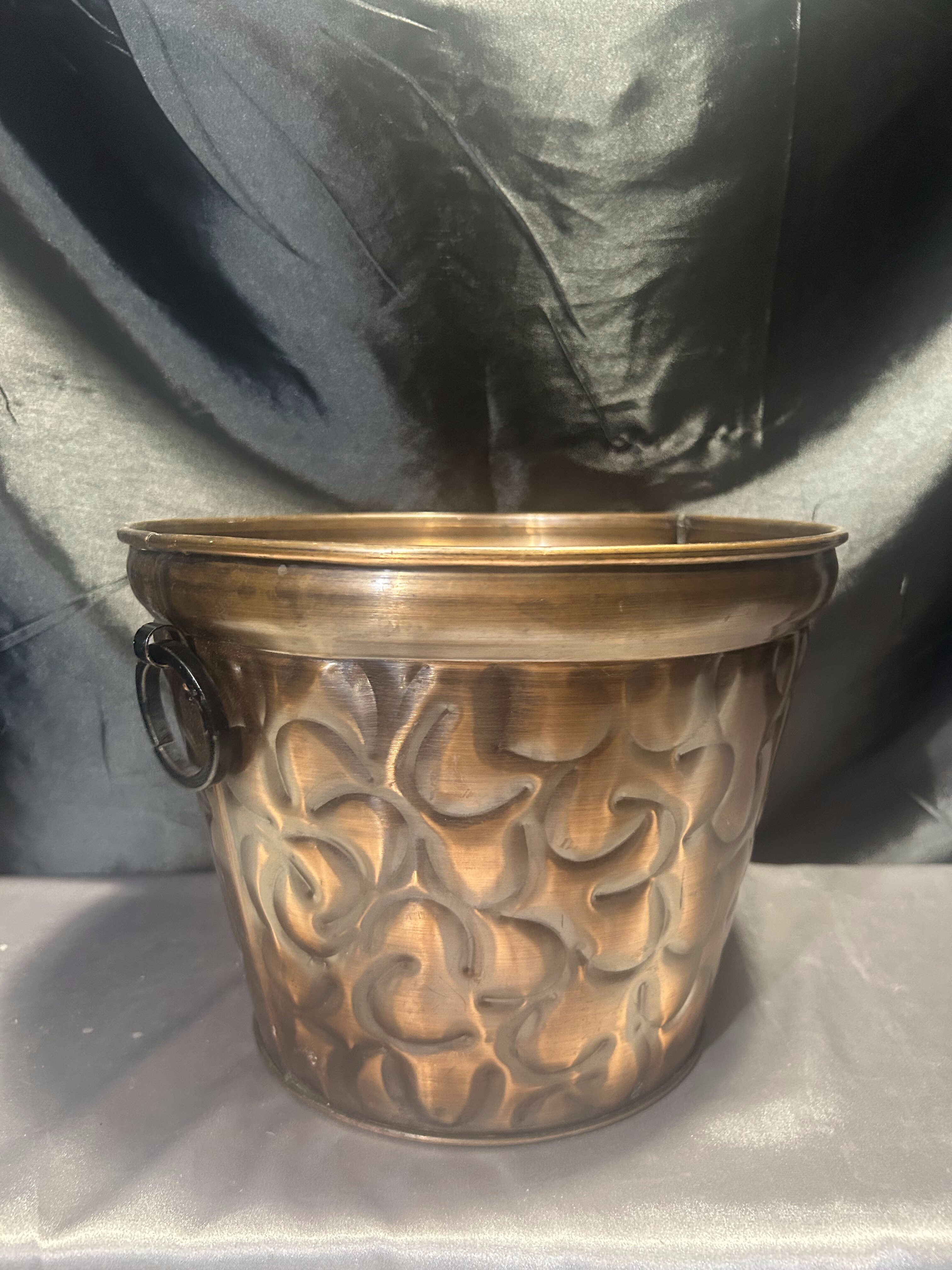 Stylowy, duży miedziany kwietnik to wyjątkowy element dekoracyjny, który doda elegancji każdej przestrzeni. Może pełnić funkcję osłonki na doniczkę, kwietnika lub dekoracyjnego pojemnika. Starannie wykonane zdobienia oraz uchwyty z kutych kółeczek podkreślają jego unikatowy charakter. Doskonały wybór dla miłośników klasycznych i rustykalnych wnętrz oraz dla kolekcjonerów miedzianych dodatków.