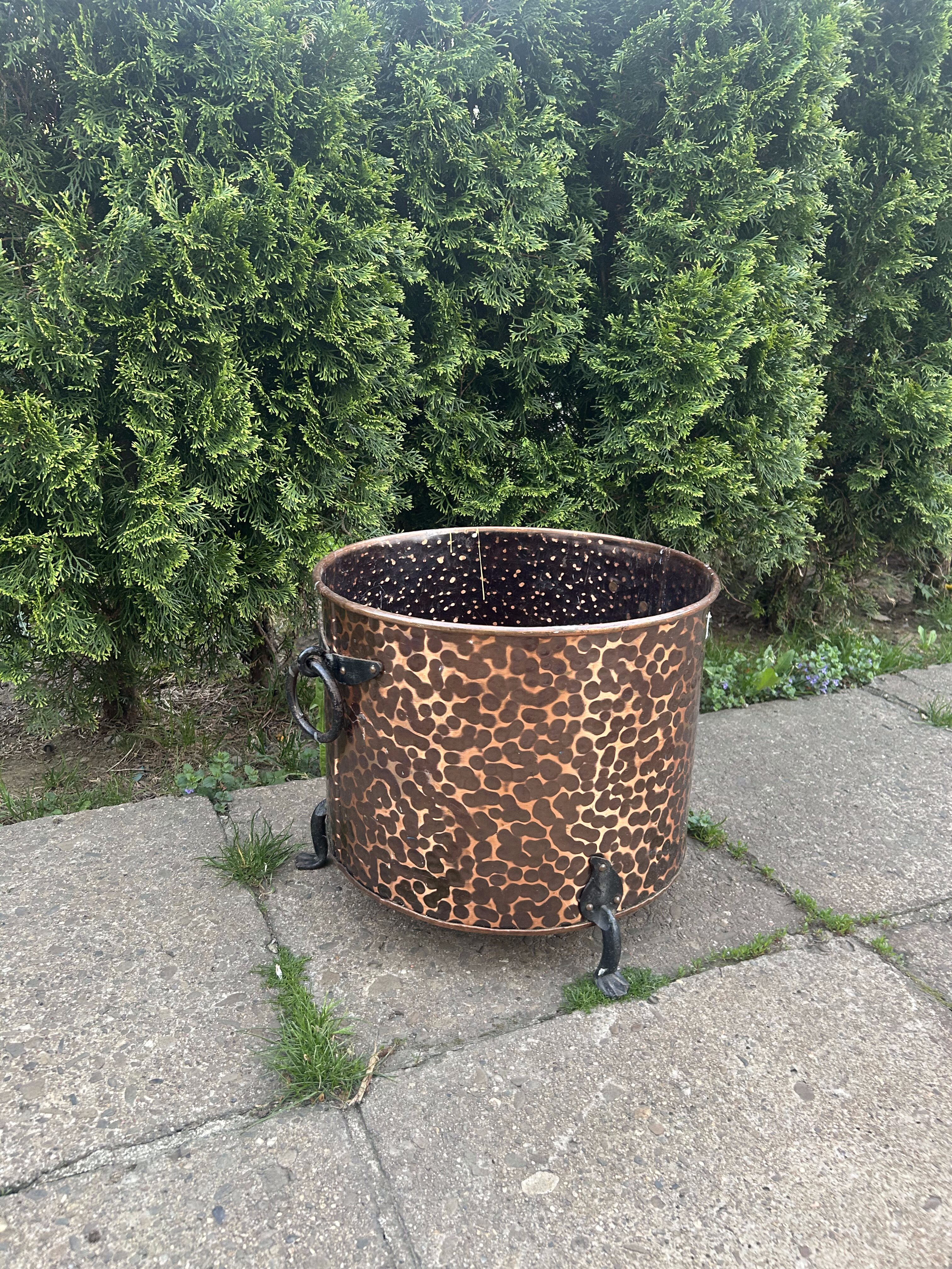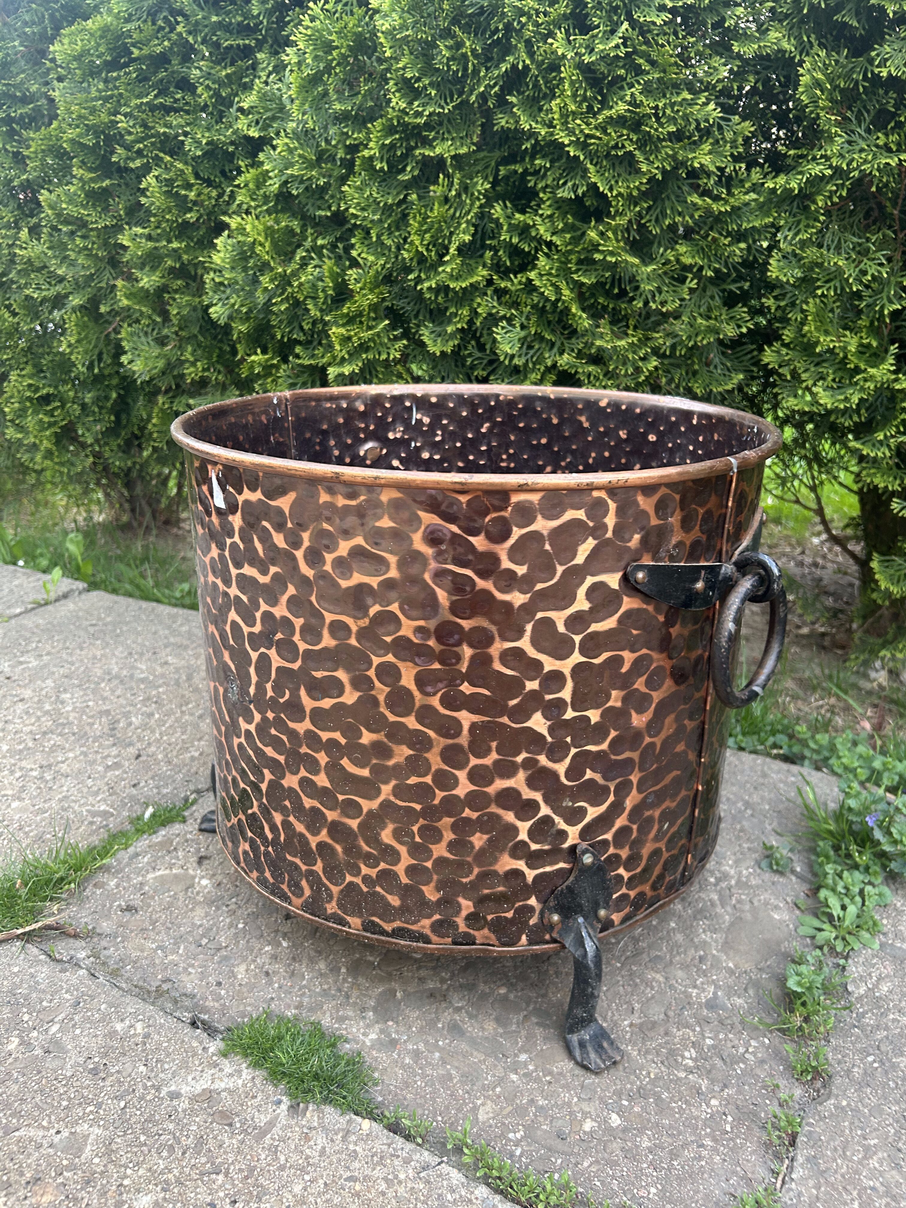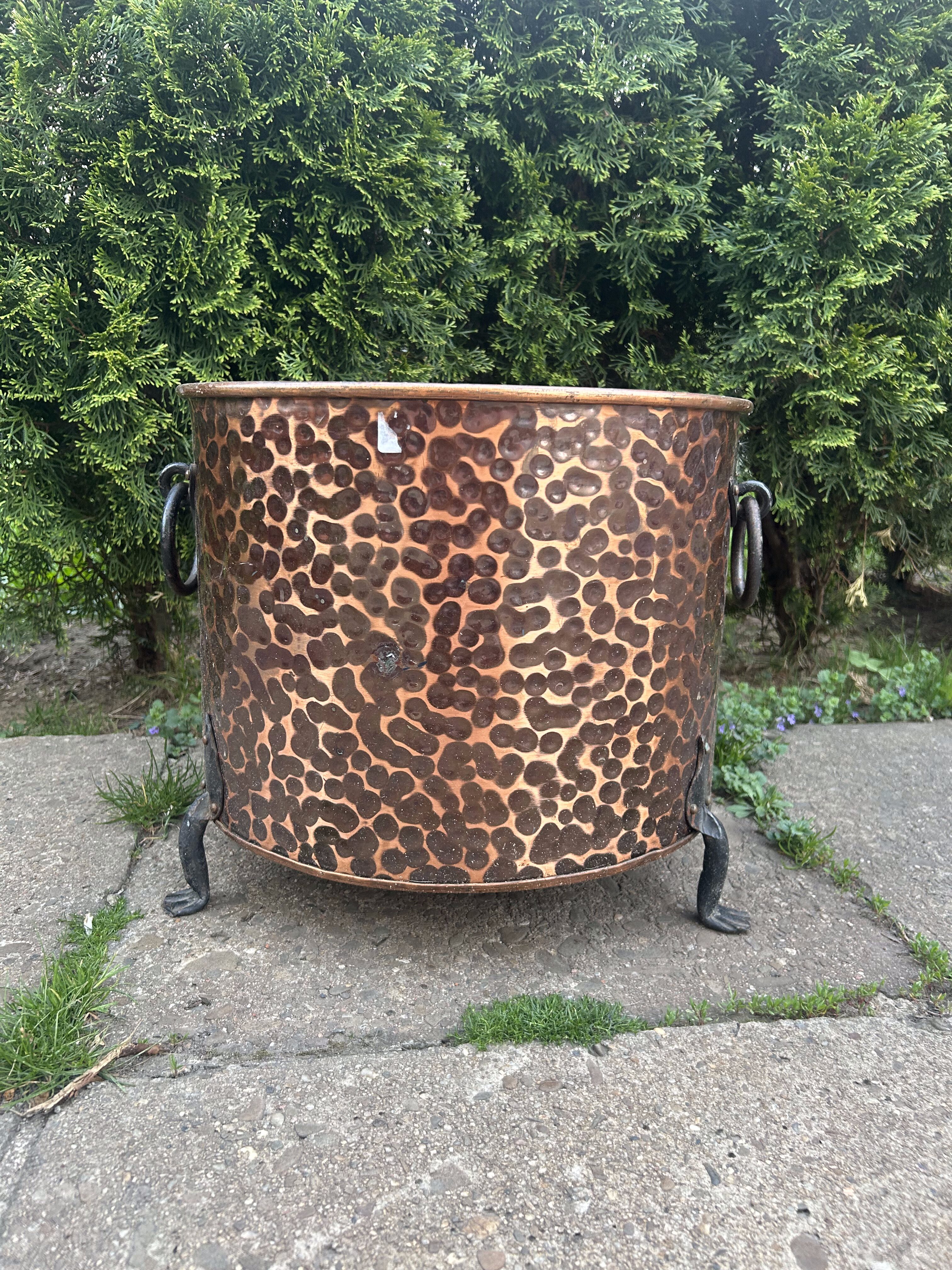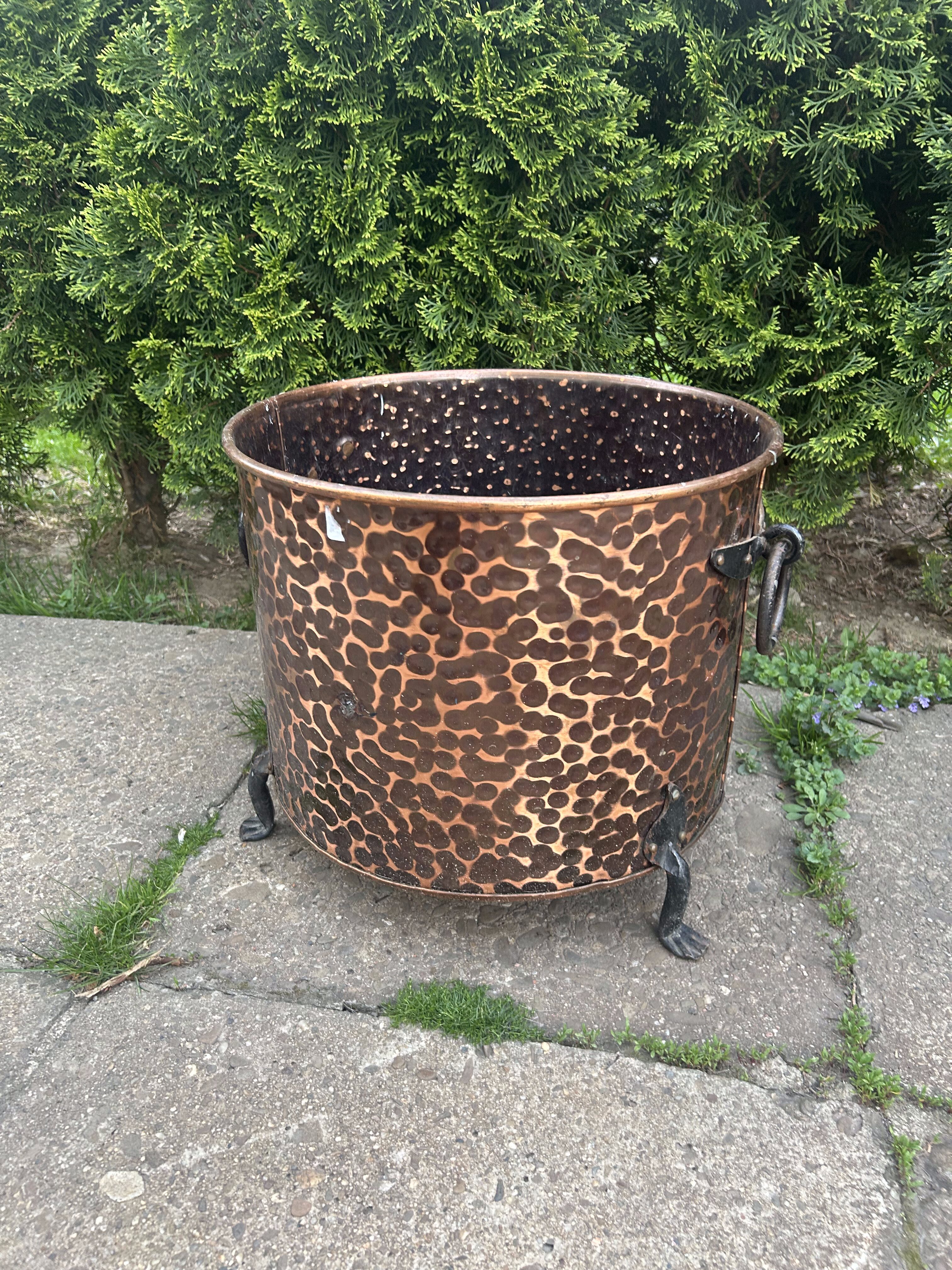 Dekoracyjny, masywny pojemnik wykonany z młotkowanej miedzi, osadzony na trzech stylizowanych kutych nogach, z ozdobnymi, kutymi uchwytami po bokach. Może pełnić rolę eleganckiej donicy, kosza na drewno przy kominku lub elementu dekoracyjnego w ogrodzie i wnętrzu. Starannie wykonany, z charakterem, idealny do wnętrz rustykalnych i klasycznych.