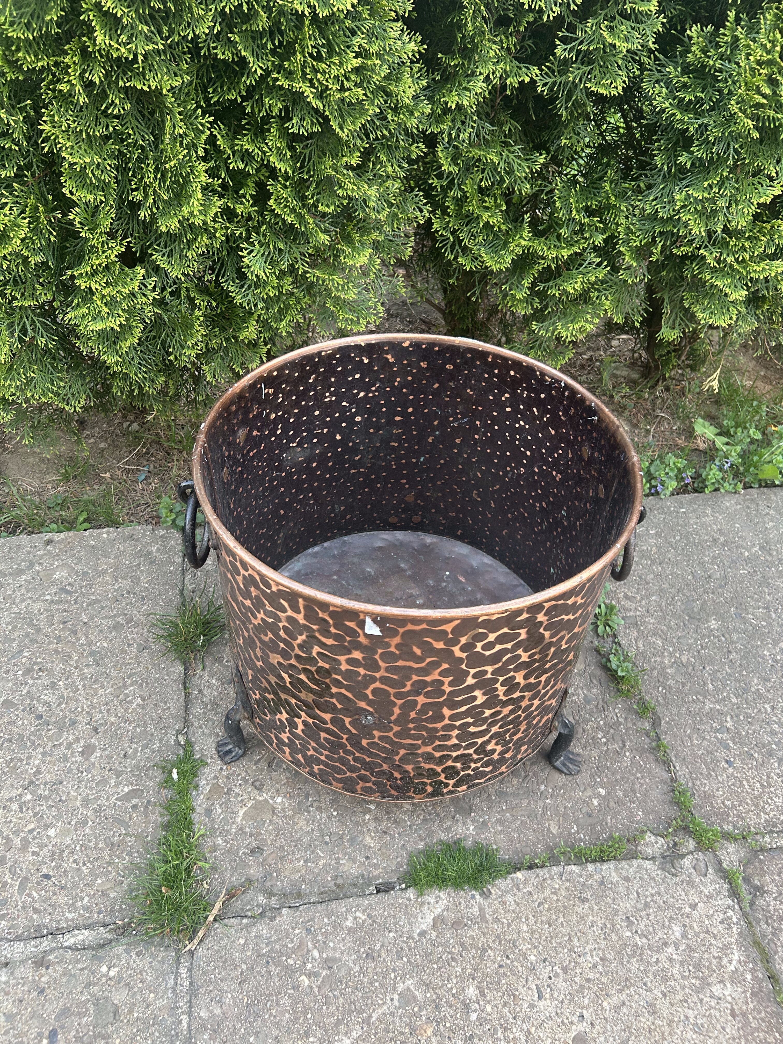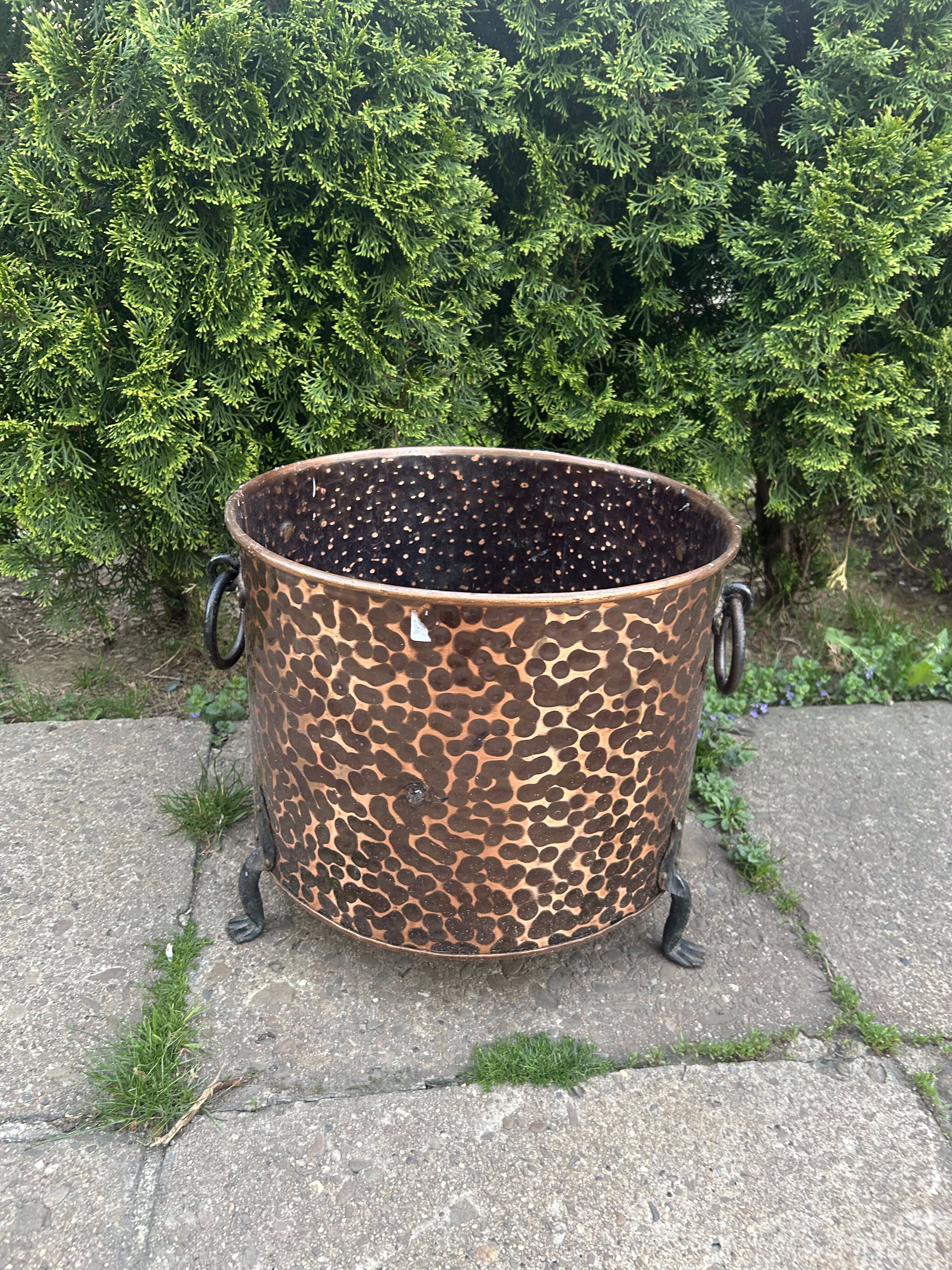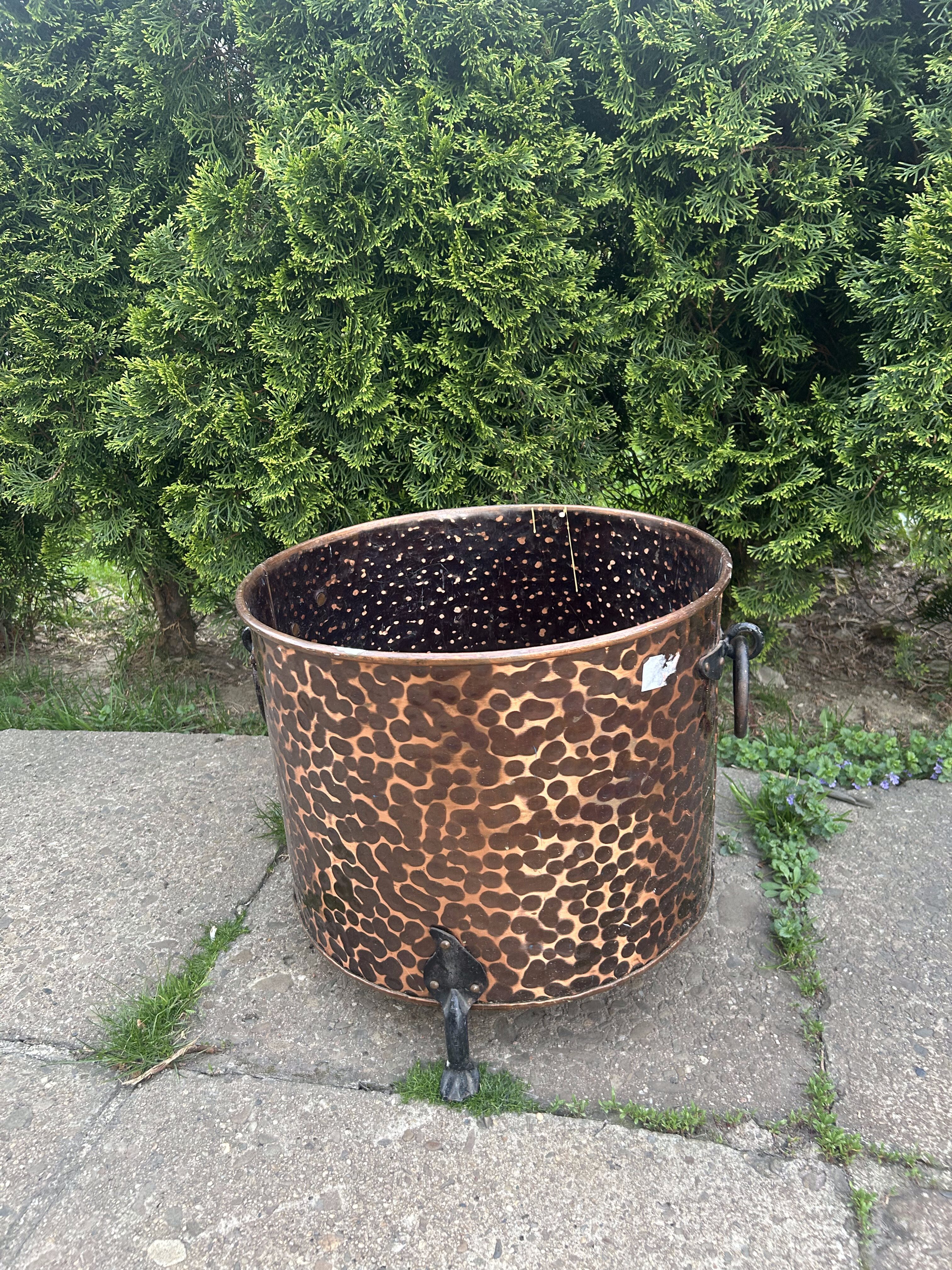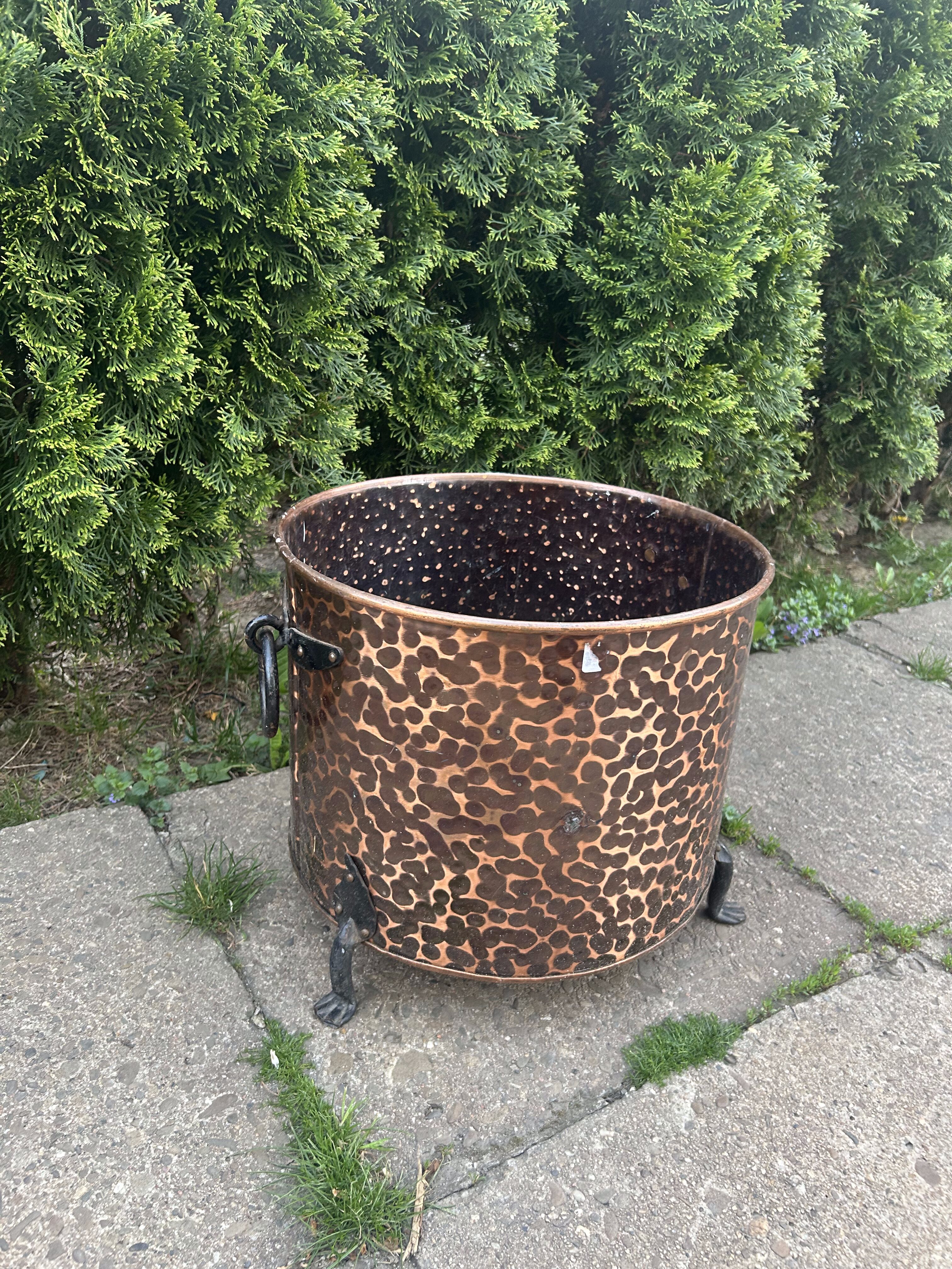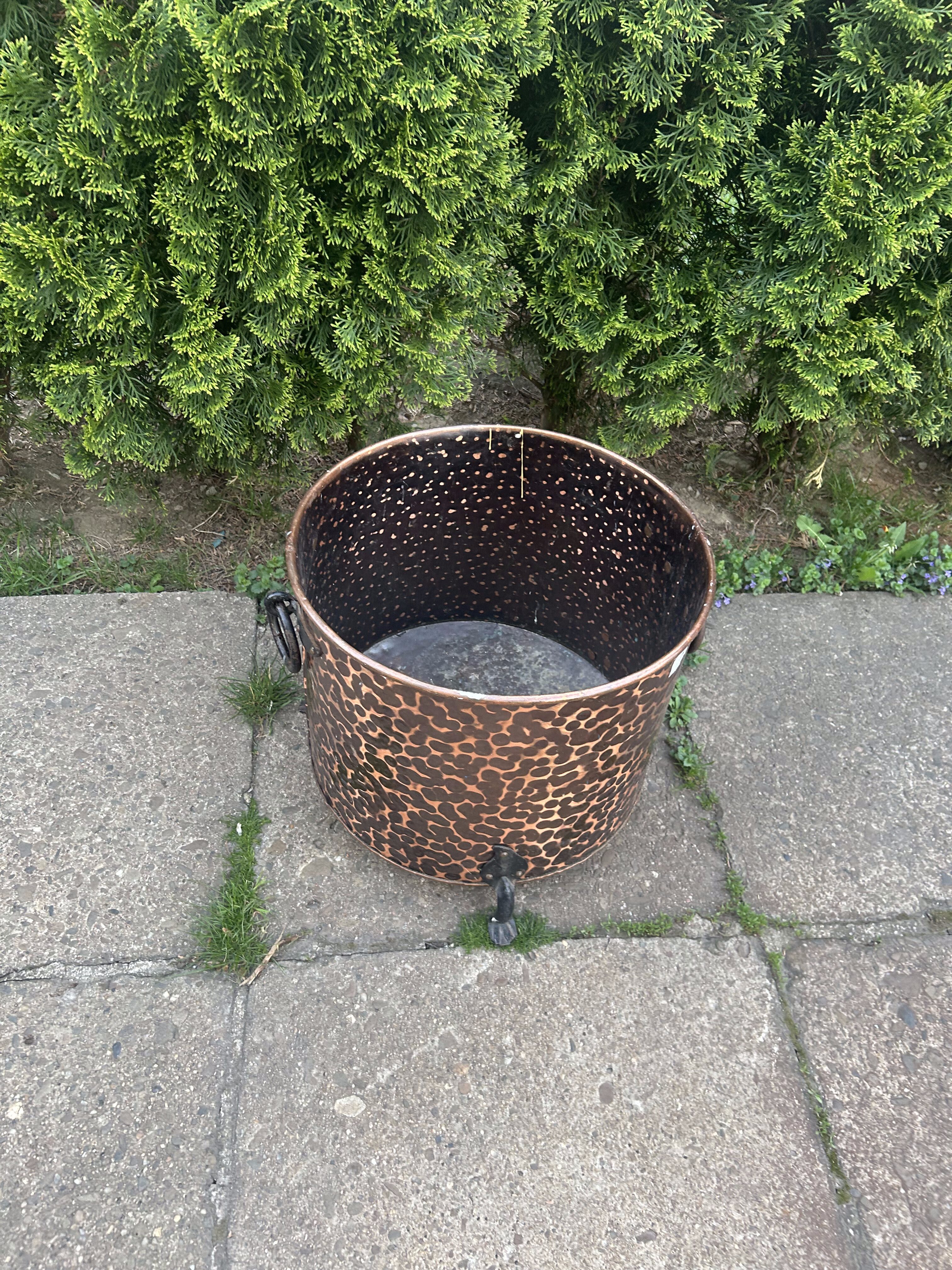 Dekoracyjny, masywny pojemnik wykonany z młotkowanej miedzi, osadzony na trzech stylizowanych kutych nogach, z ozdobnymi, kutymi uchwytami po bokach. Może pełnić rolę eleganckiej donicy, kosza na drewno przy kominku lub elementu dekoracyjnego w ogrodzie i wnętrzu. Starannie wykonany, z charakterem, idealny do wnętrz rustykalnych i klasycznych.