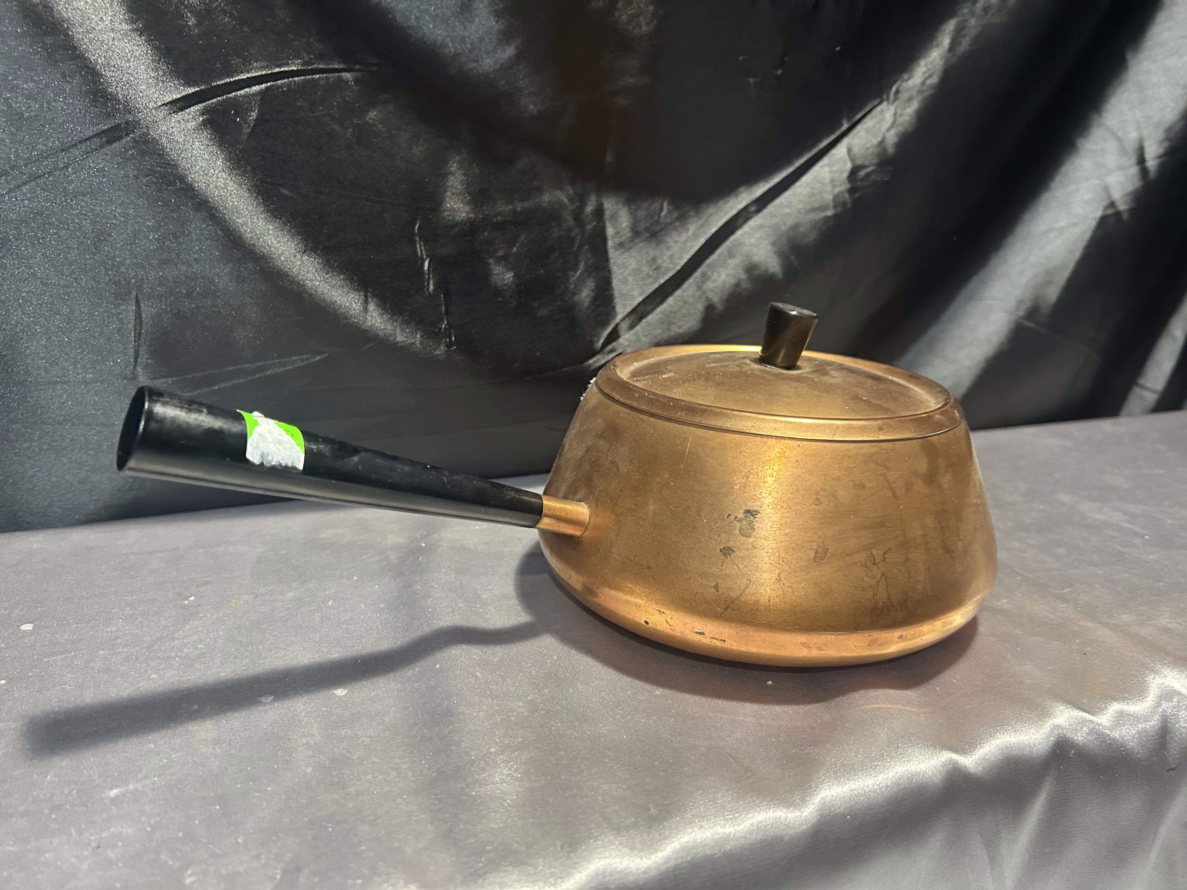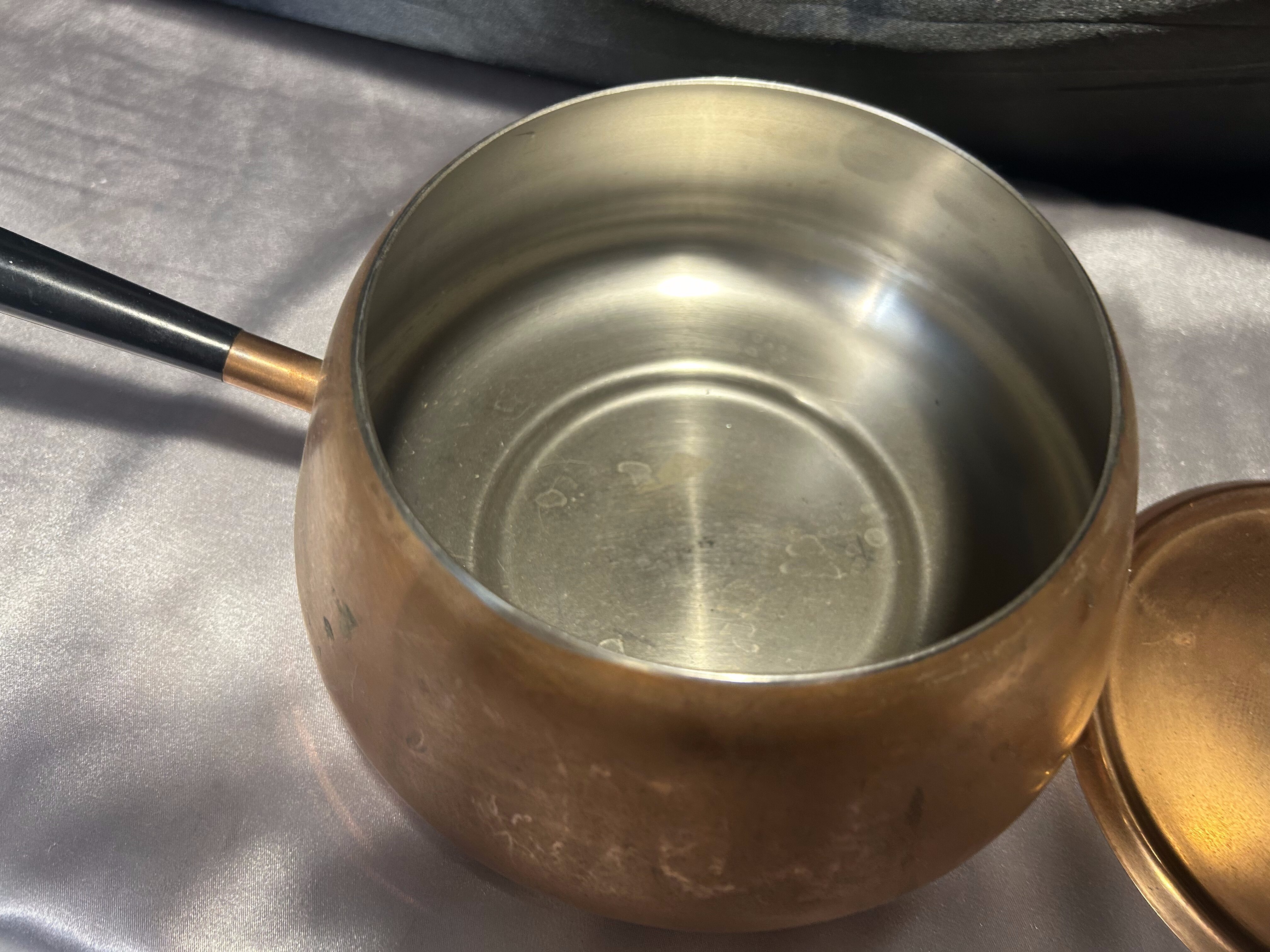 - Kolor: miedziany z czarnym wykończeniem rączki i uchwytu pokrywki
