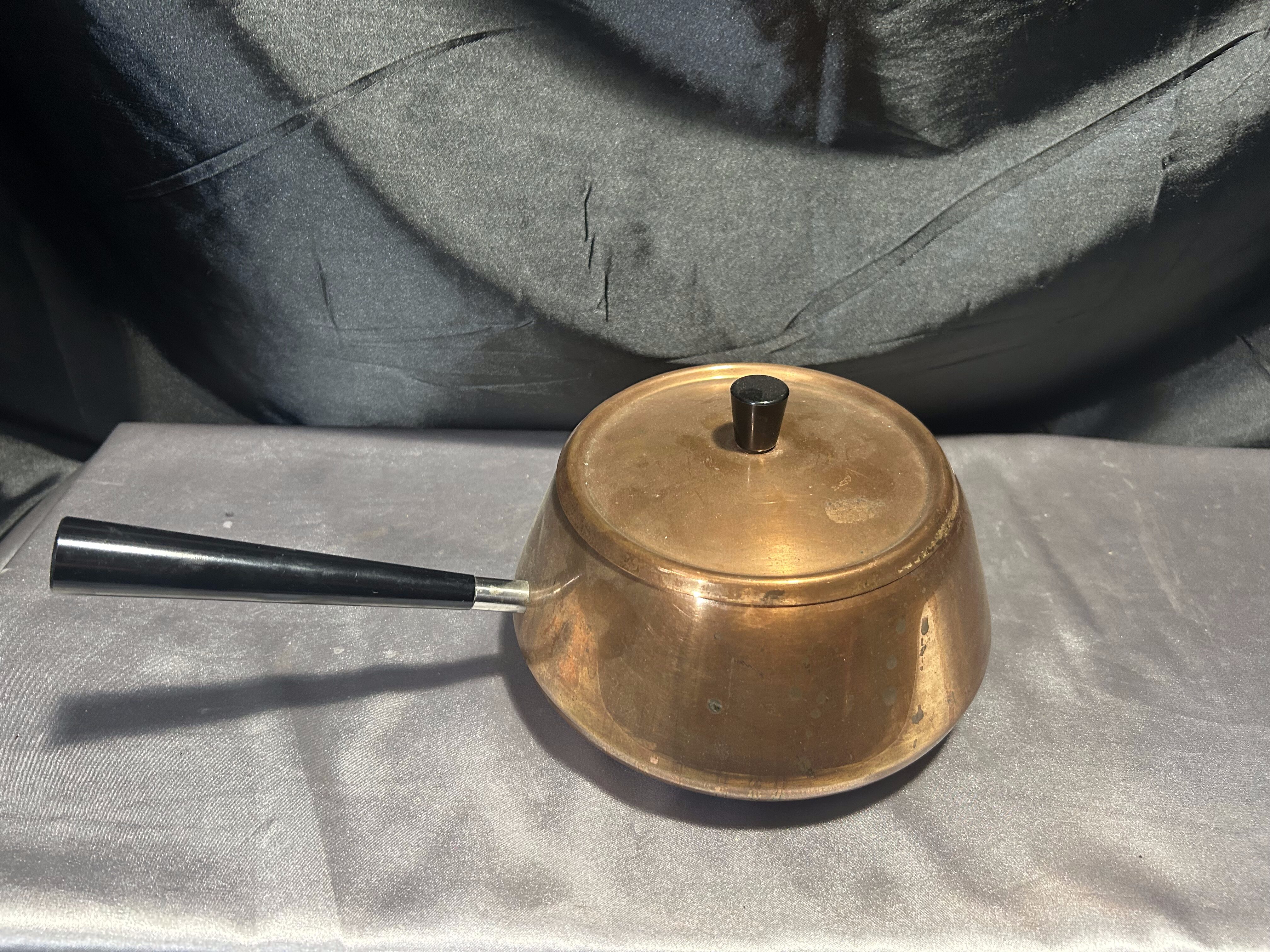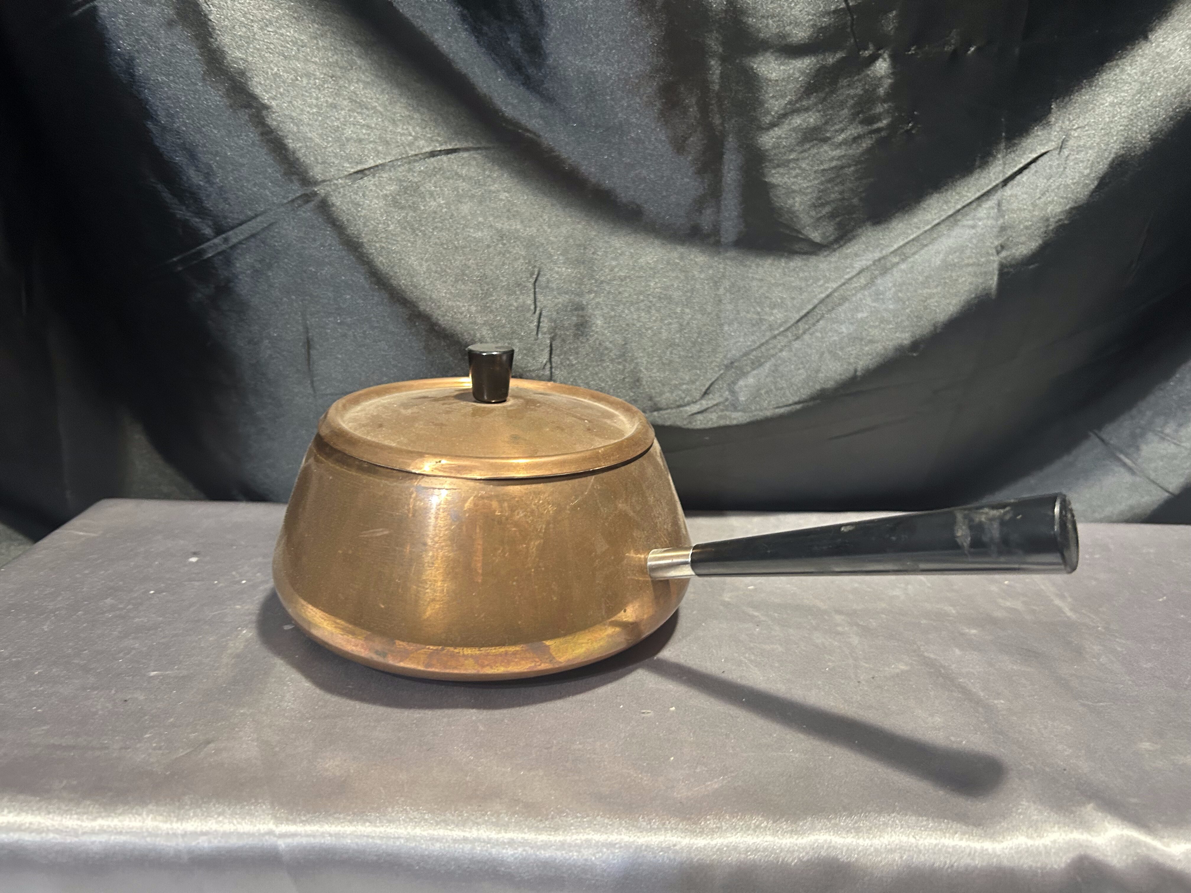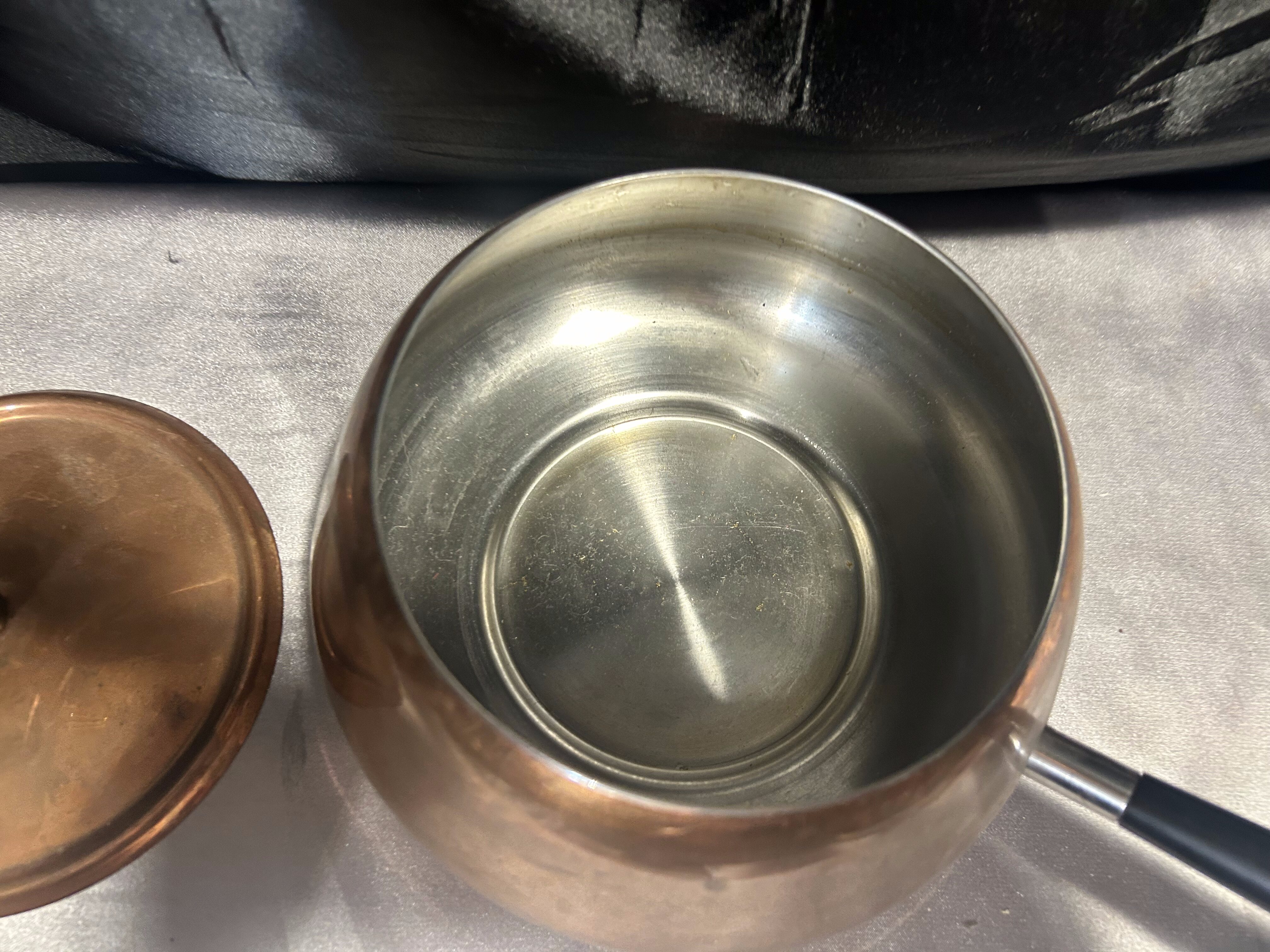 - Miedziany Rondel z Pokrywką – Sygnowany, Czarna Rączka, 1,5 Litra