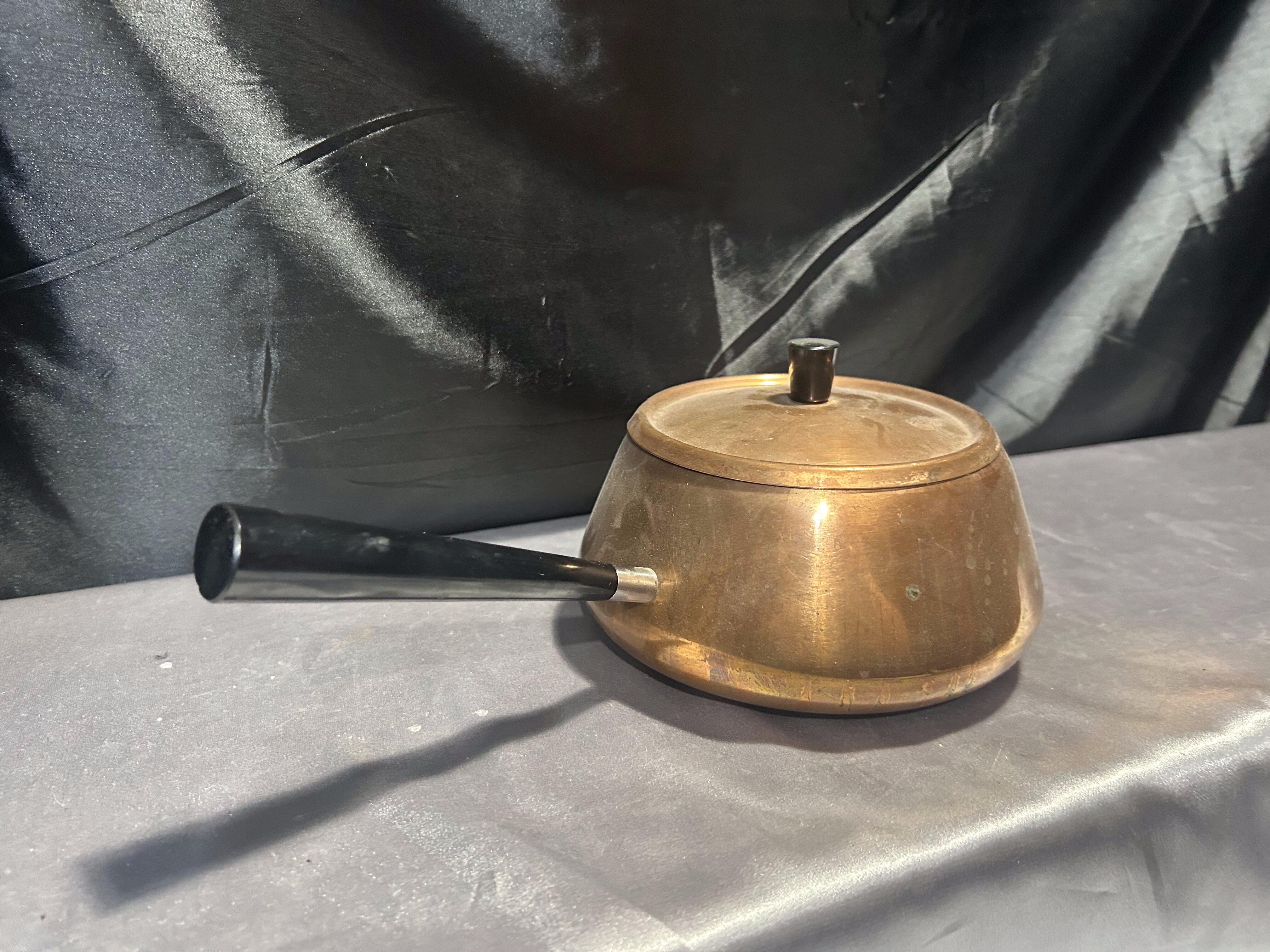 Piękny, sygnowany rondel wykonany z miedzi, wyposażony w dopasowaną pokrywkę oraz elegancką czarną rączkę i uchwyt na pokrywce. Naczynie o pojemności 1,5 litra, idealne do gotowania, duszenia oraz podawania potraw. Połączenie klasycznej miedzi z czarnymi detalami nadaje mu wyjątkowego charakteru, a sygnatura potwierdza jego oryginalność i wartość kolekcjonerską.