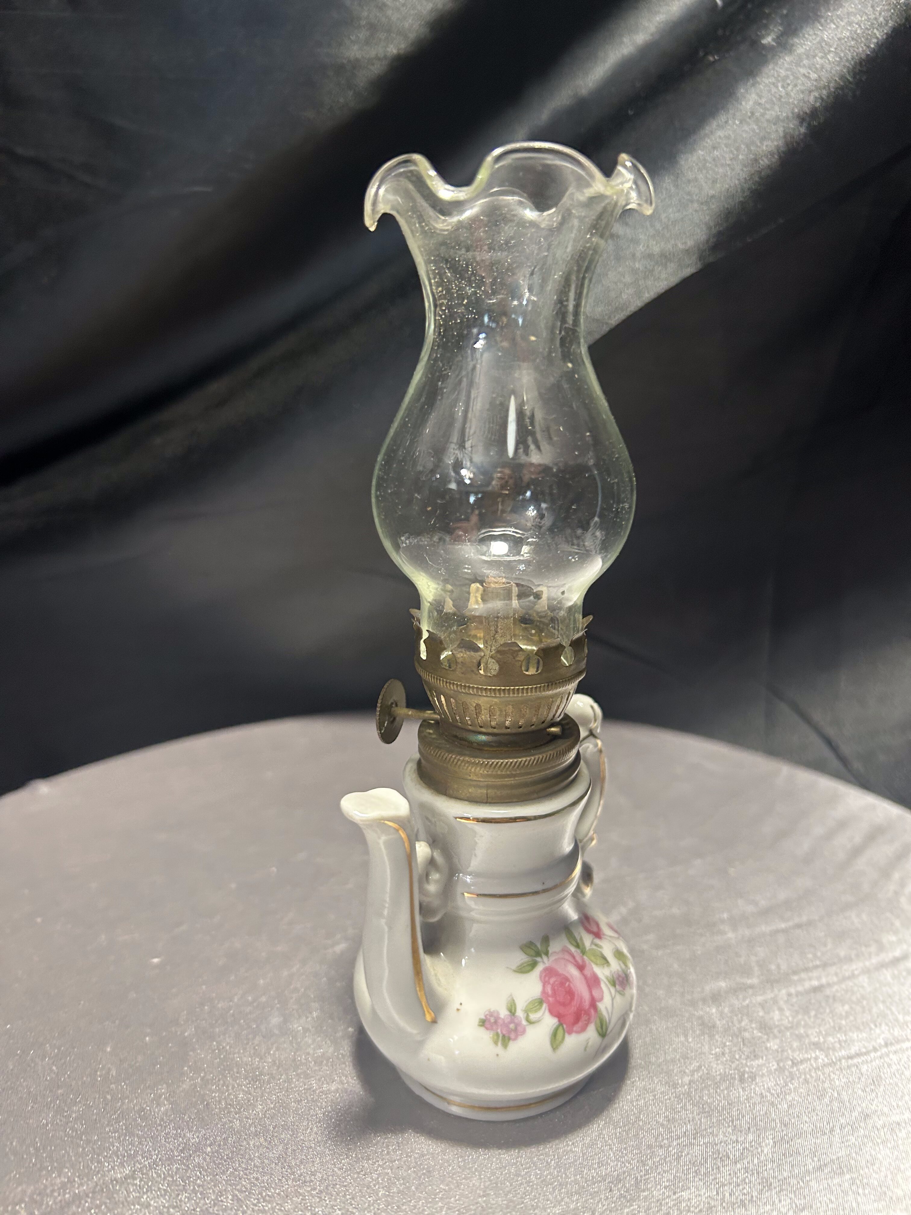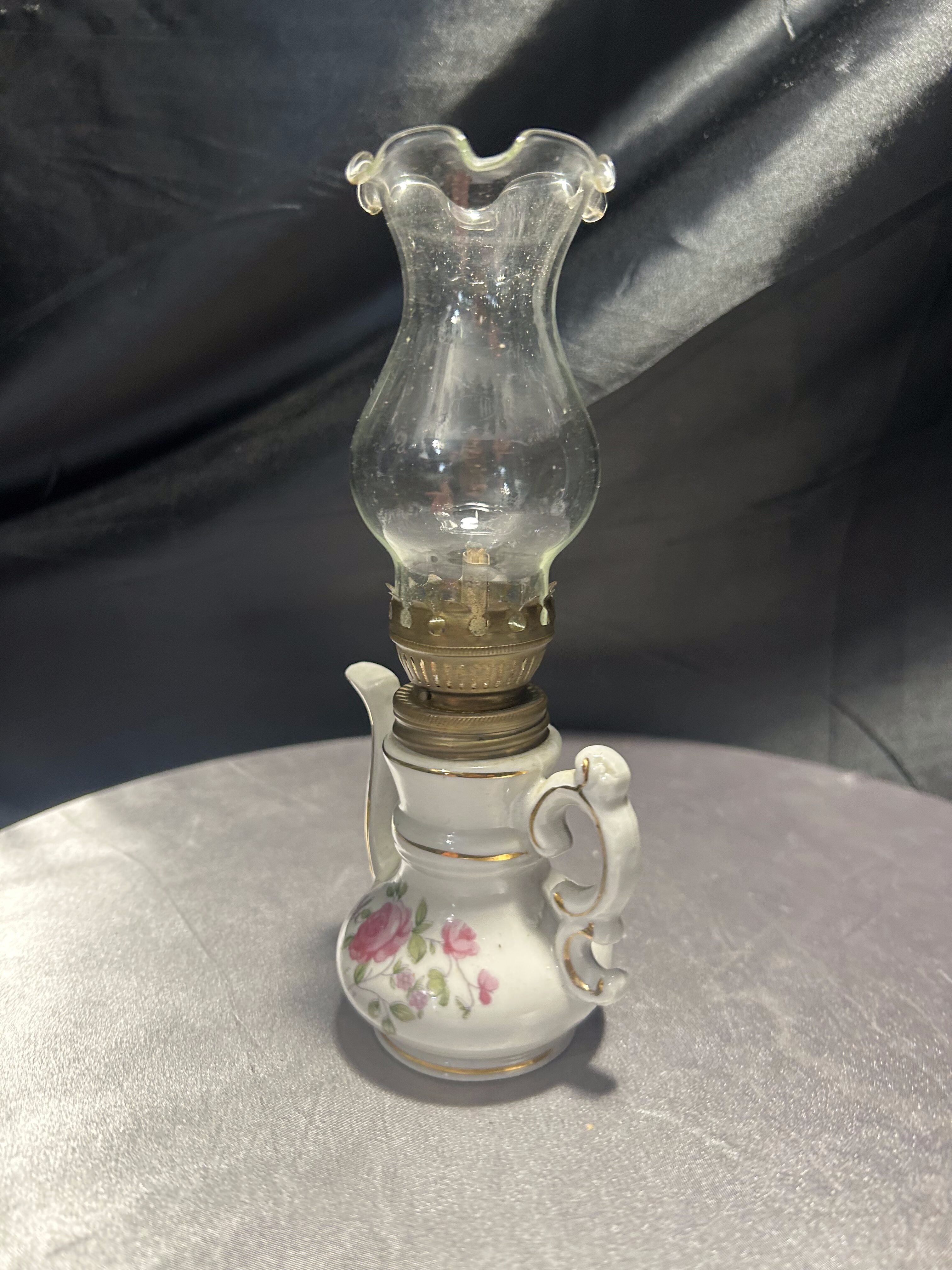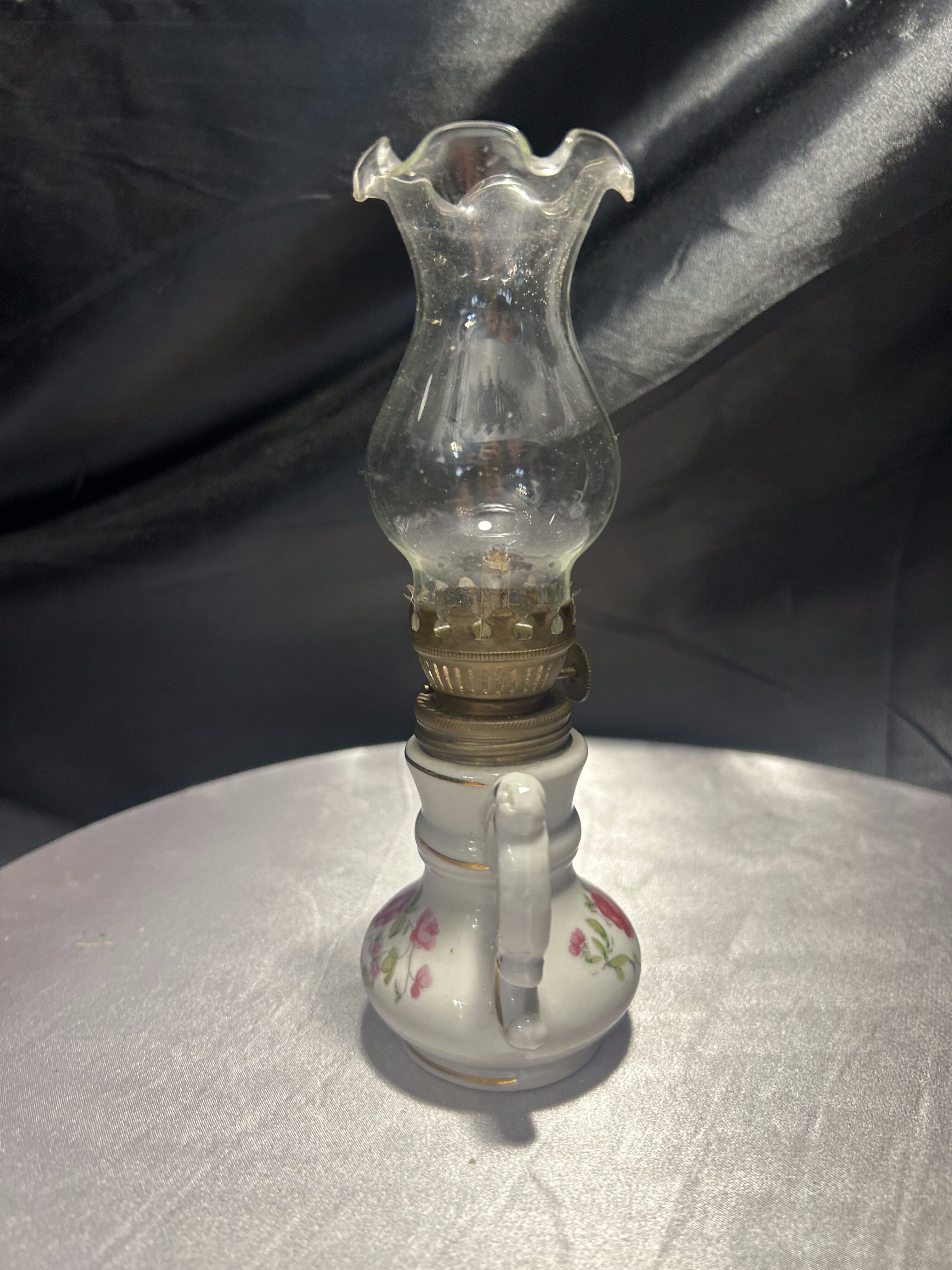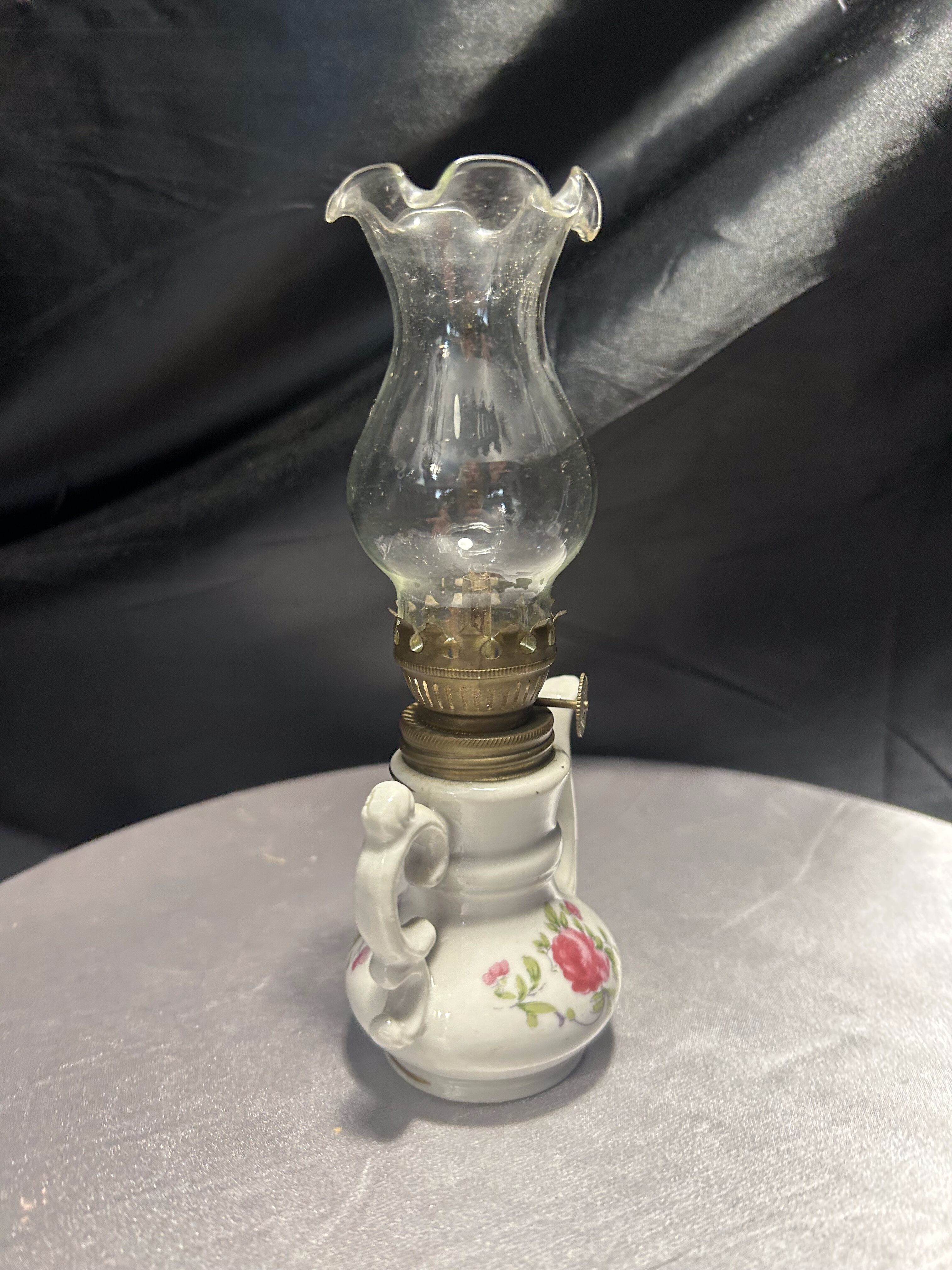 Urocza miniaturowa lampa naftowa w kształcie imbryka, wykonana z porcelany i ozdobiona ręcznie malowanym motywem kwiatowym. Delikatne róże, subtelne złocenia oraz klasyczna forma dzbanka z ozdobnym dzióbkiem i uszkiem tworzą niezwykle dekoracyjny efekt. Szklany komin zakończony falbanką dodaje lampie lekkości i finezji. Pełni funkcję użytkową – mechanizm knotowy jest sprawny. Idealna do ekspozycji w kolekcji bibelotów, w witrynie czy na toaletce w stylu vintage.
