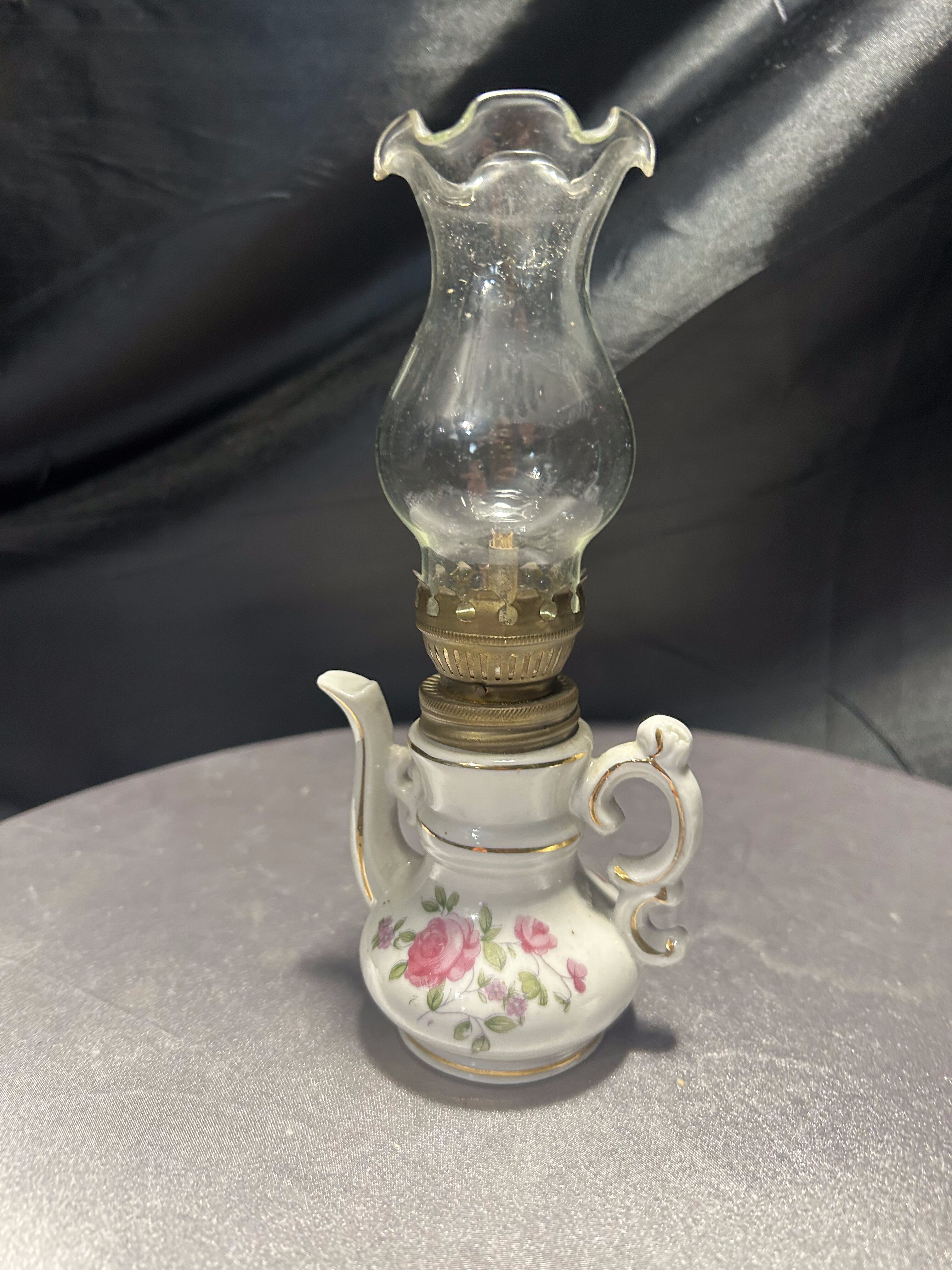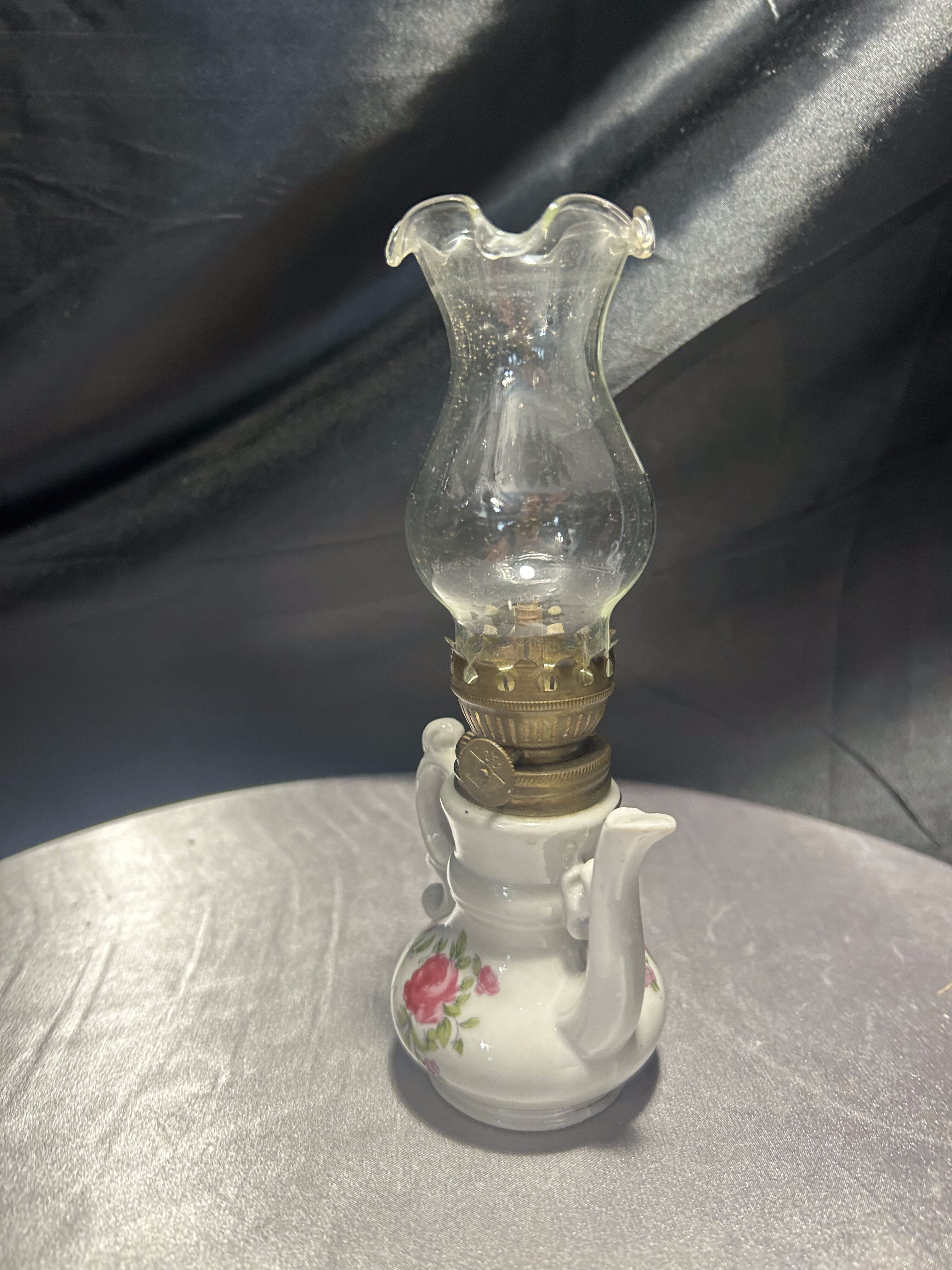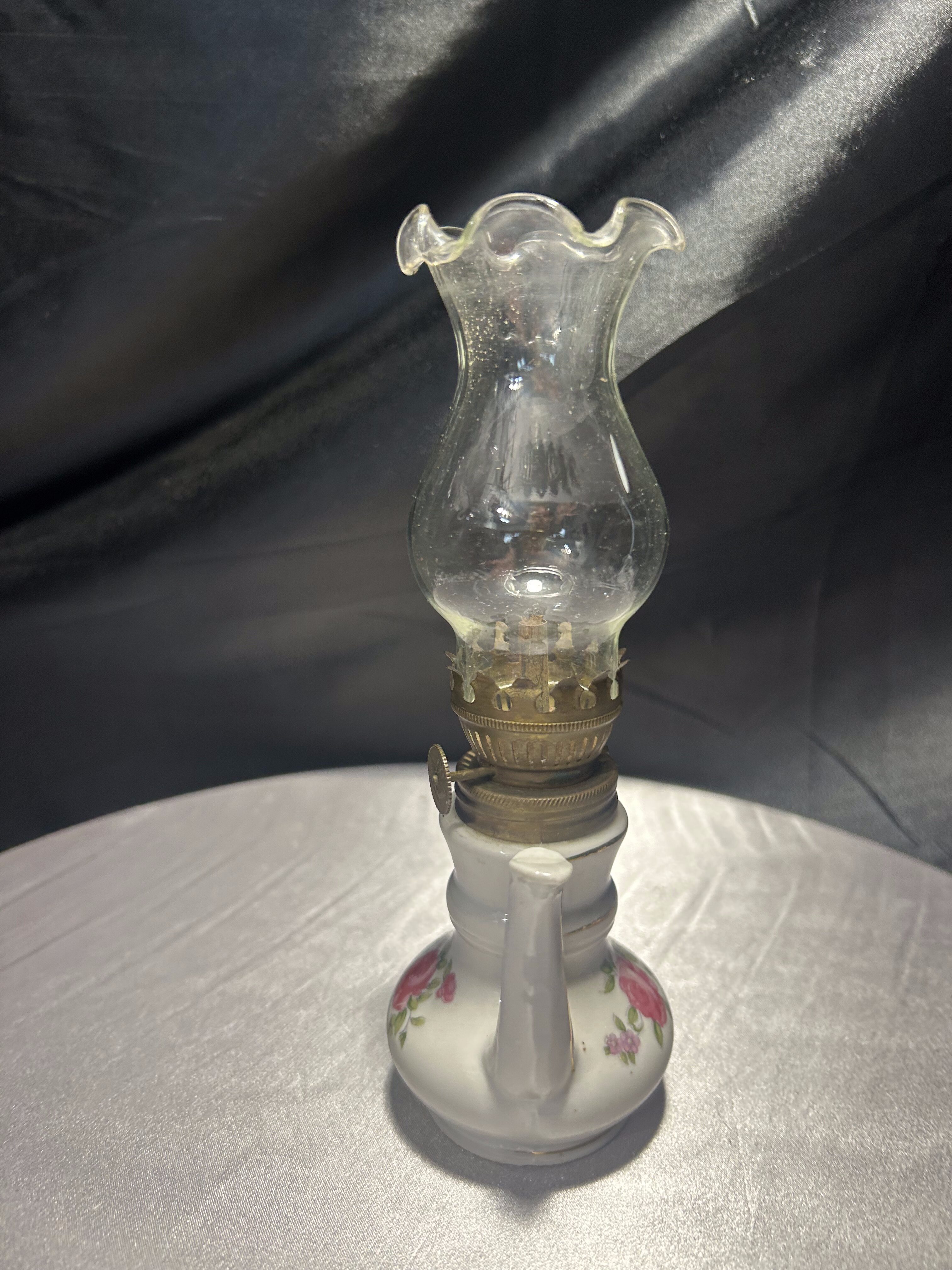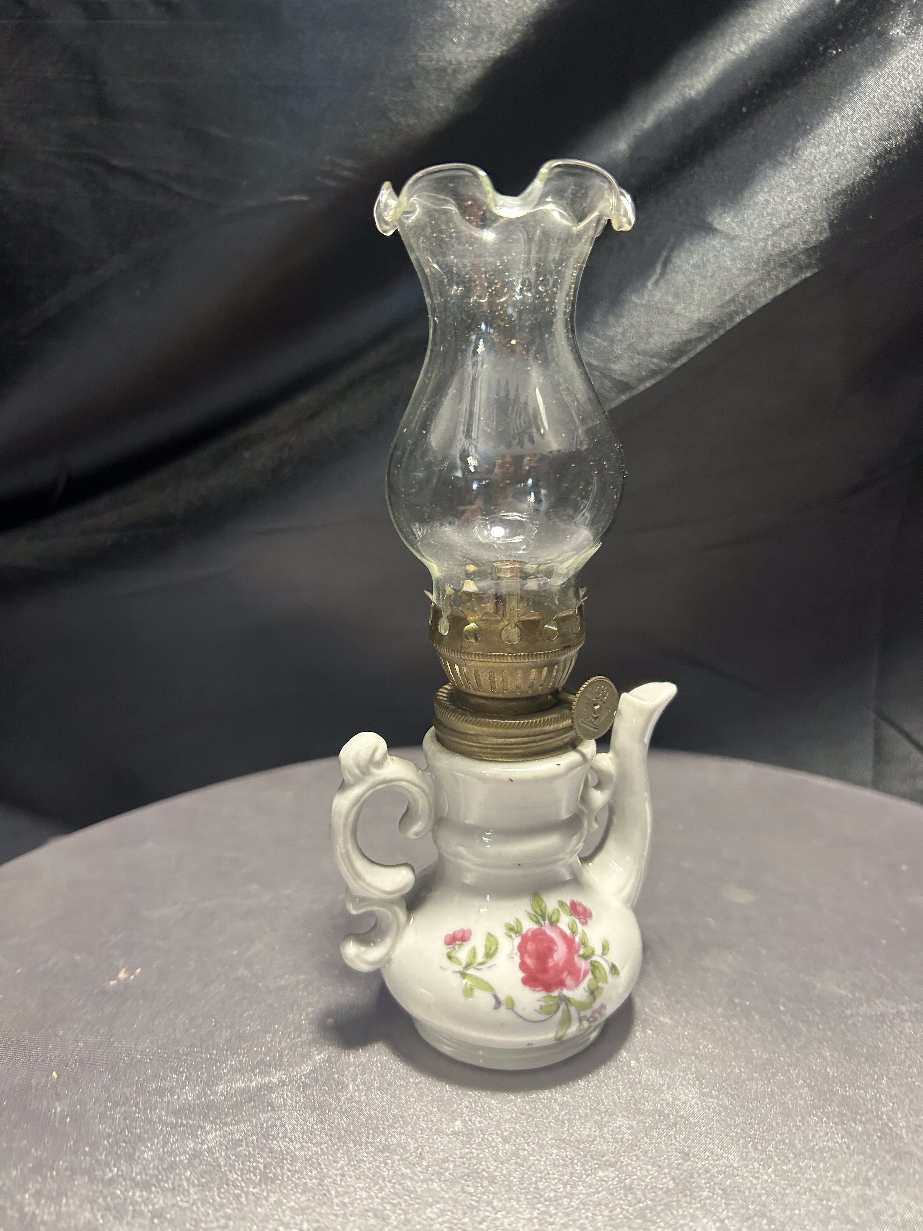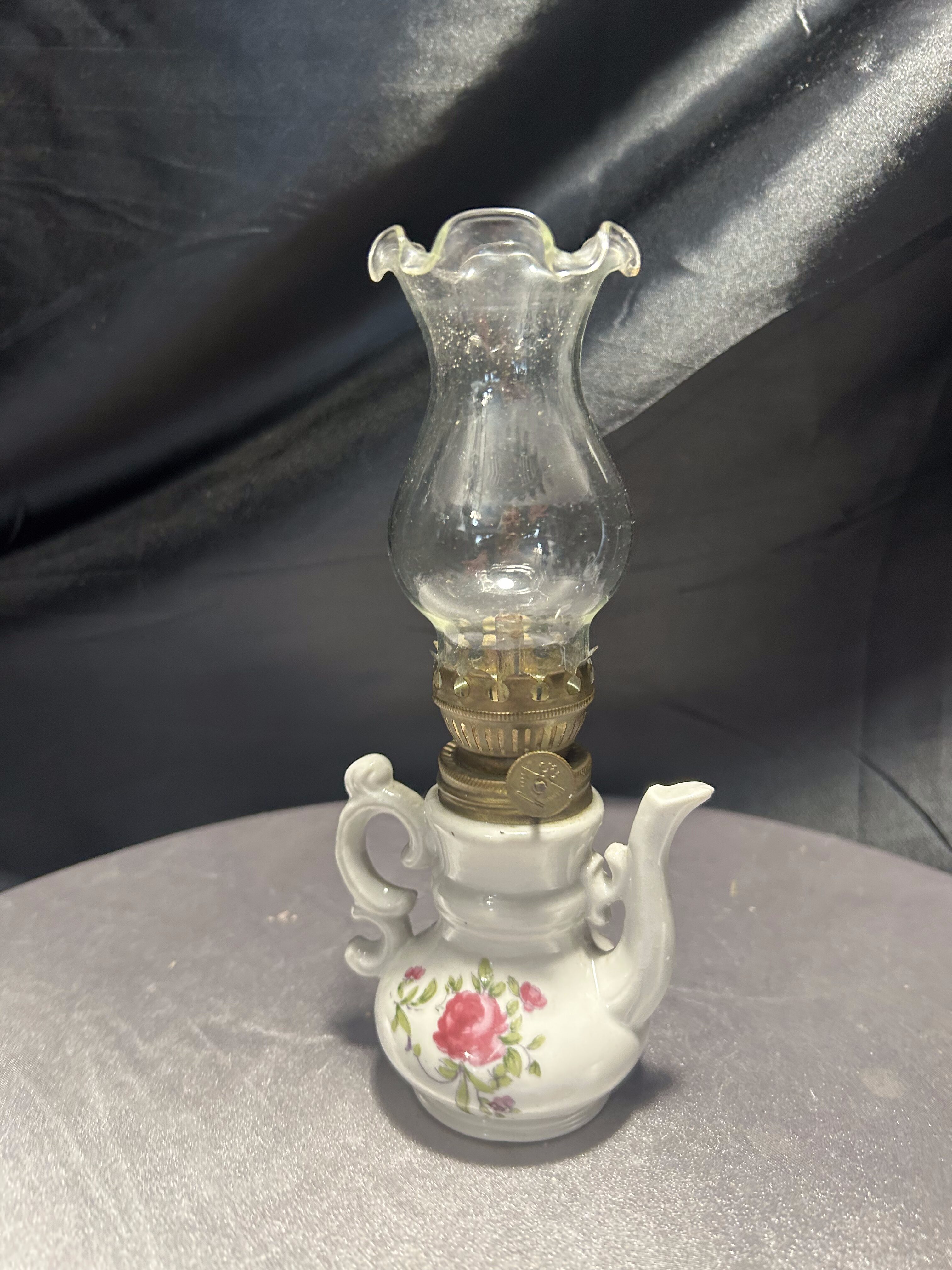 Urocza miniaturowa lampa naftowa w kształcie imbryka, wykonana z porcelany i ozdobiona ręcznie malowanym motywem kwiatowym. Delikatne róże, subtelne złocenia oraz klasyczna forma dzbanka z ozdobnym dzióbkiem i uszkiem tworzą niezwykle dekoracyjny efekt. Szklany komin zakończony falbanką dodaje lampie lekkości i finezji. Pełni funkcję użytkową – mechanizm knotowy jest sprawny. Idealna do ekspozycji w kolekcji bibelotów, w witrynie czy na toaletce w stylu vintage.