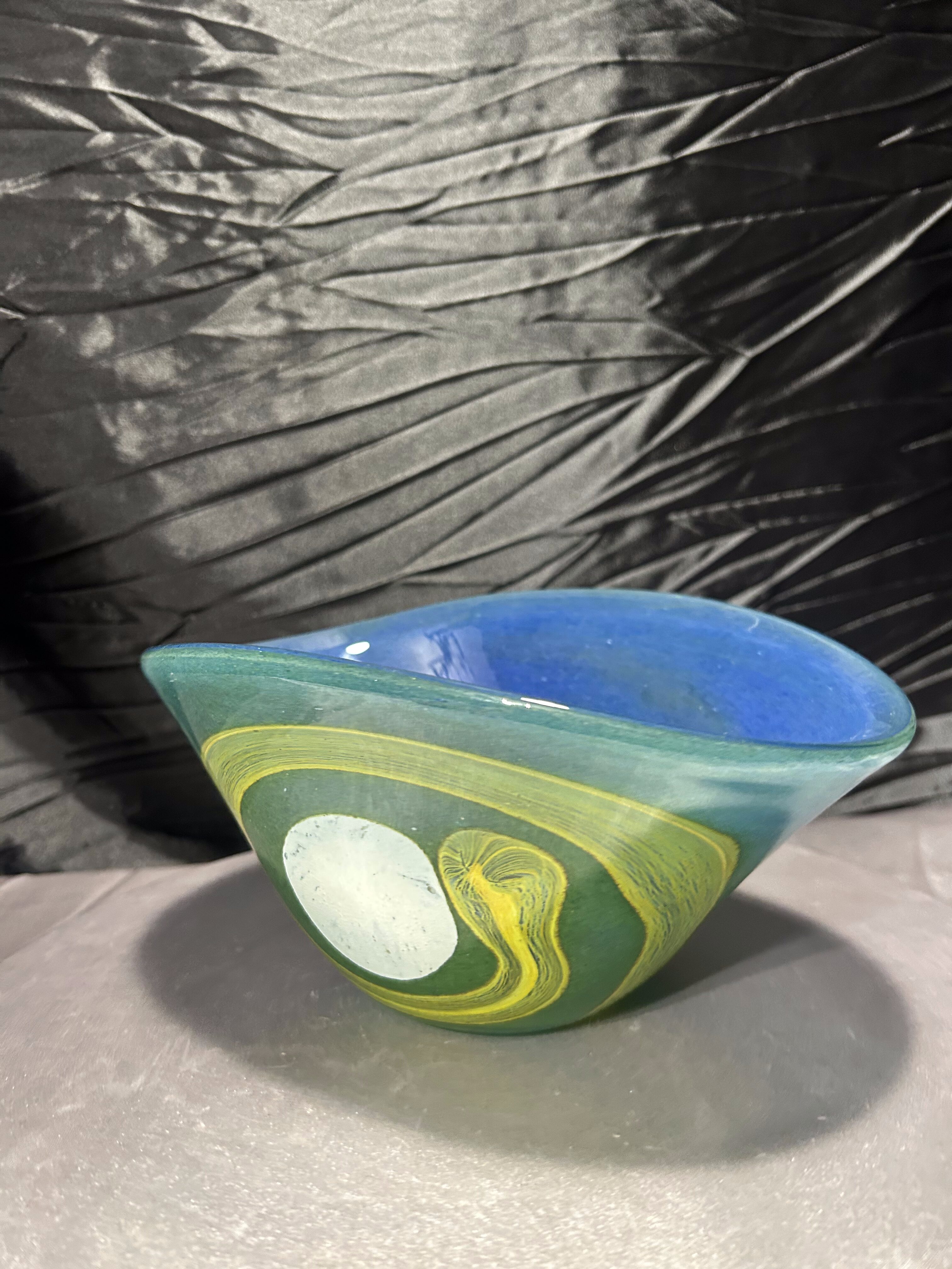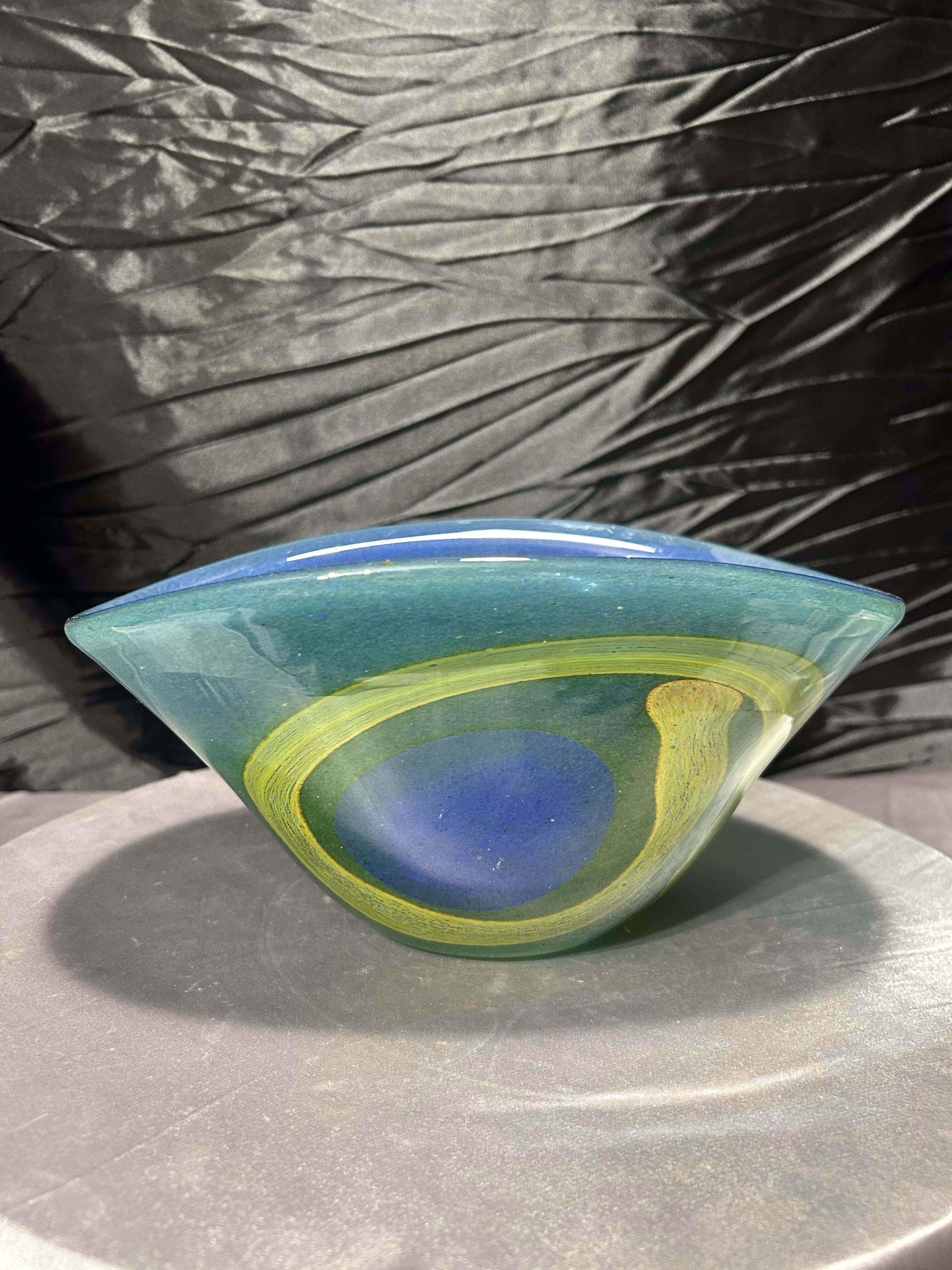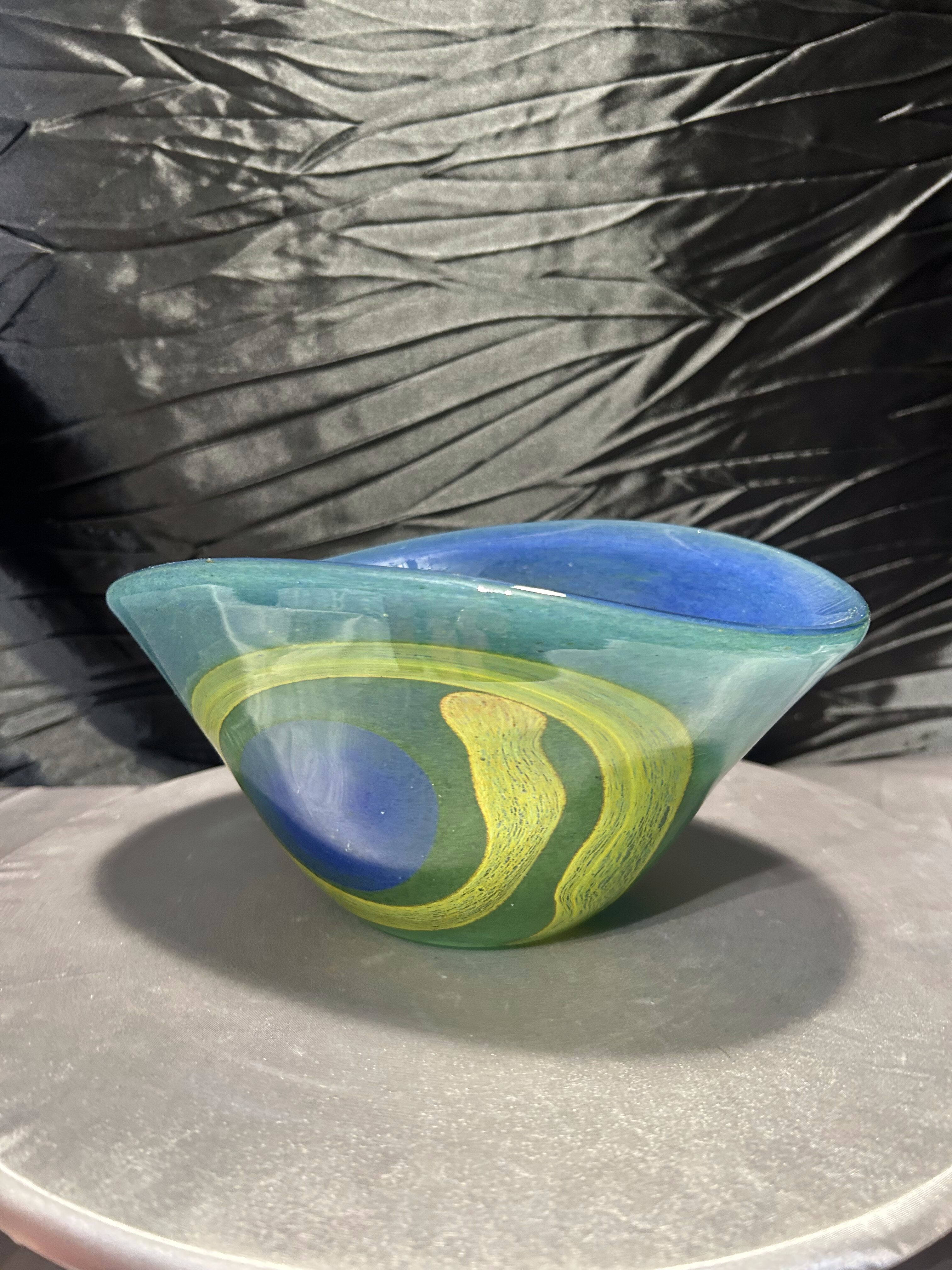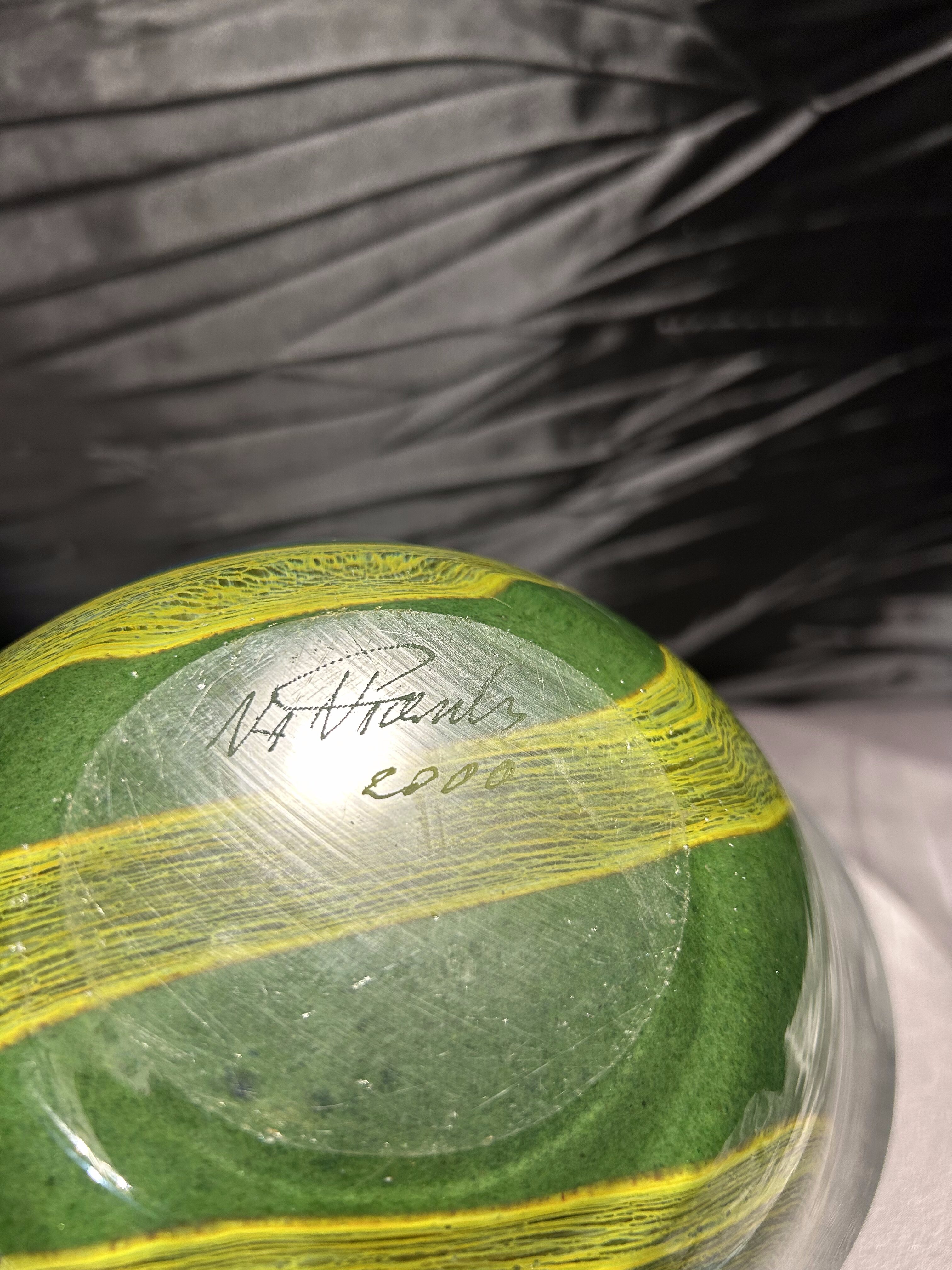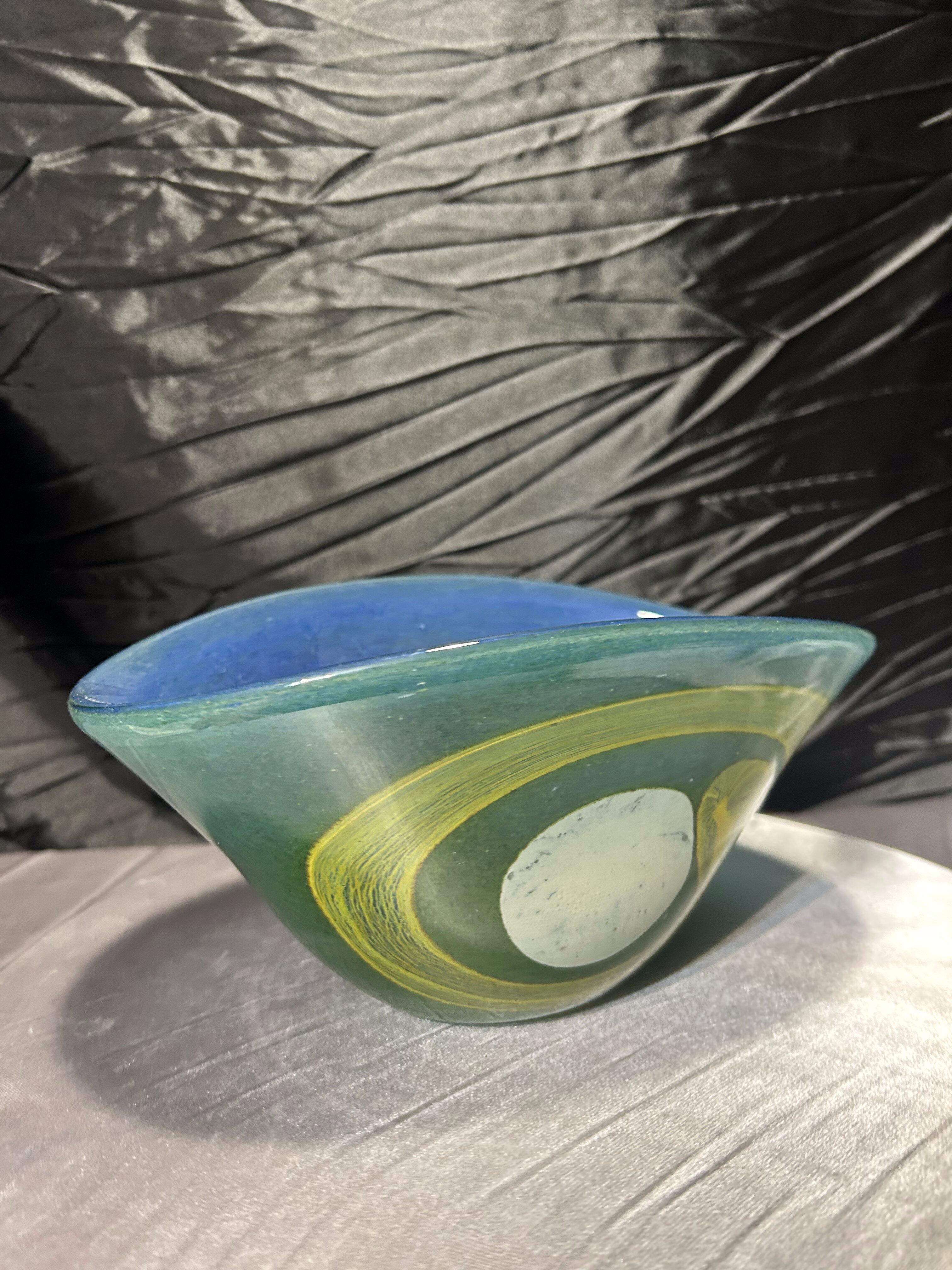 Przedstawiamy wyjątkową misę artystyczną wykonaną ze szkła barwionego — projekt z wyraźnie widocznym i czytelnym podpisem autora („V. Frandsen 2002” lub podobnie). Forma misy cechuje się dynamiczną, organiczną linią, bogatą kolorystyką: dominują odcienie zieleni z akcentami żółci i głębokiego błękitu. Zewnętrzna partia szkła łączy nieprzezroczystą warstwę z transparentnymi fragmentami, co tworzy efekt świetlny i głębię. Wnętrze prezentuje intensywną barwę, natomiast krawędzie misy są subtelnie pofalowane, nadając przedmiotowi unikatowy charakter.