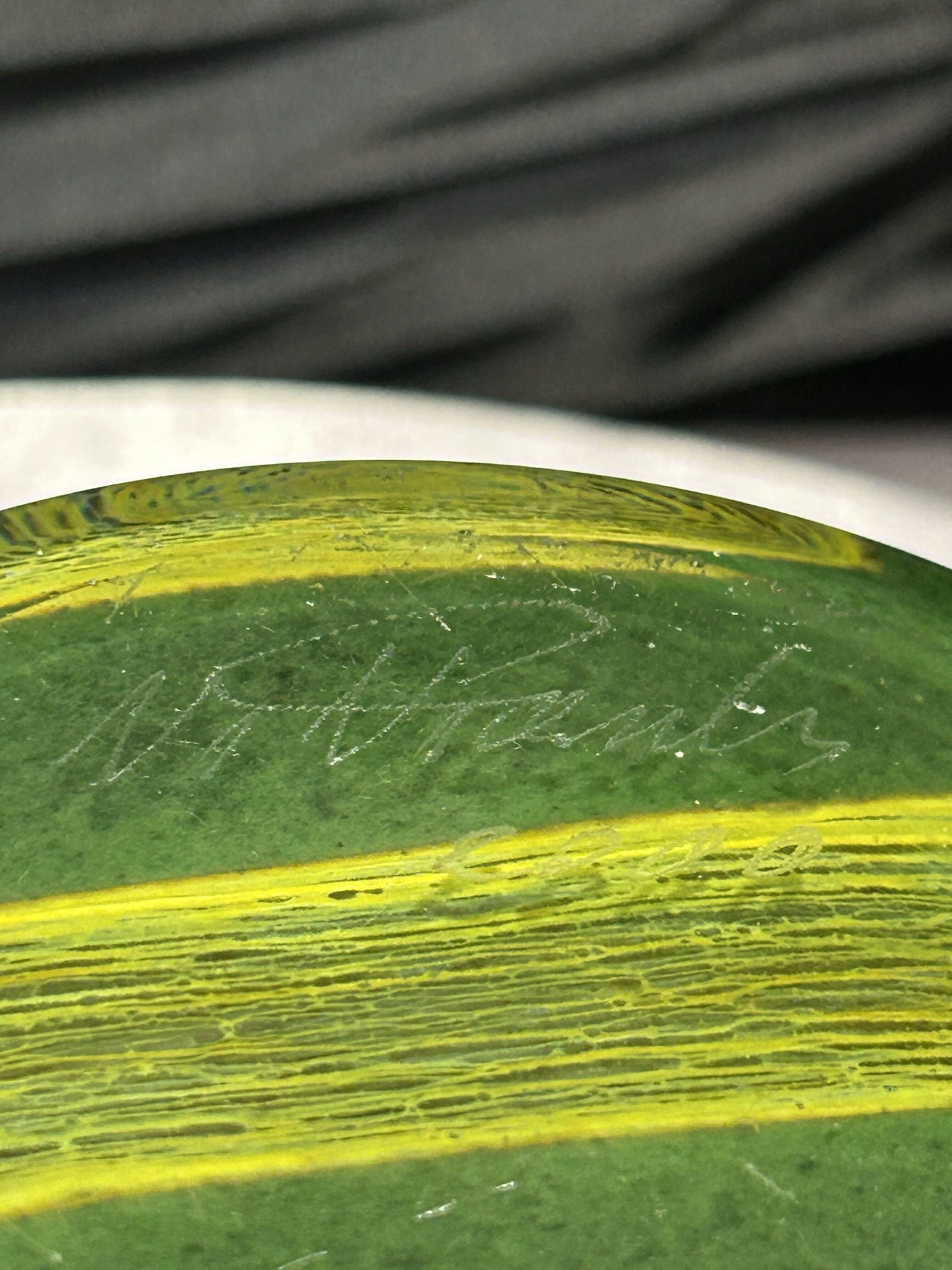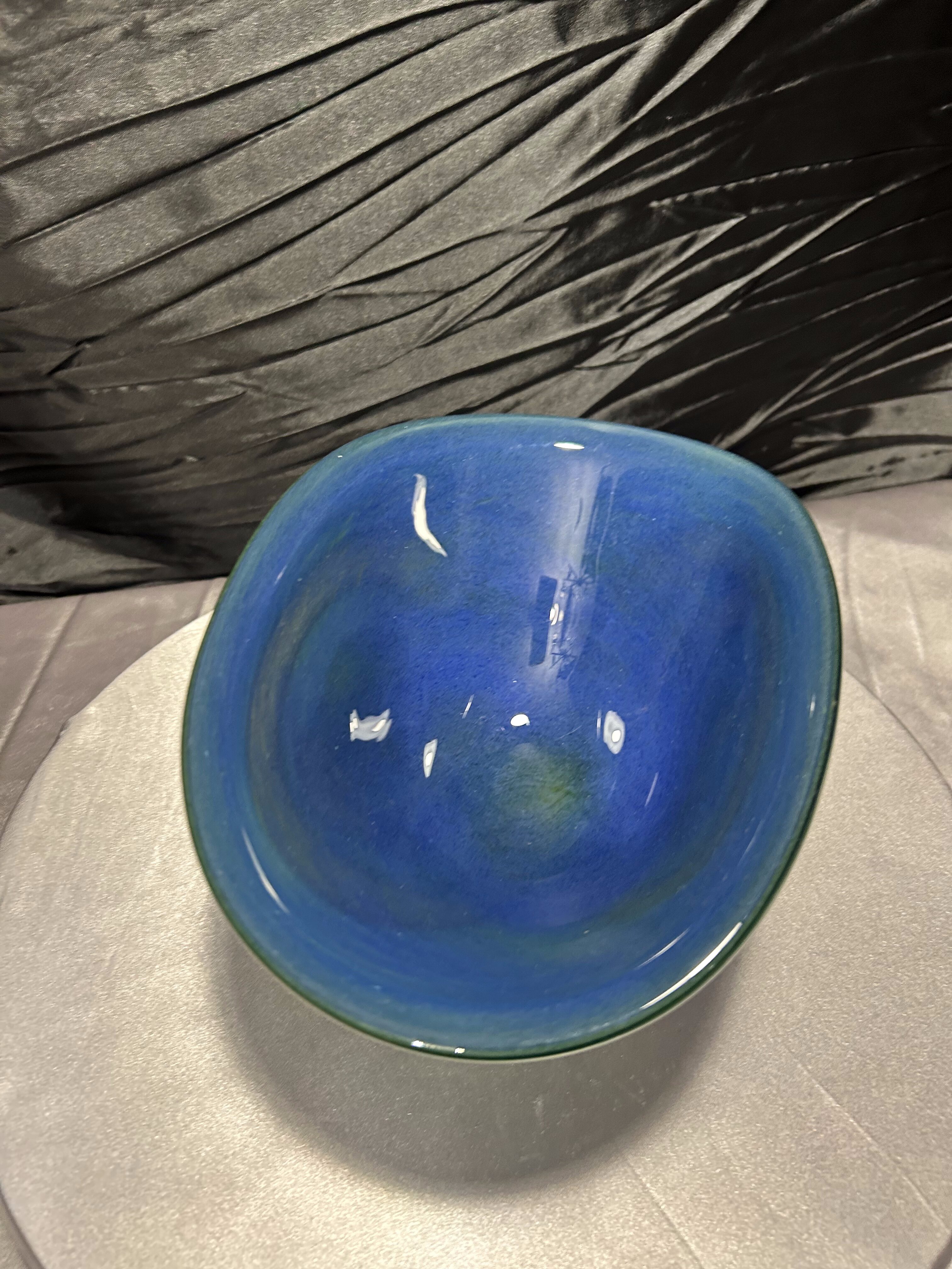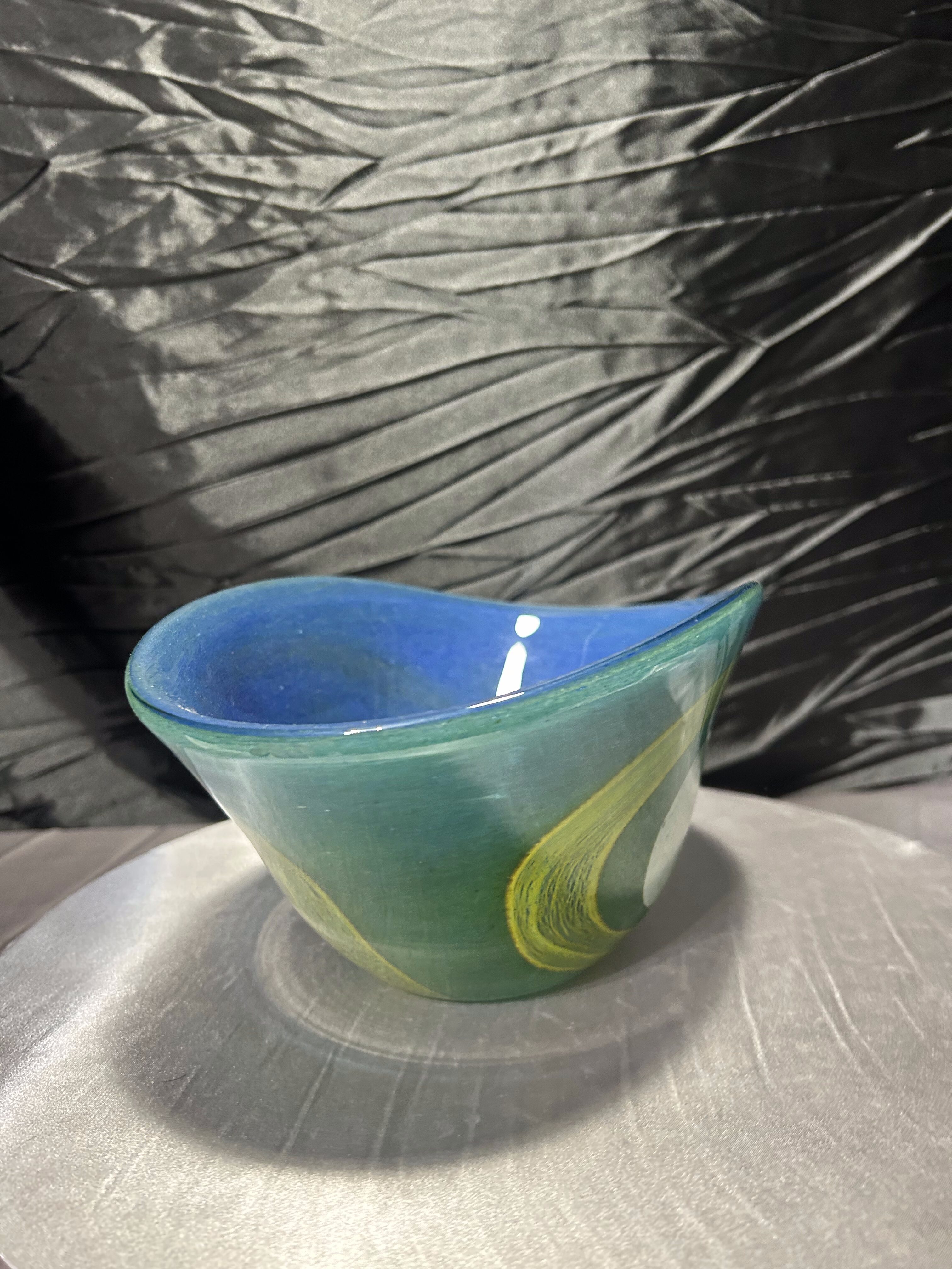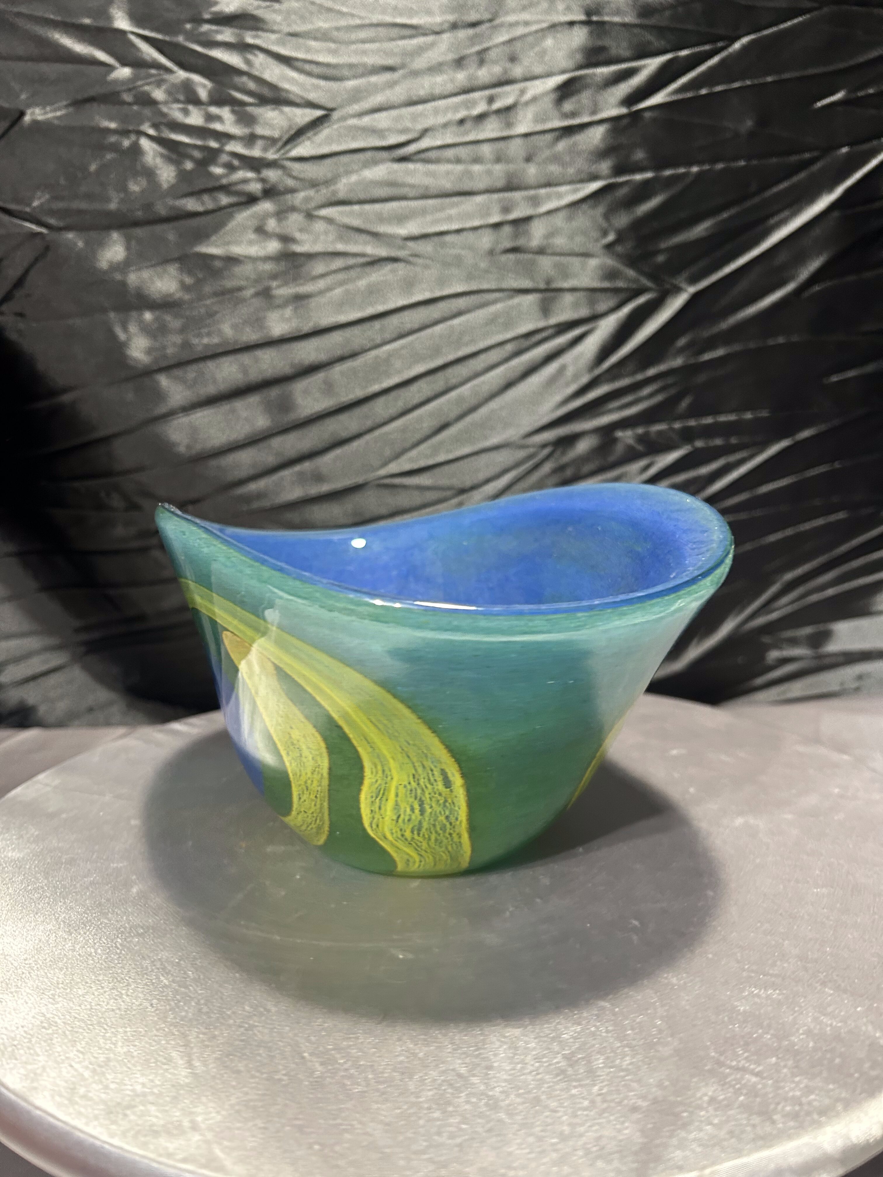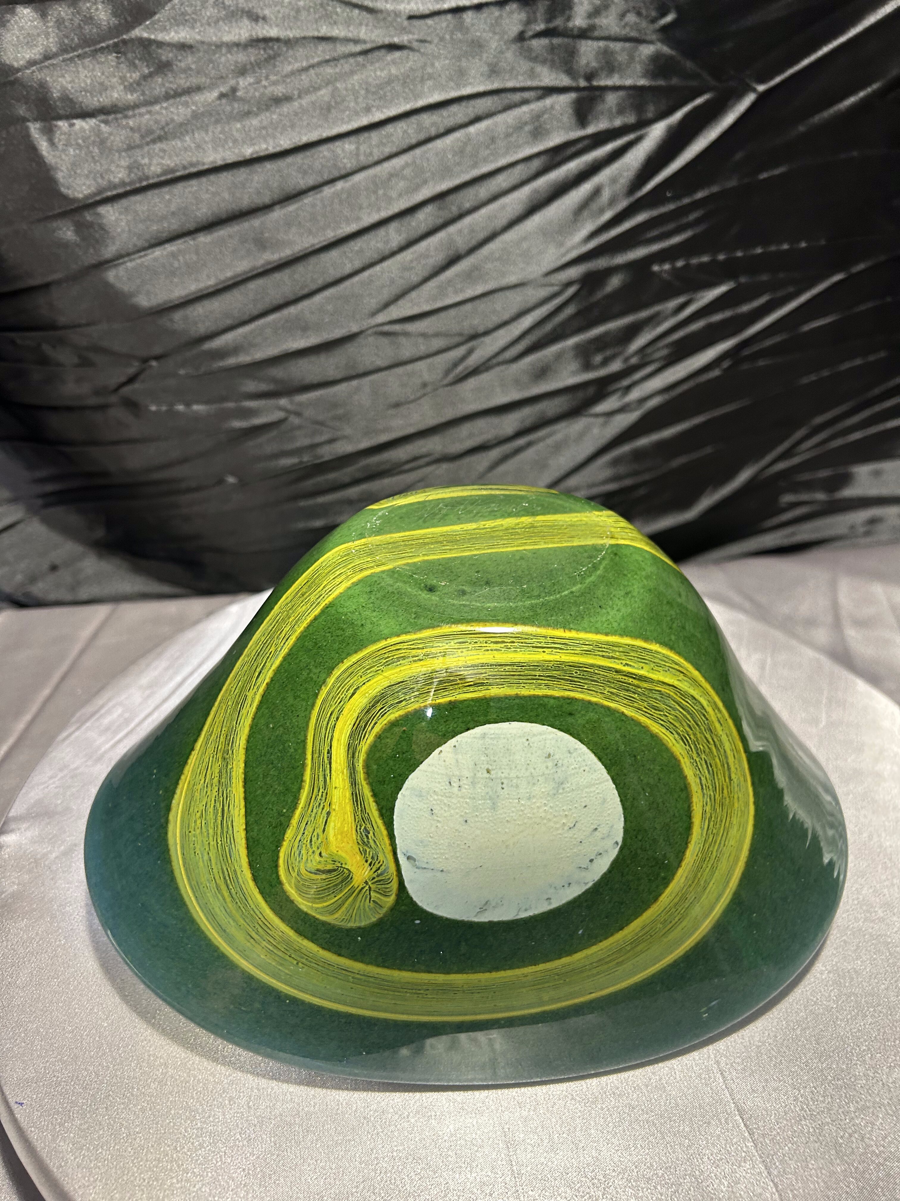Przedstawiamy wyjątkową misę artystyczną wykonaną ze szkła barwionego — projekt z wyraźnie widocznym i czytelnym podpisem autora („V. Frandsen 2002” lub podobnie). Forma misy cechuje się dynamiczną, organiczną linią, bogatą kolorystyką: dominują odcienie zieleni z akcentami żółci i głębokiego błękitu. Zewnętrzna partia szkła łączy nieprzezroczystą warstwę z transparentnymi fragmentami, co tworzy efekt świetlny i głębię. Wnętrze prezentuje intensywną barwę, natomiast krawędzie misy są subtelnie pofalowane, nadając przedmiotowi unikatowy charakter.