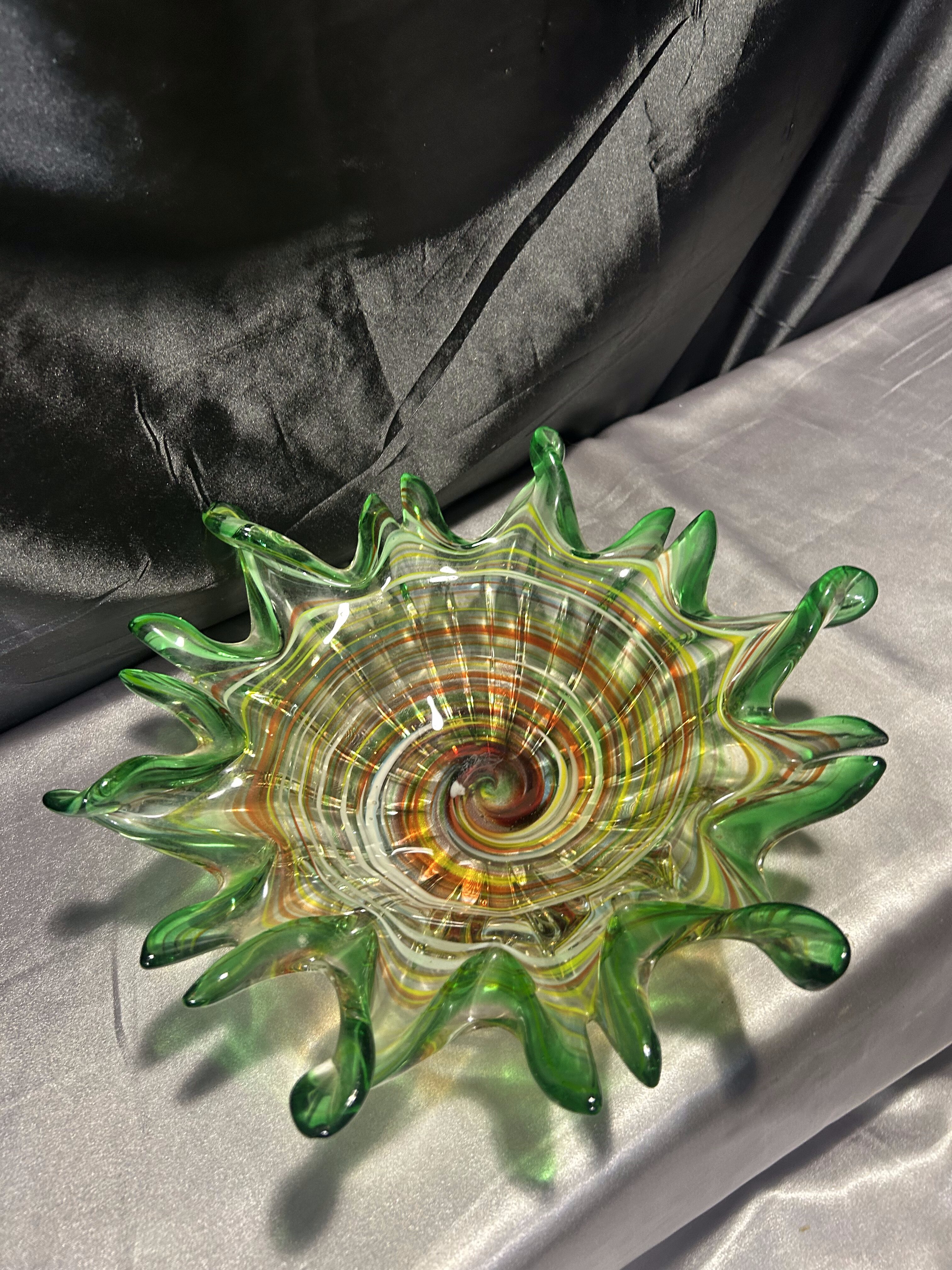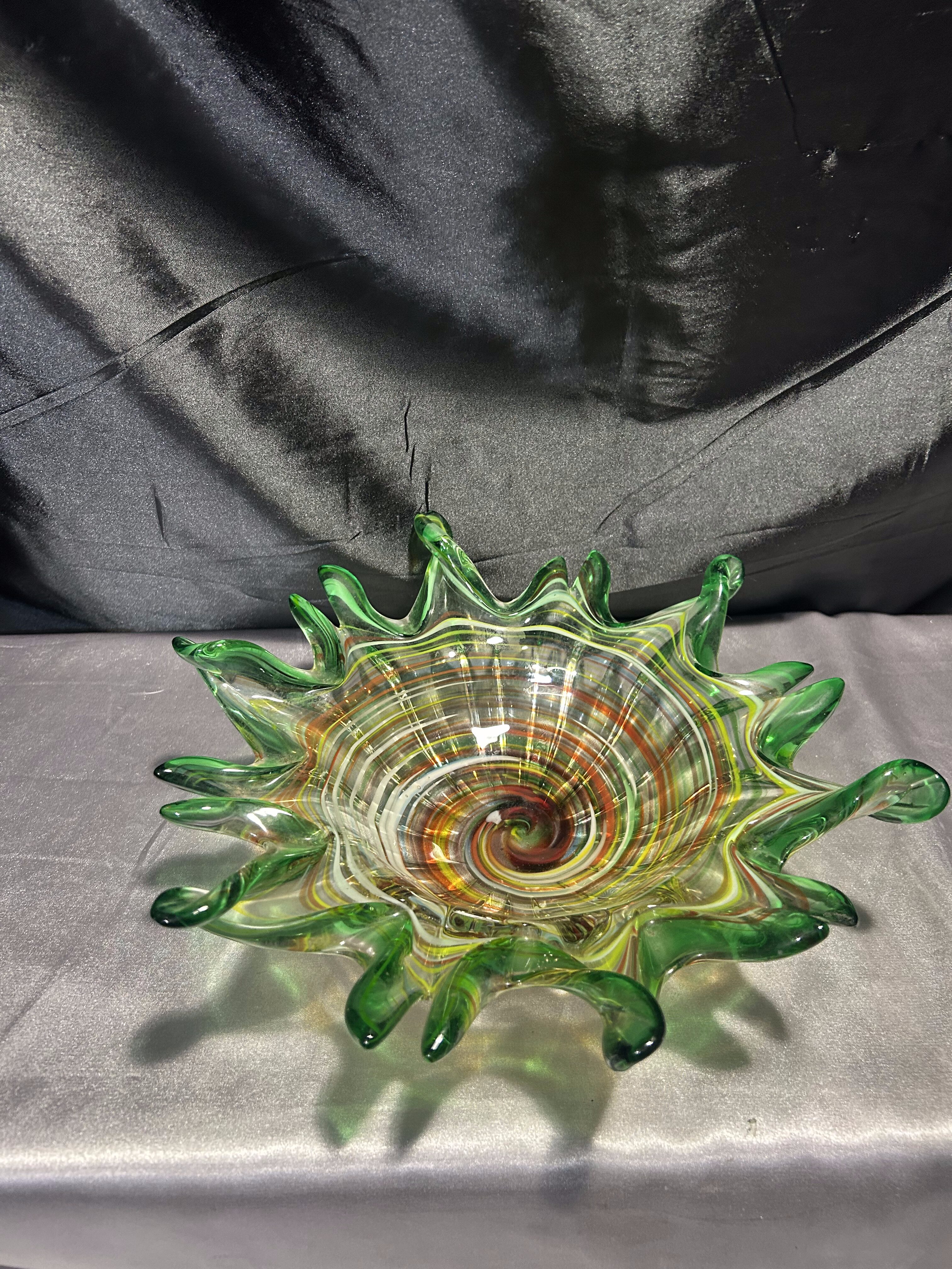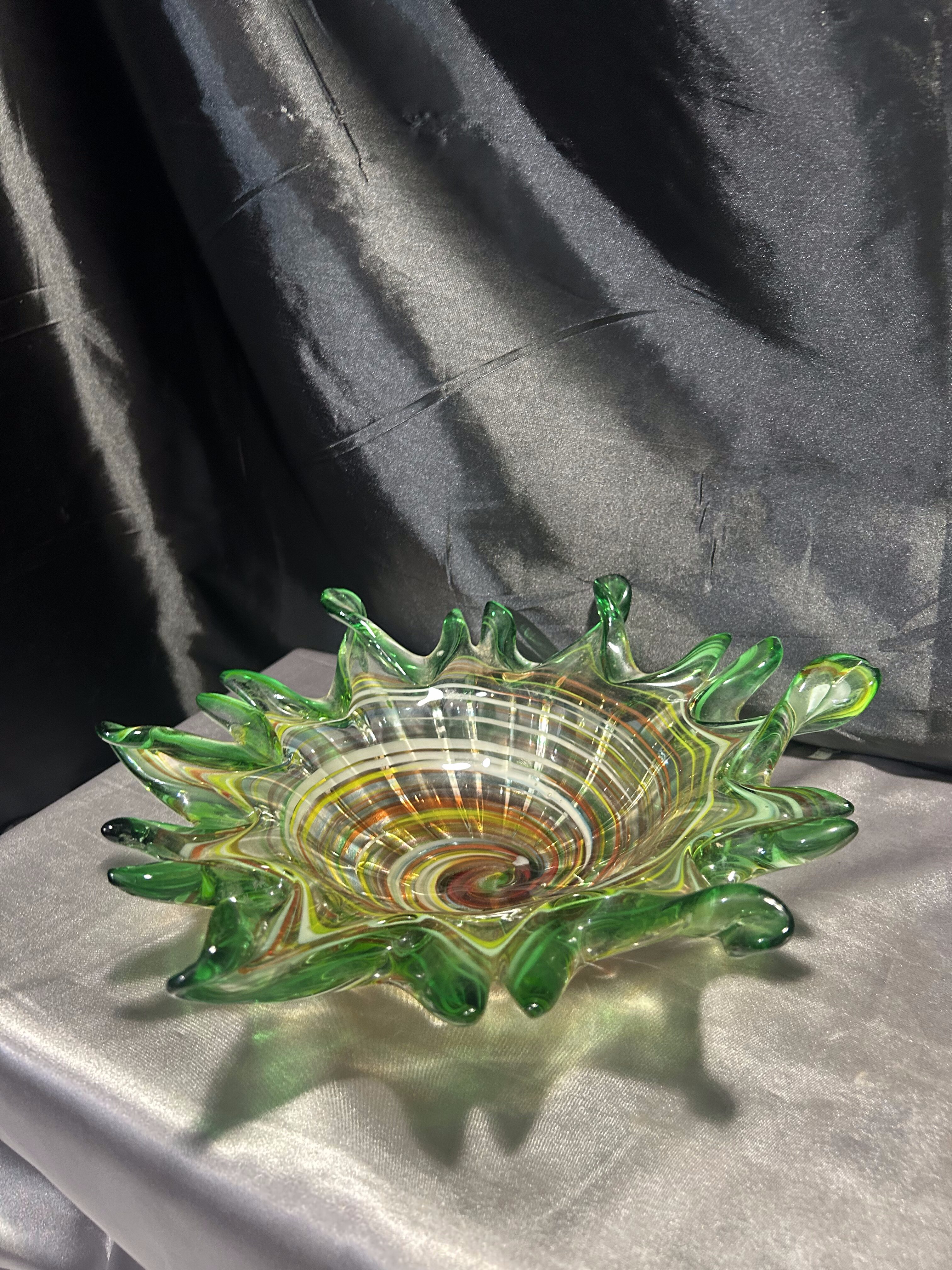 Spiralny wzór w odcieniach zieleni, bieli i pomarańczu został wykonany techniką wtapiania kolorowych prętów szklanych w masę szkła – metodą zbliżoną do słynnego caneworkingu. Wzór pięknie podkreśla kręty kształt misy, a krawędzie tworzą dynamiczne, płynne wypustki, przypominające słoneczne promienie lub fale.