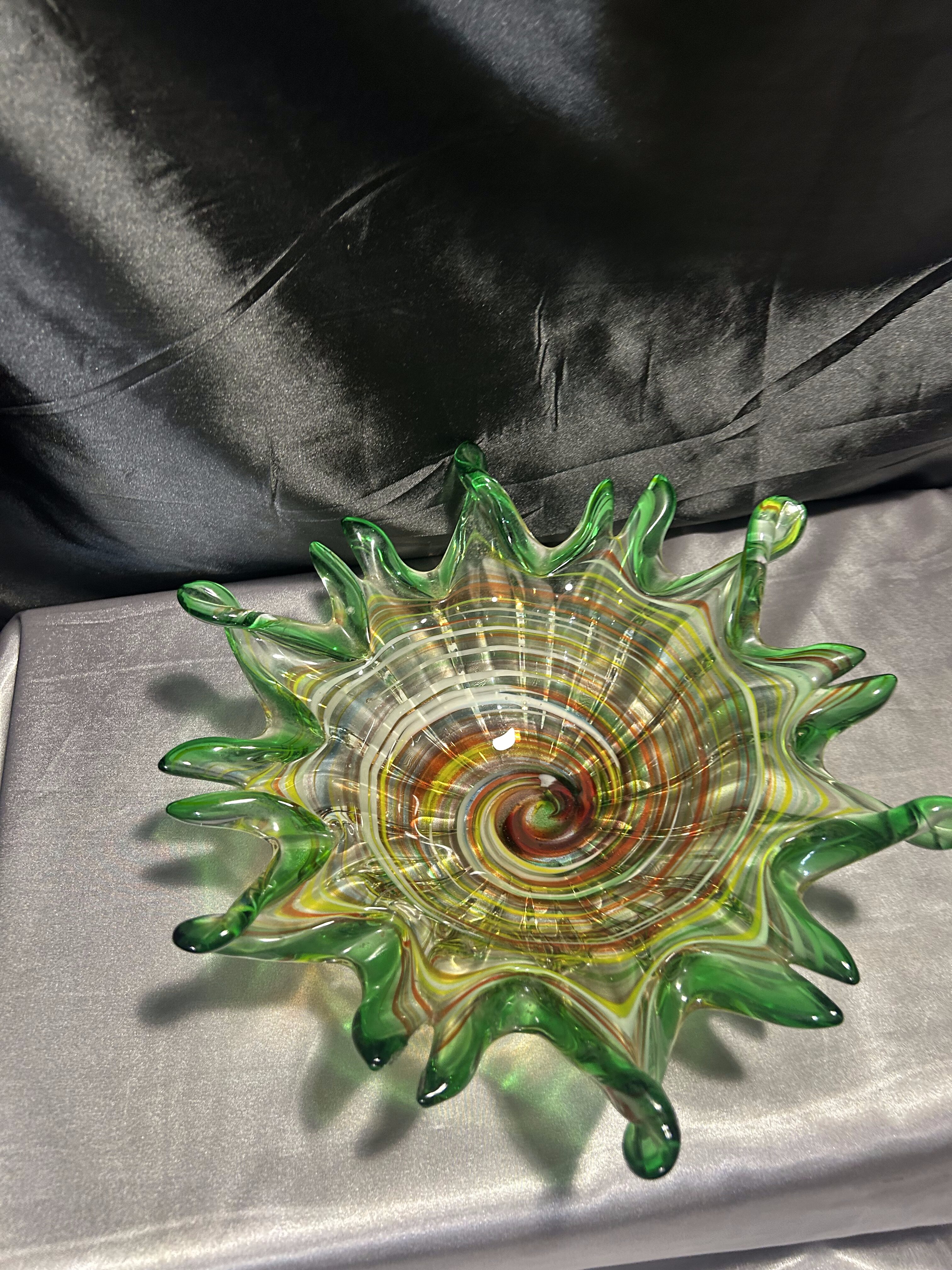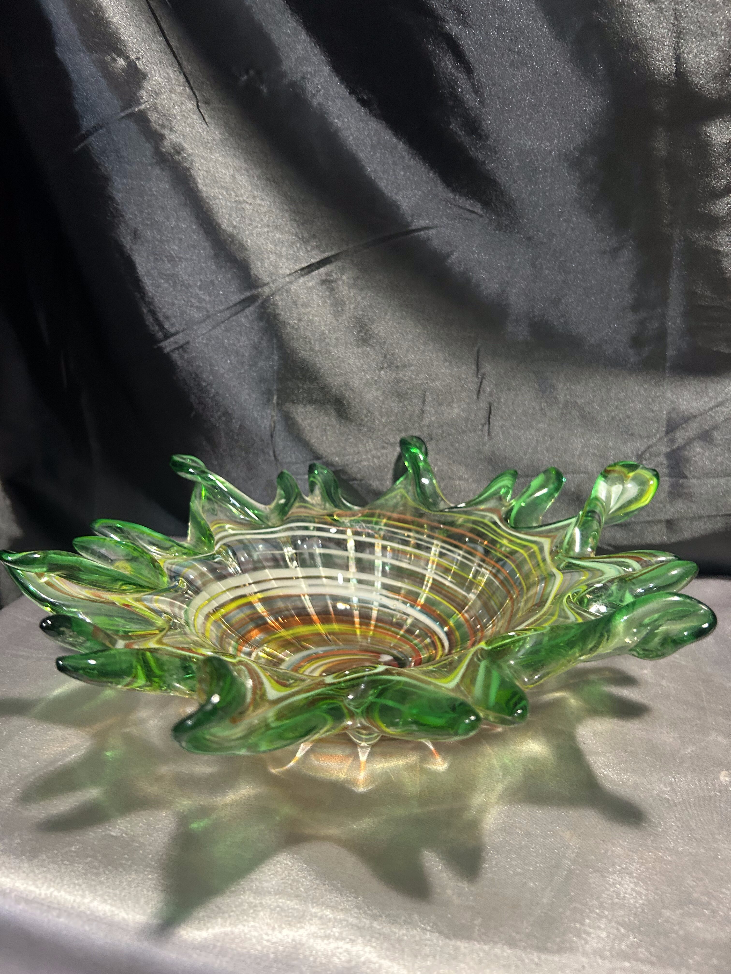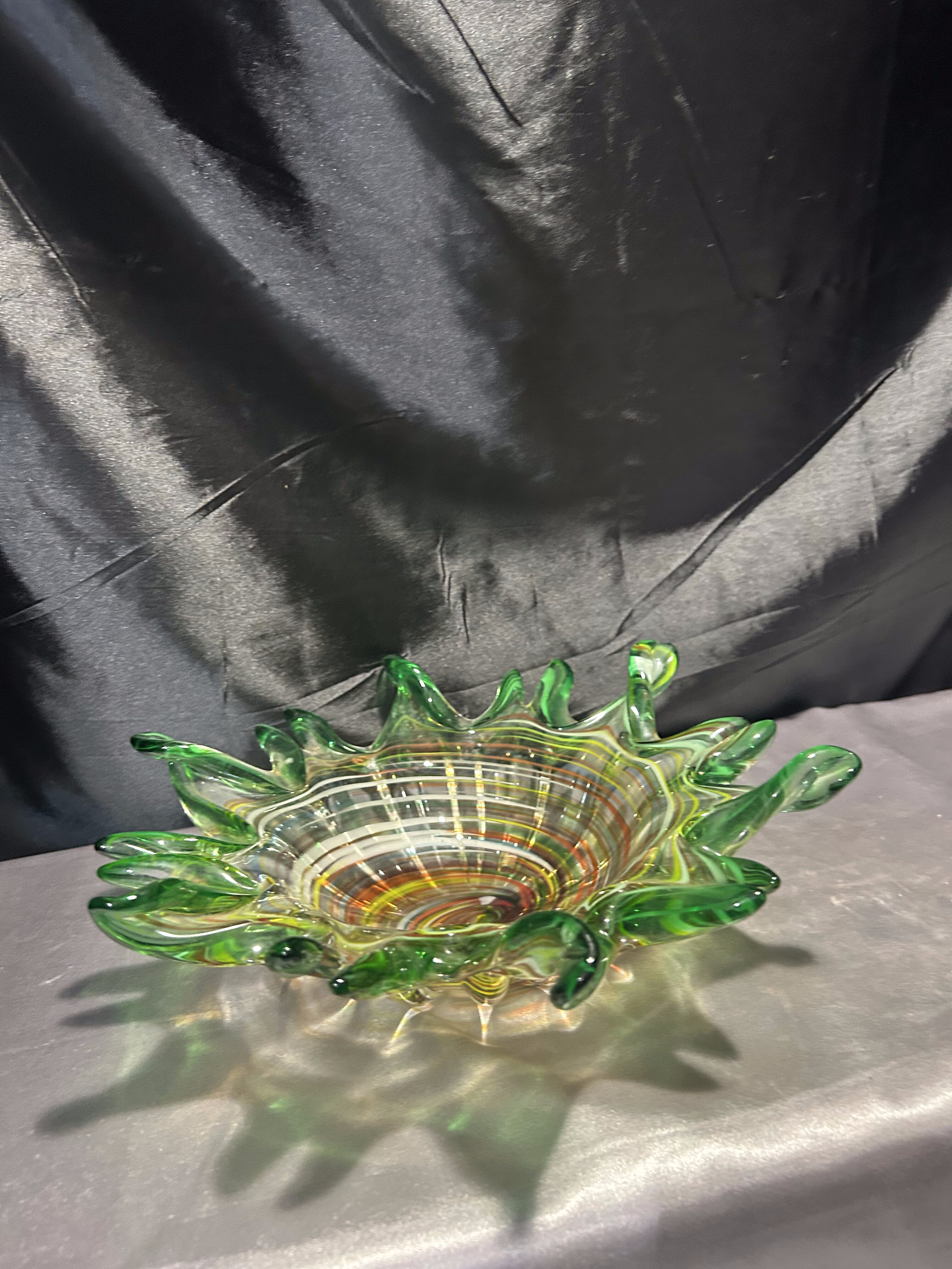 Spiralny wzór w odcieniach zieleni, bieli i pomarańczu został wykonany techniką wtapiania kolorowych prętów szklanych w masę szkła – metodą zbliżoną do słynnego caneworkingu. Wzór pięknie podkreśla kręty kształt misy, a krawędzie tworzą dynamiczne, płynne wypustki, przypominające słoneczne promienie lub fale.