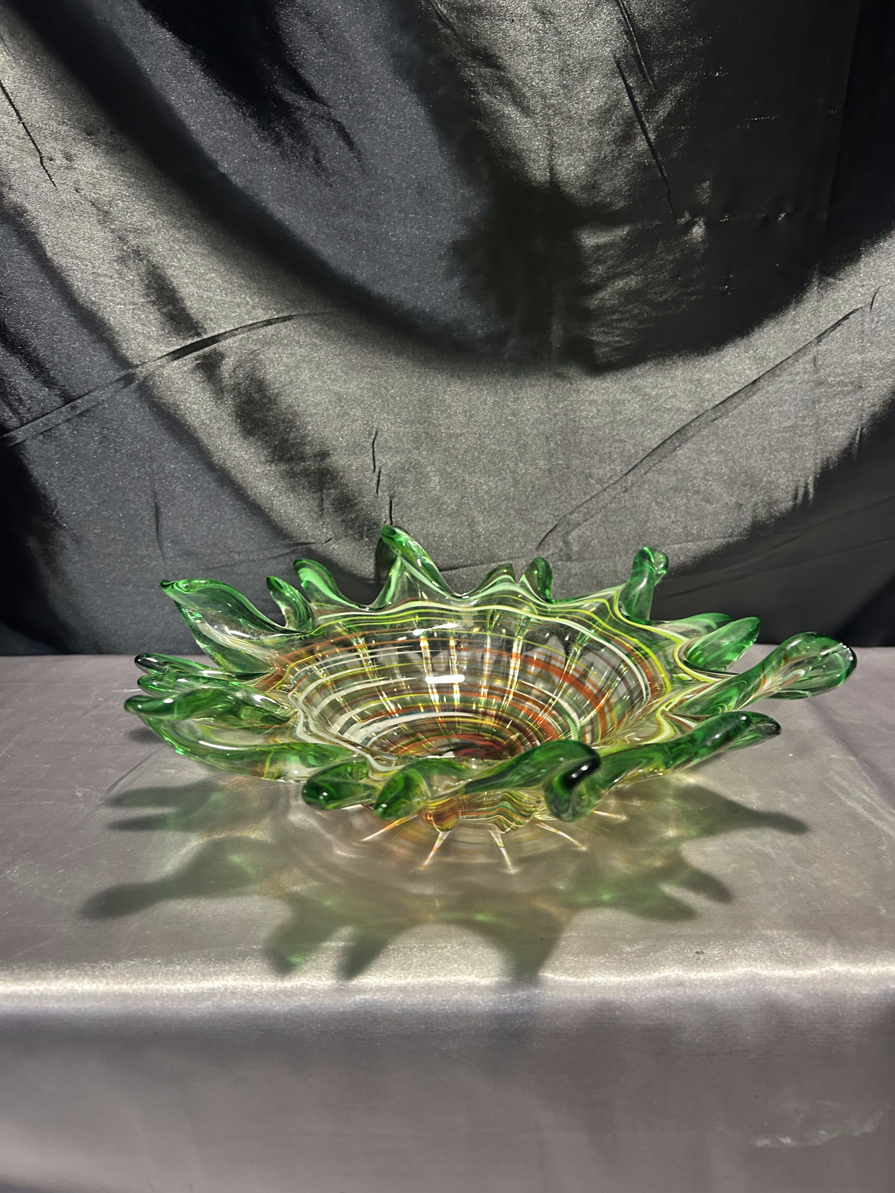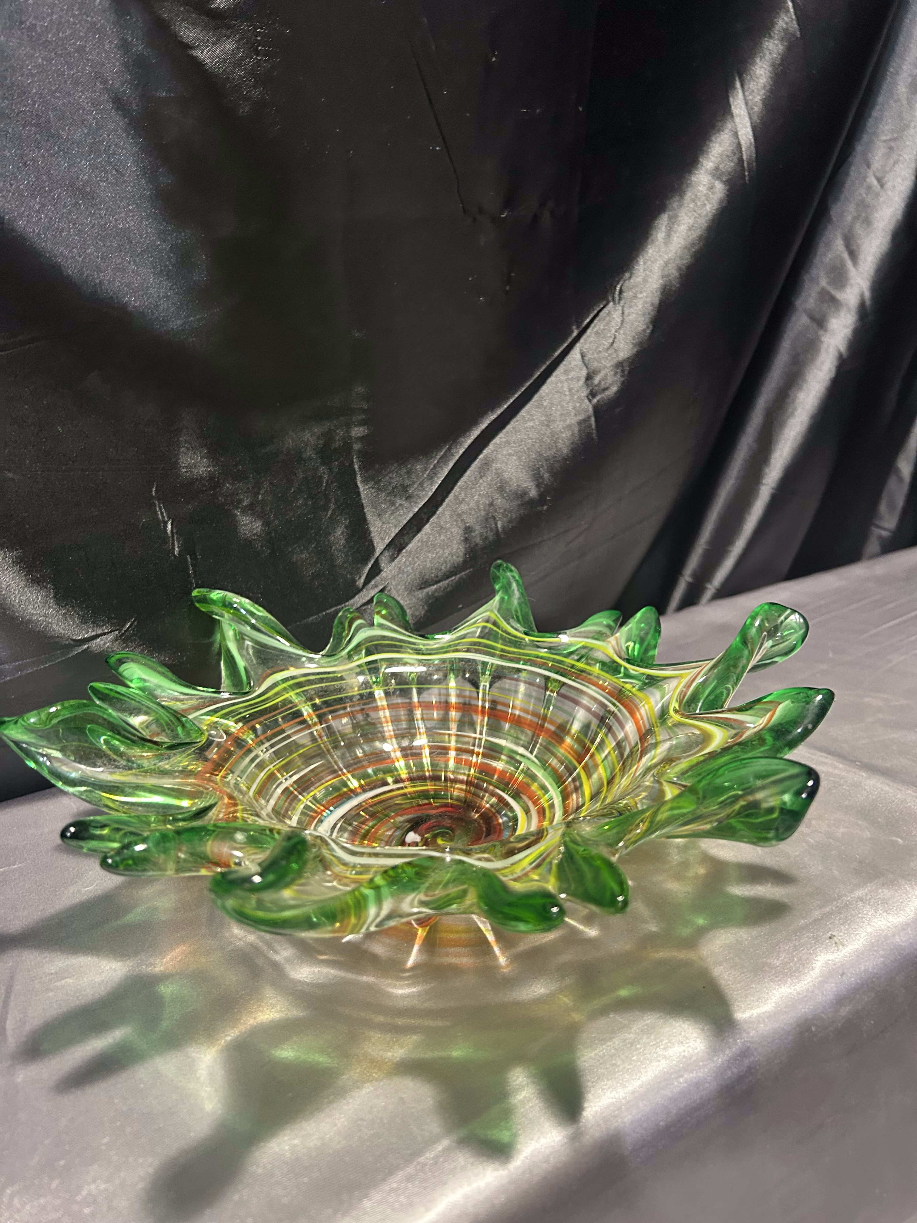 Efektowna misa wykonana z ręcznie formowanego szkła, utrzymana w charakterystycznym dla szkła muranowskiego stylu – o dynamicznej, rozłożystej formie i intensywnej, wielobarwnej kolorystyce.